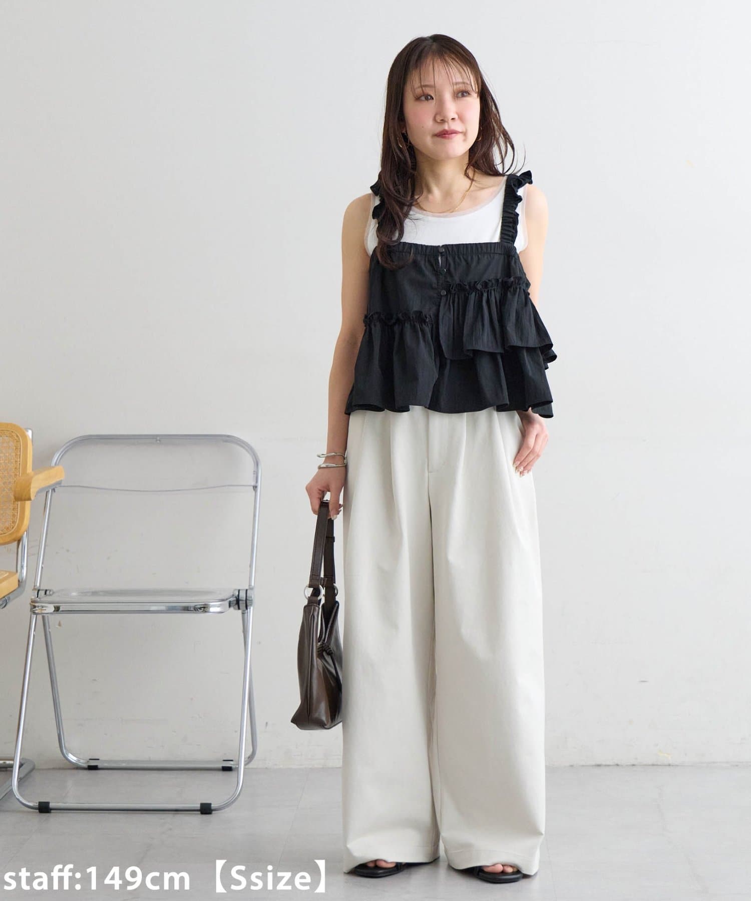 164cmスタッフ(Lサイズ):フラットシューズでも裾が短くなることなく着れる丈感です◎タックが入っていることで、腰回りにも余裕がありリラックスして着ることができます◎