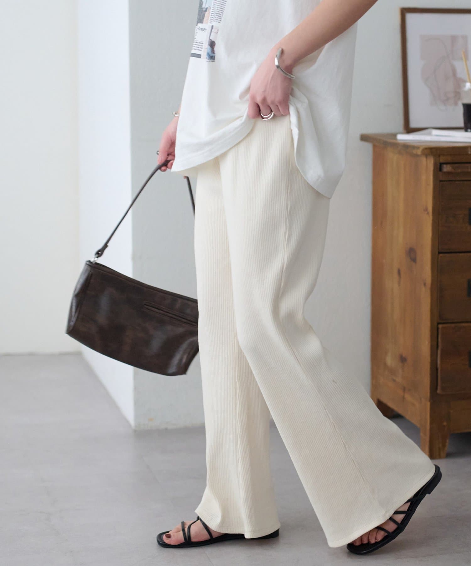 楽ちんな履き心地ながら、美脚見えするシルエットが魅力のリブパンツ