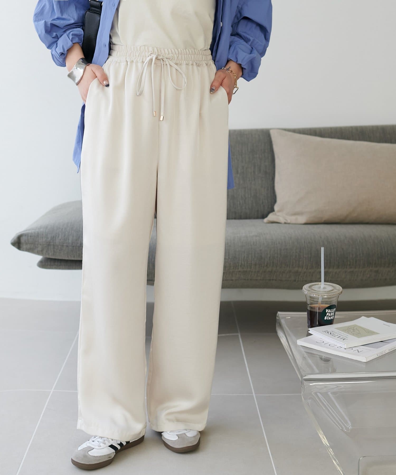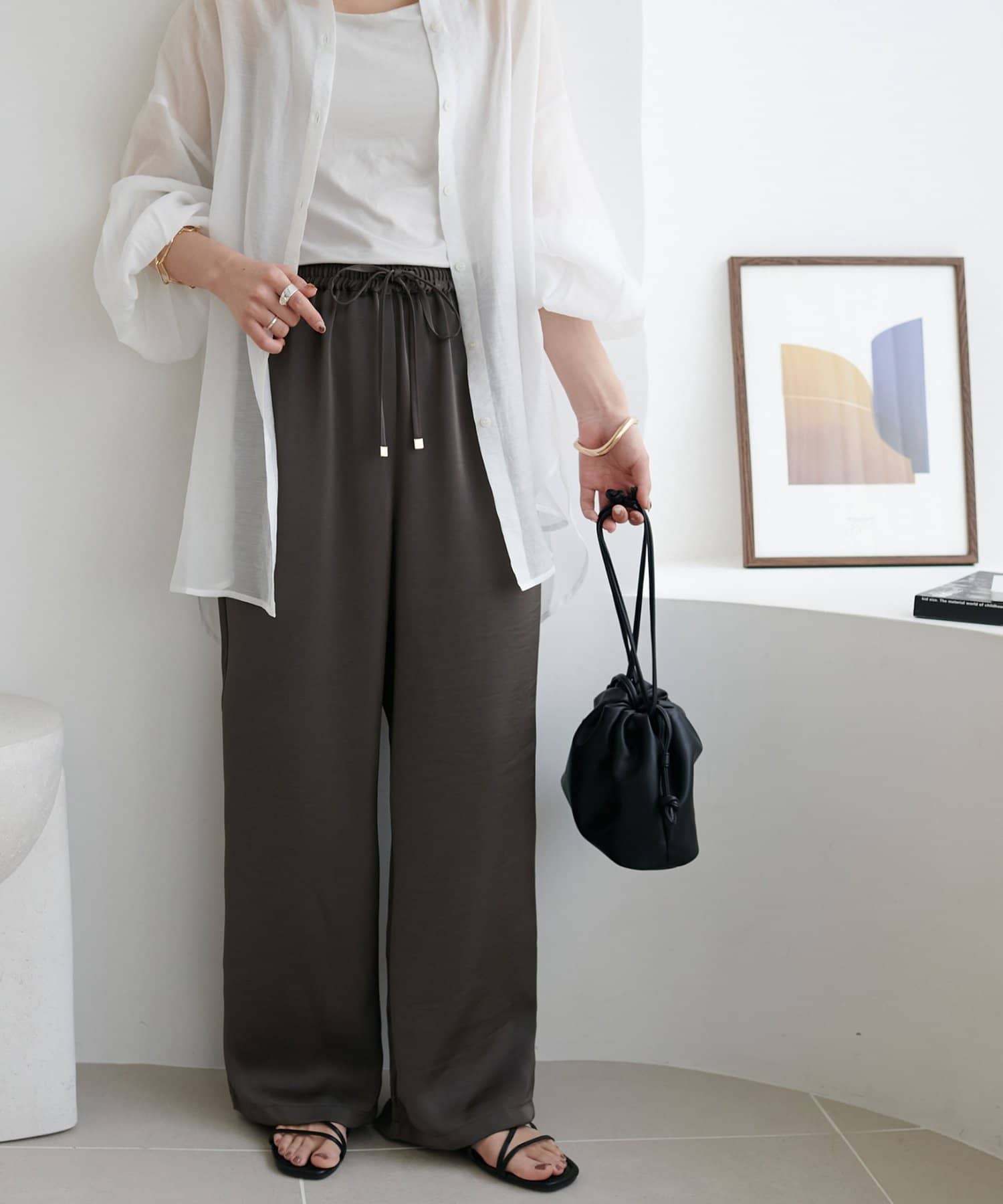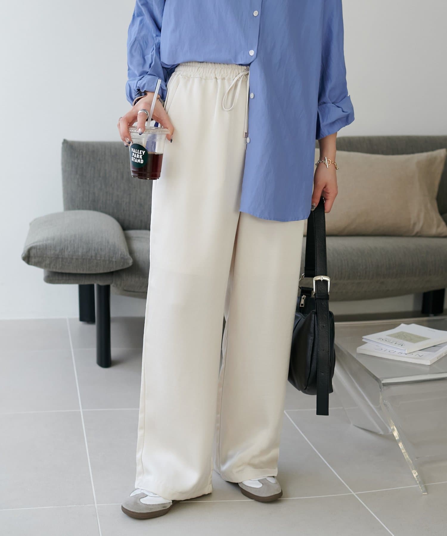リラックス感のあるワイドシルエットながら、すとんと落ちる生地感でラフすぎず大人な印象に。