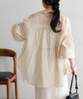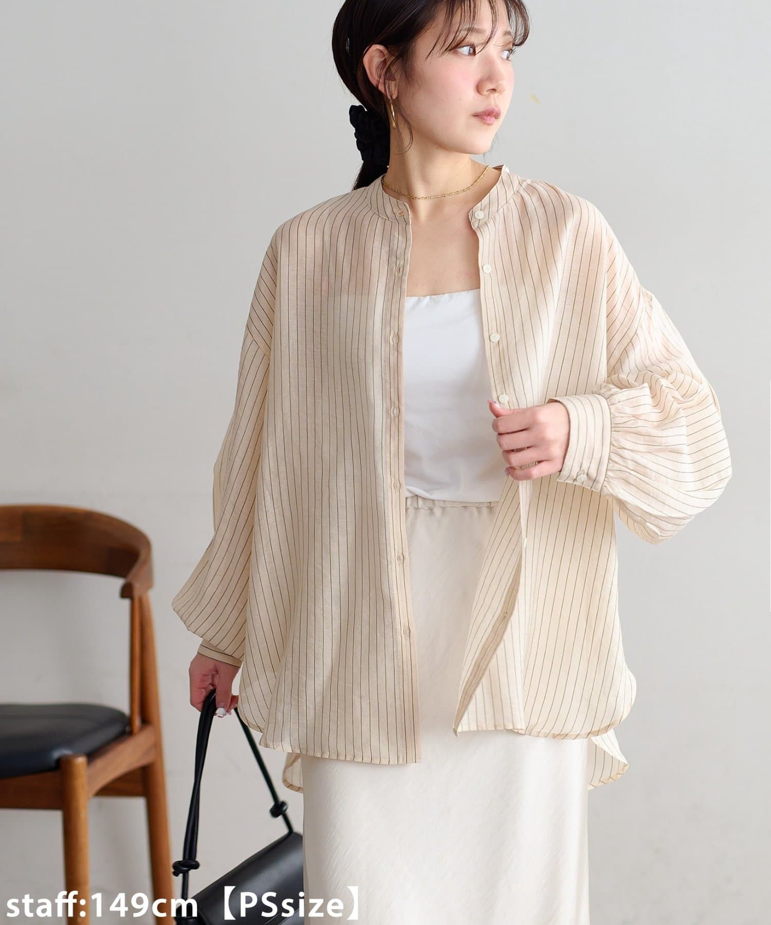 165cm スタッフ(Fサイズ着用):バンドカラーのおかげで首元がすっきり見え、アクセサリーも映えました◎軽い素材なので、夏場の羽織りとしても重宝しそうです。