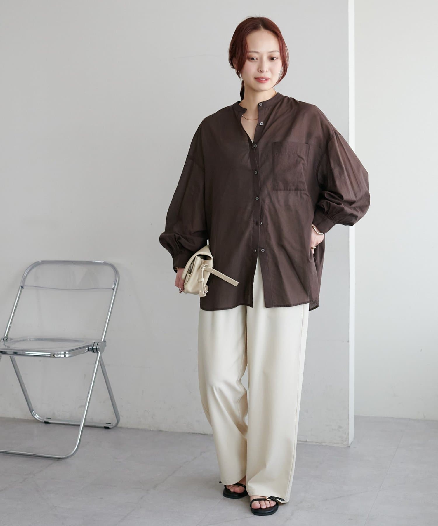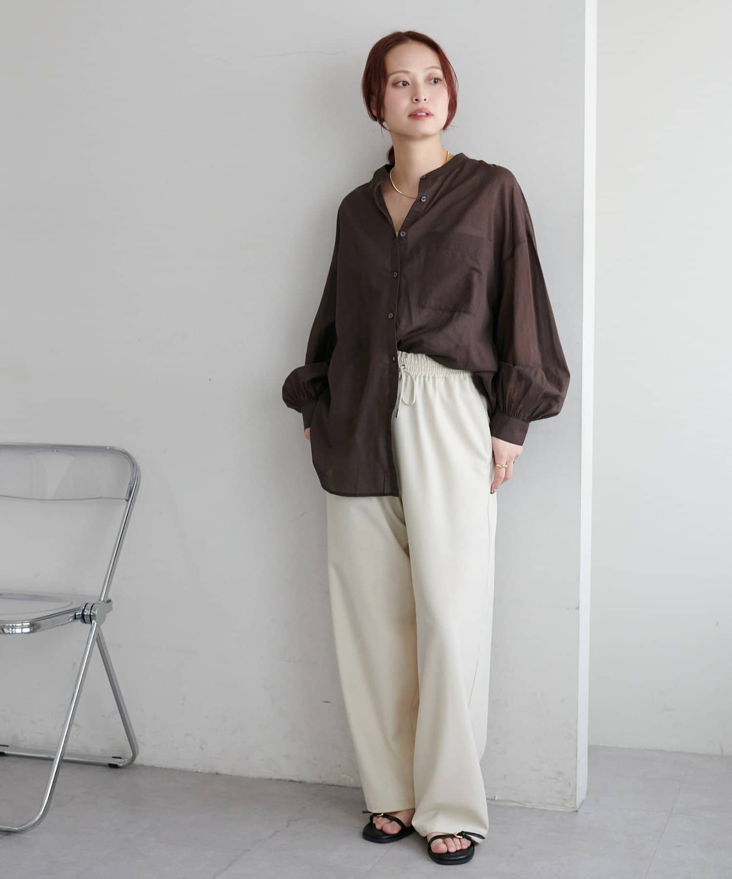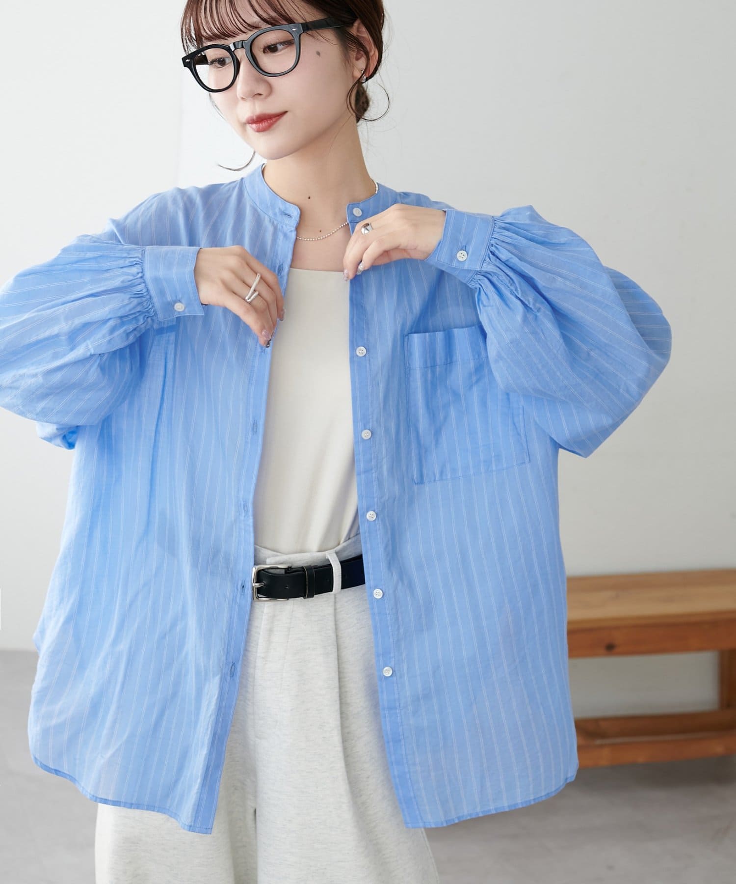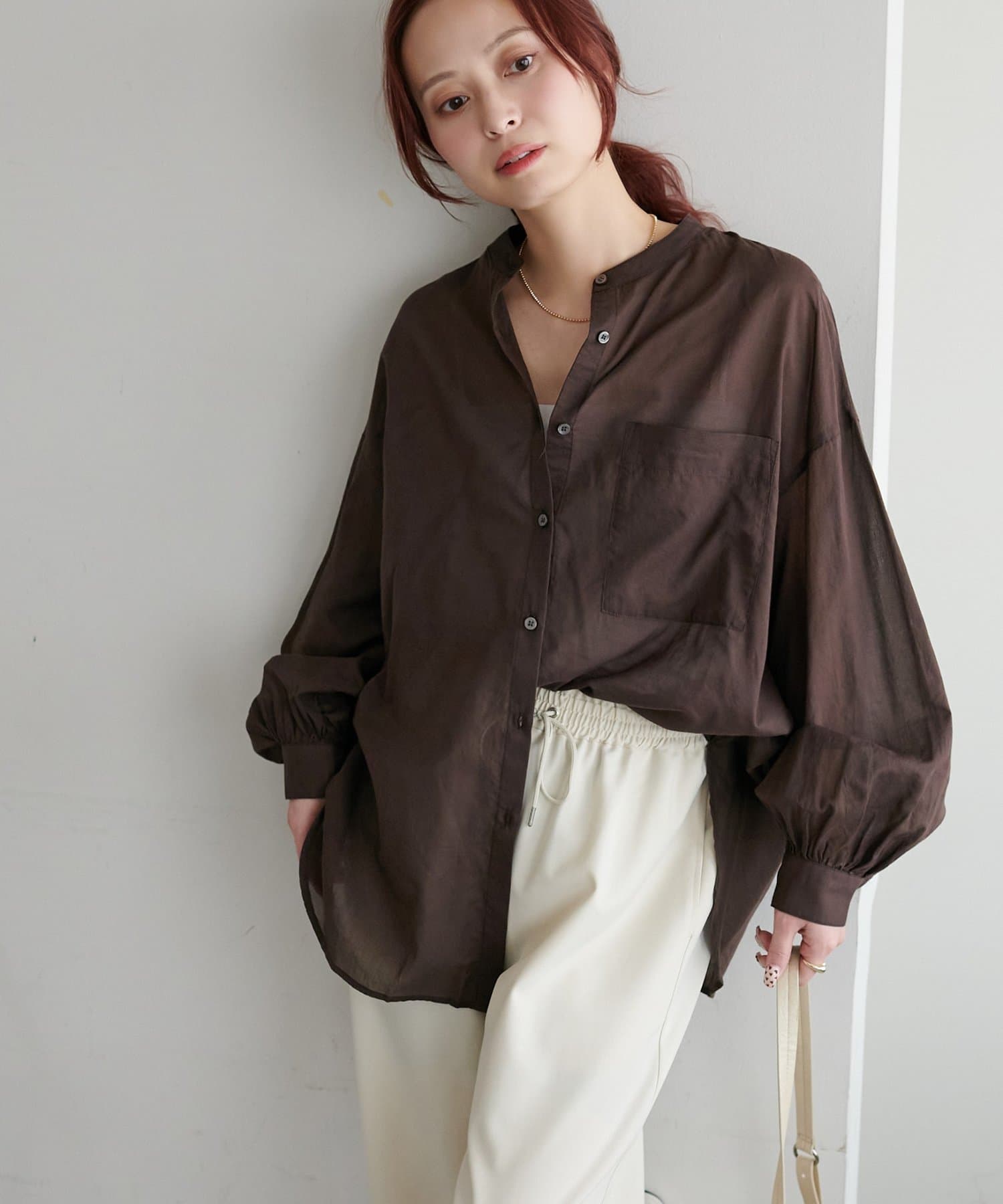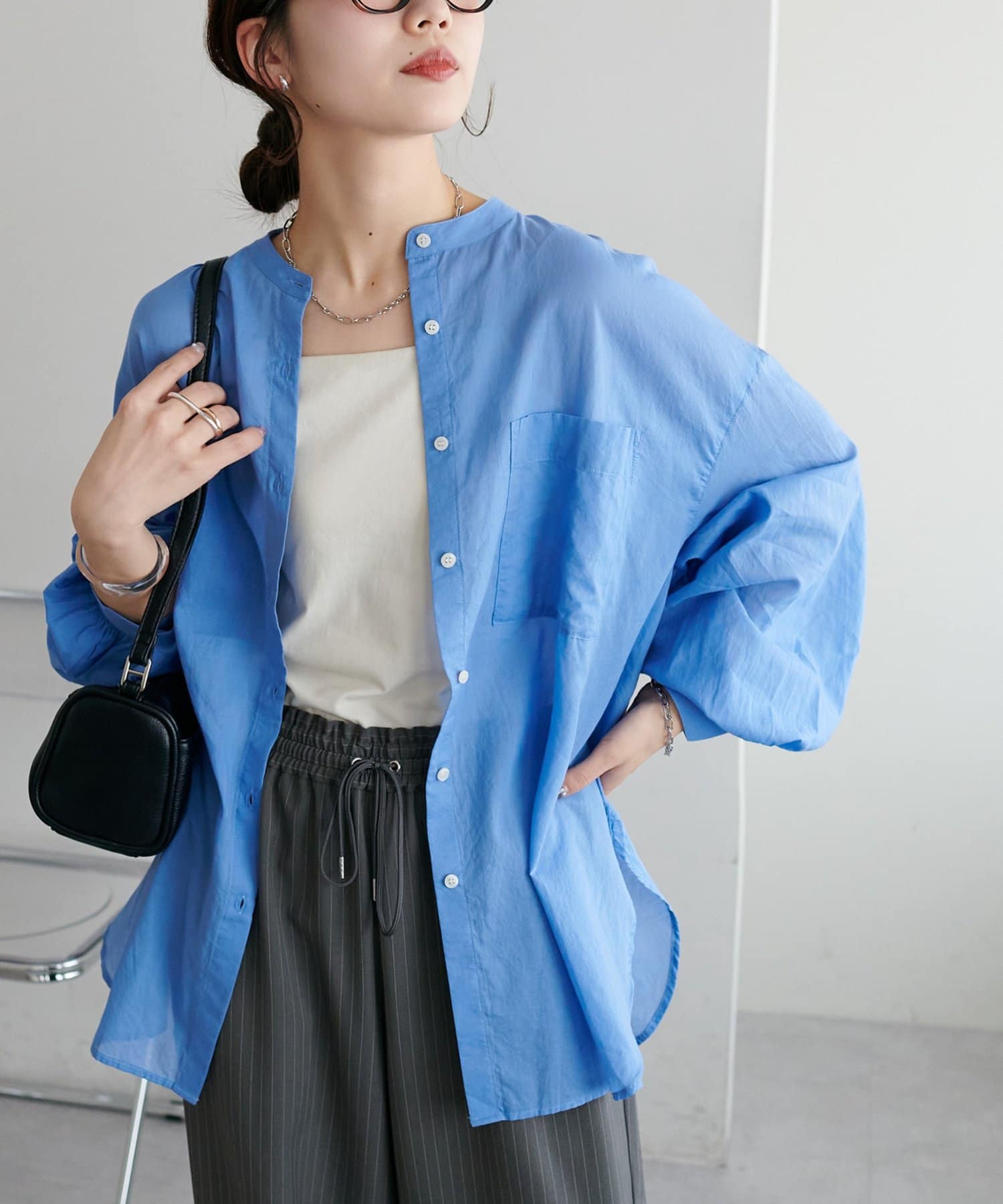 きれいめカジュアルなシアーバンドカラーシャツ