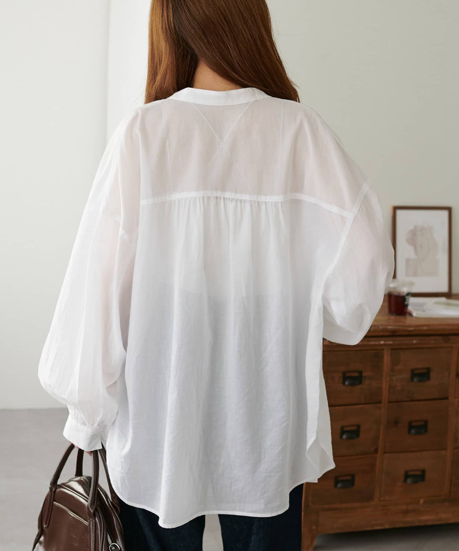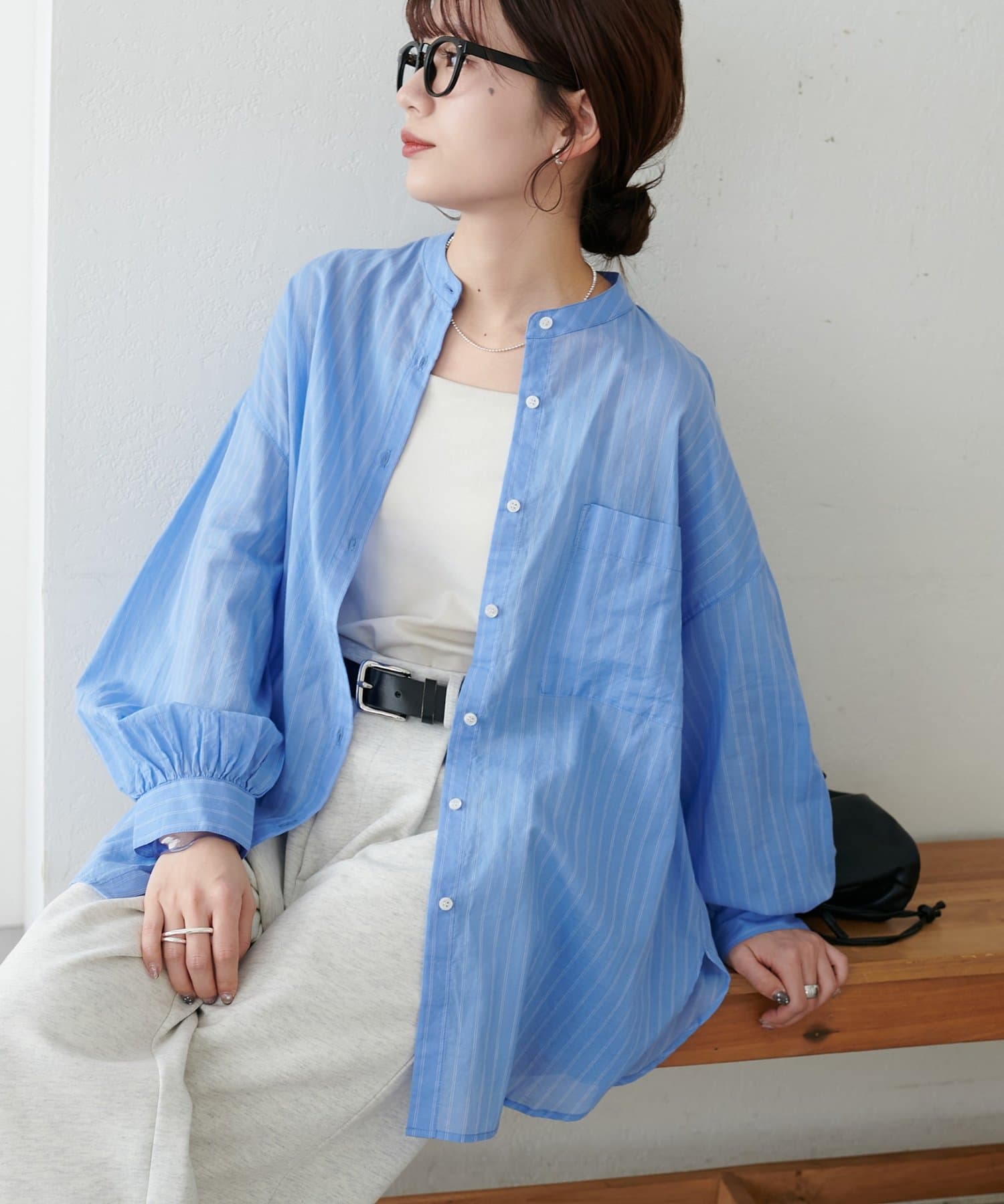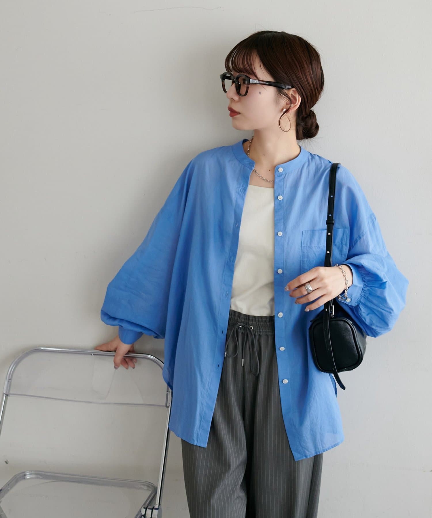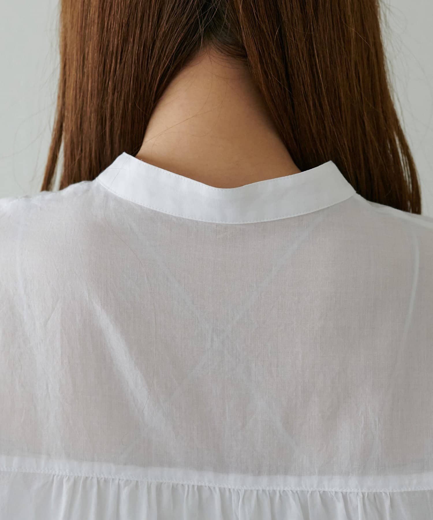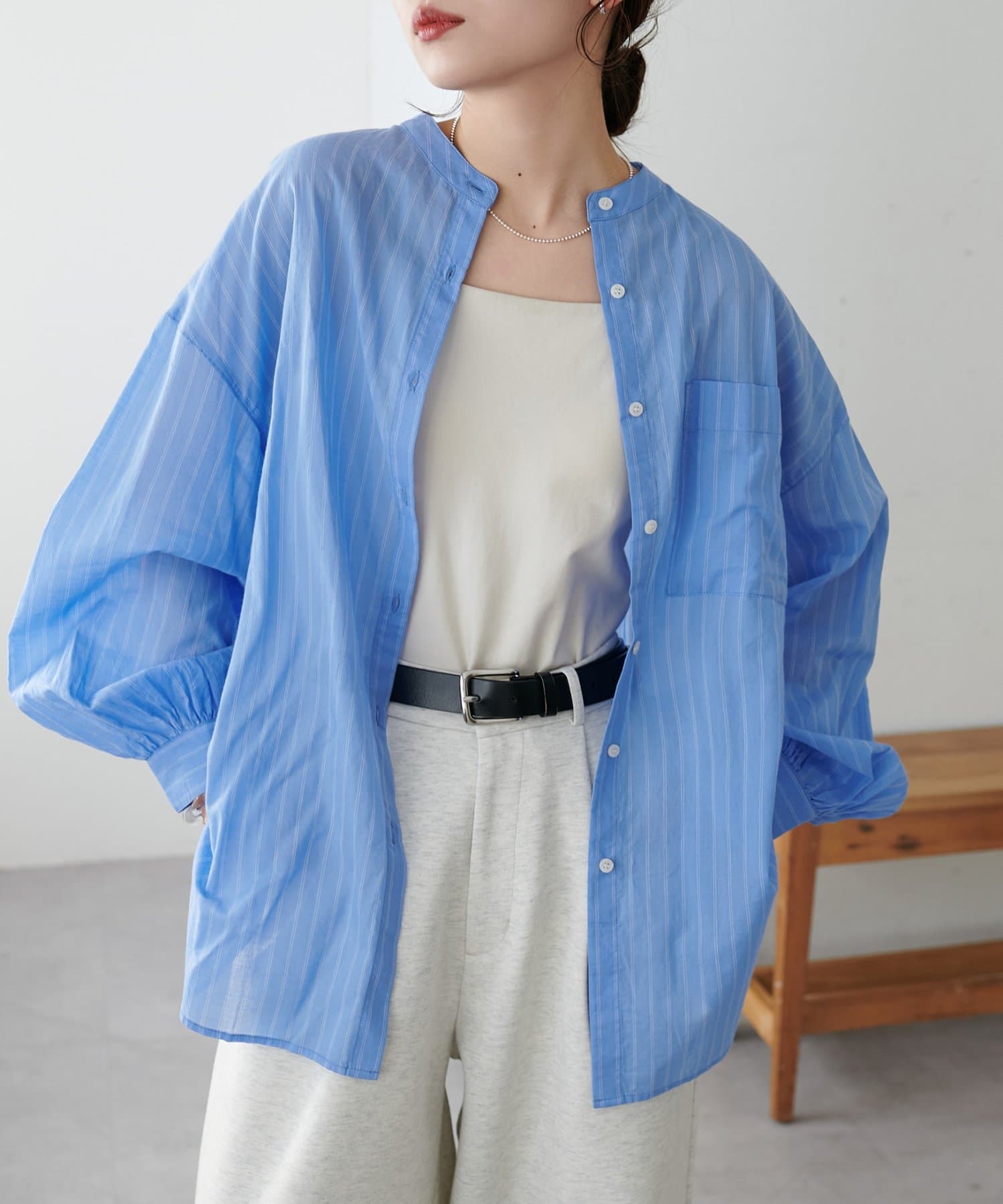 きれいめカジュアルなシアーバンドカラーシャツ