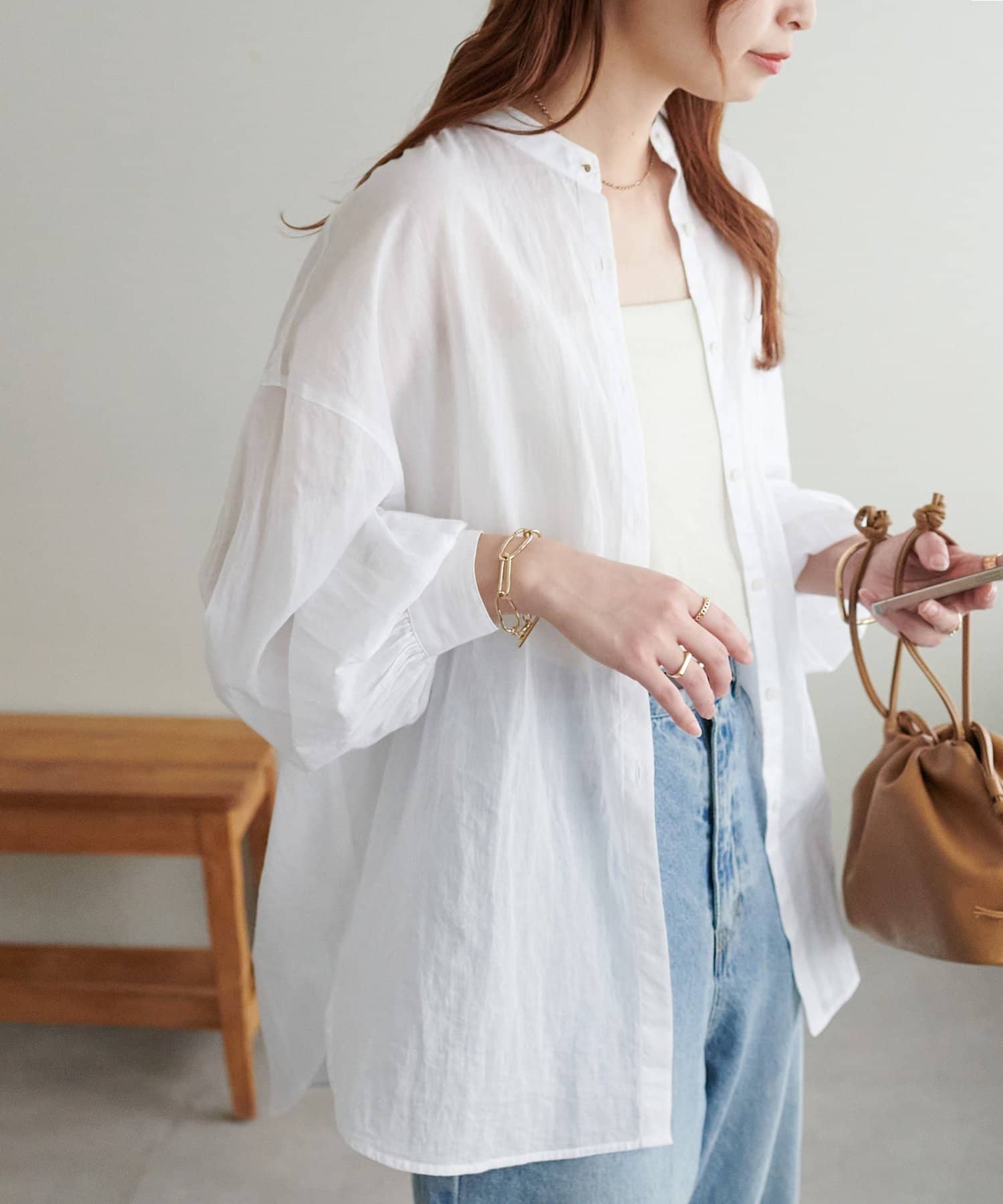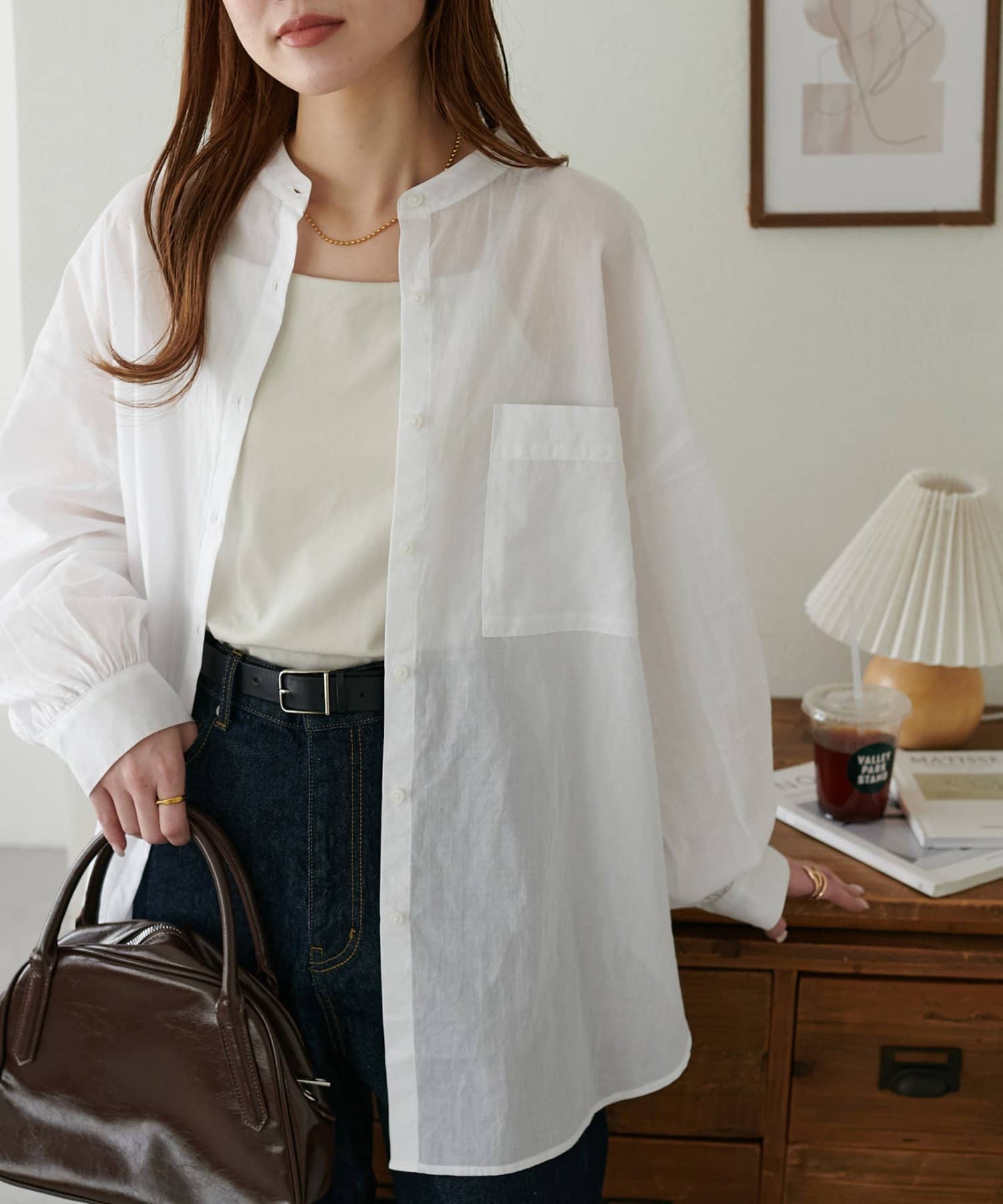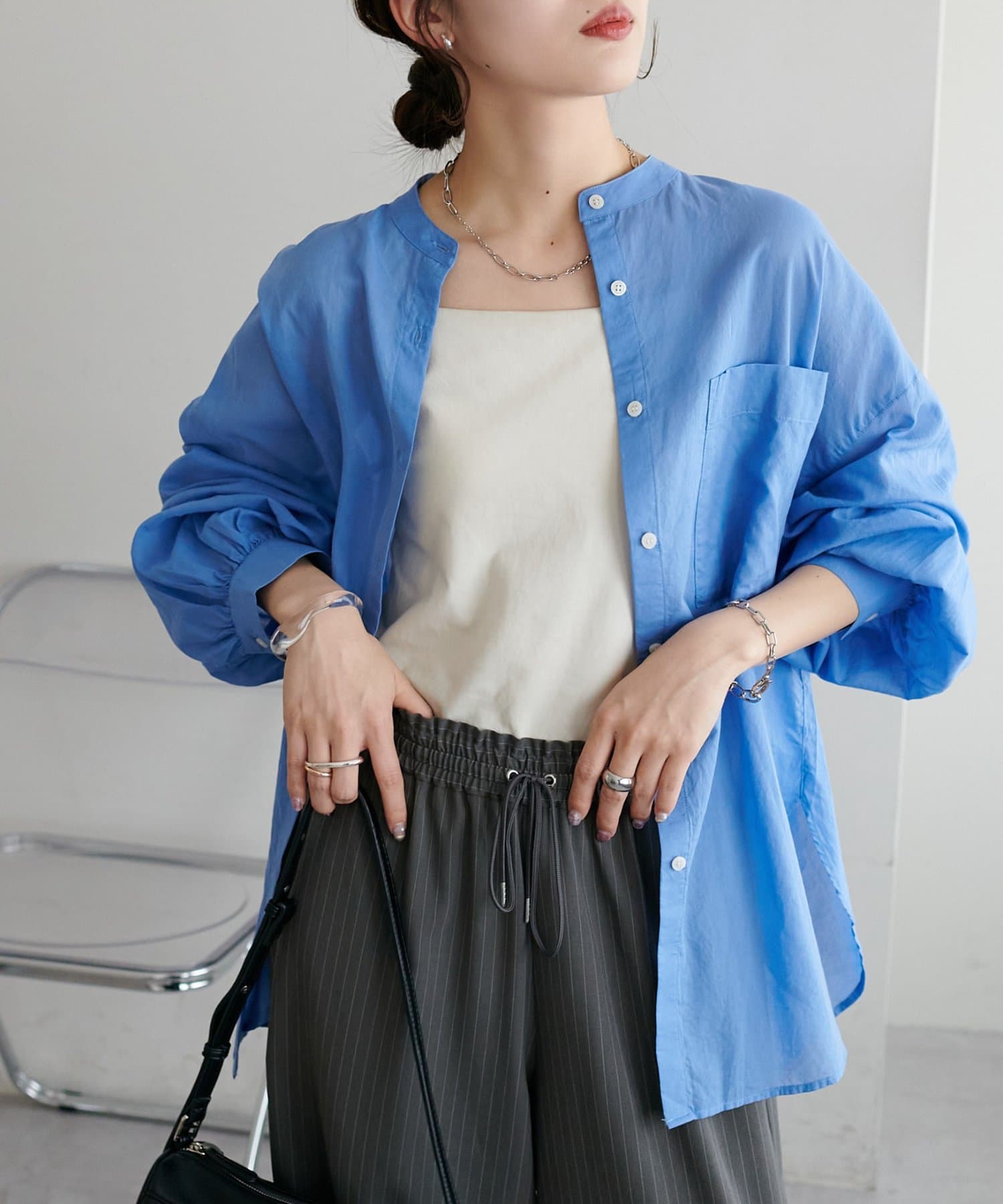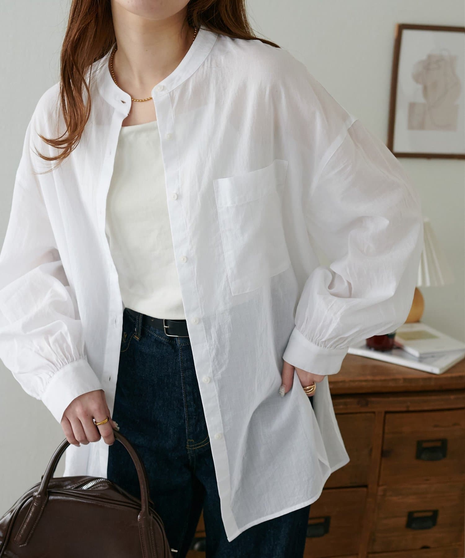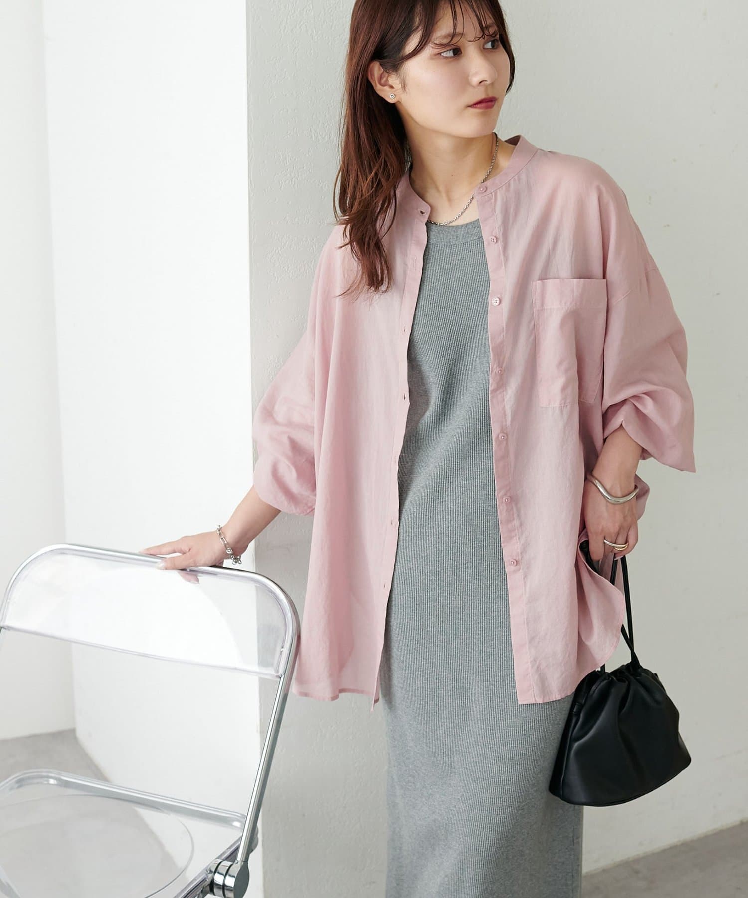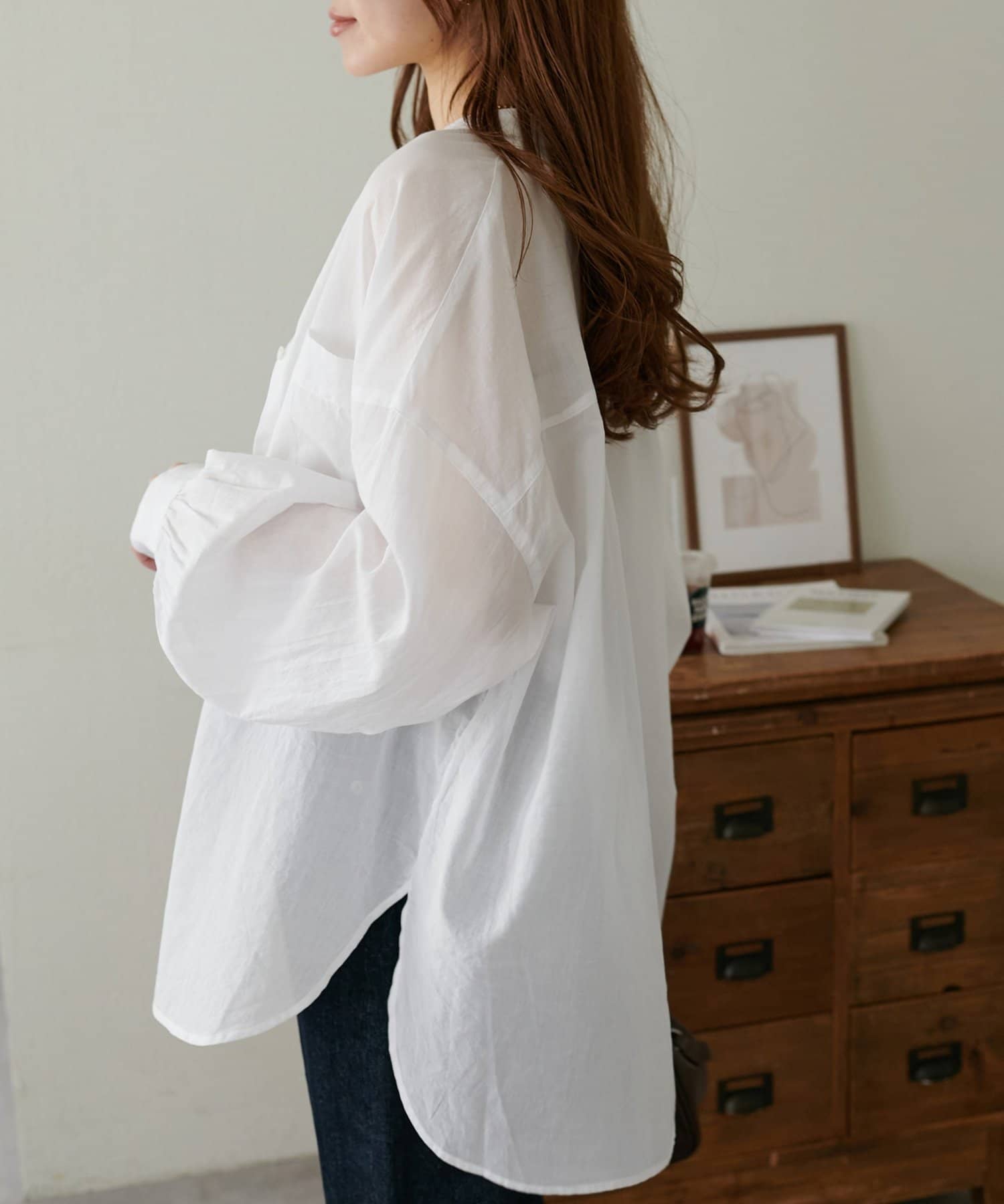 きれいめカジュアルなシアーバンドカラーシャツ