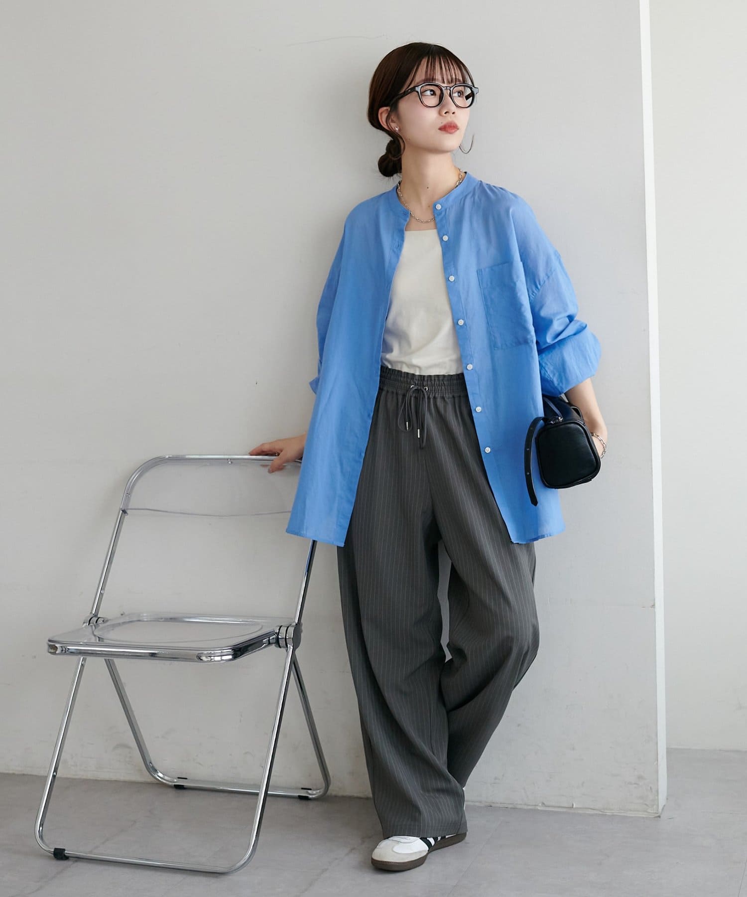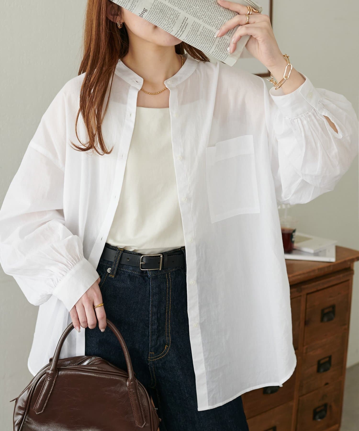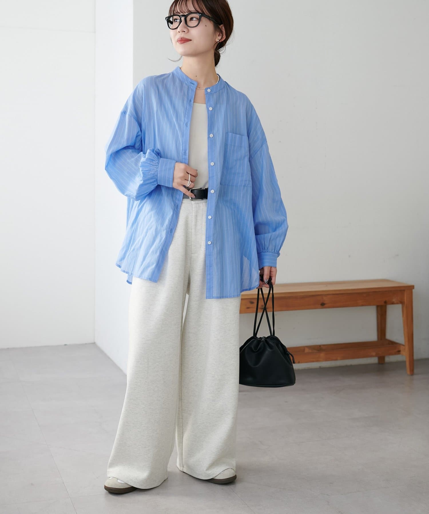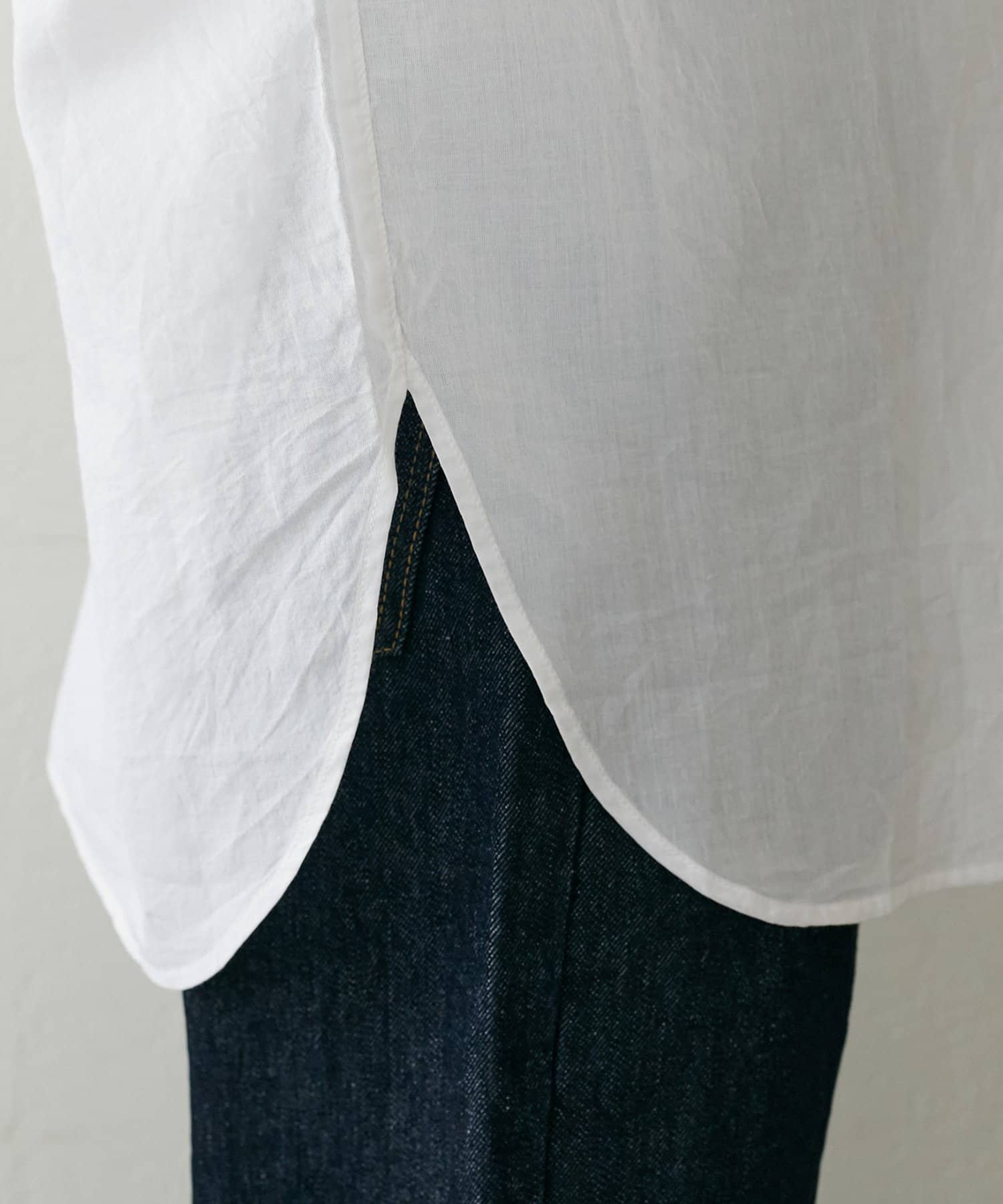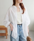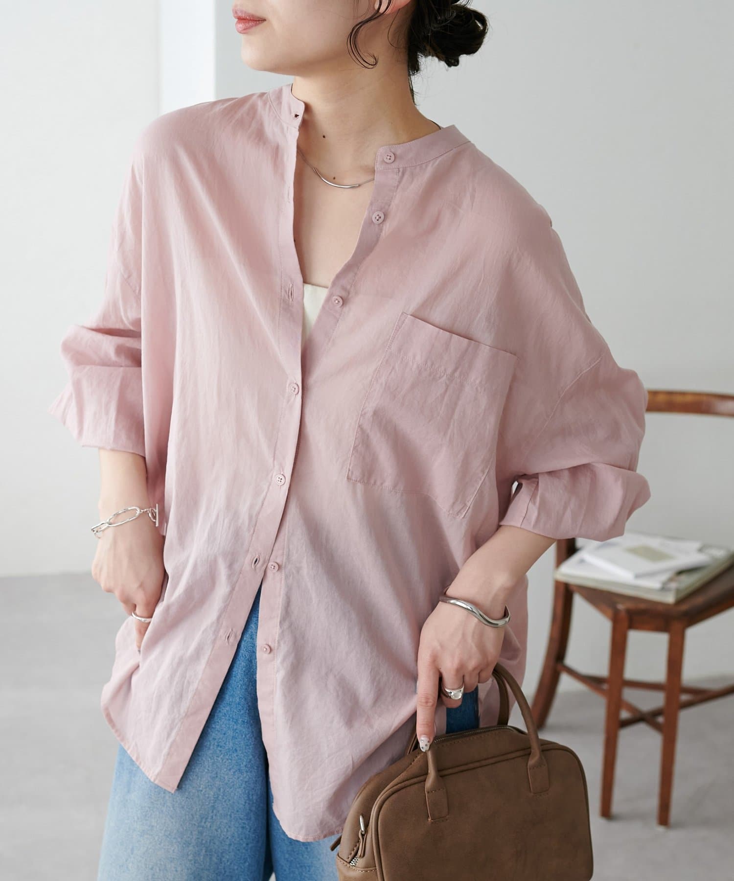 きれいめカジュアルなシアーバンドカラーシャツ