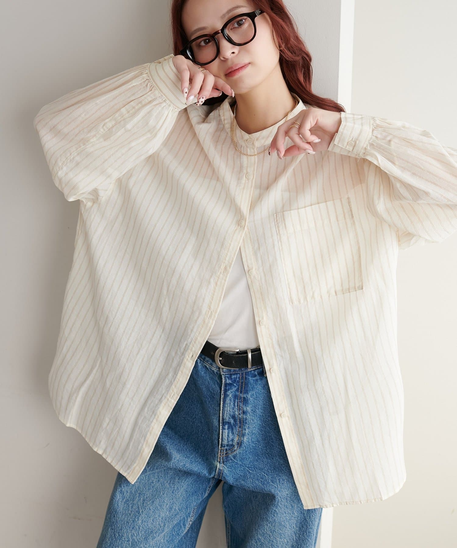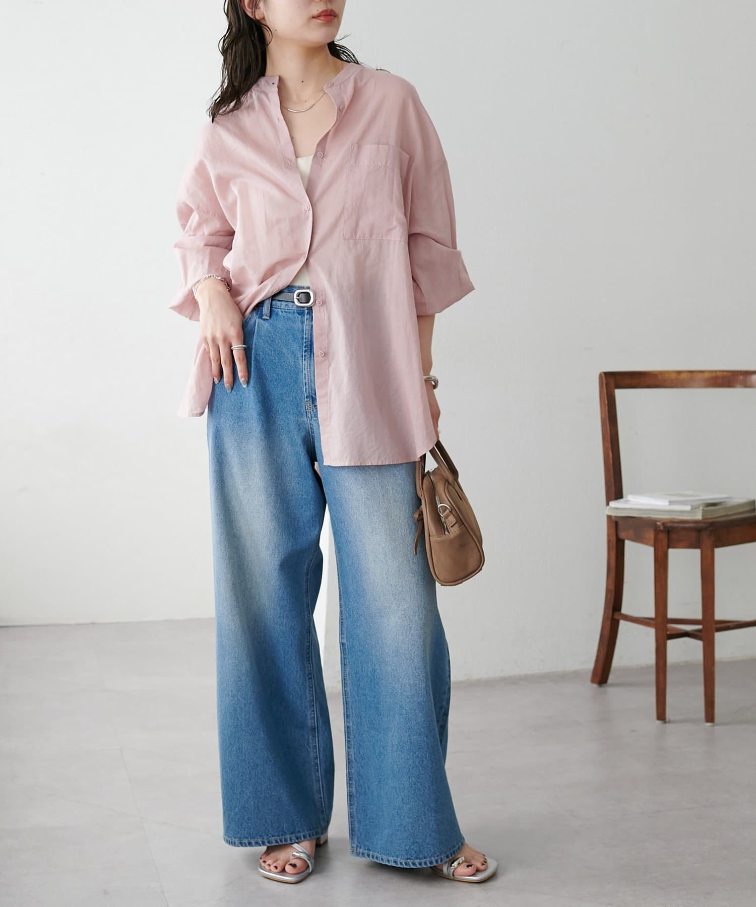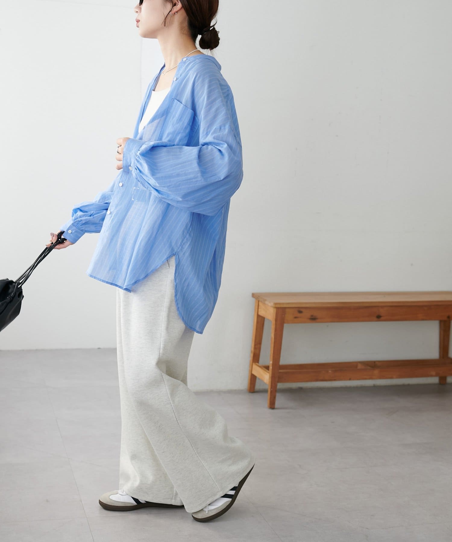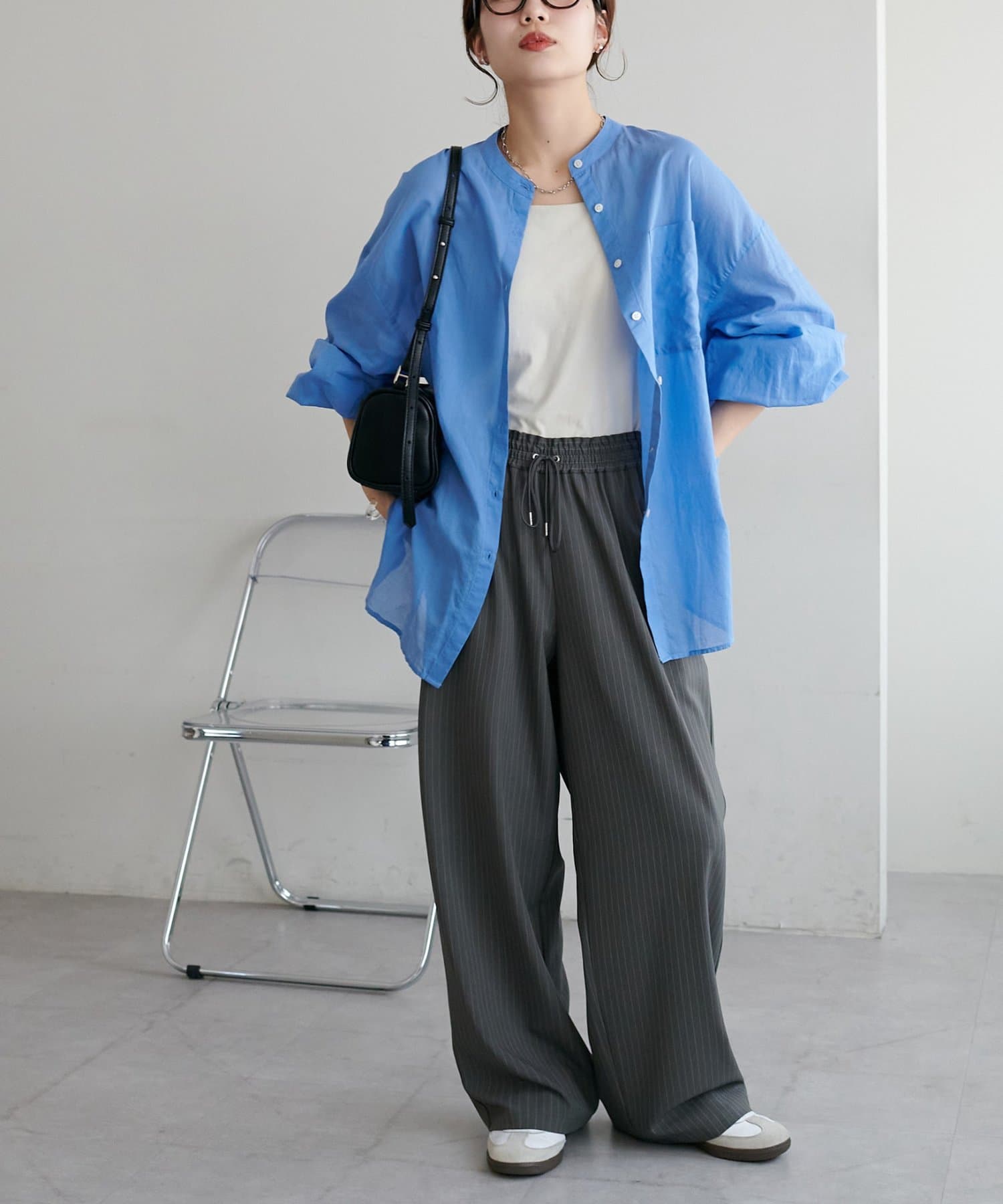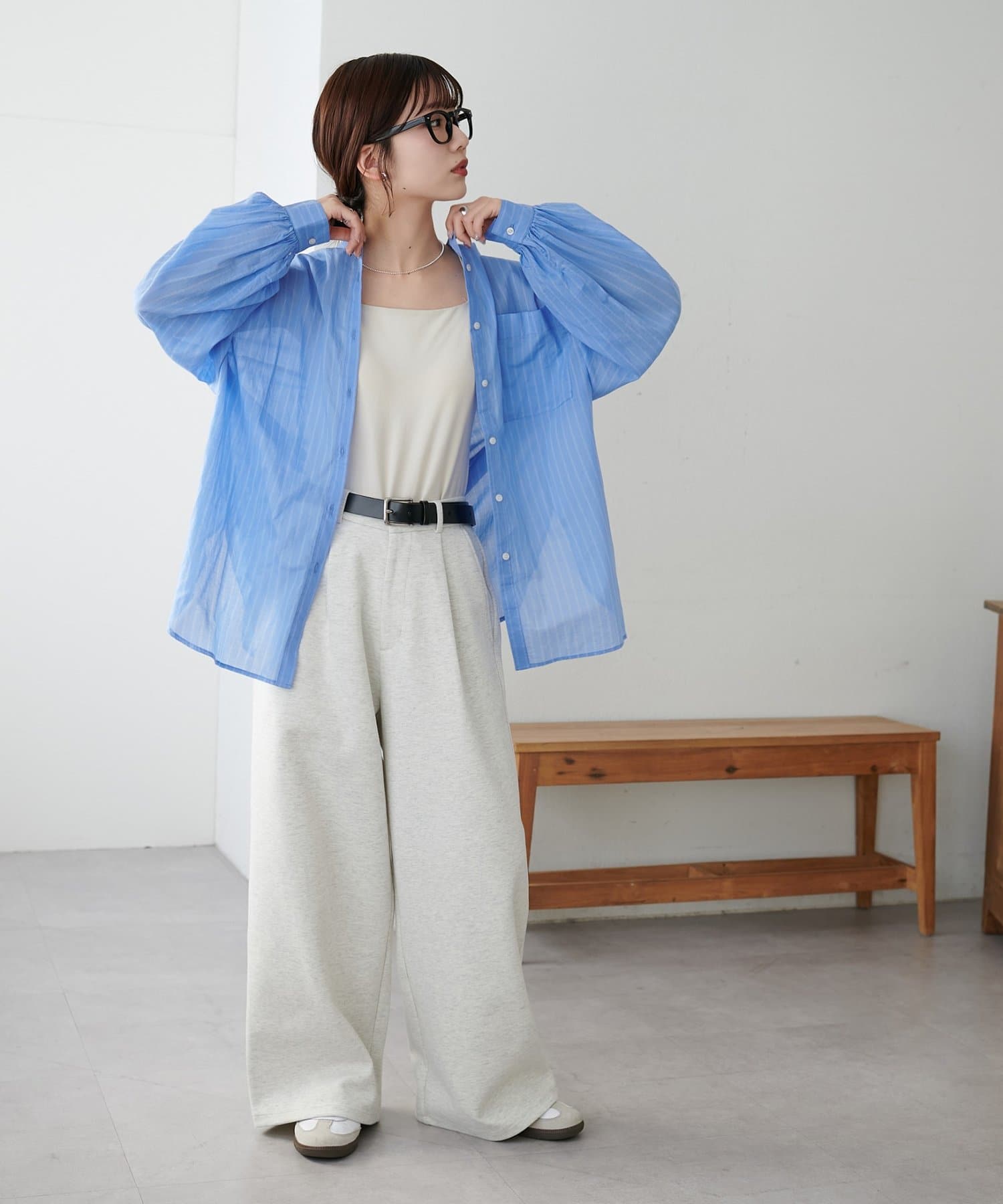 きれいめカジュアルなシアーバンドカラーシャツ