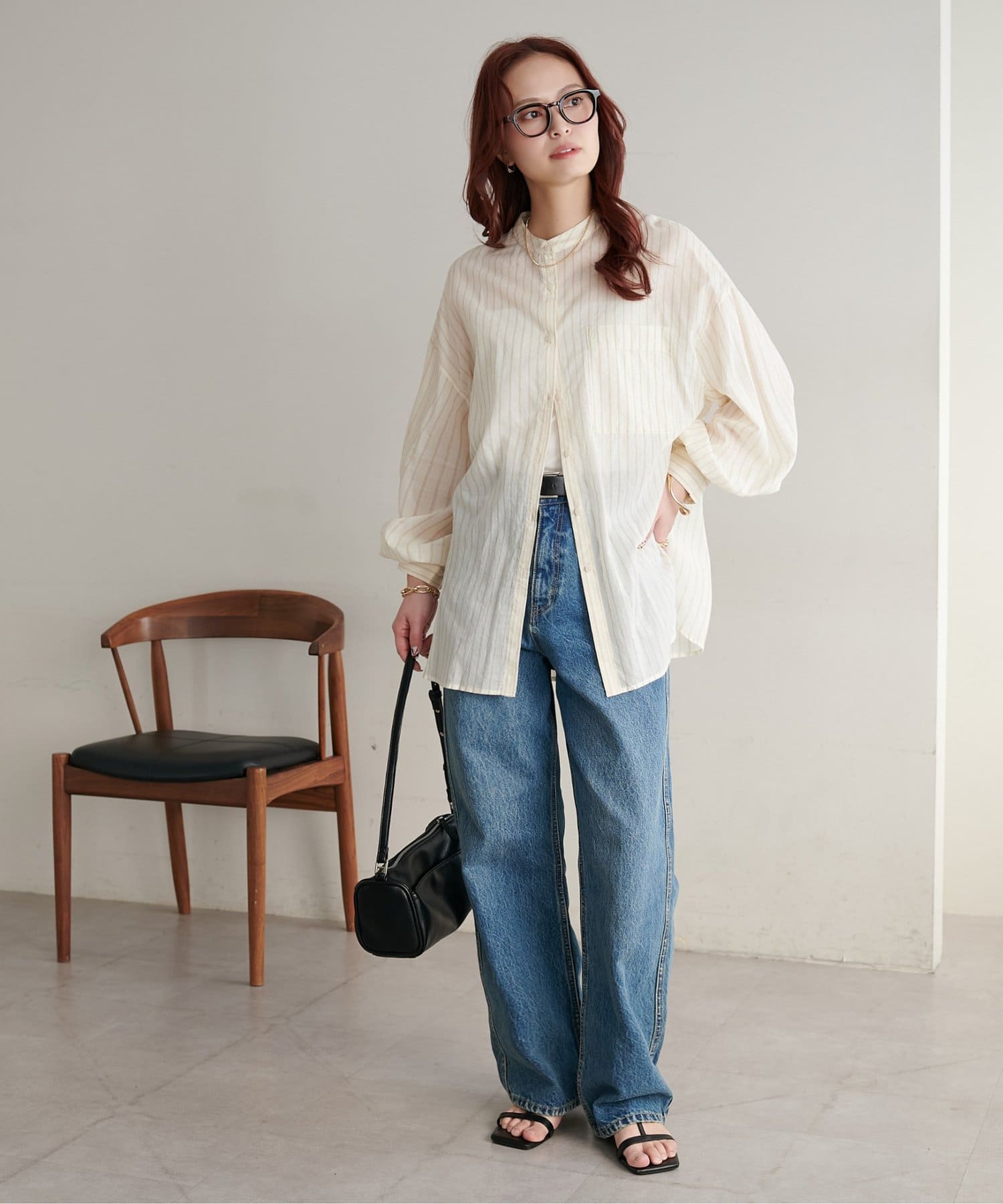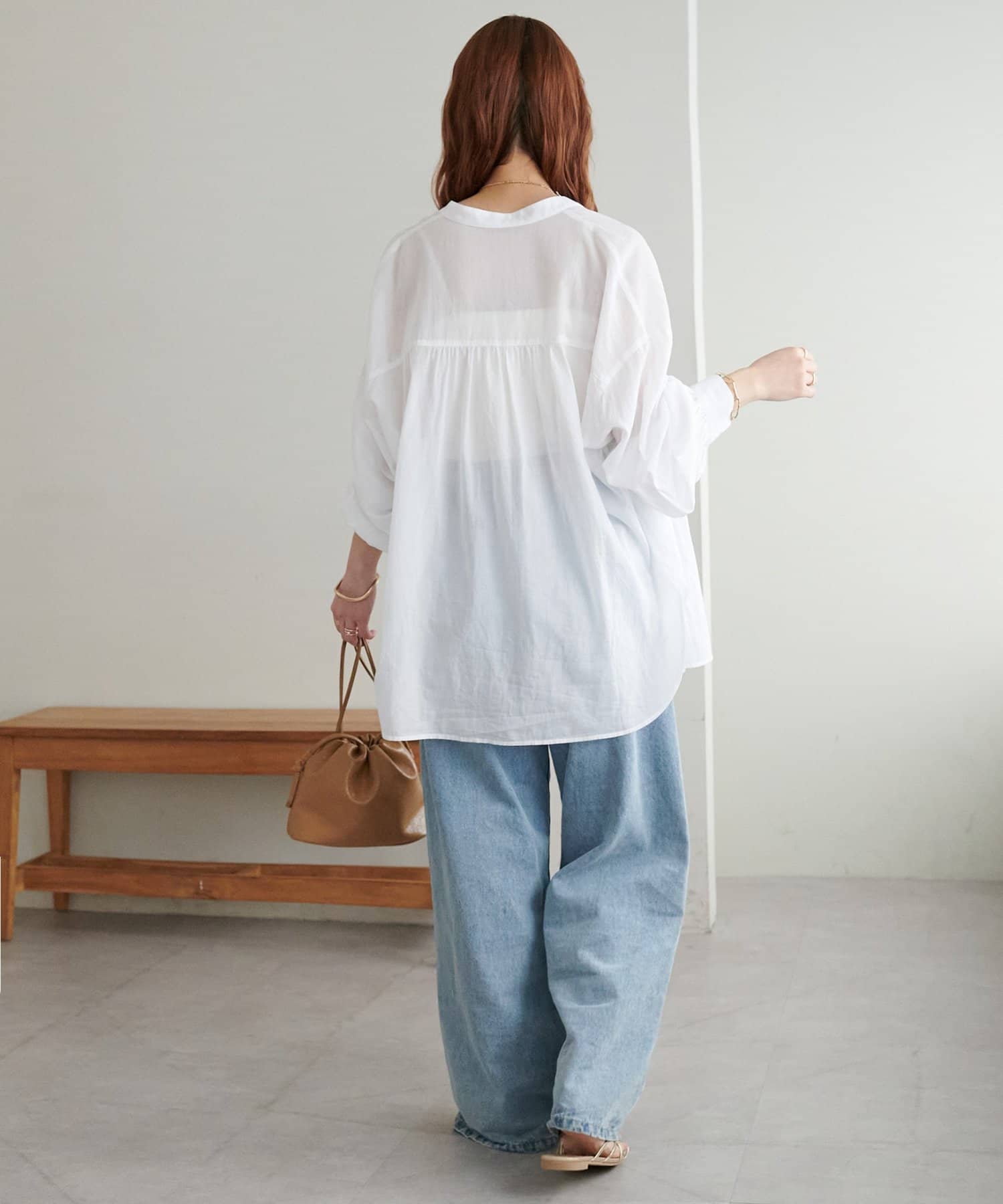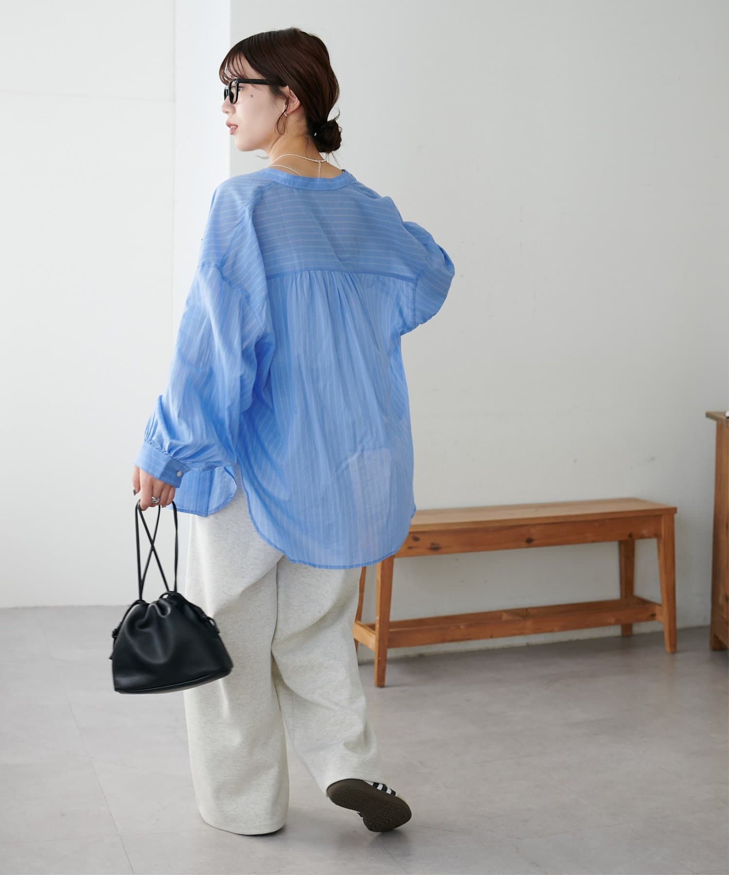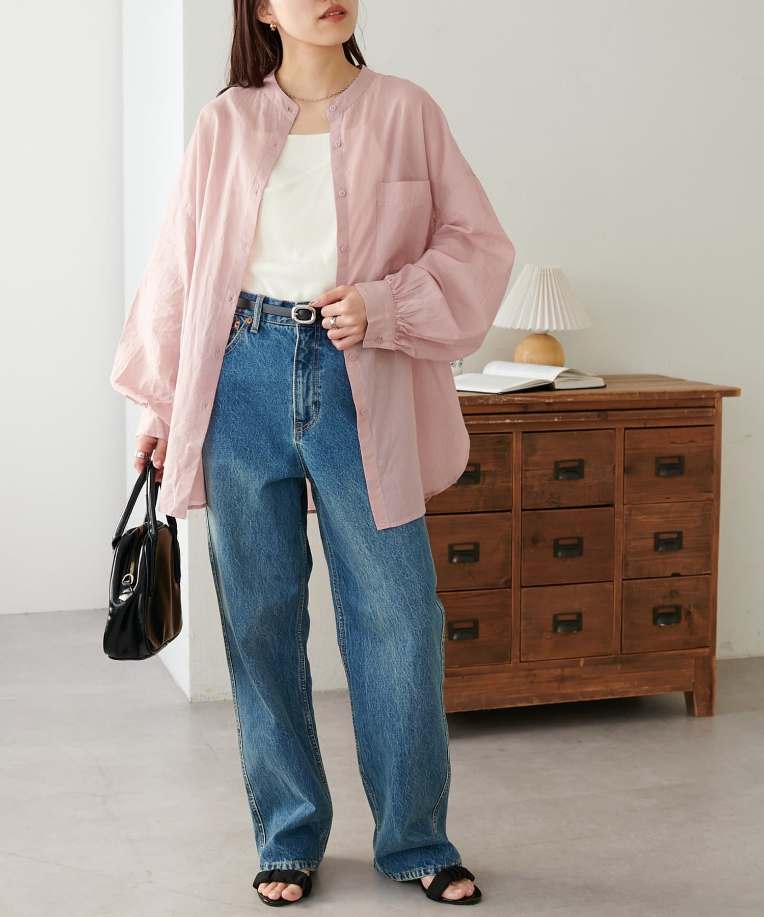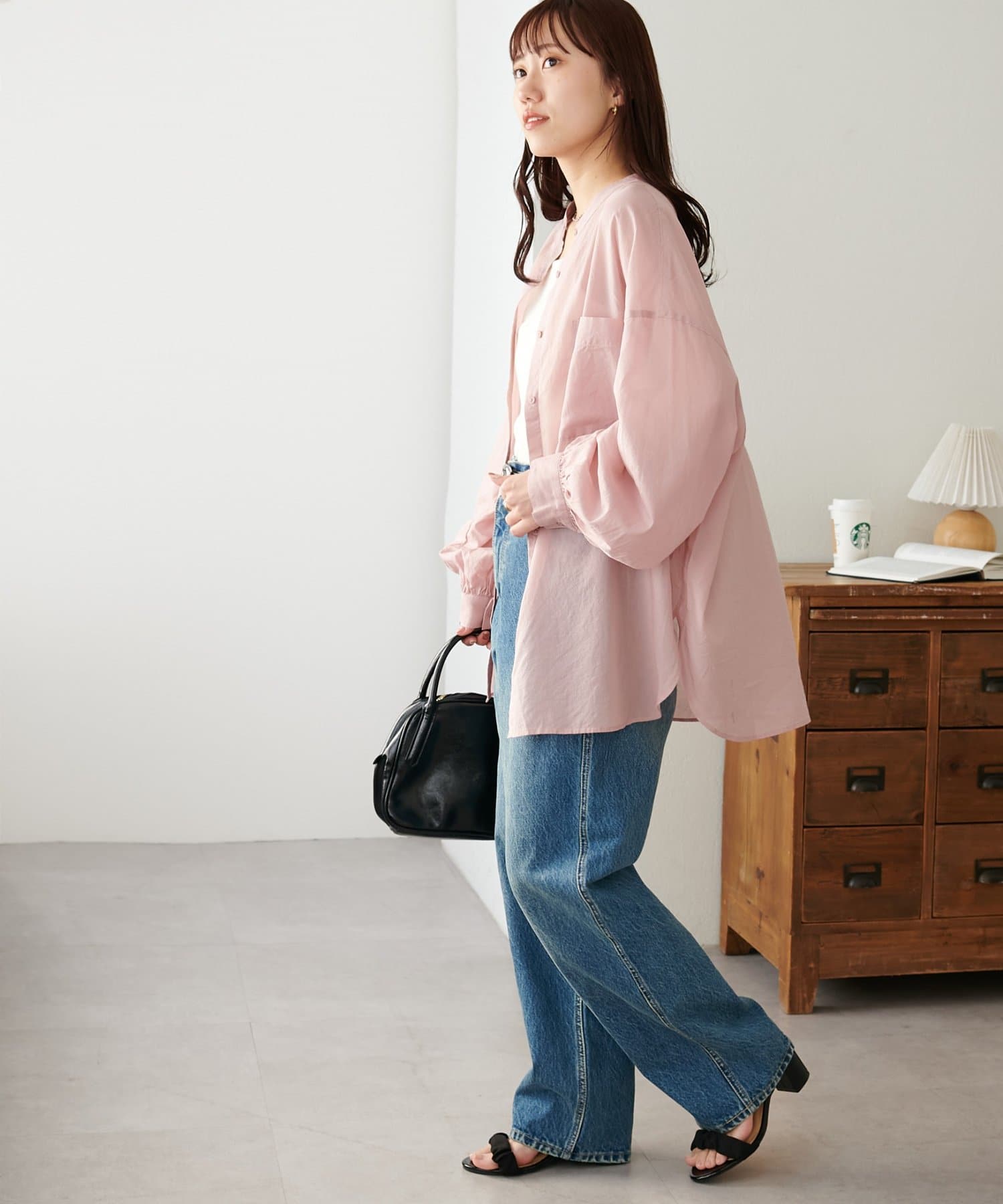 きれいめカジュアルなシアーバンドカラーシャツ