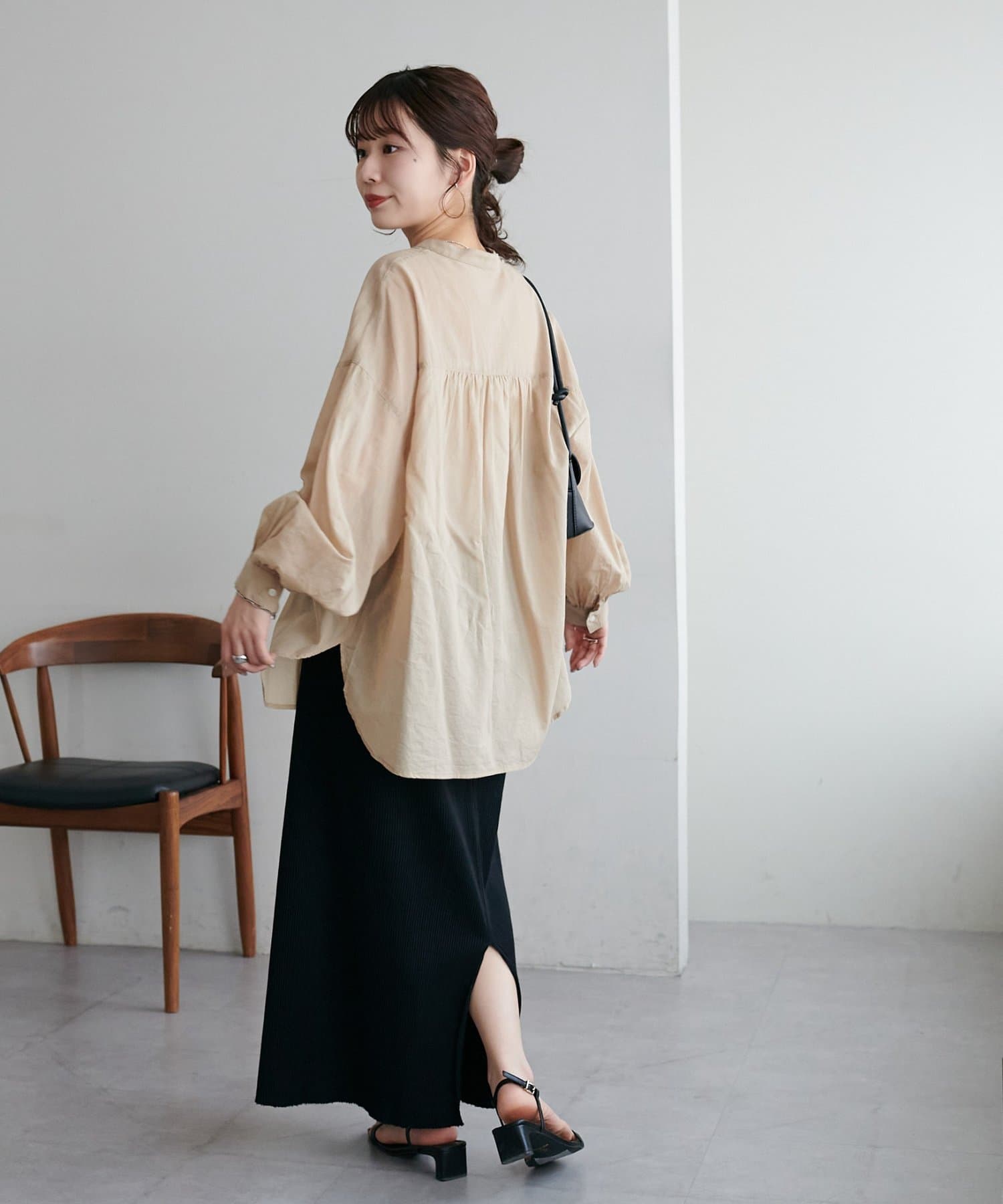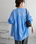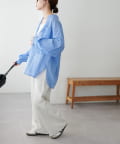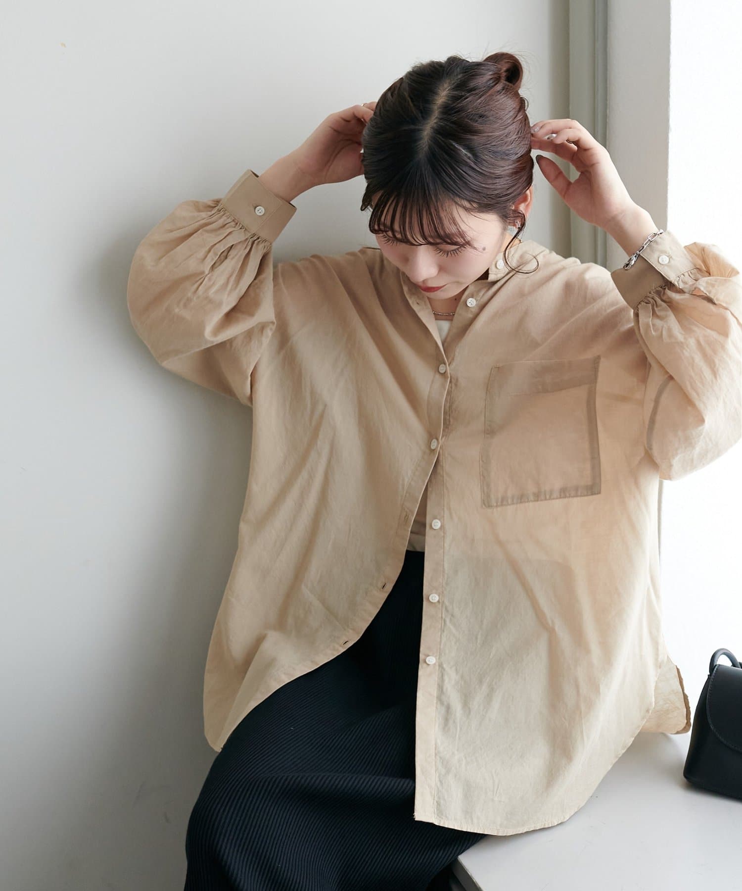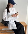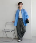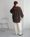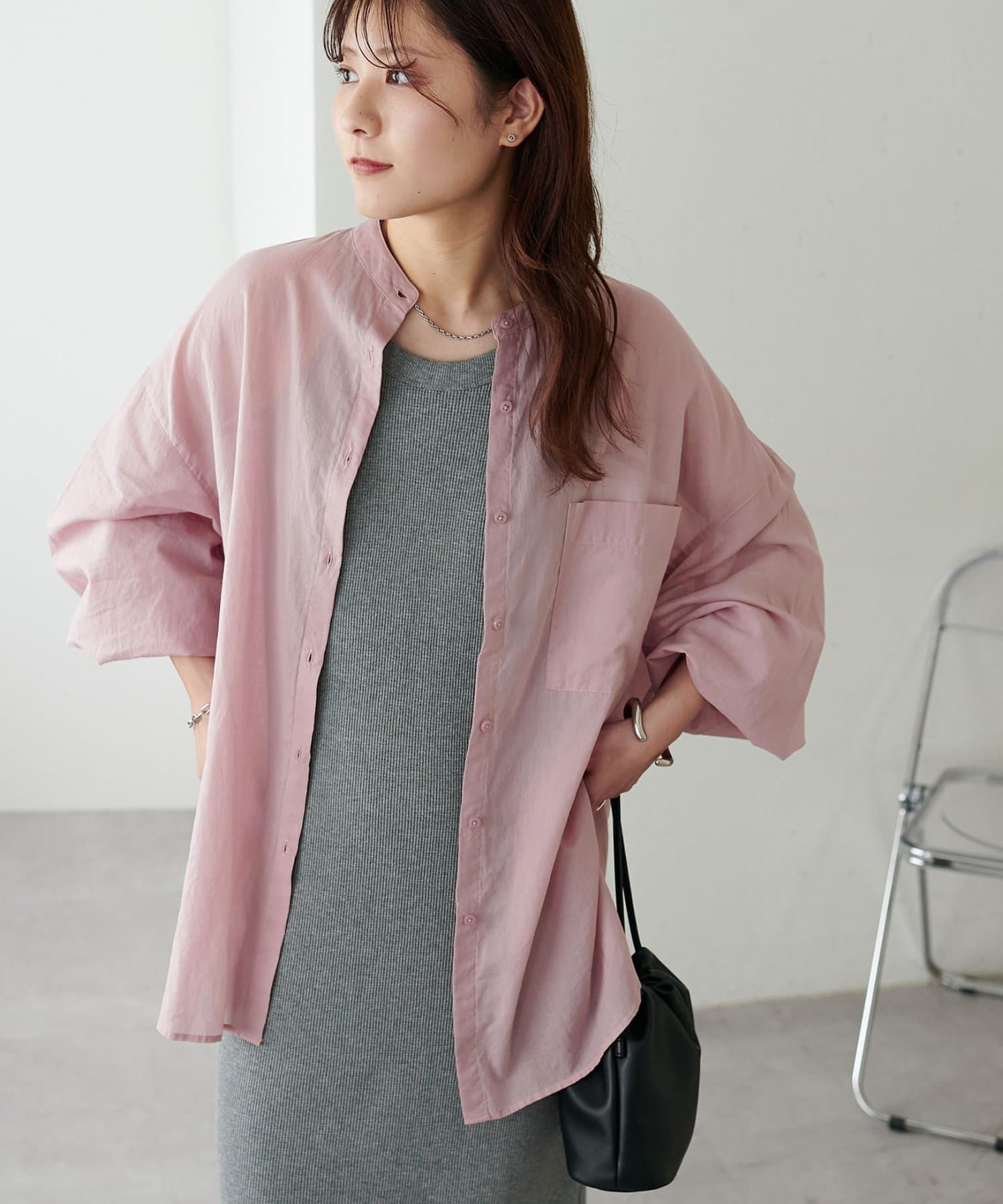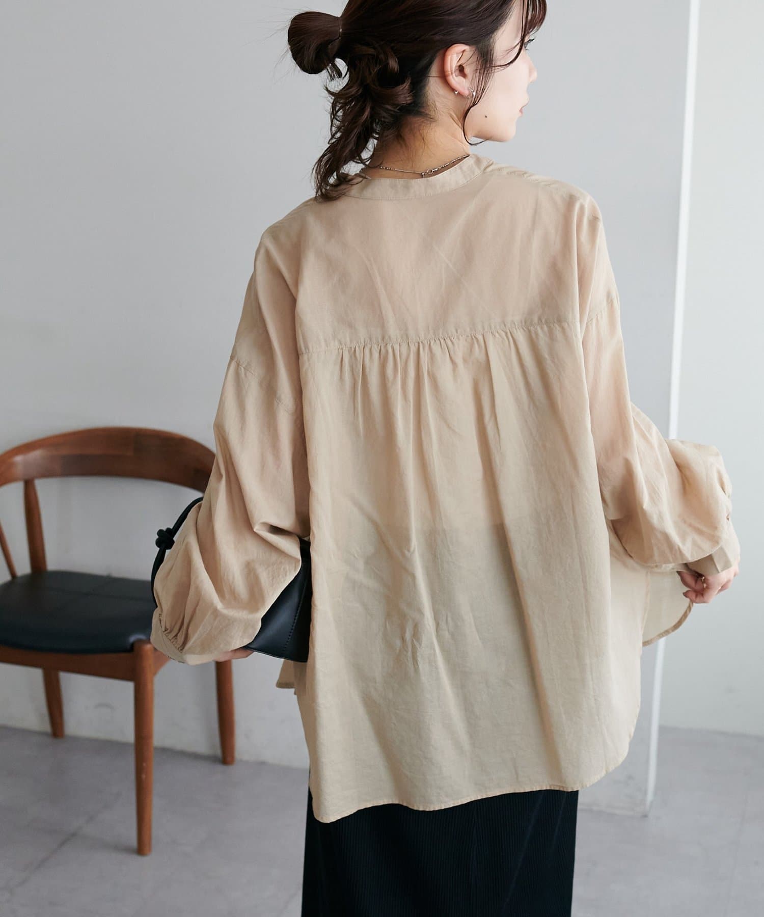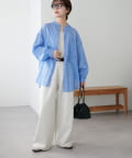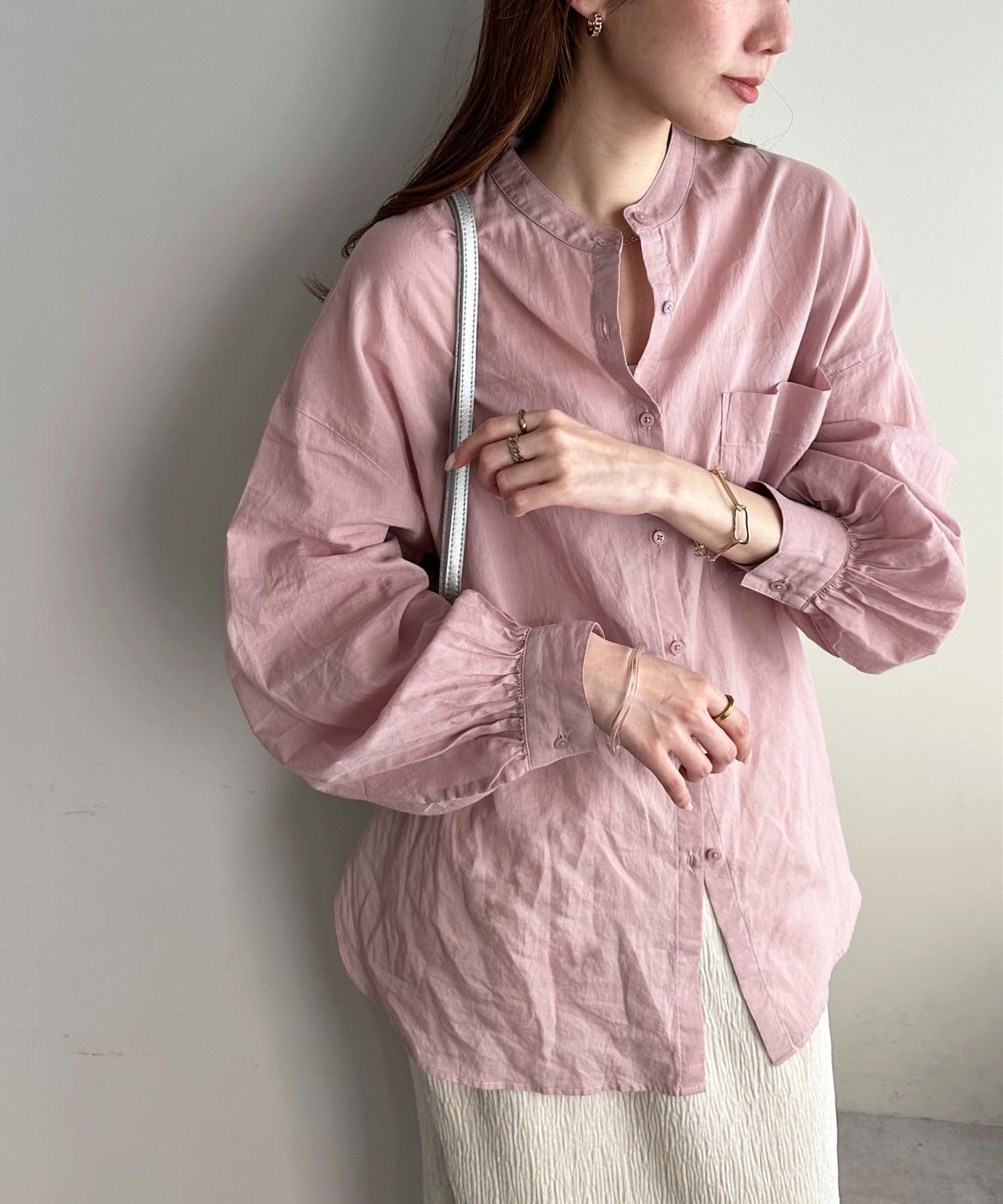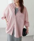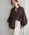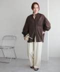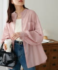 155cmスタッフ: さらっとした軽い素材にゆとりのあるシルエットで着心地抜群♪バンドカラーなので大人カジュアルな着こなしがお楽しみいただけます◎