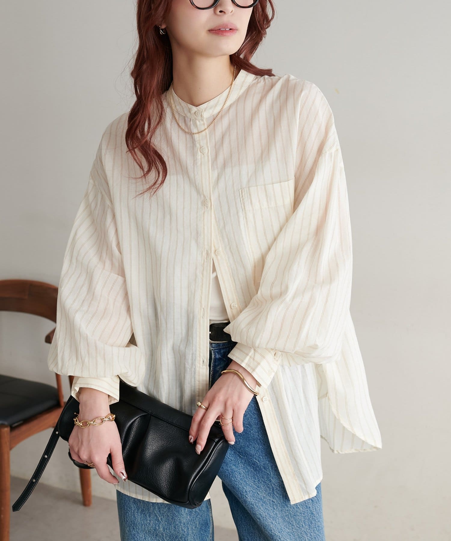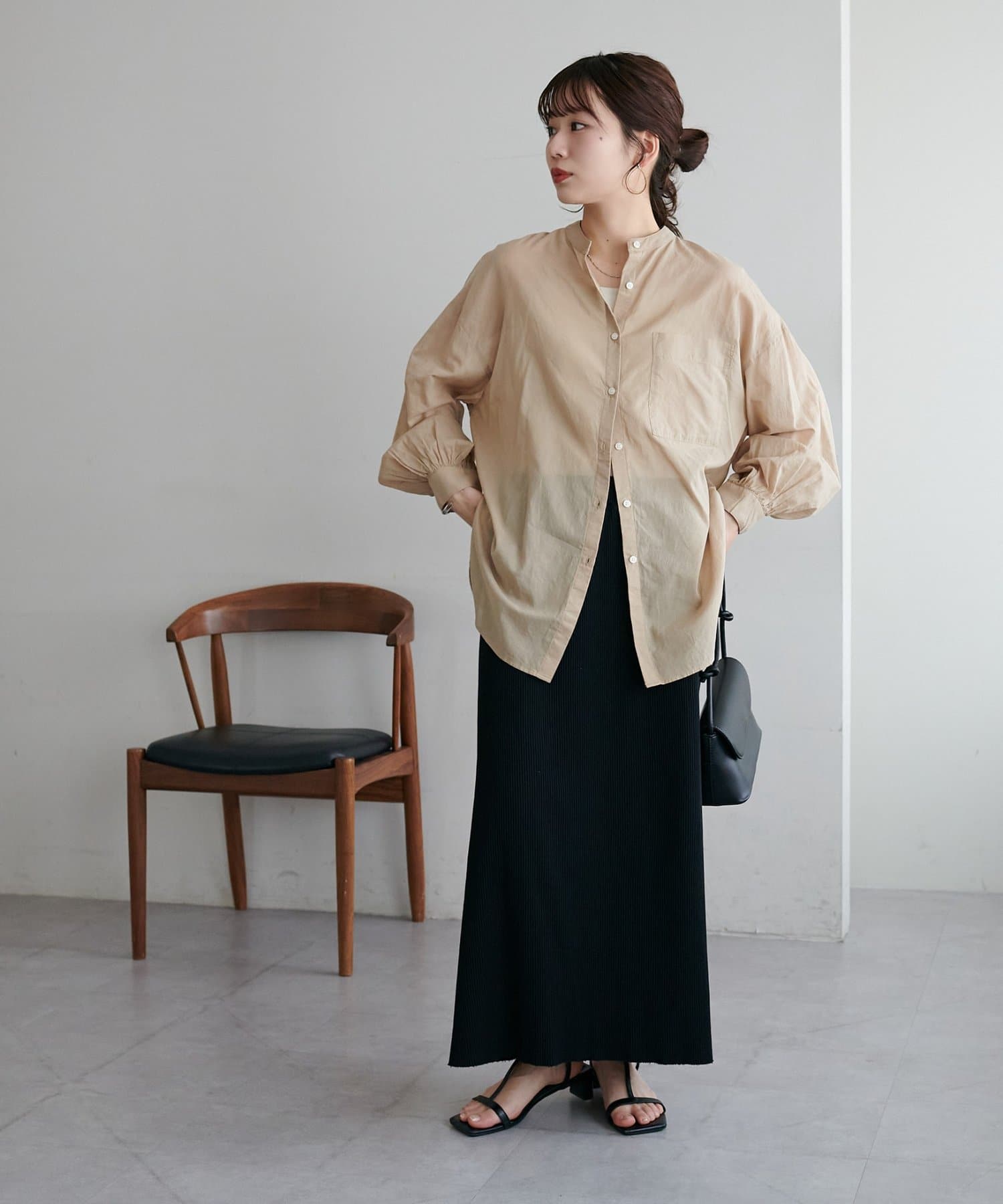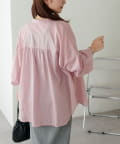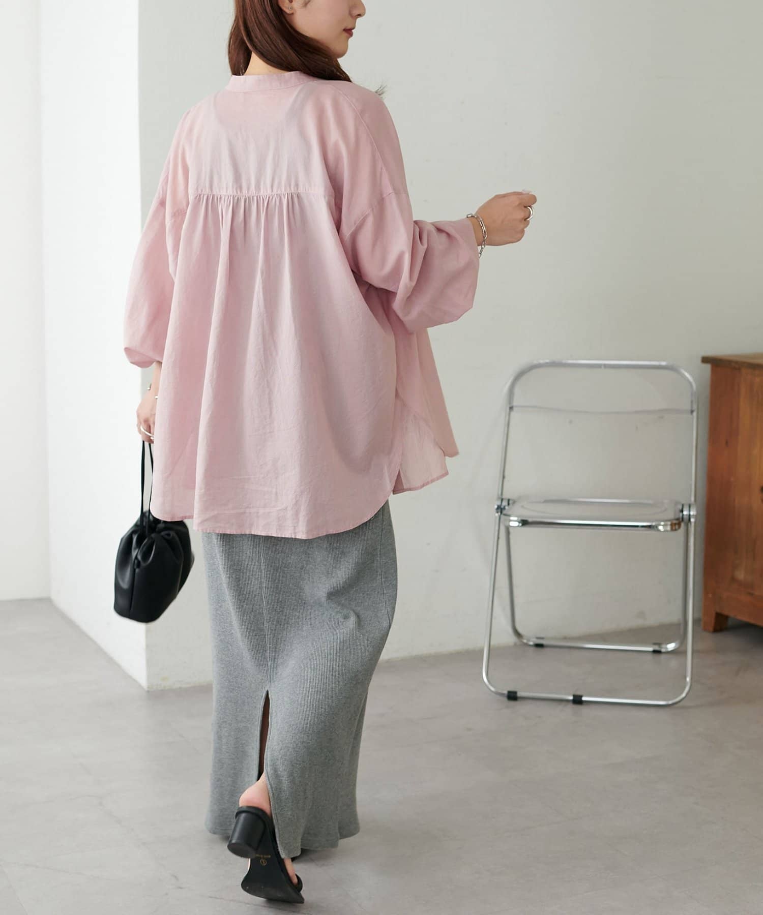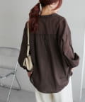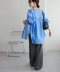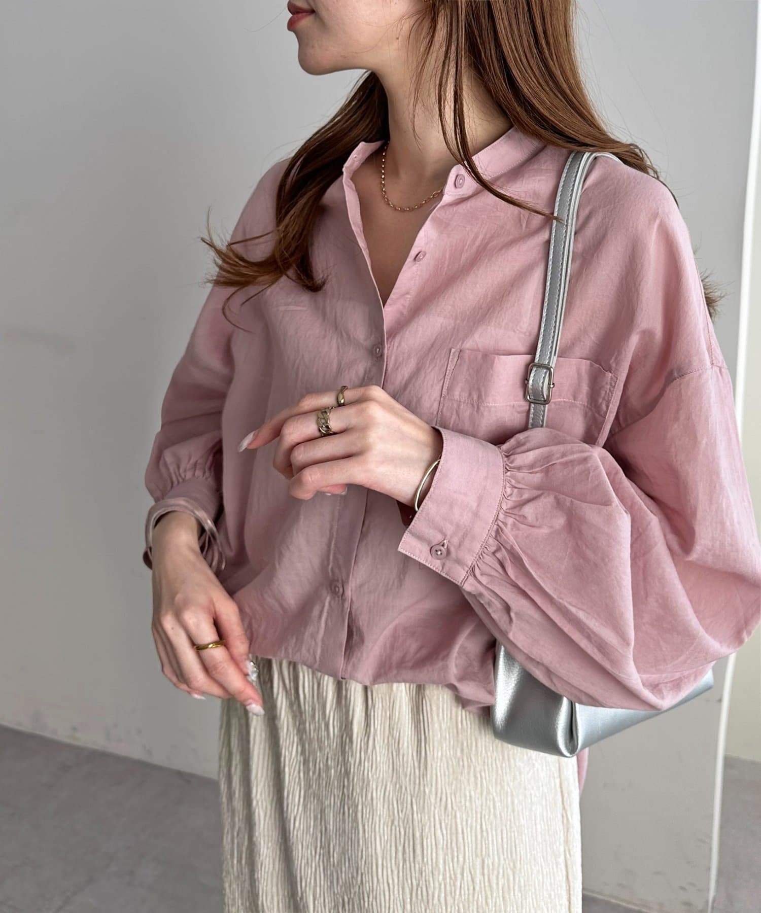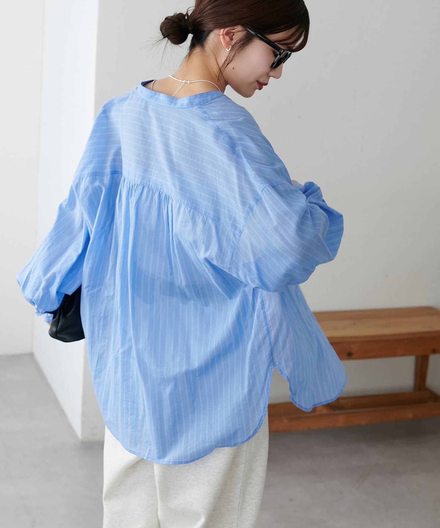 155cmスタッフ: さらっとした軽い素材にゆとりのあるシルエットで着心地抜群♪バンドカラーなので大人カジュアルな着こなしがお楽しみいただけます◎