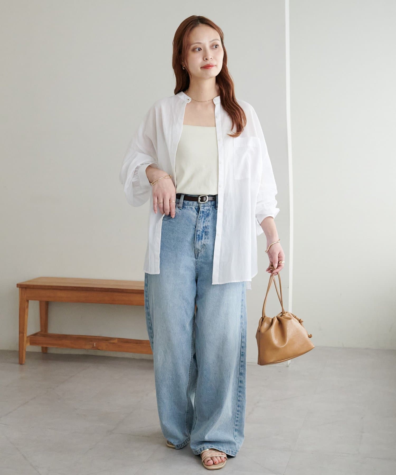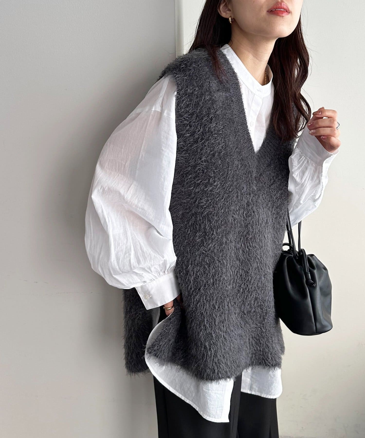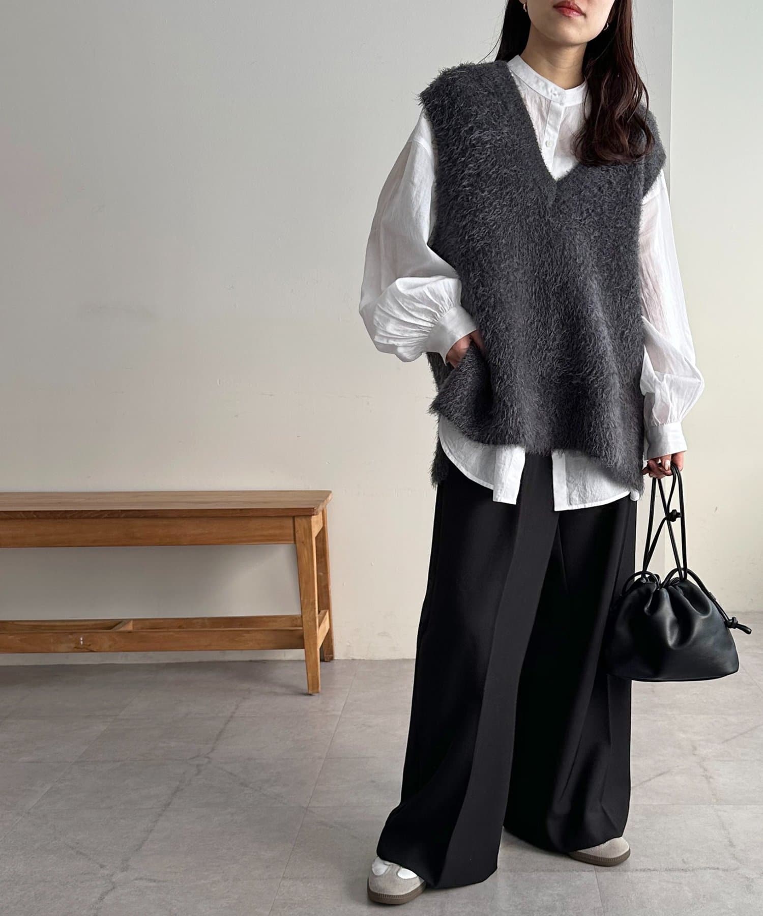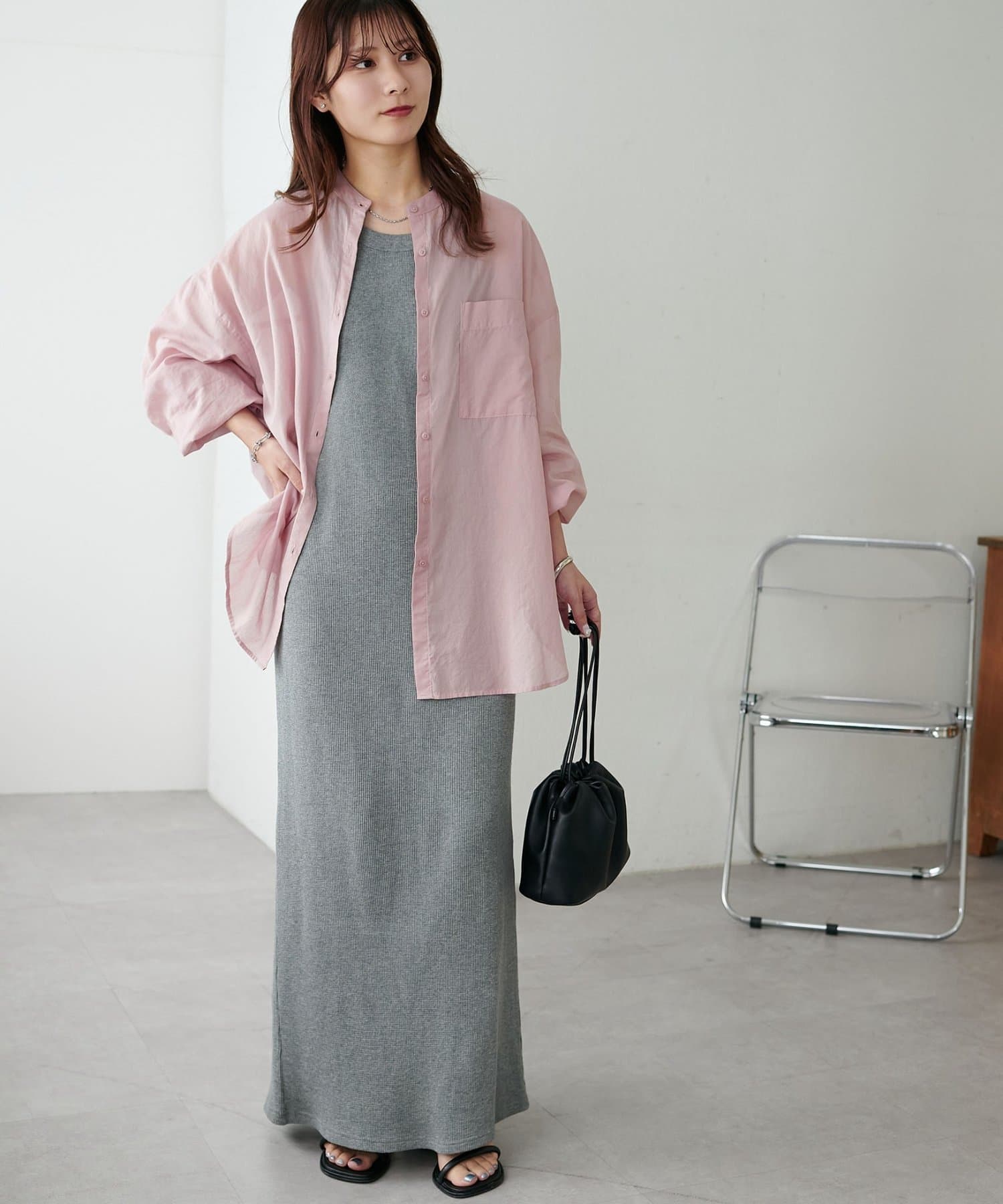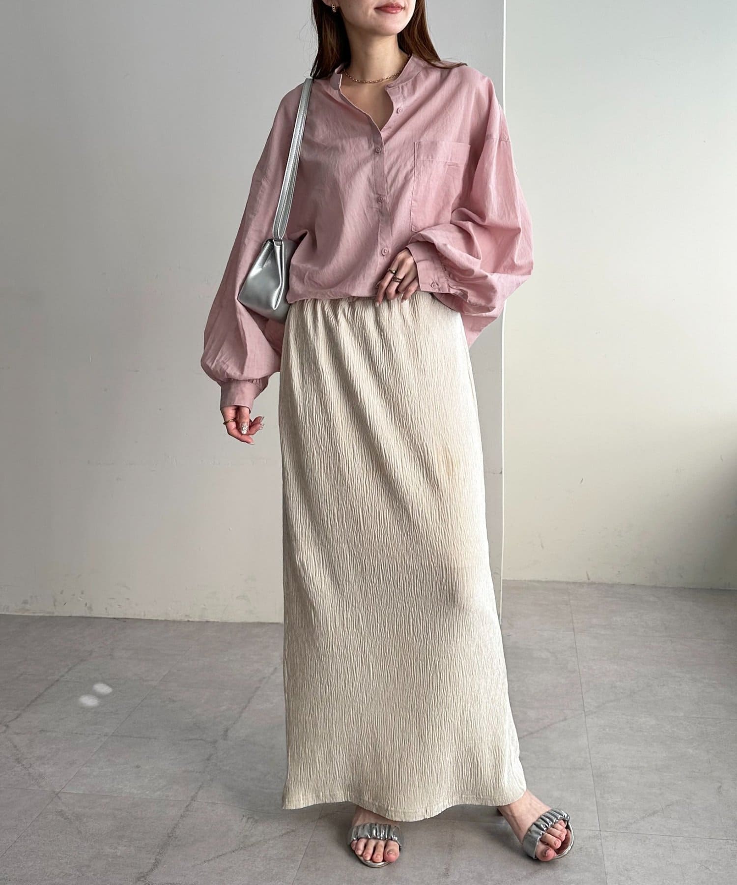 155cmスタッフ: さらっとした軽い素材にゆとりのあるシルエットで着心地抜群♪バンドカラーなので大人カジュアルな着こなしがお楽しみいただけます◎