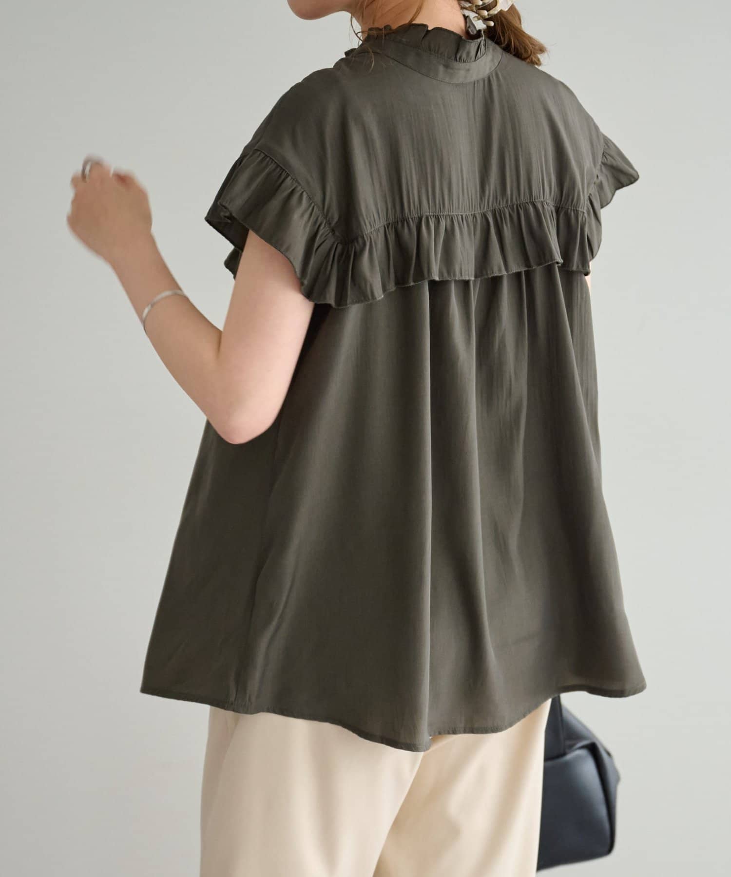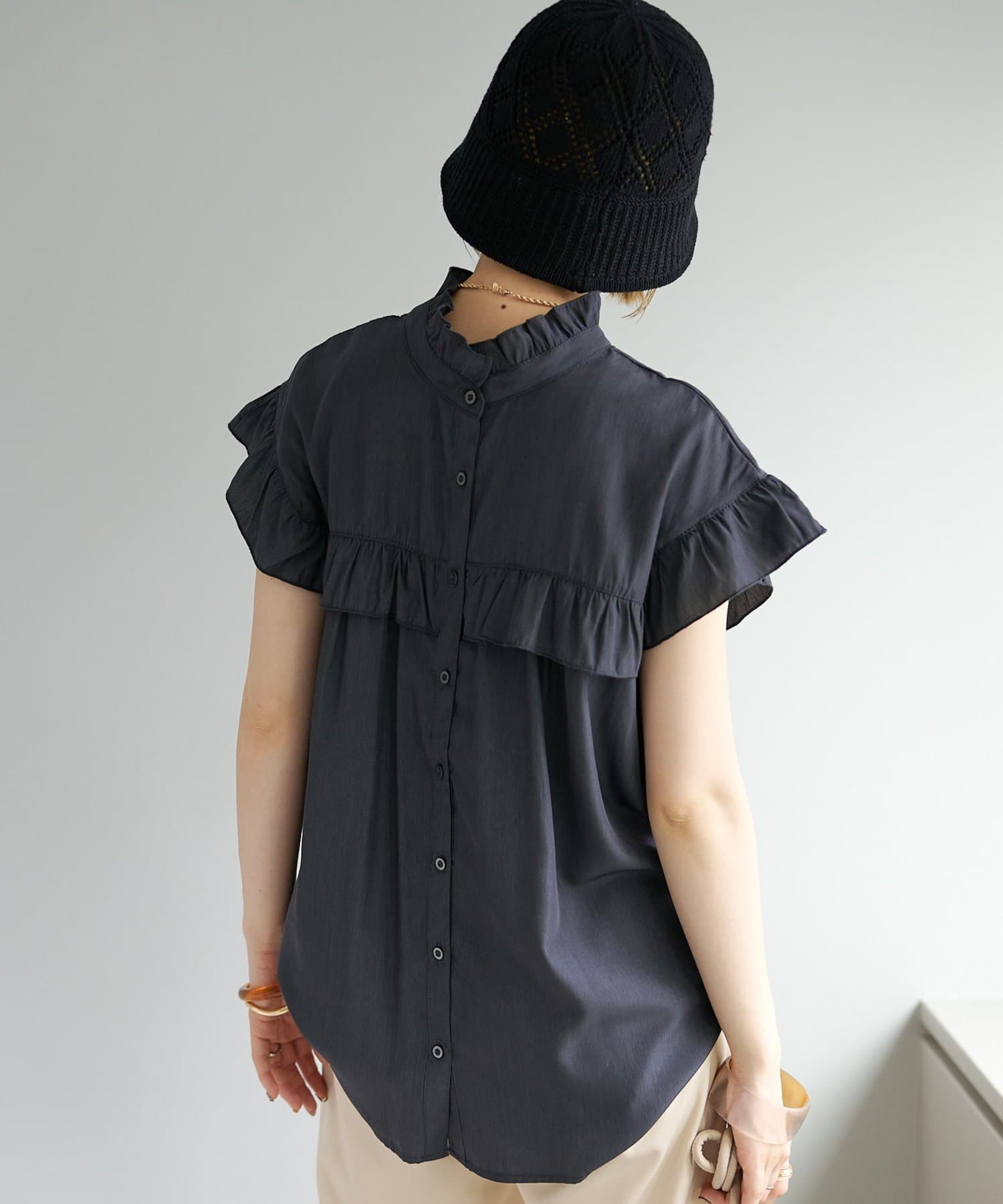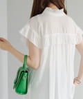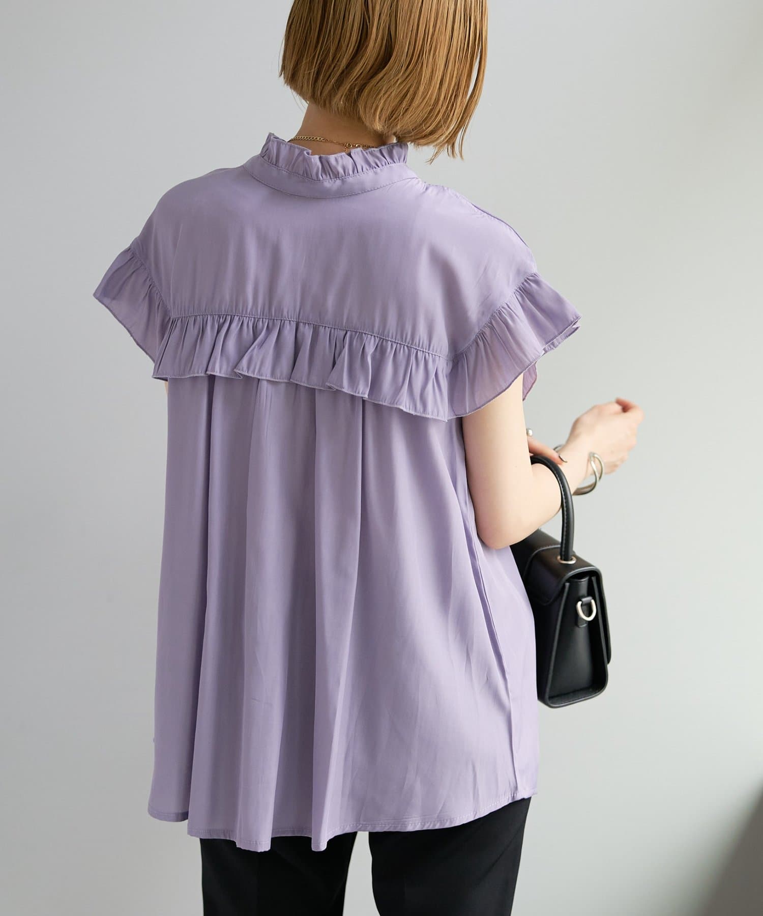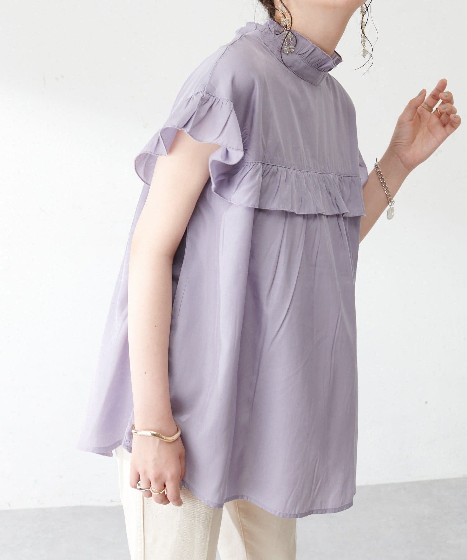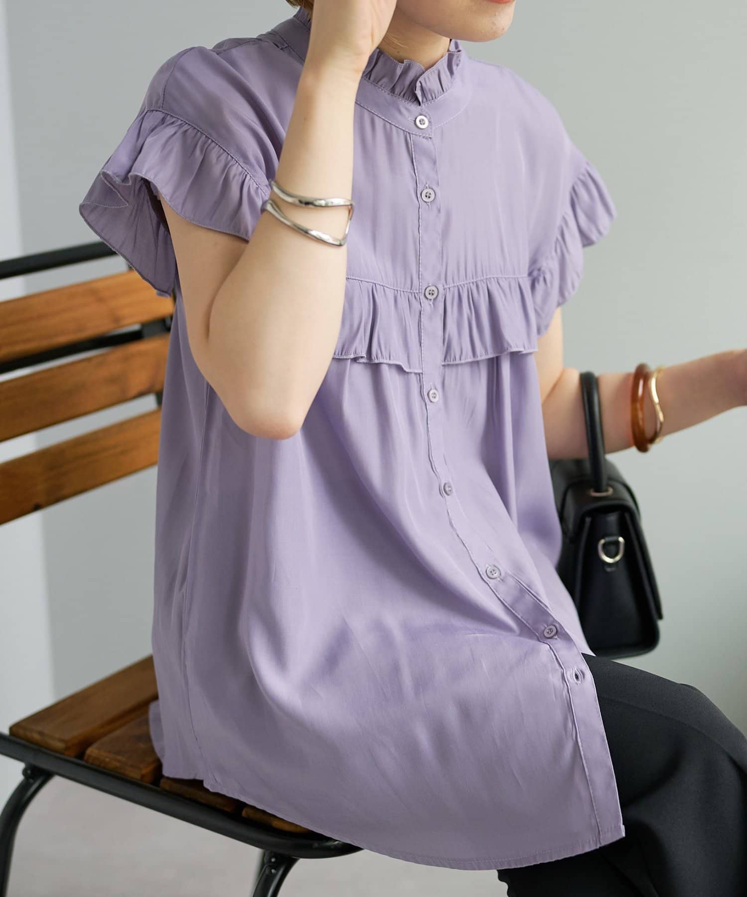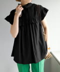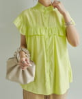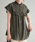 ・フェミニンなフリルをスタンドカラーのネックラインや、袖口、胸元にあしらったデザイン