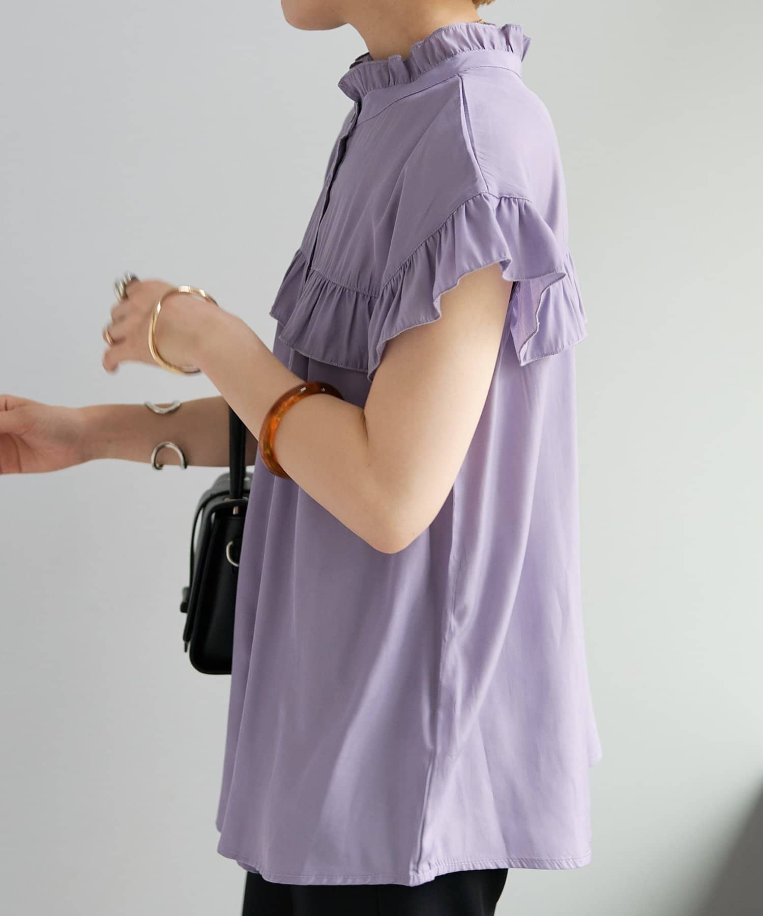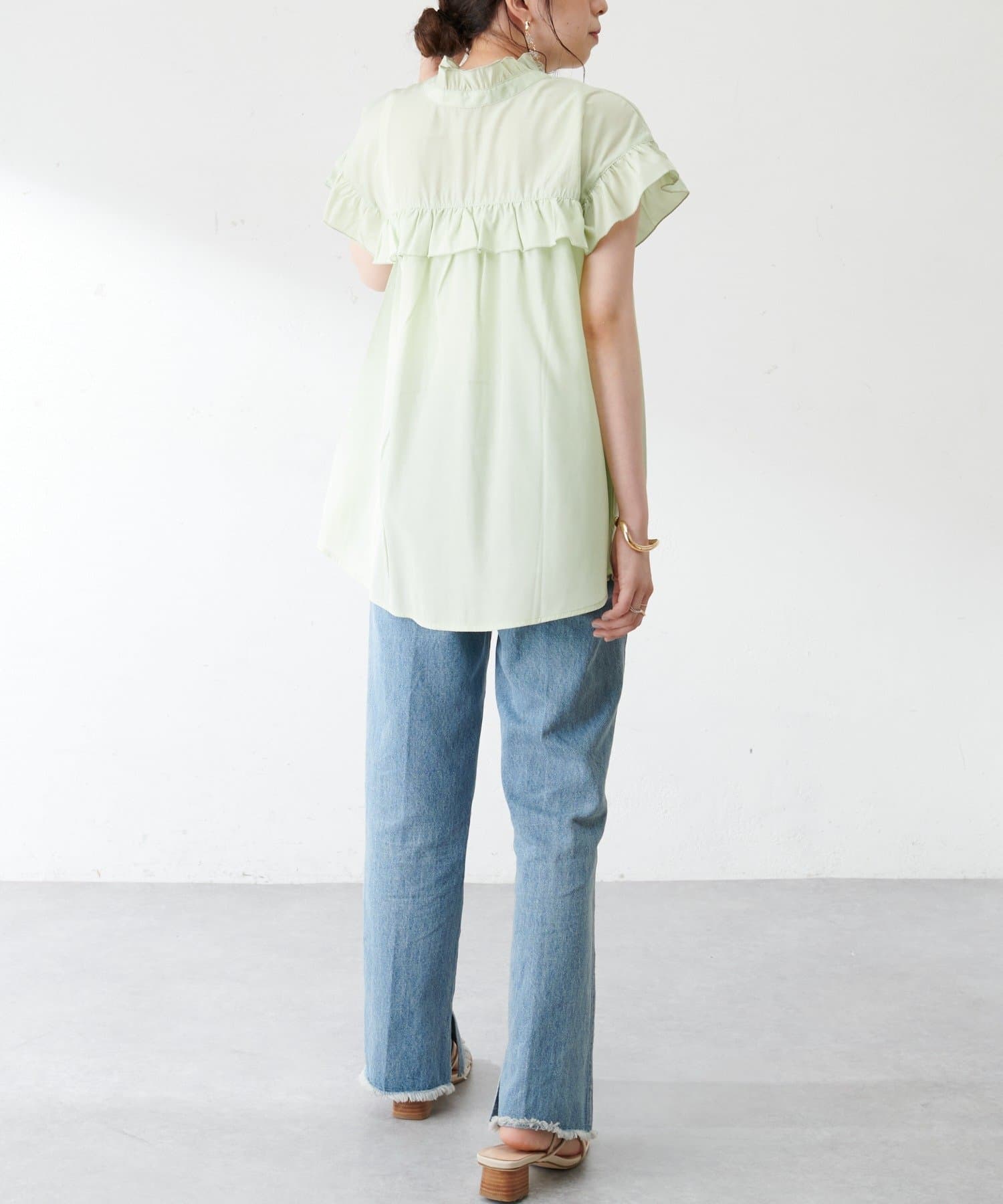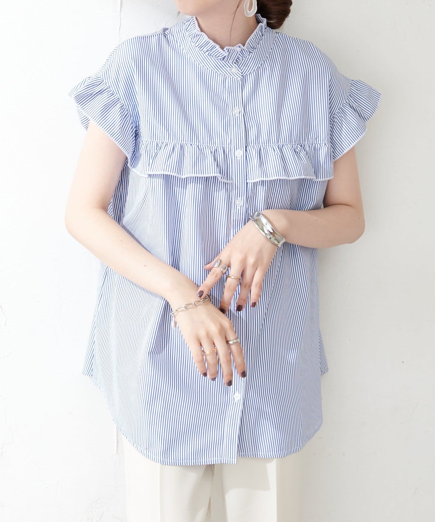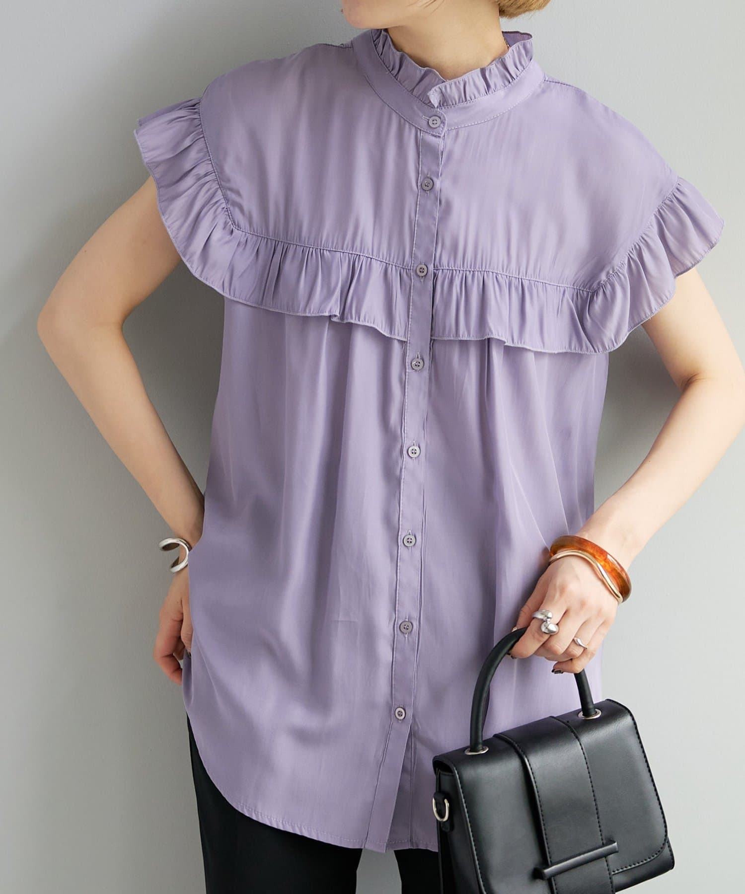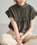 ・フェミニンなフリルをスタンドカラーのネックラインや、袖口、胸元にあしらったデザイン