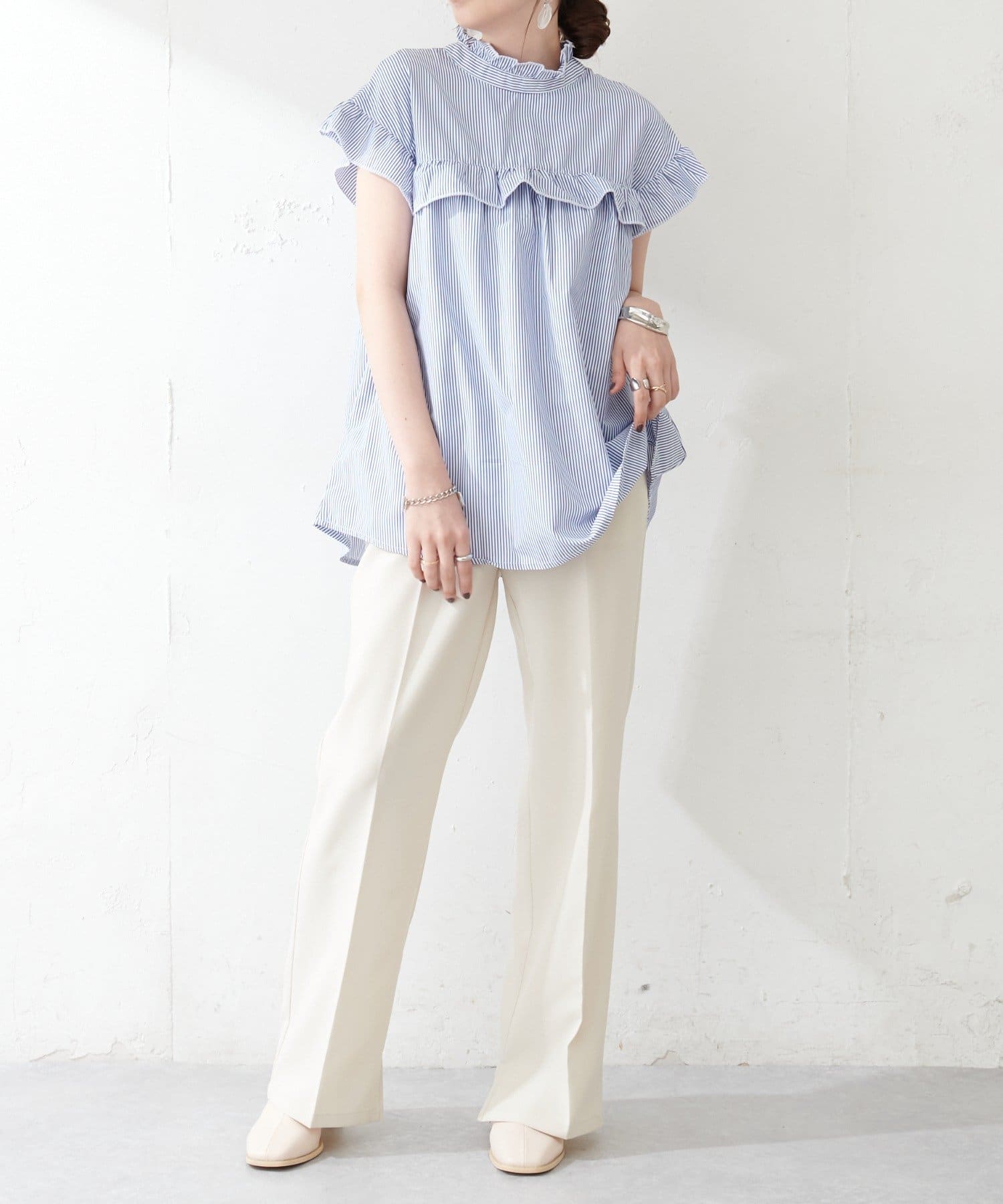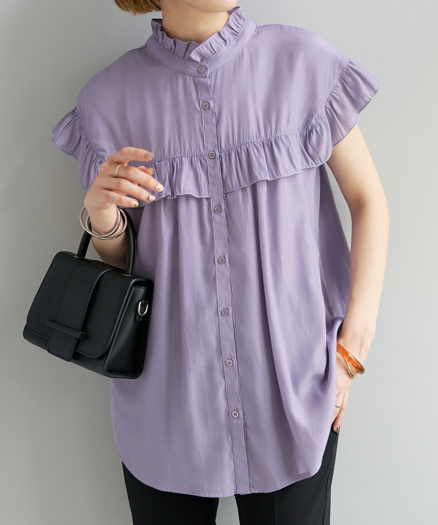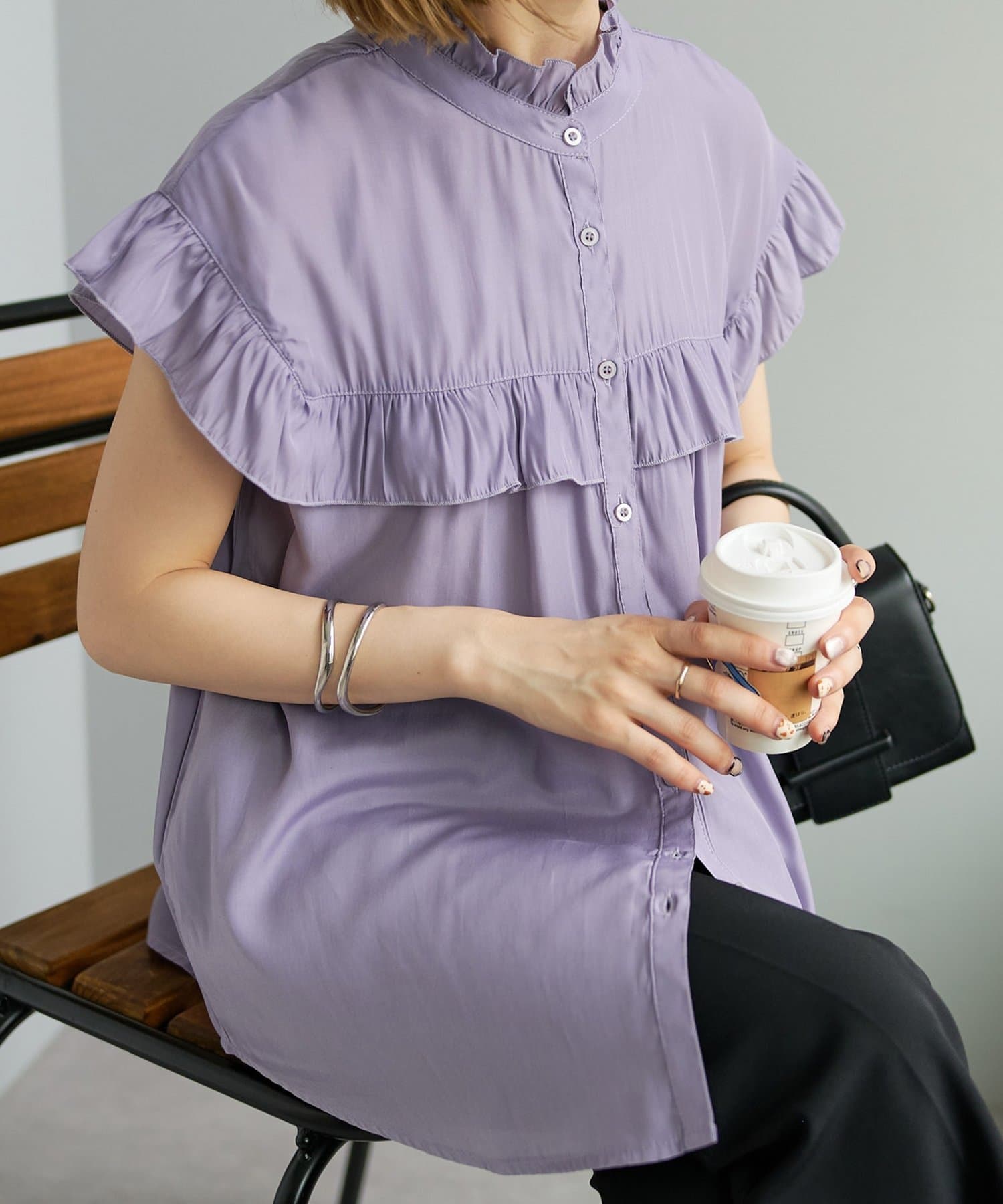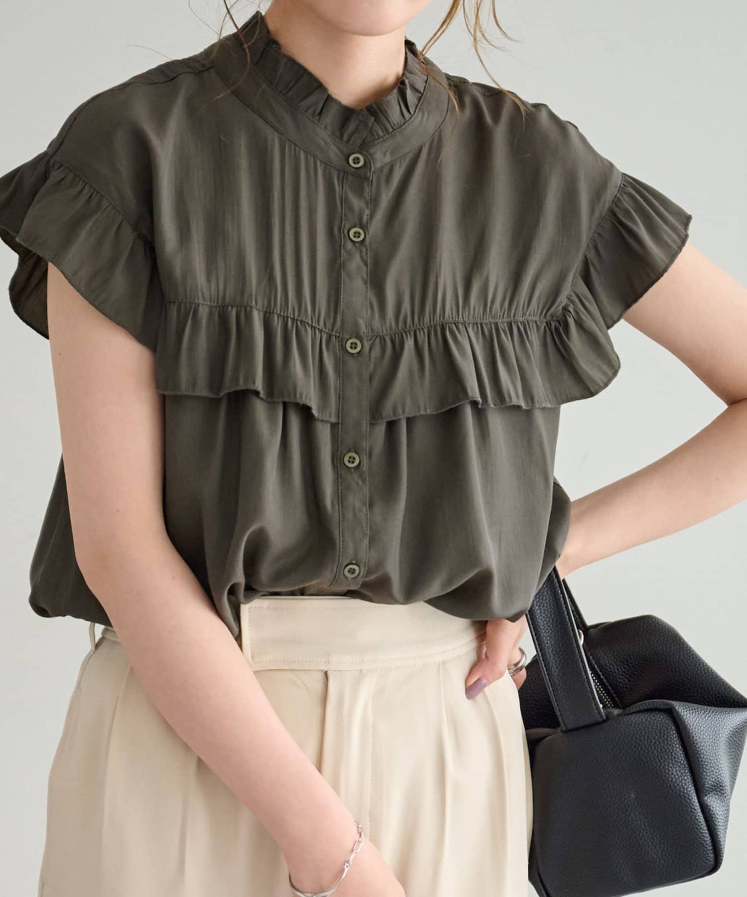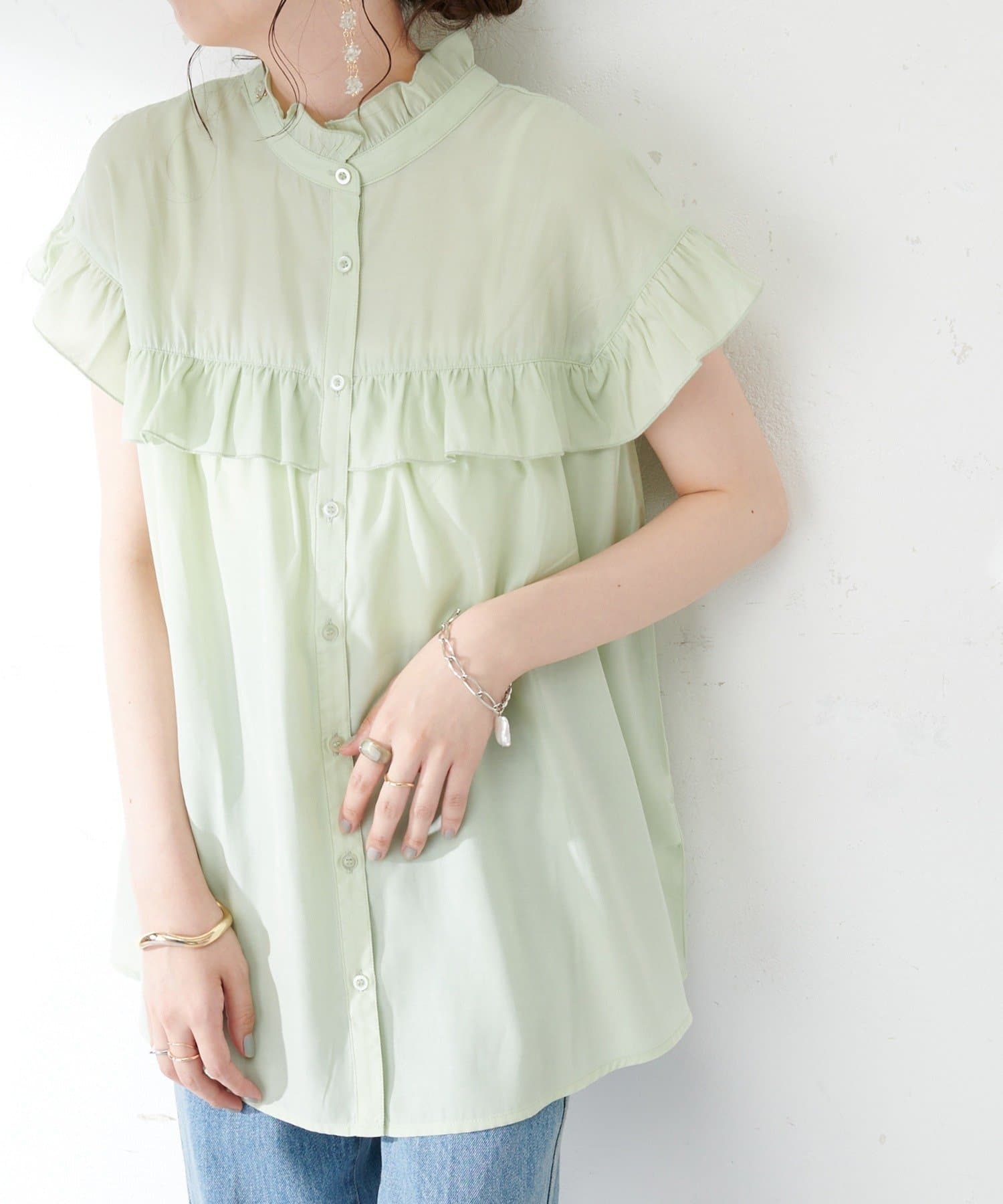 ・フェミニンなフリルをスタンドカラーのネックラインや、袖口、胸元にあしらったデザイン