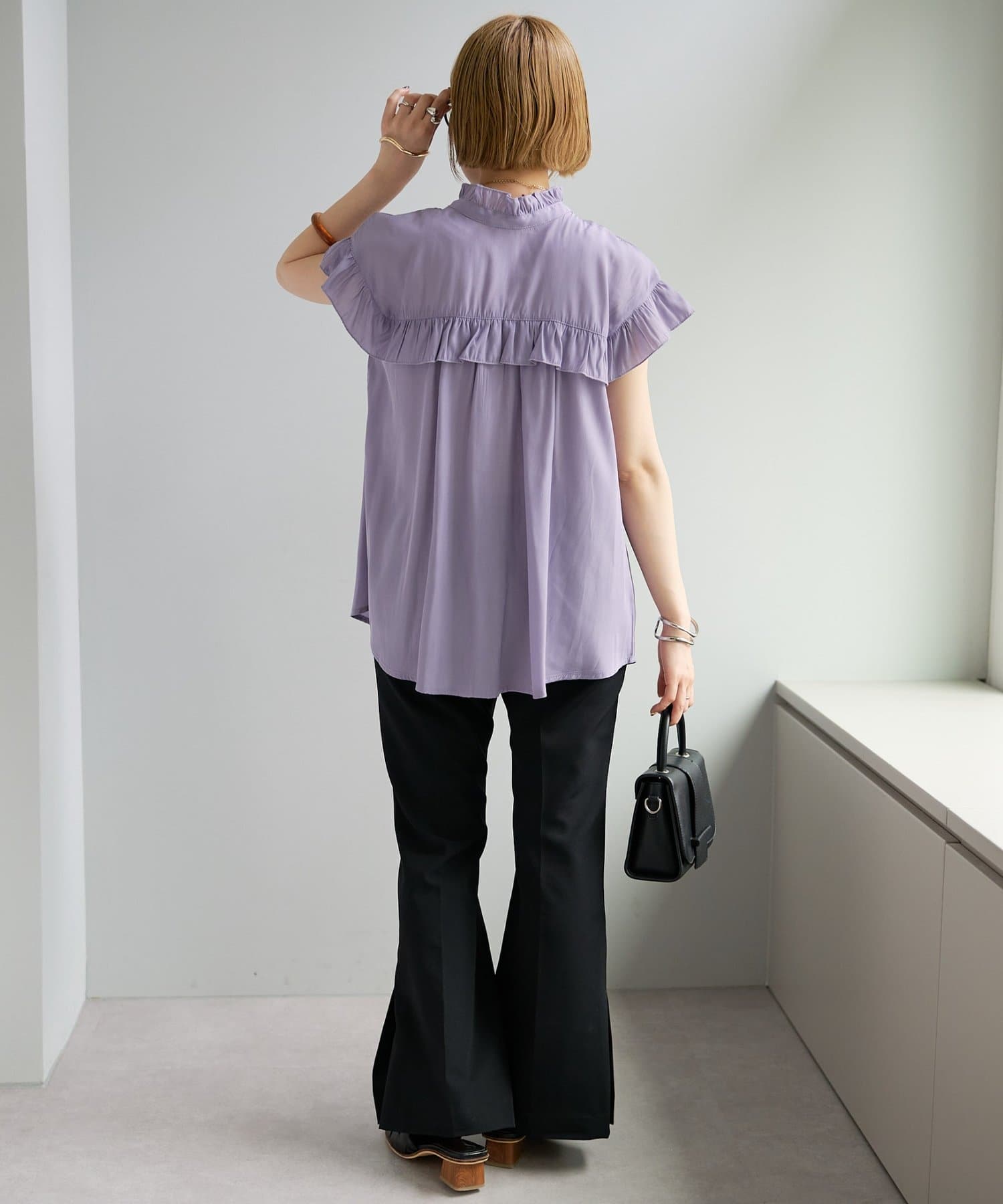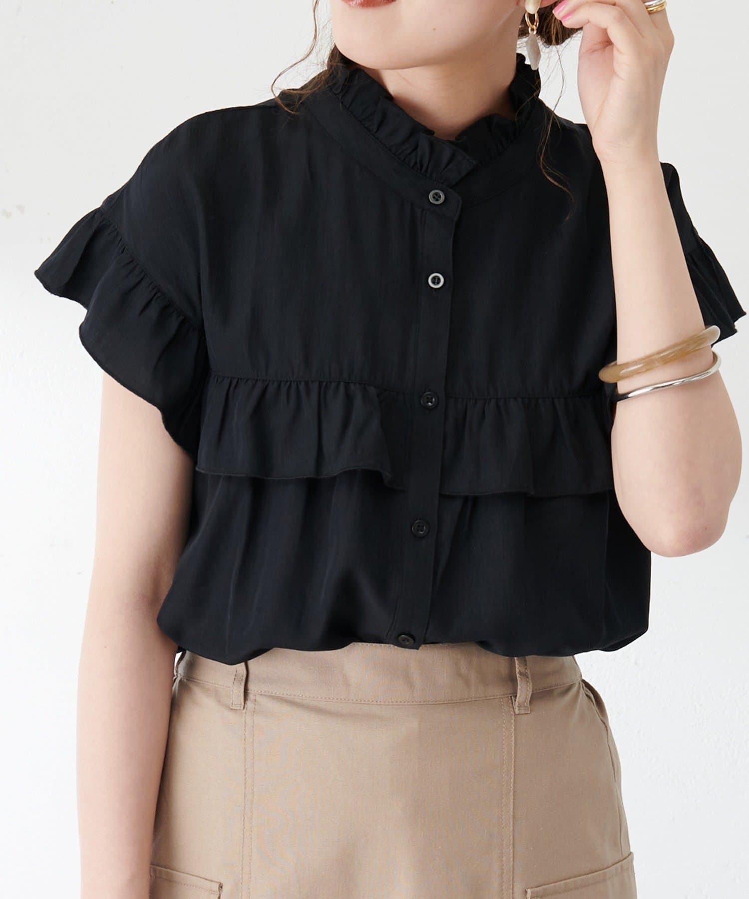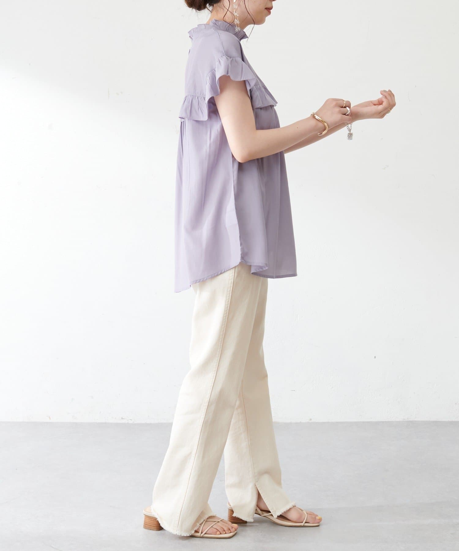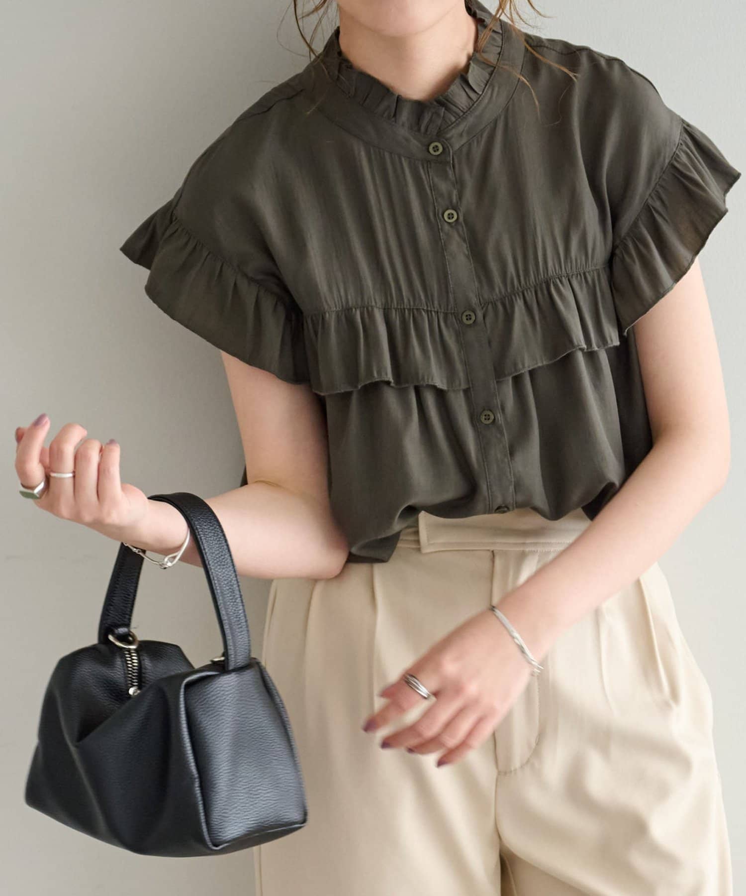 ・フェミニンなフリルをスタンドカラーのネックラインや、袖口、胸元にあしらったデザイン