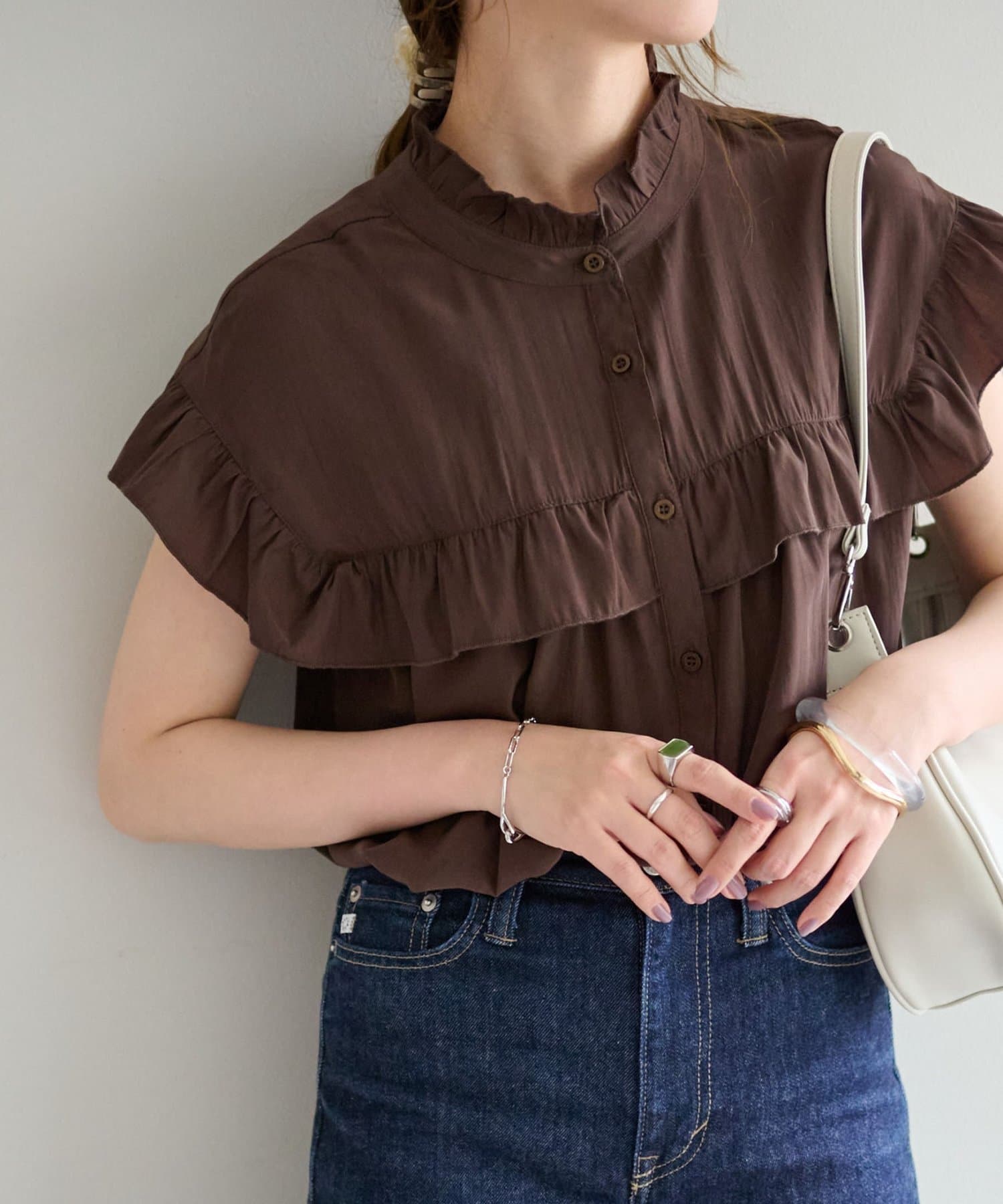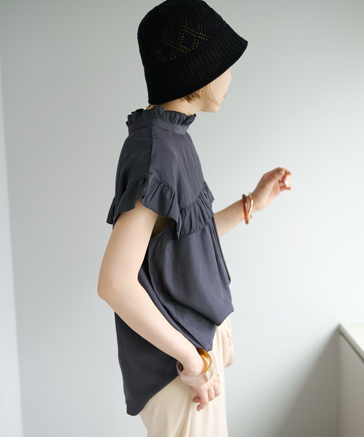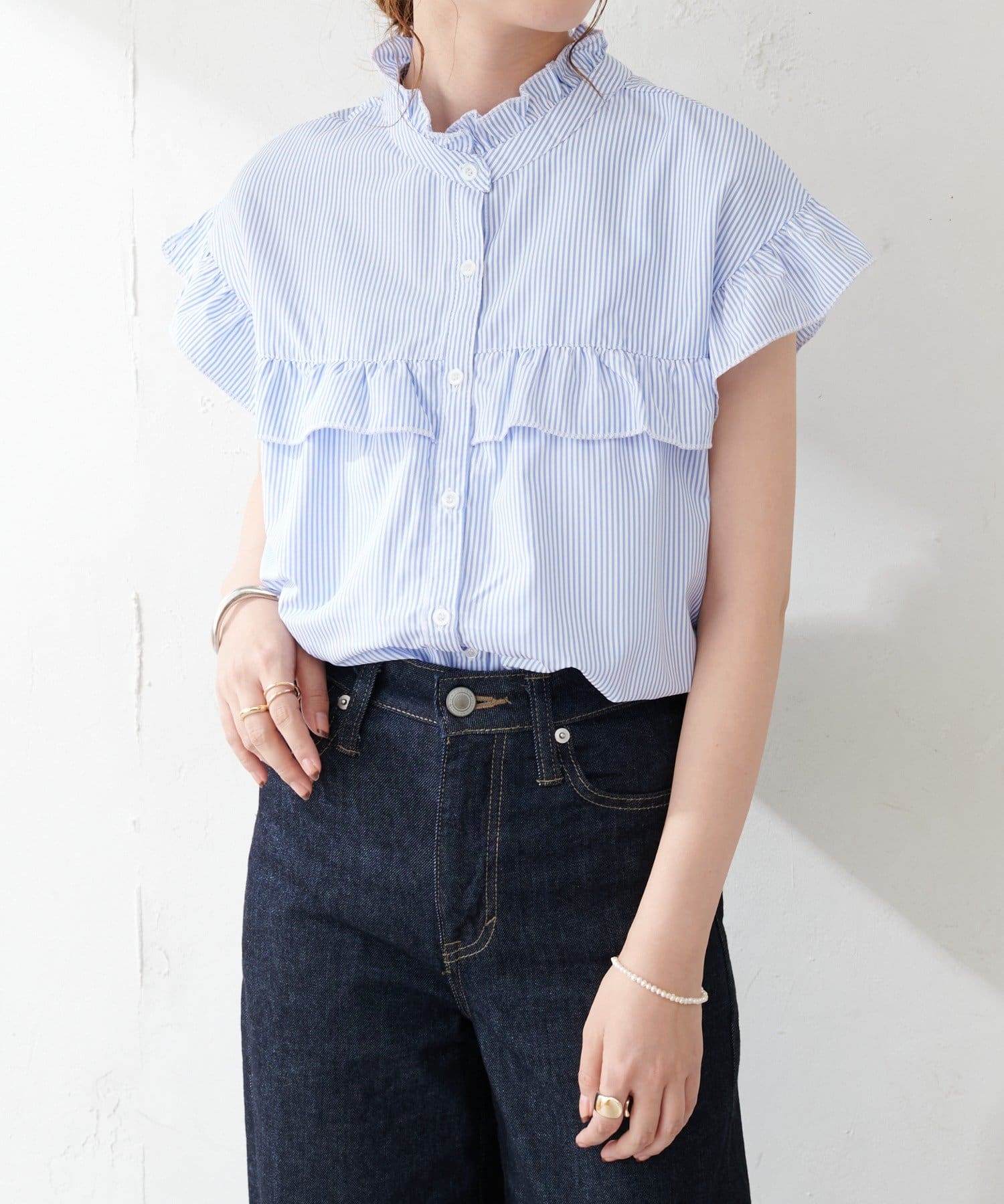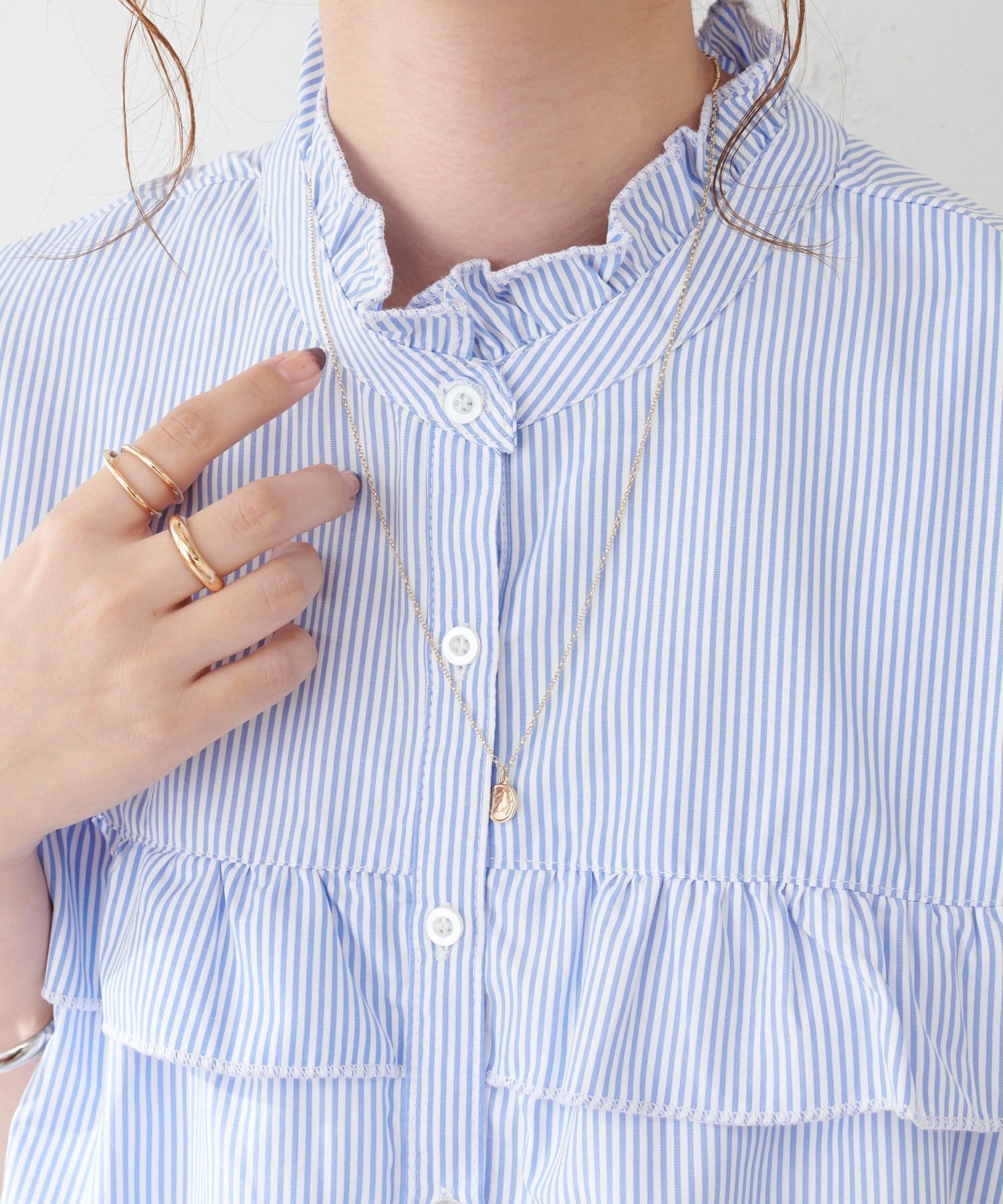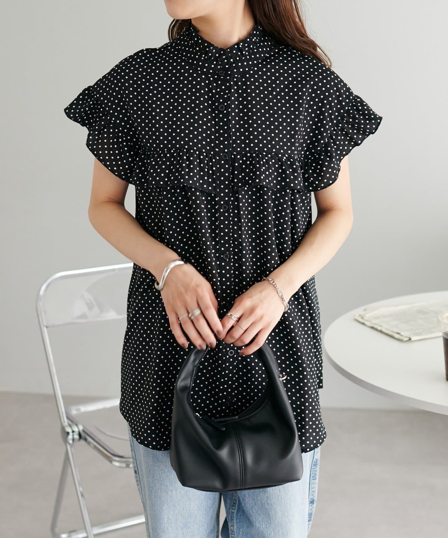 ・フェミニンなフリルをスタンドカラーのネックラインや、袖口、胸元にあしらったデザイン