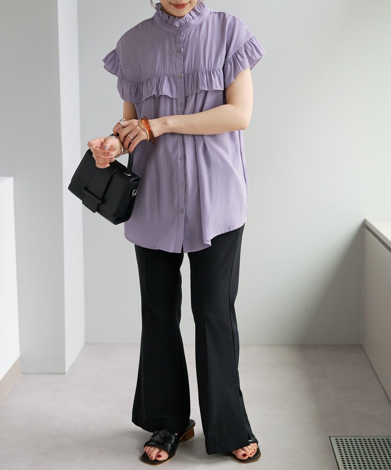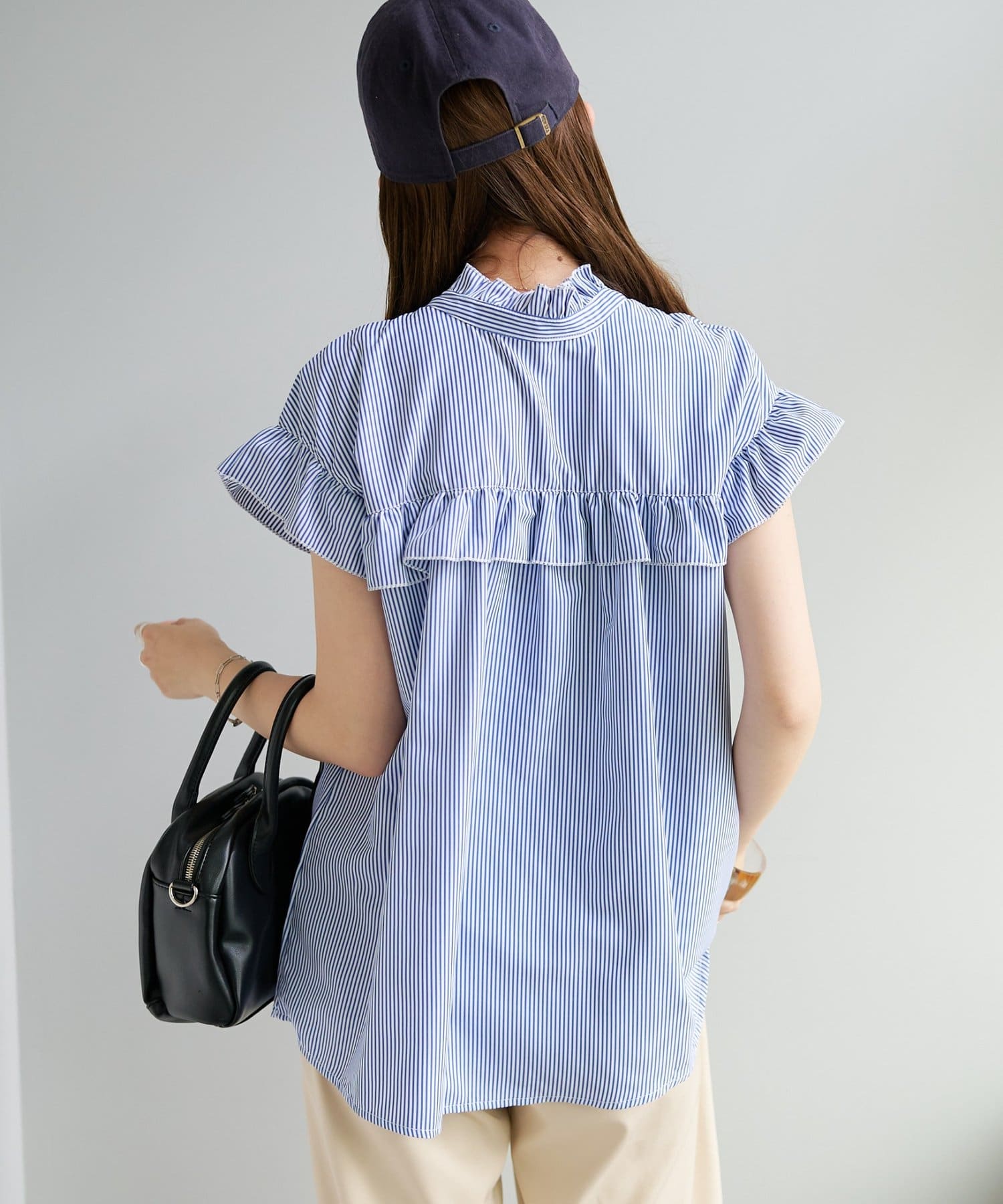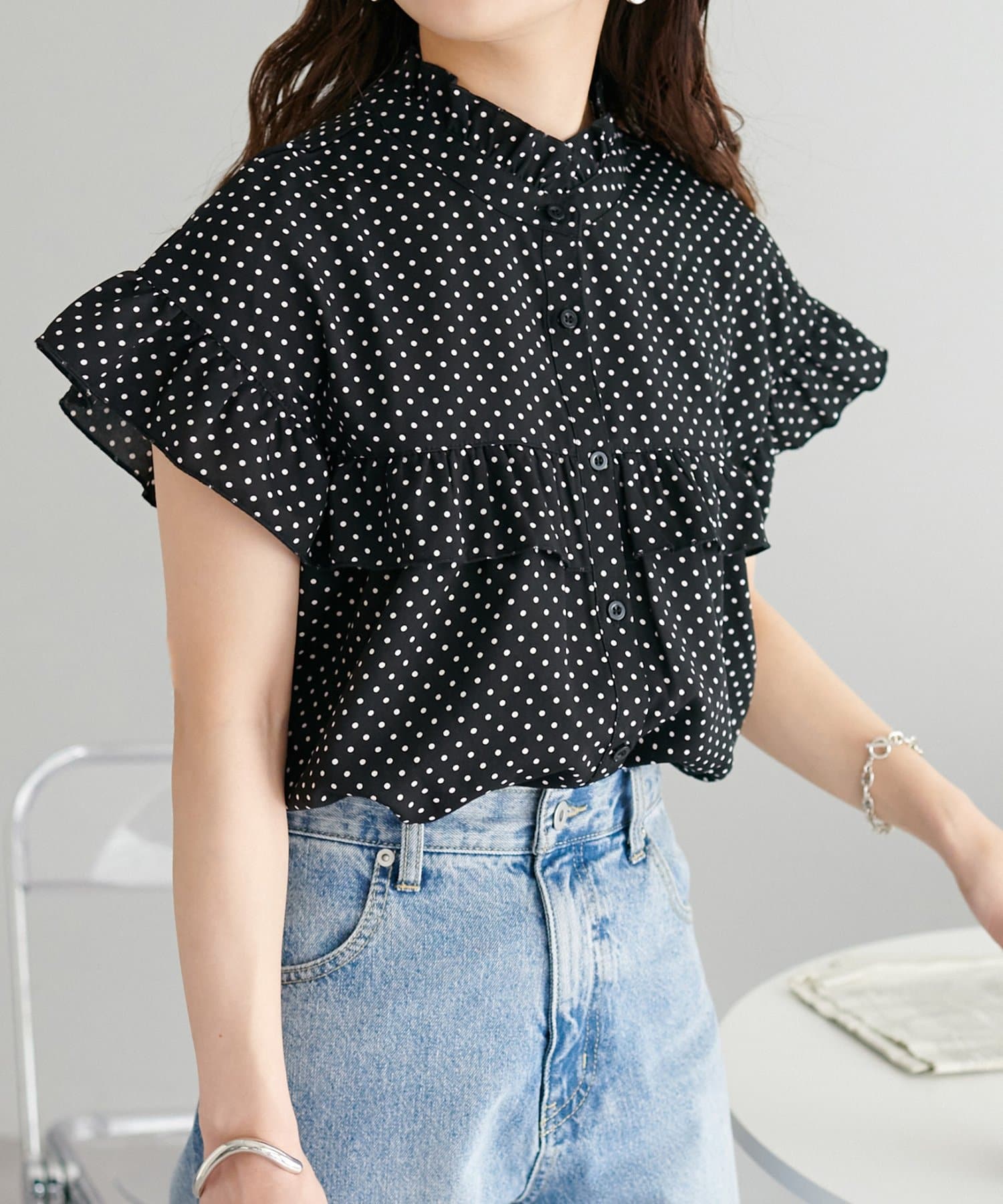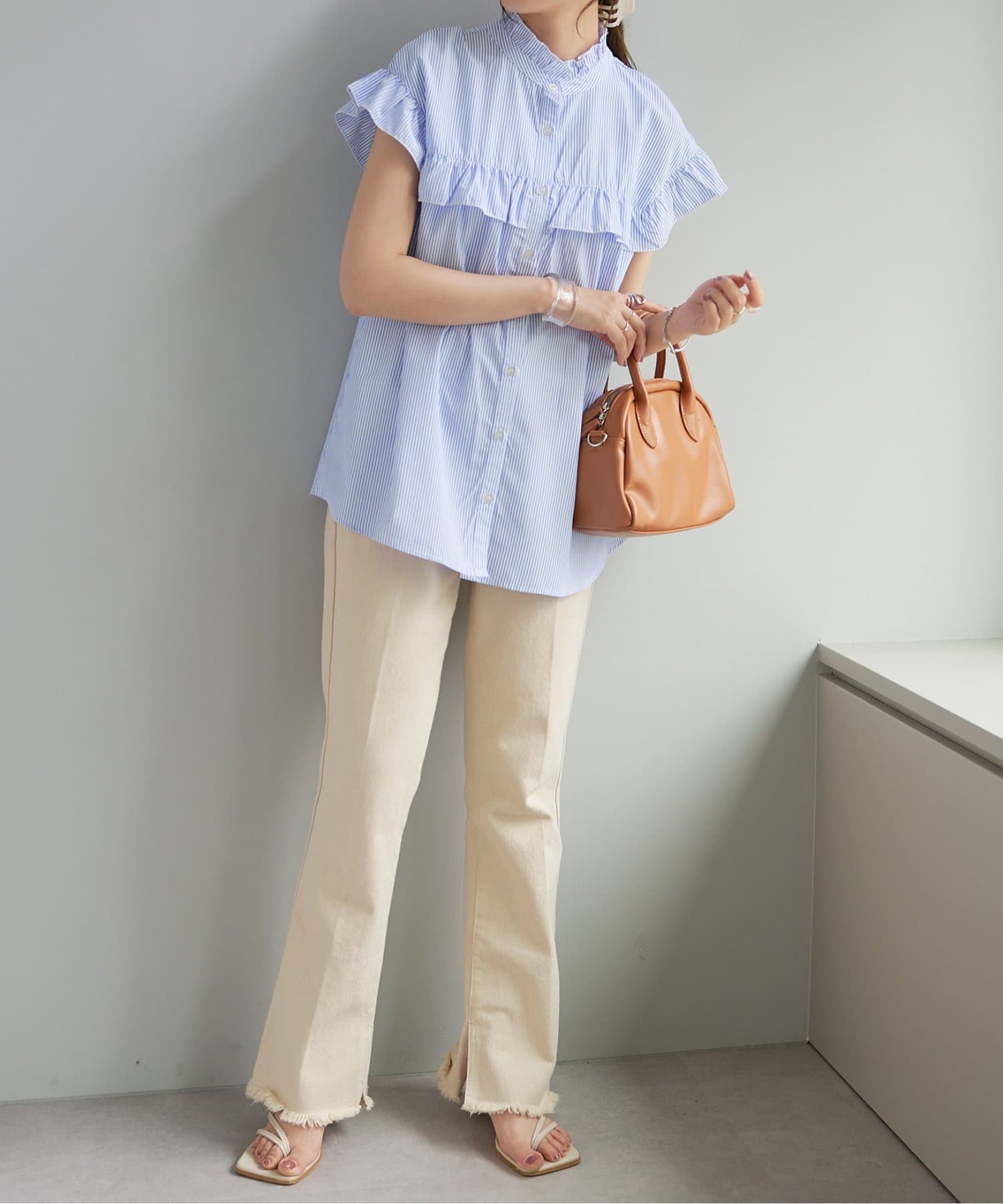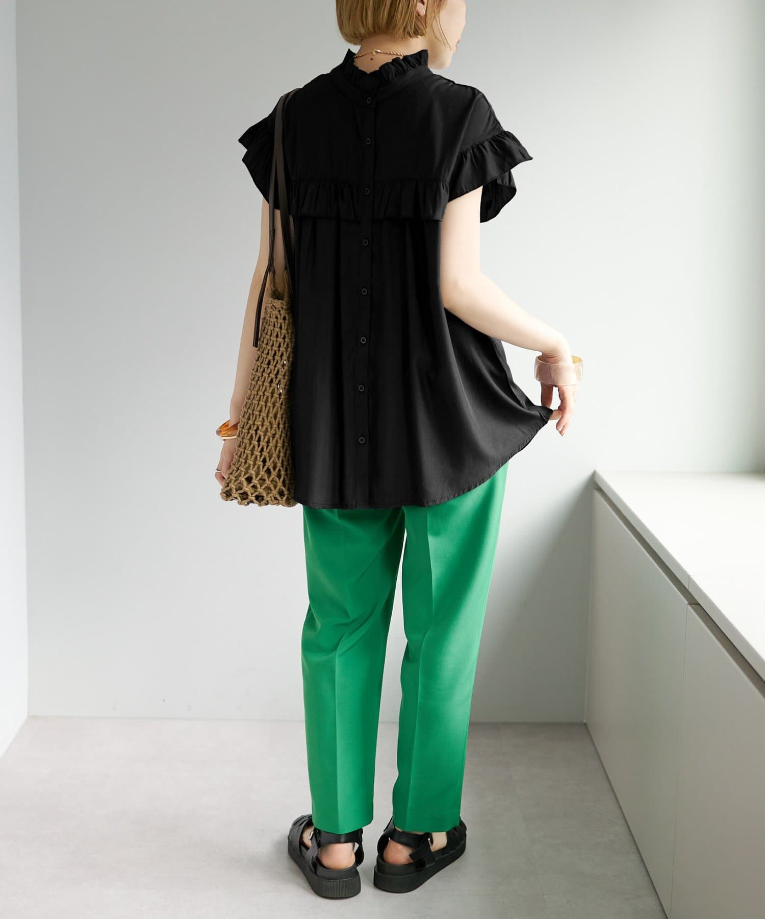 ・フェミニンなフリルをスタンドカラーのネックラインや、袖口、胸元にあしらったデザイン