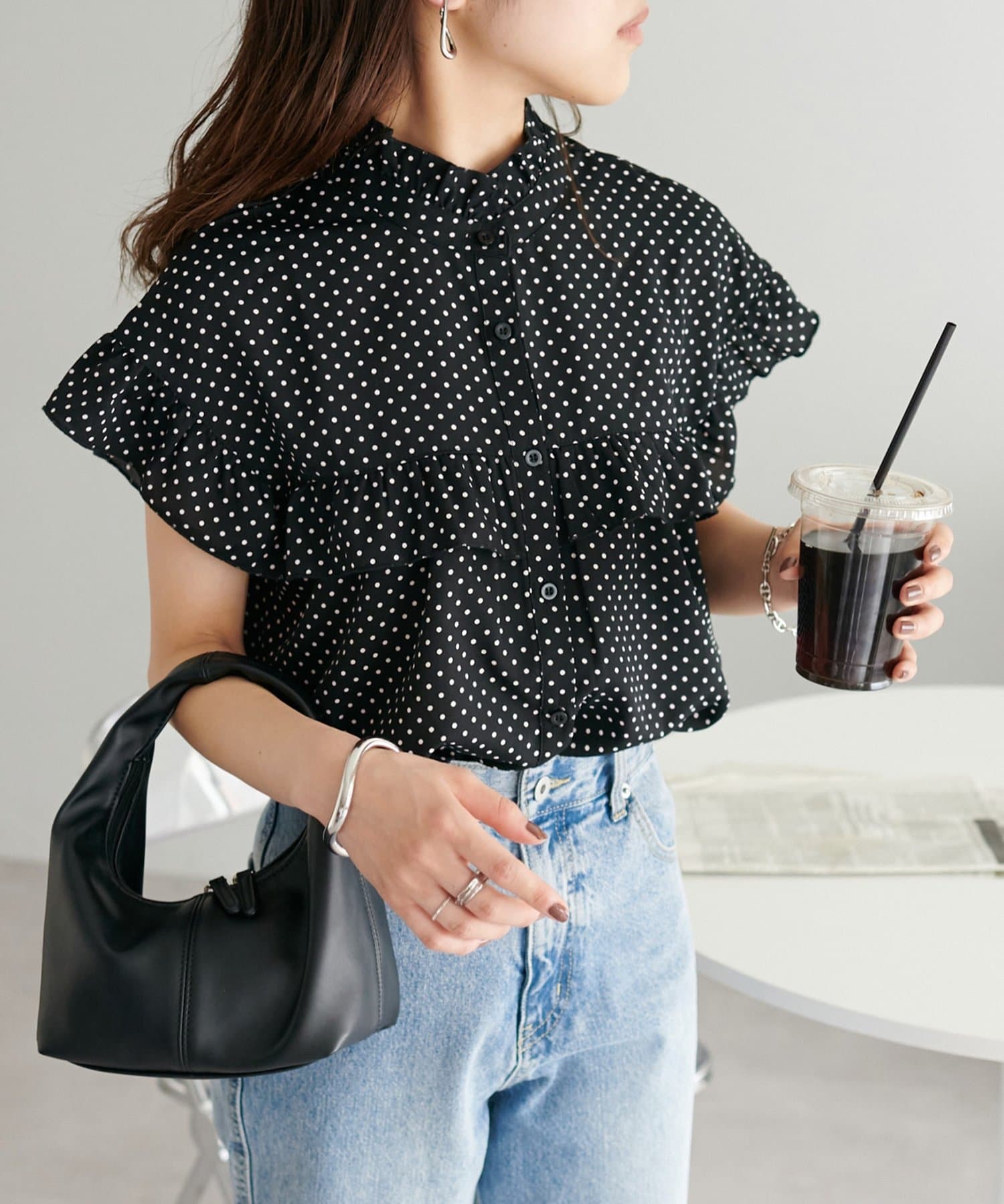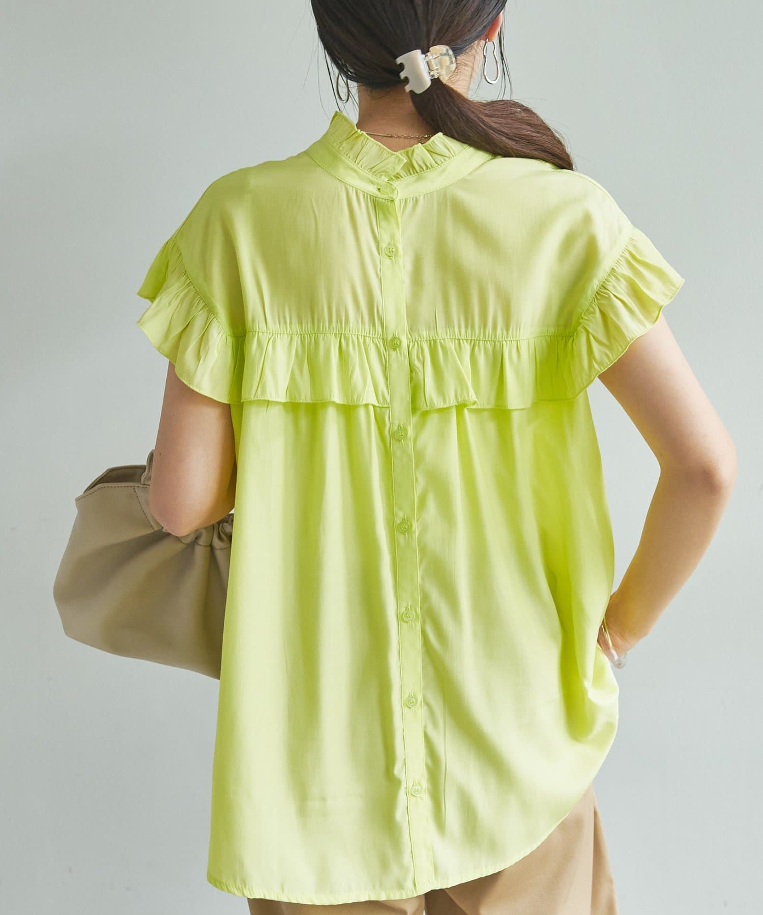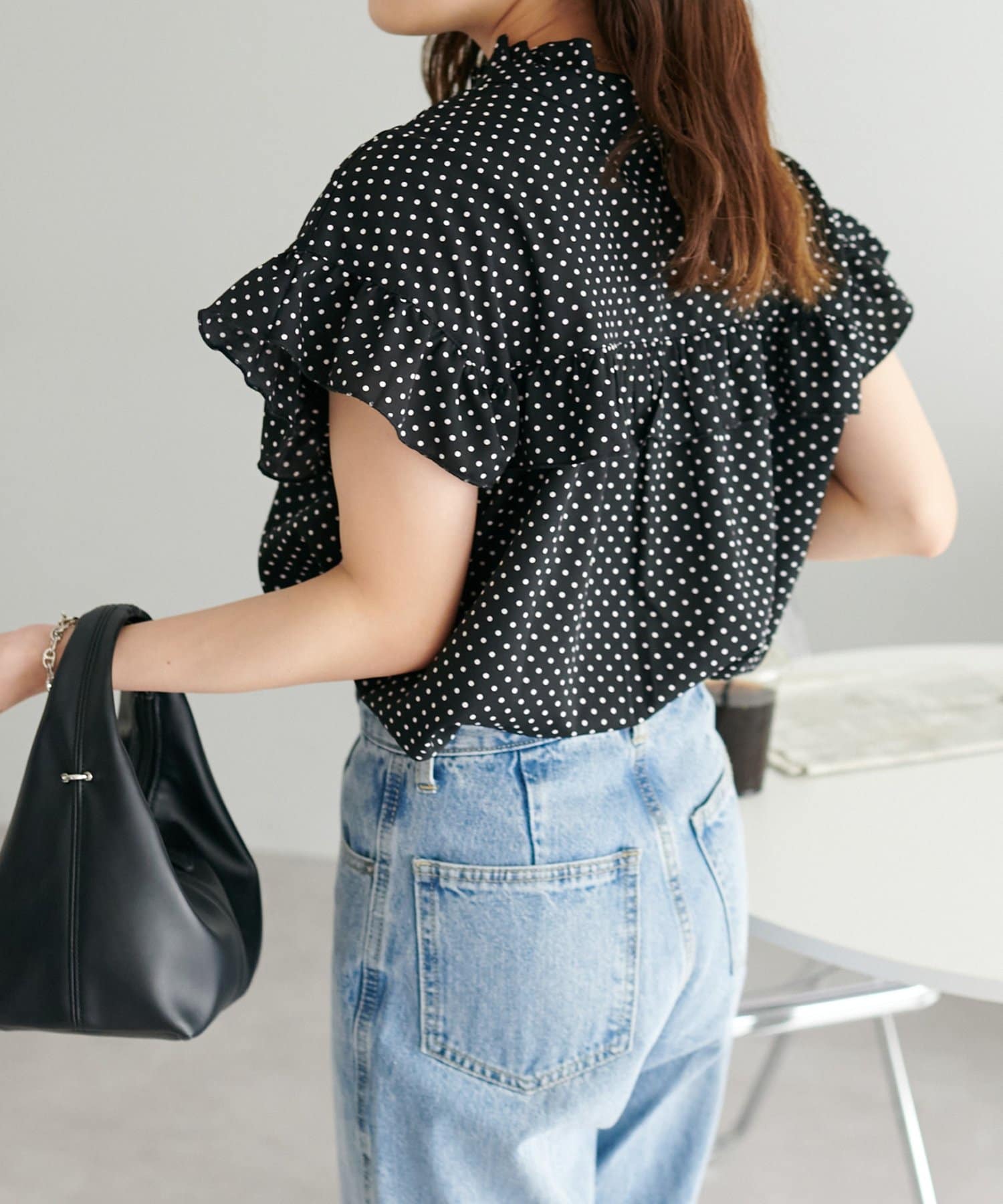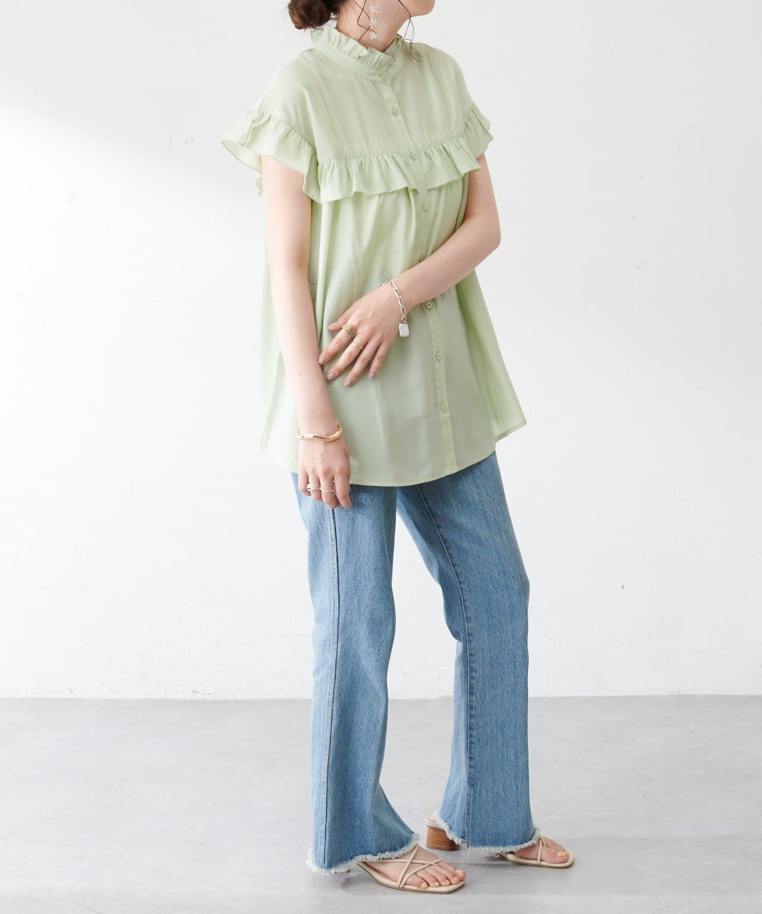 ・フェミニンなフリルをスタンドカラーのネックラインや、袖口、胸元にあしらったデザイン