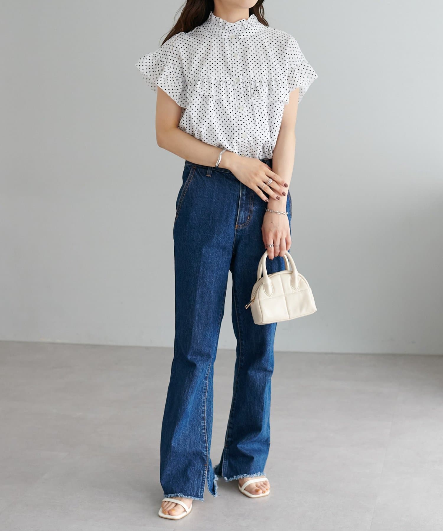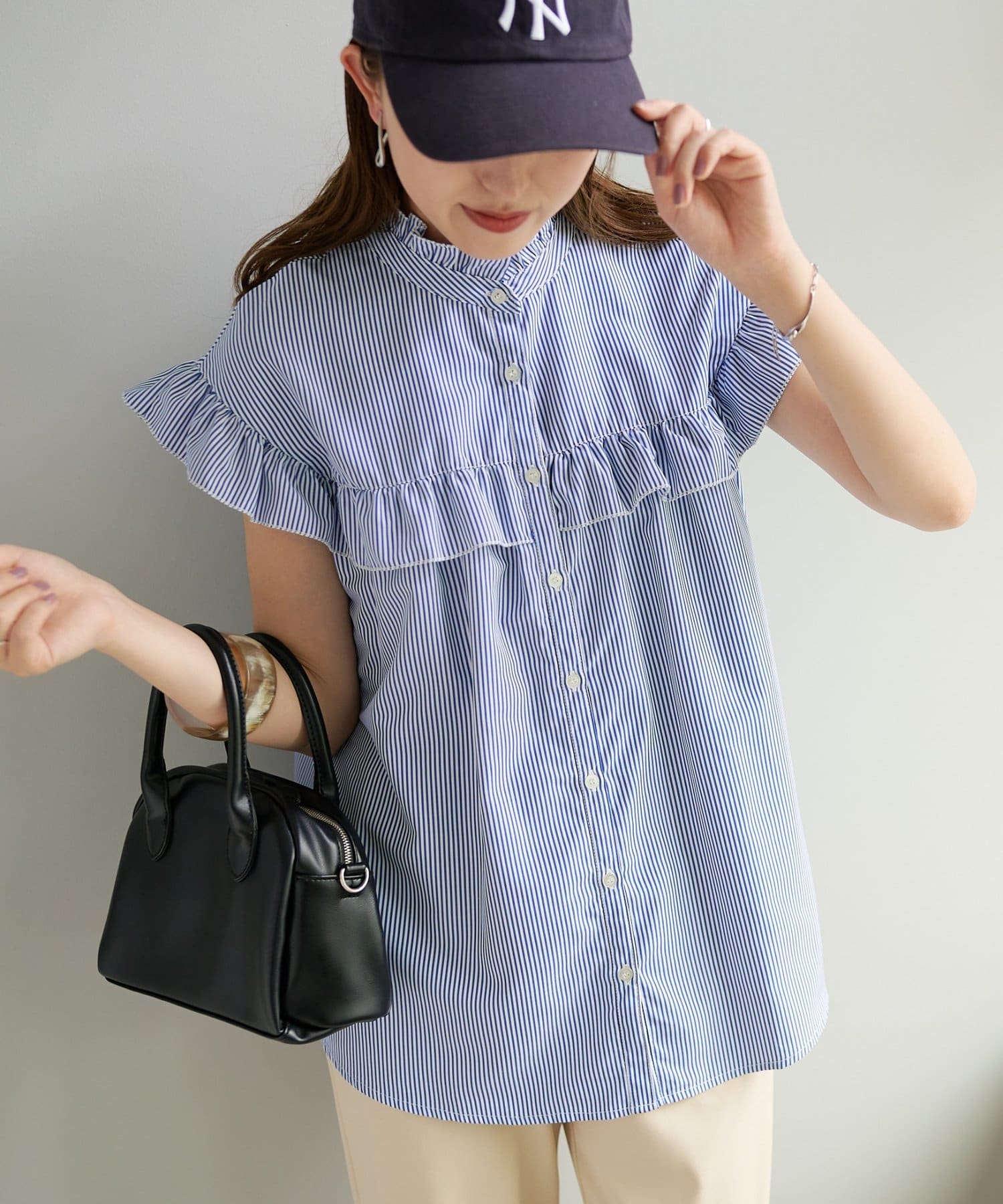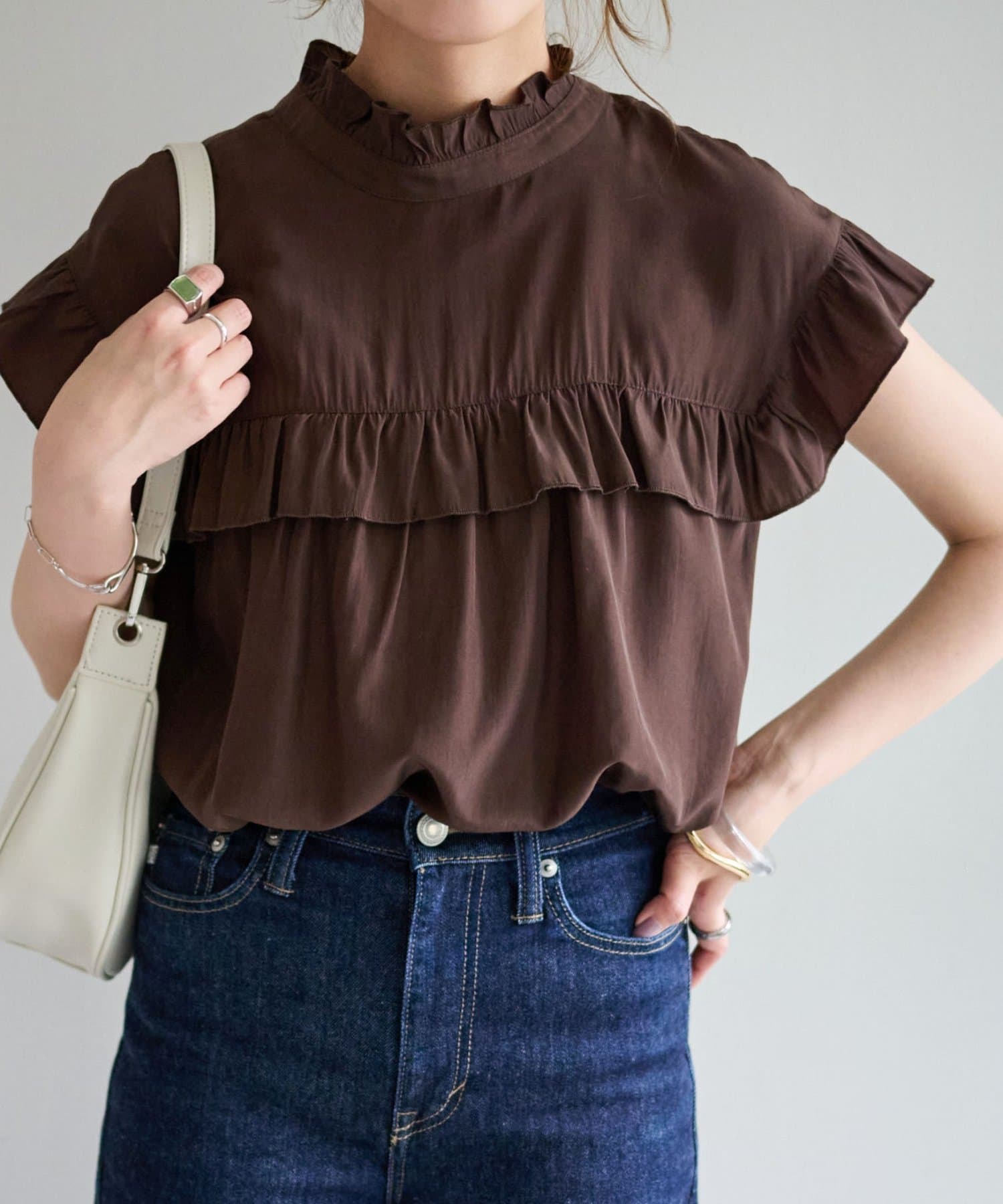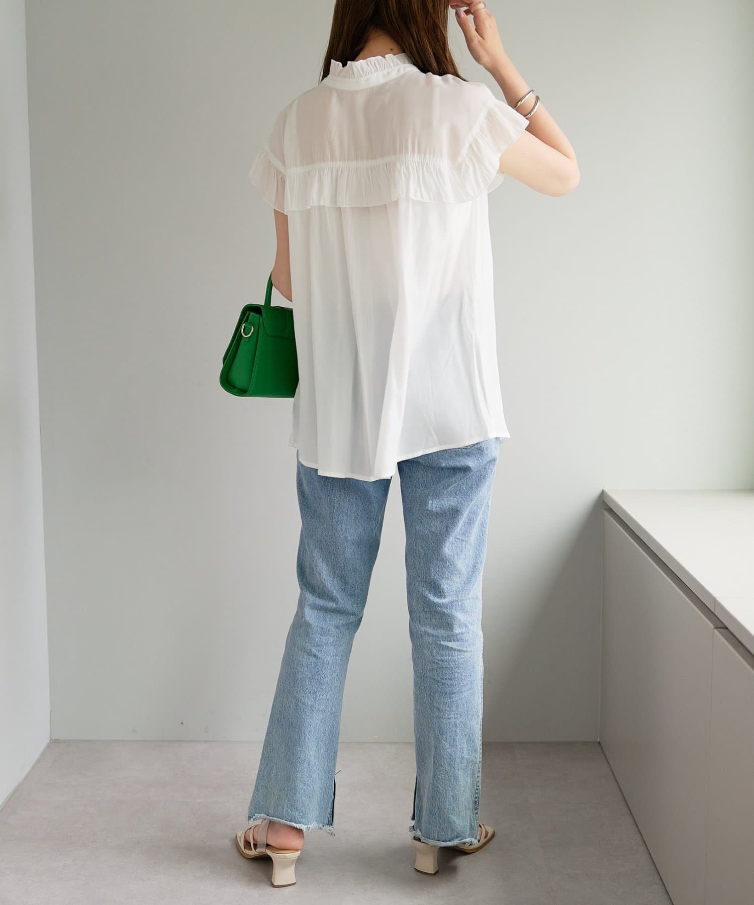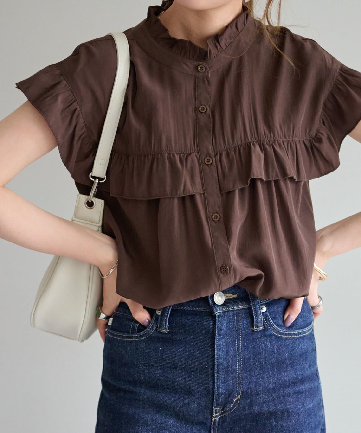 ・フェミニンなフリルをスタンドカラーのネックラインや、袖口、胸元にあしらったデザイン