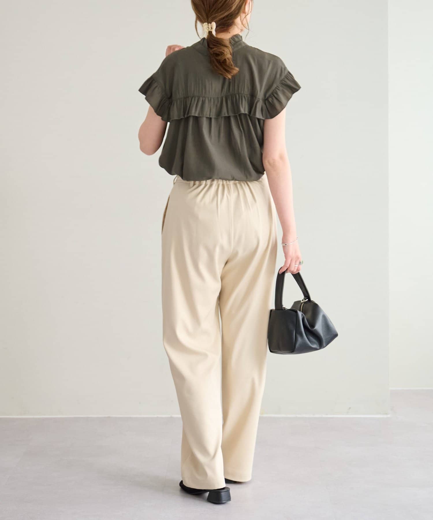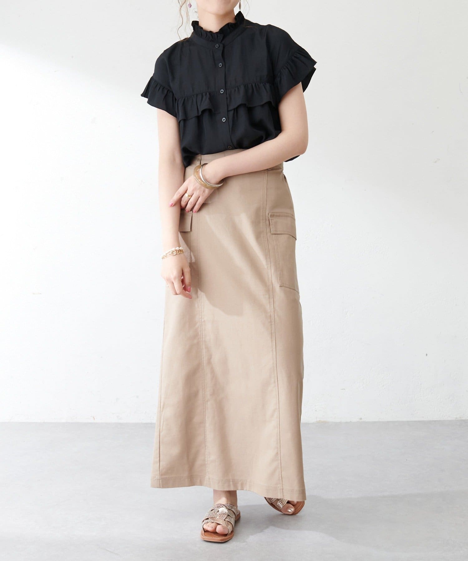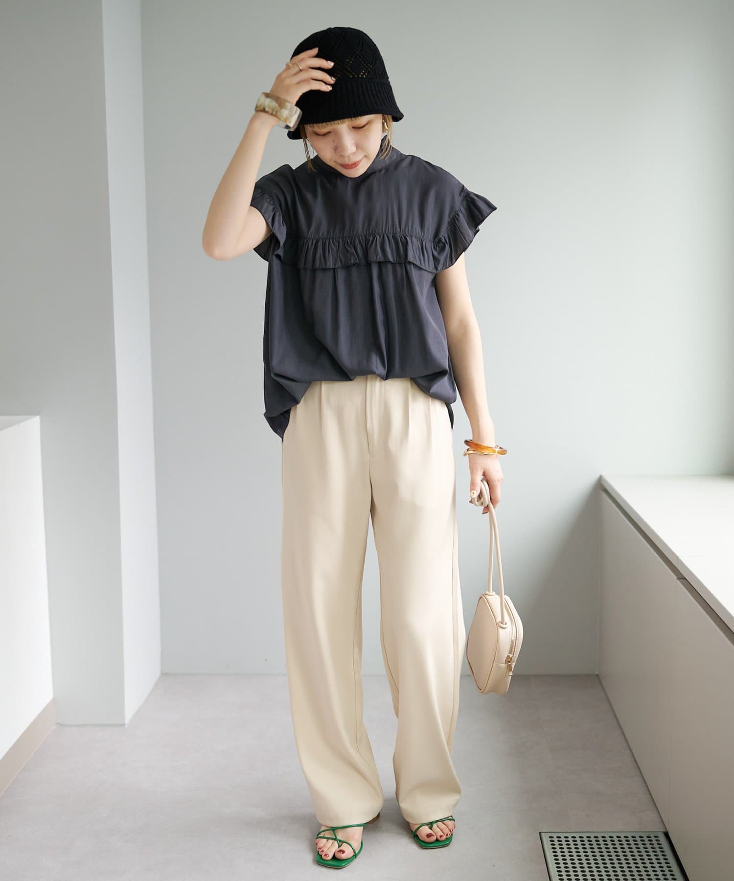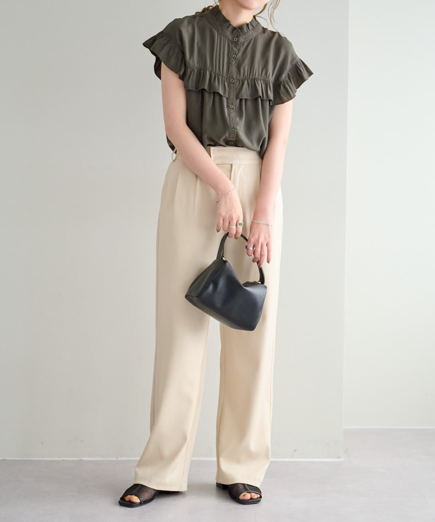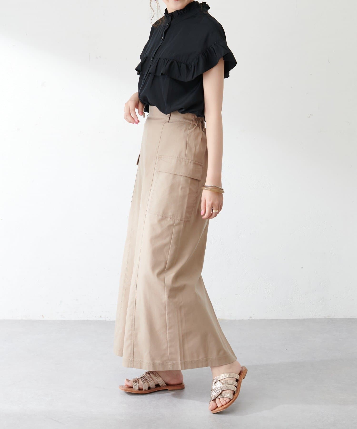 ・さらっと肌当たりが良くシワも気になりにくい落ち感がある生地で、大人フェミニンなサマースタイルにぴったり♪