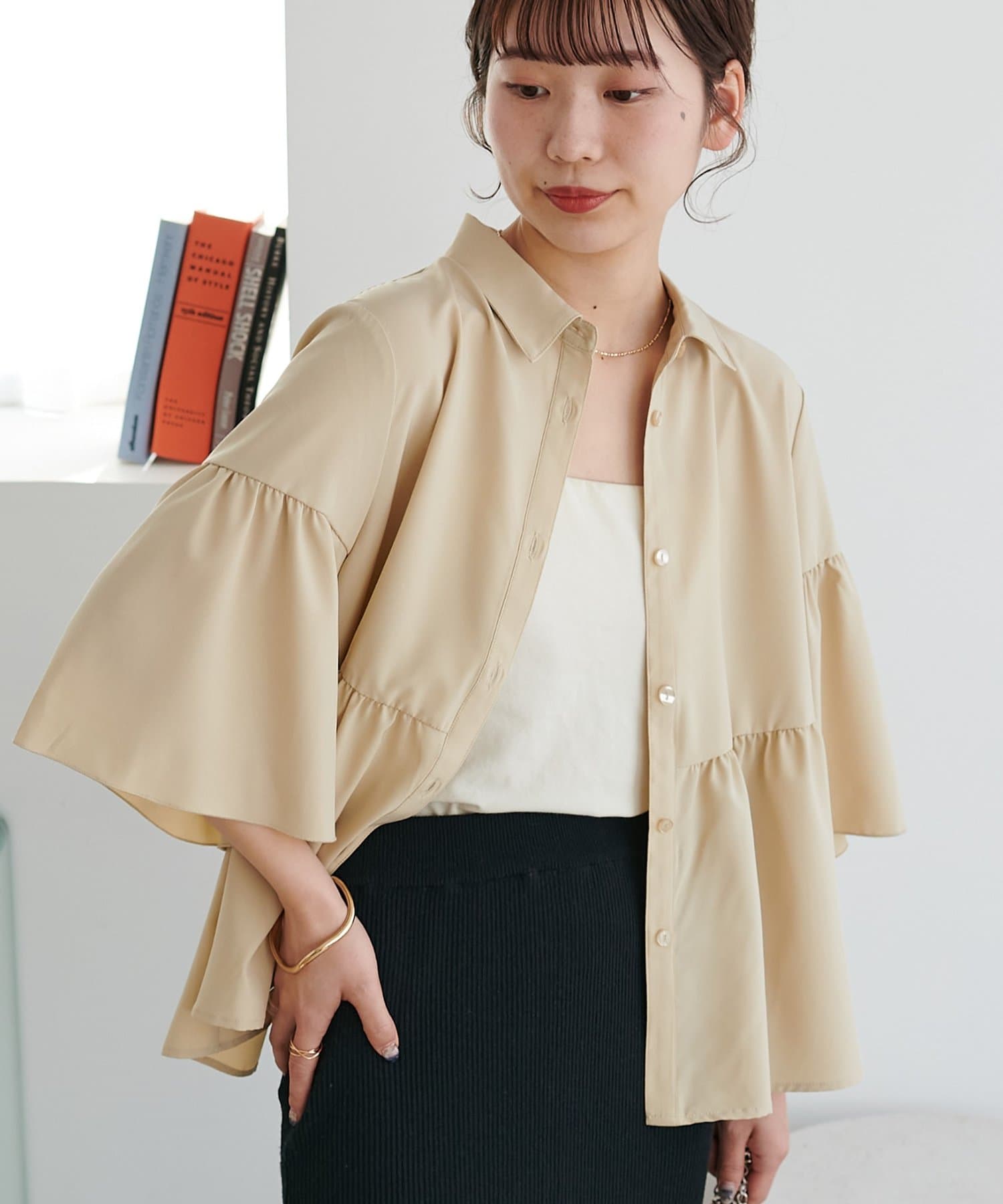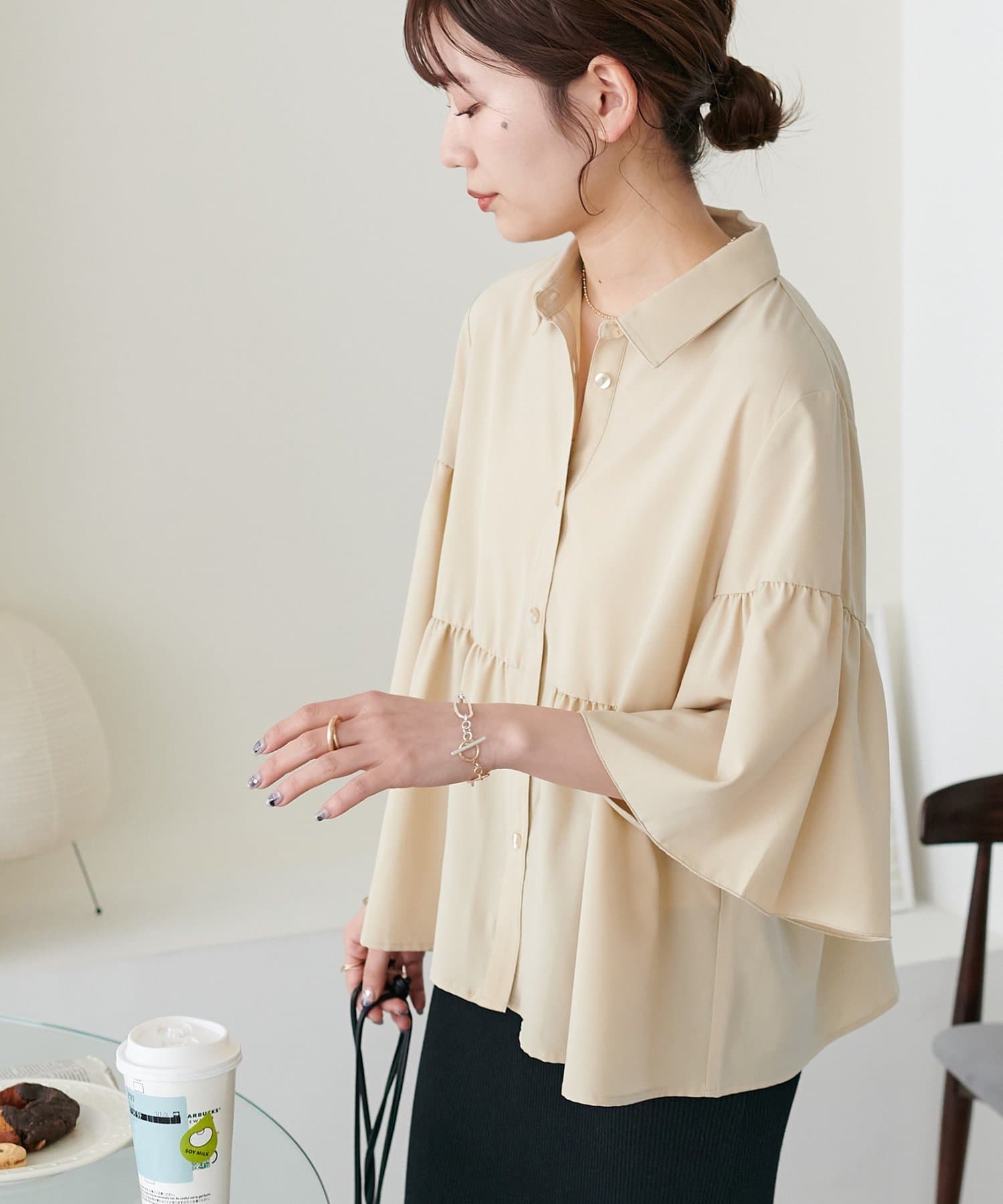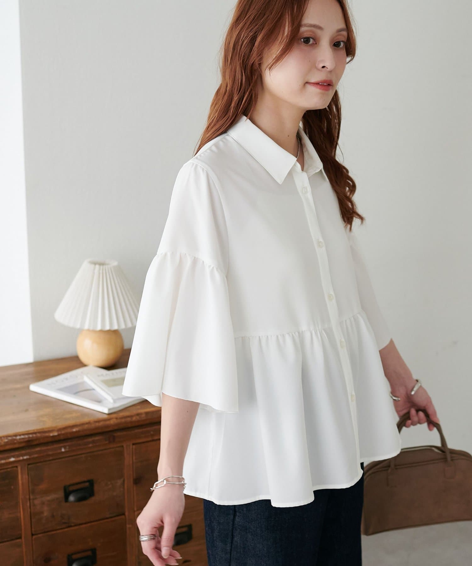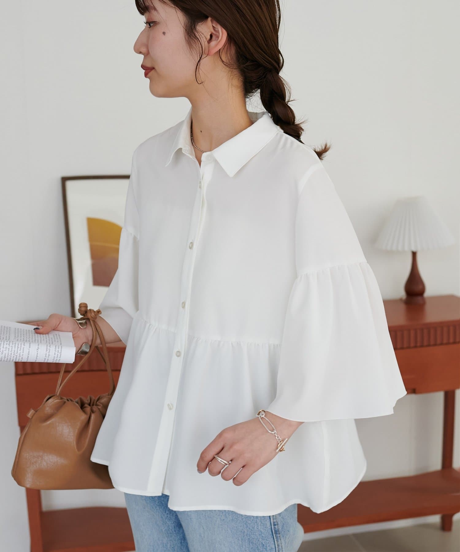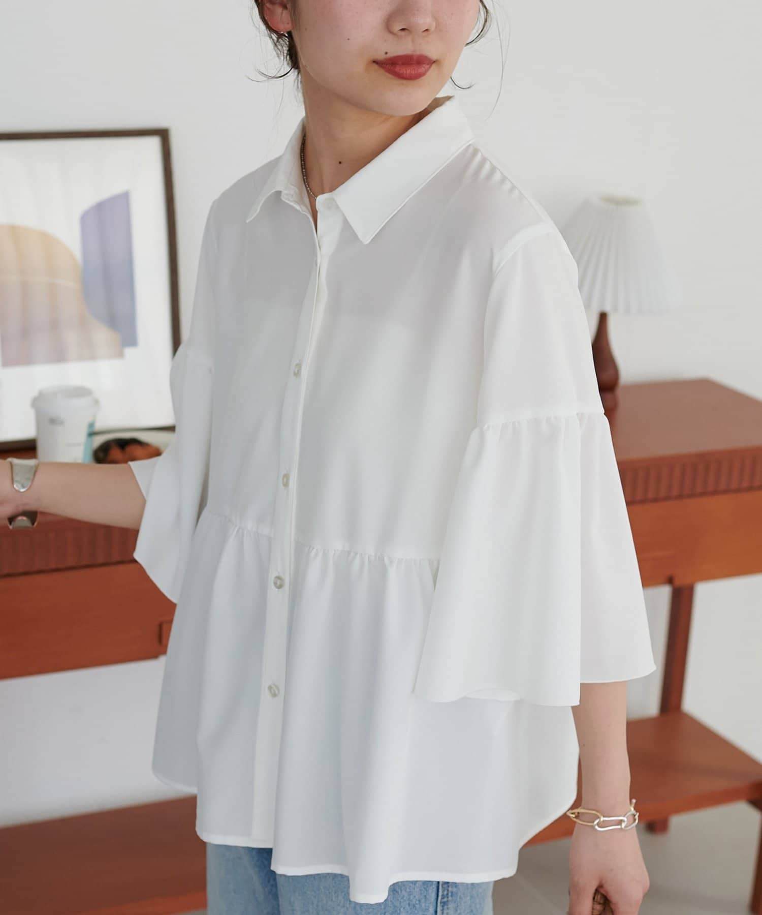 ・ふんわり広がるフレア袖と、軽やかなティアードデザインが特徴のシャツ