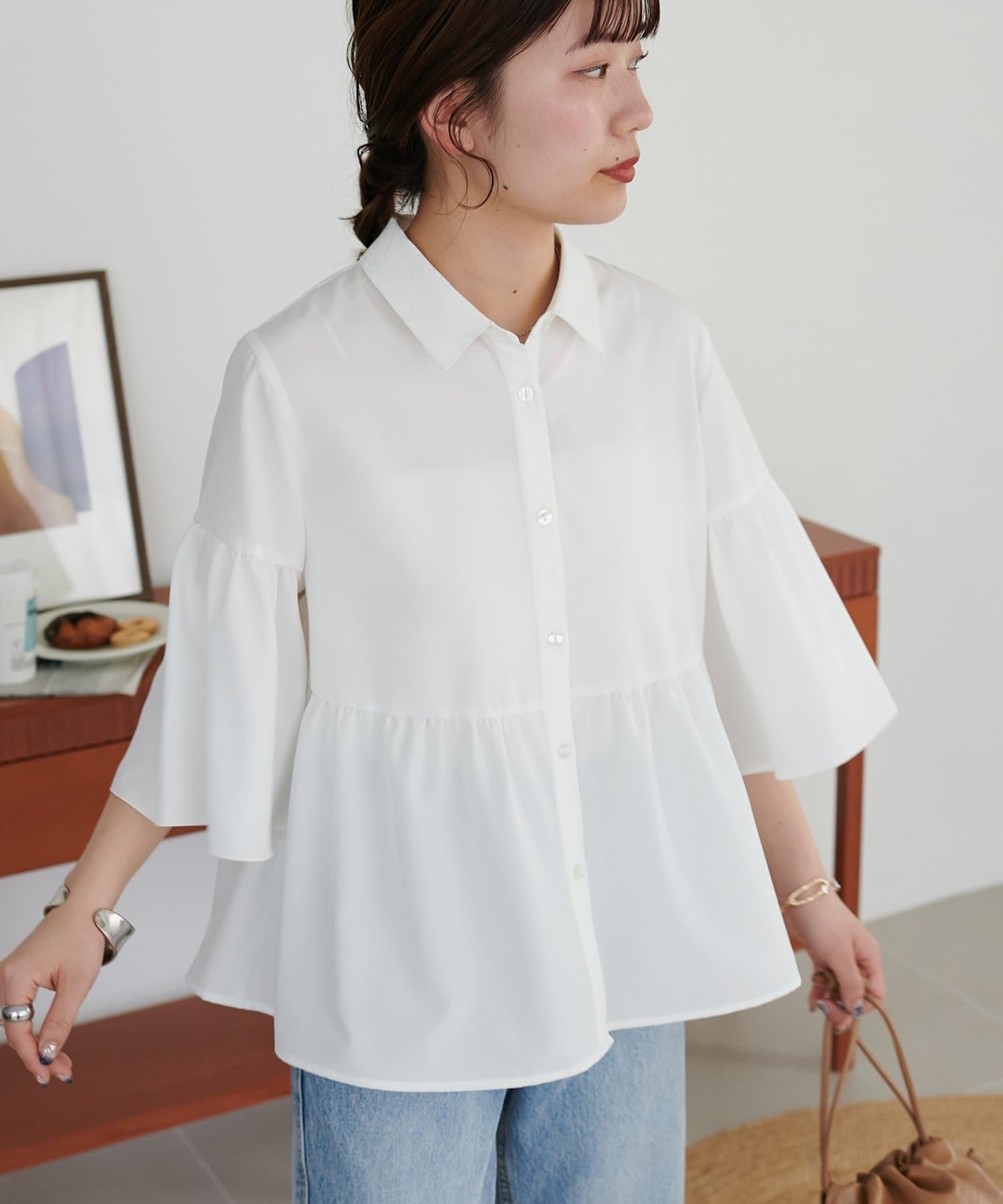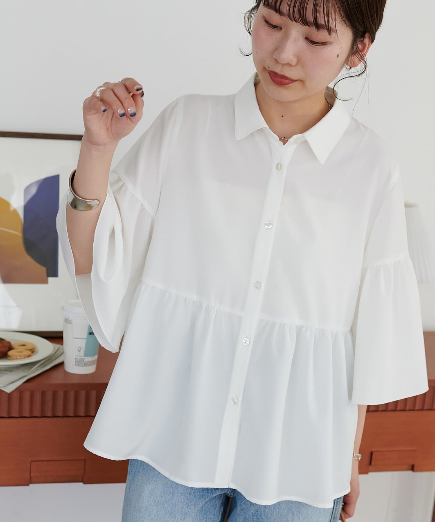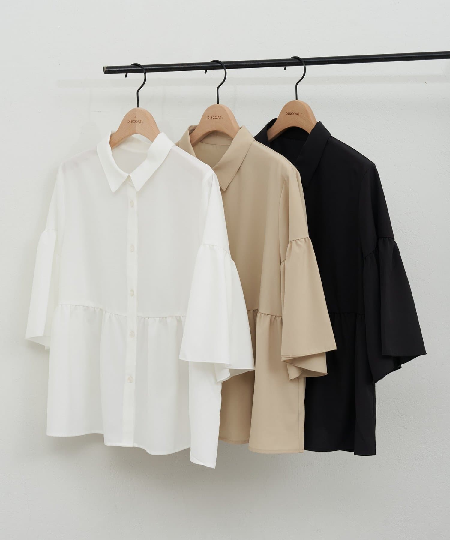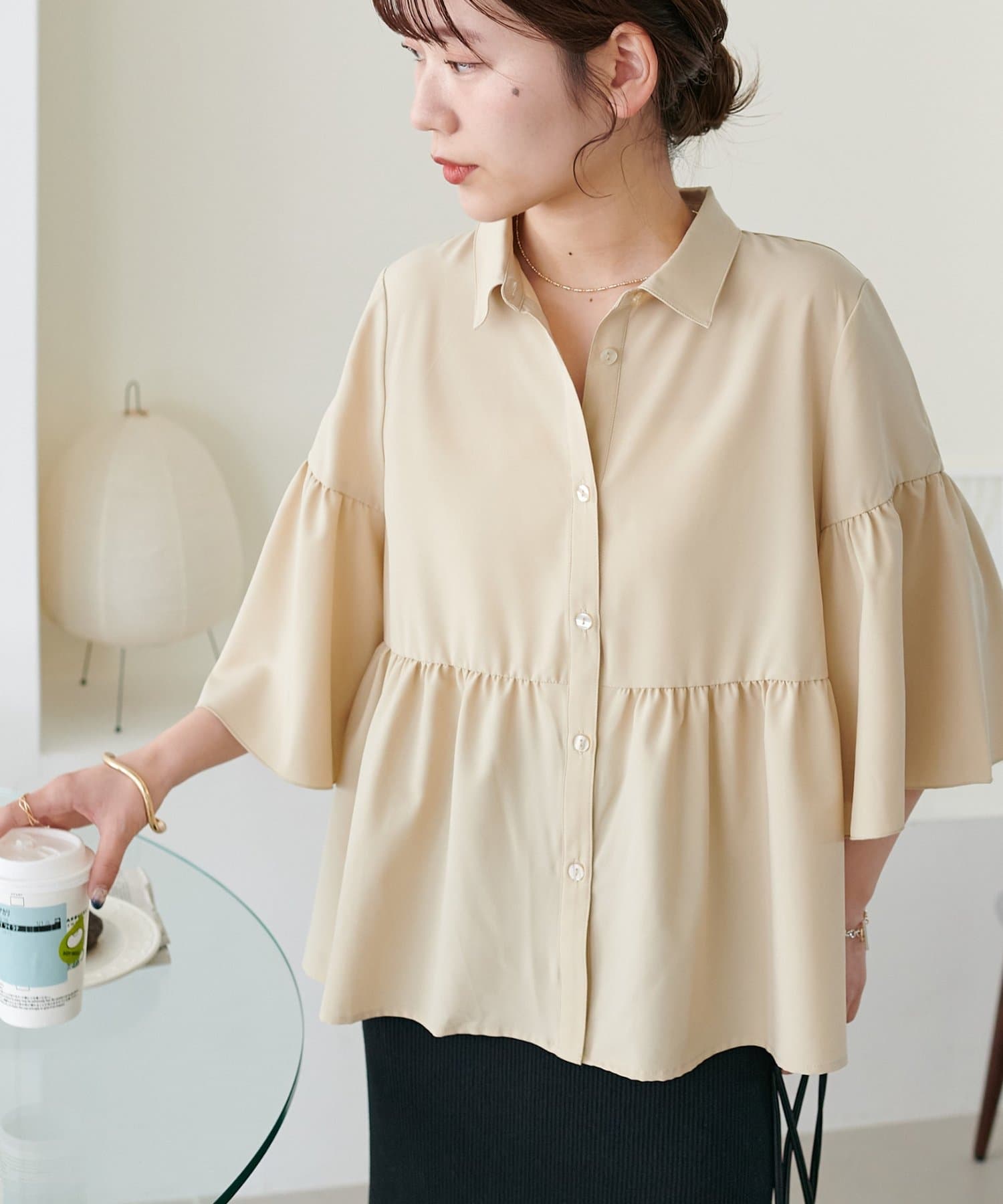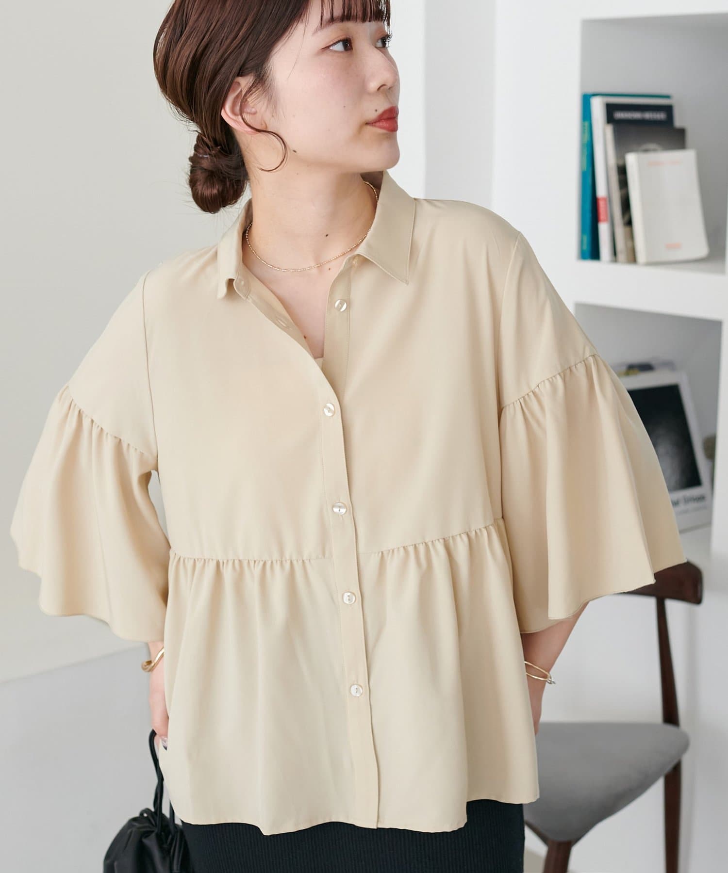 ・ふんわり広がるフレア袖と、軽やかなティアードデザインが特徴のシャツ