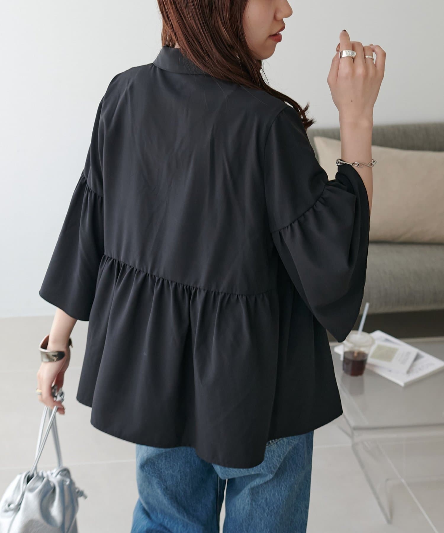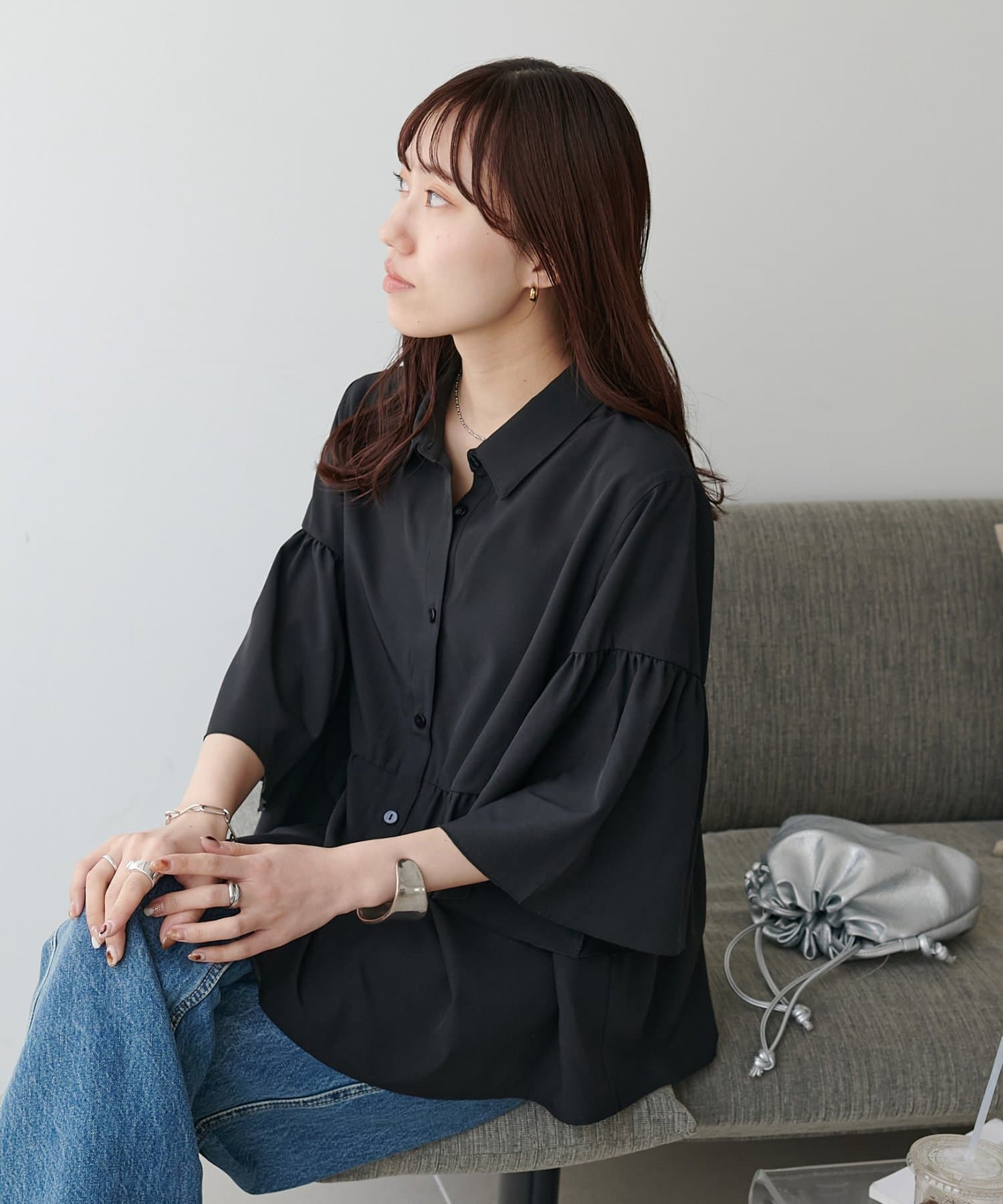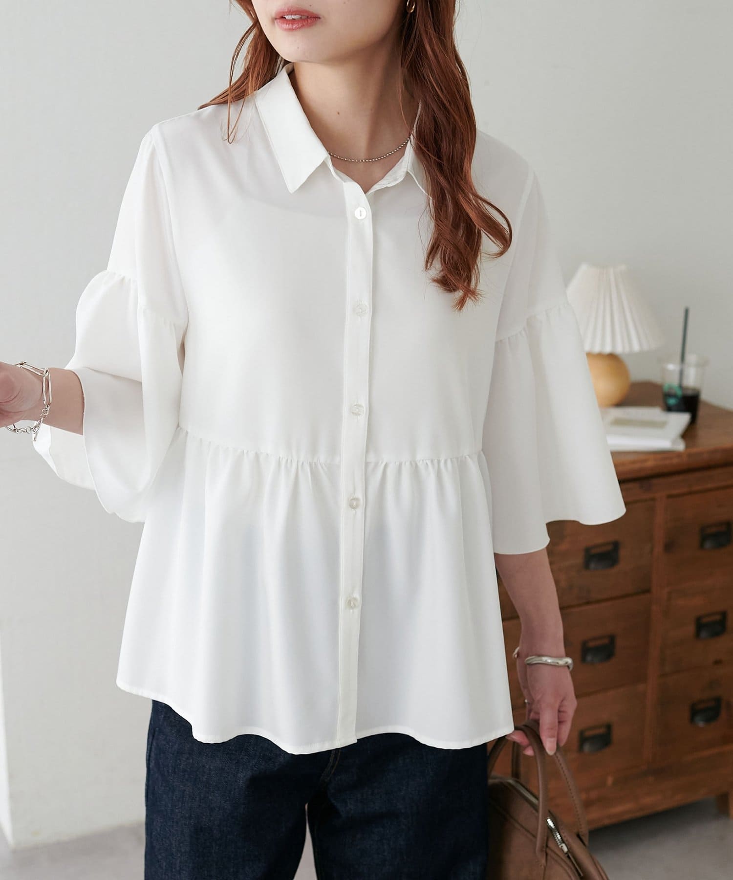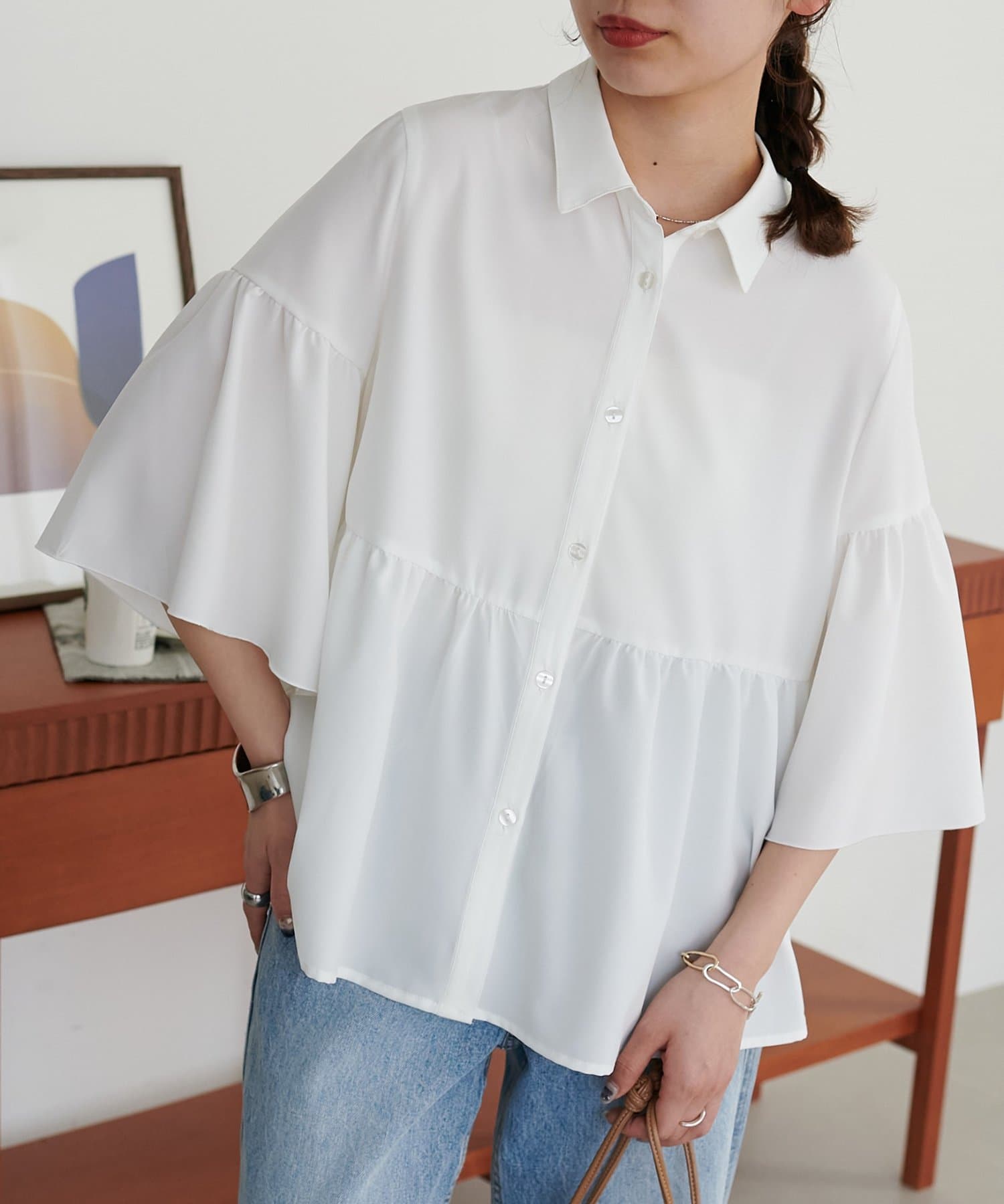 ・ふんわり広がるフレア袖と、軽やかなティアードデザインが特徴のシャツ