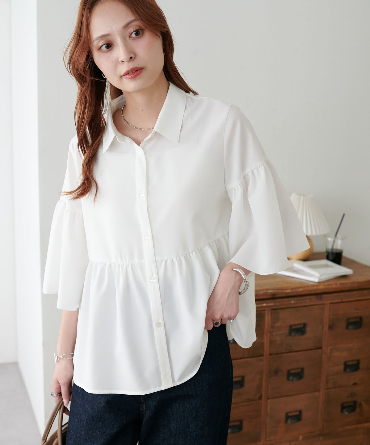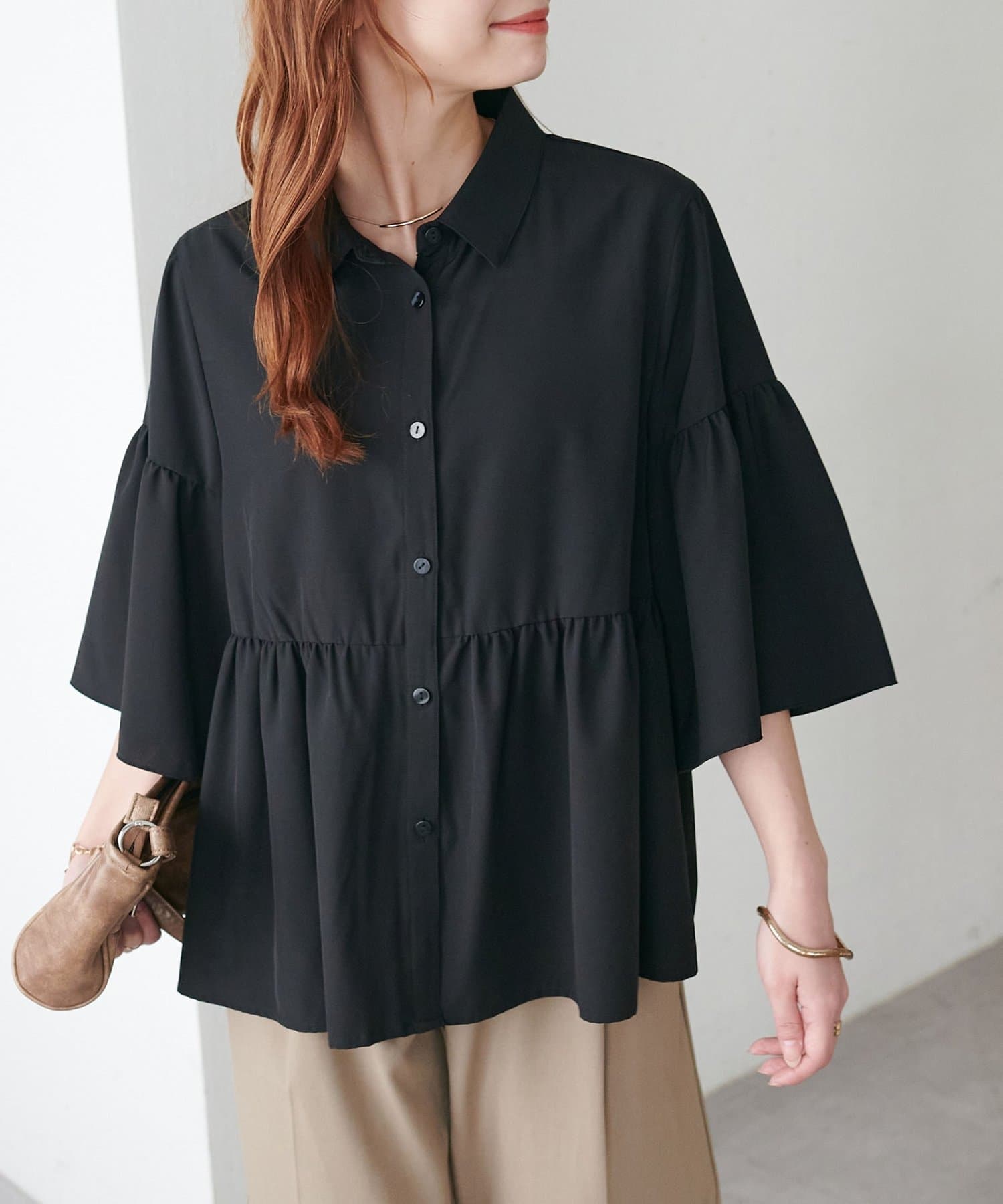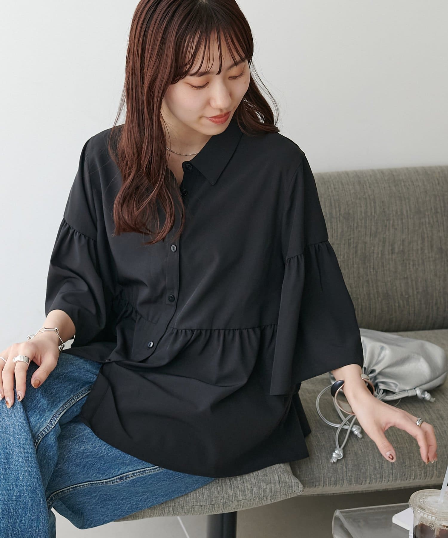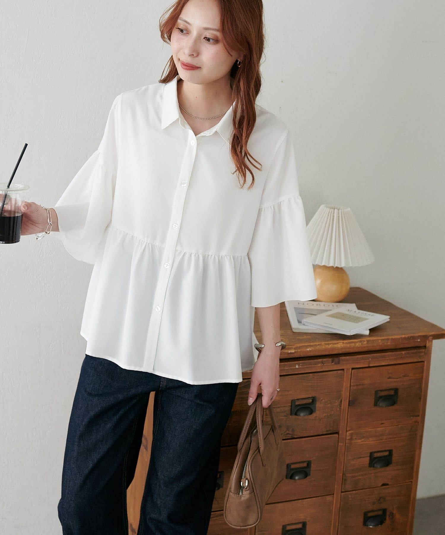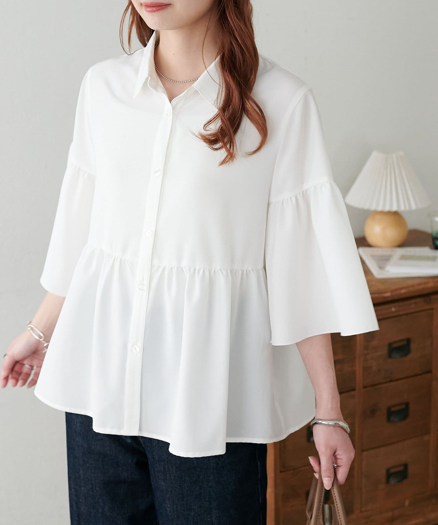 ・ふんわり広がるフレア袖と、軽やかなティアードデザインが特徴のシャツ