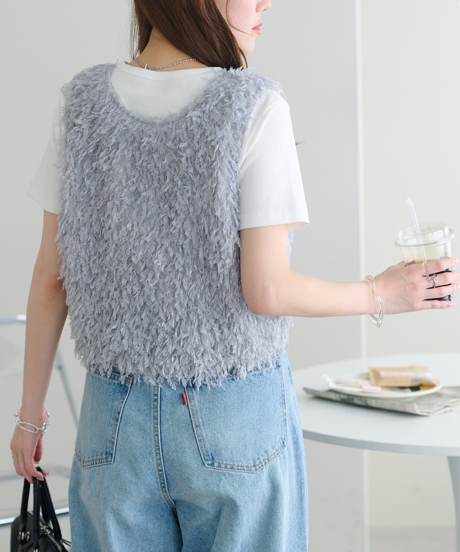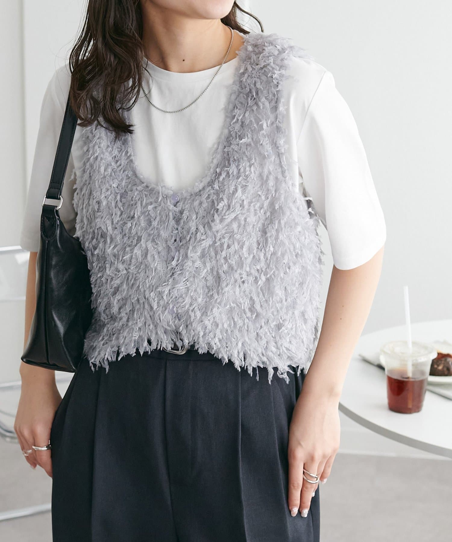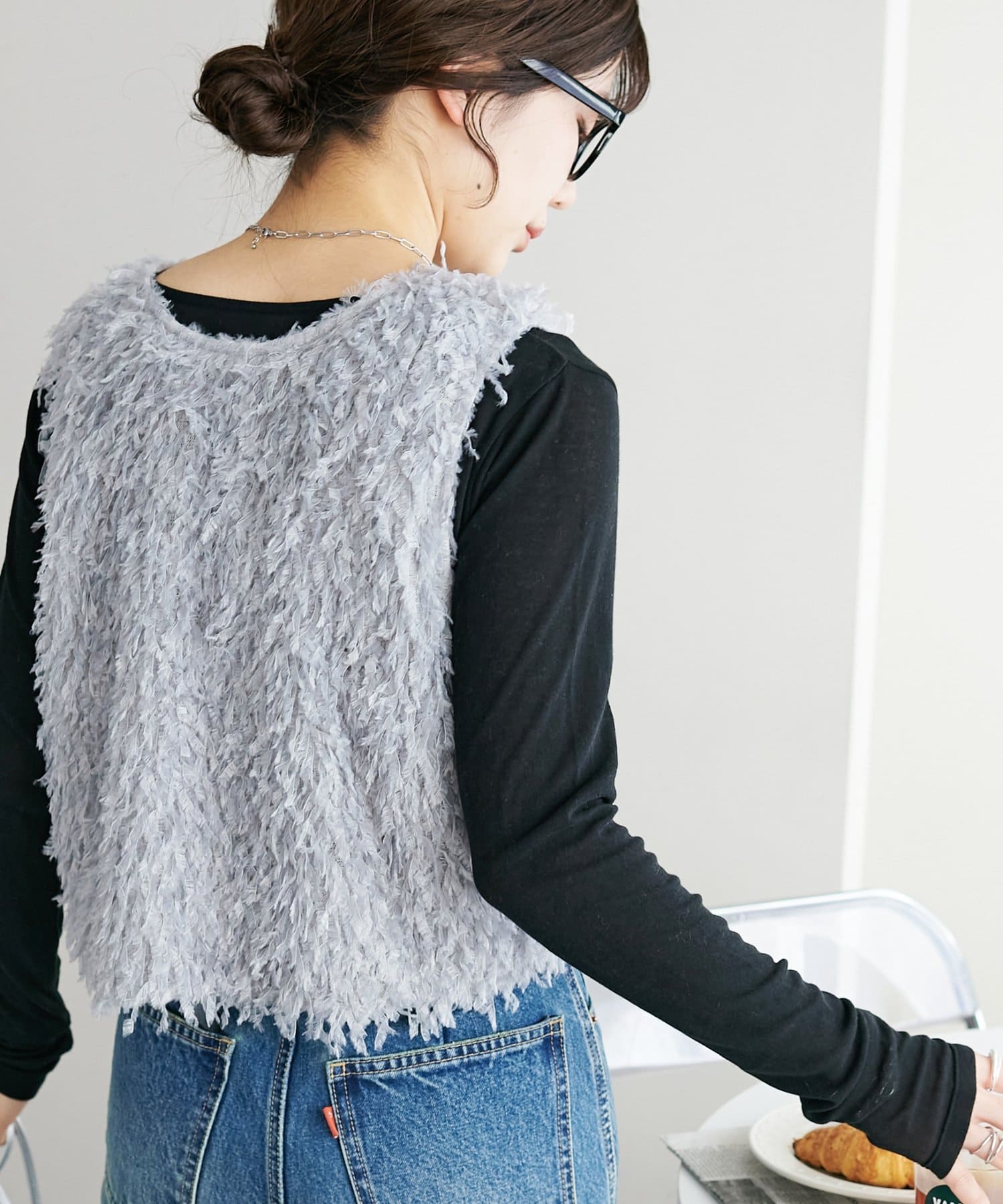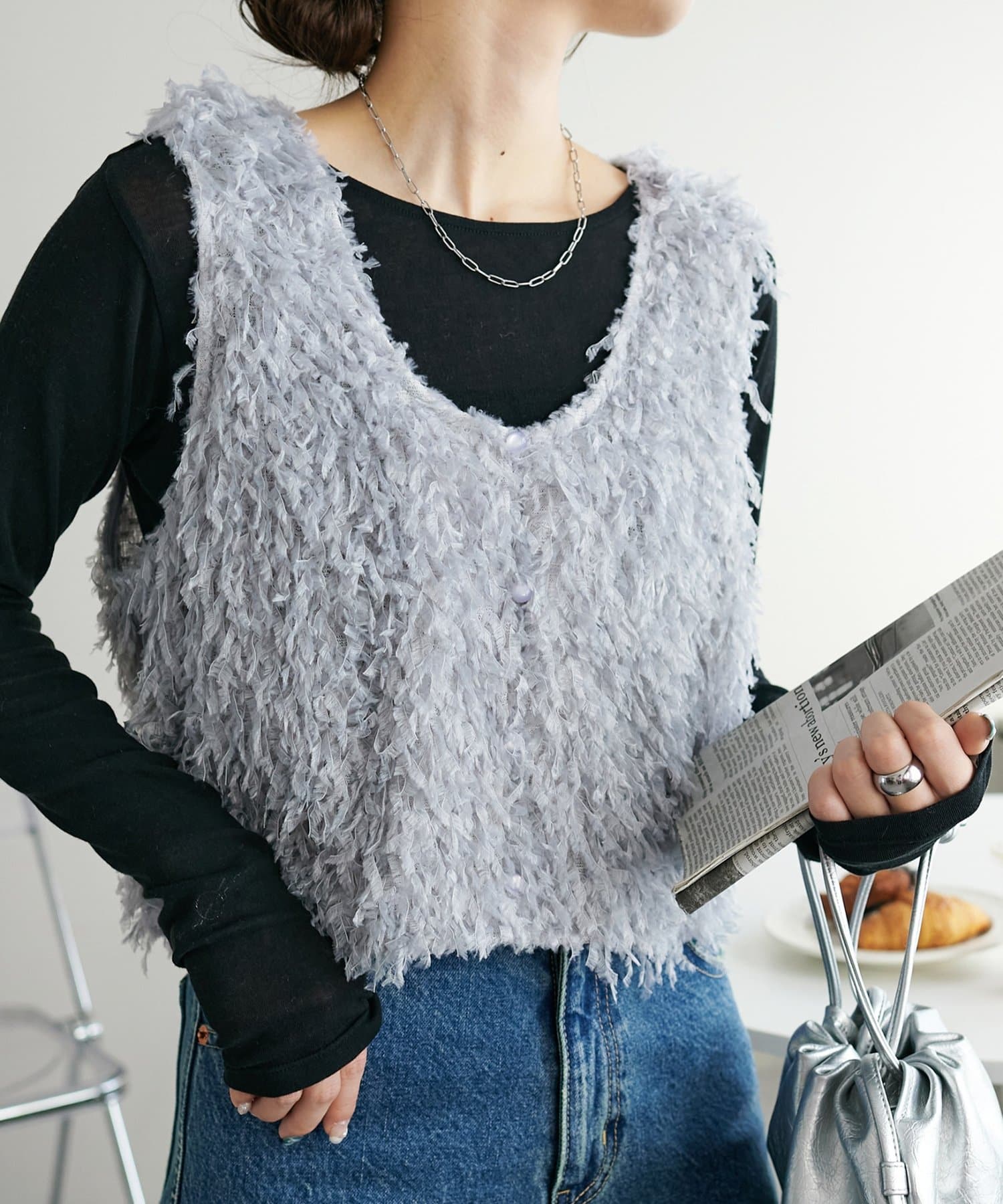 ・華やかで表面感のあるトレンド感の高いフリンジ素材のベスト