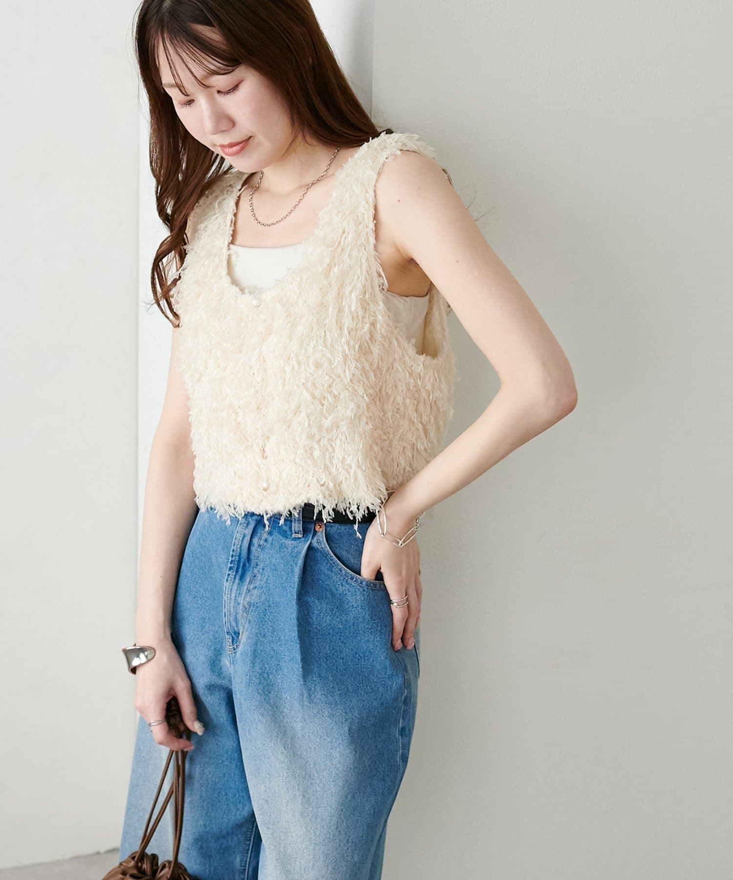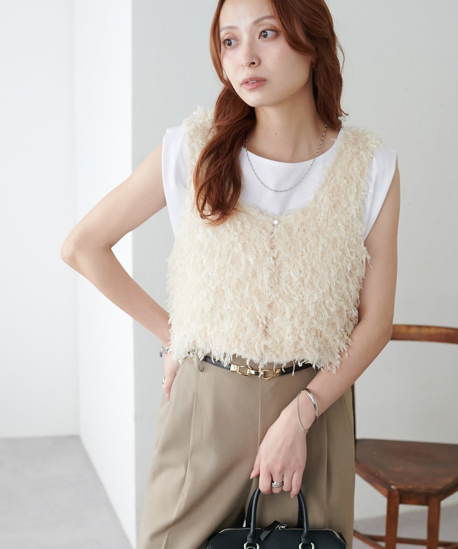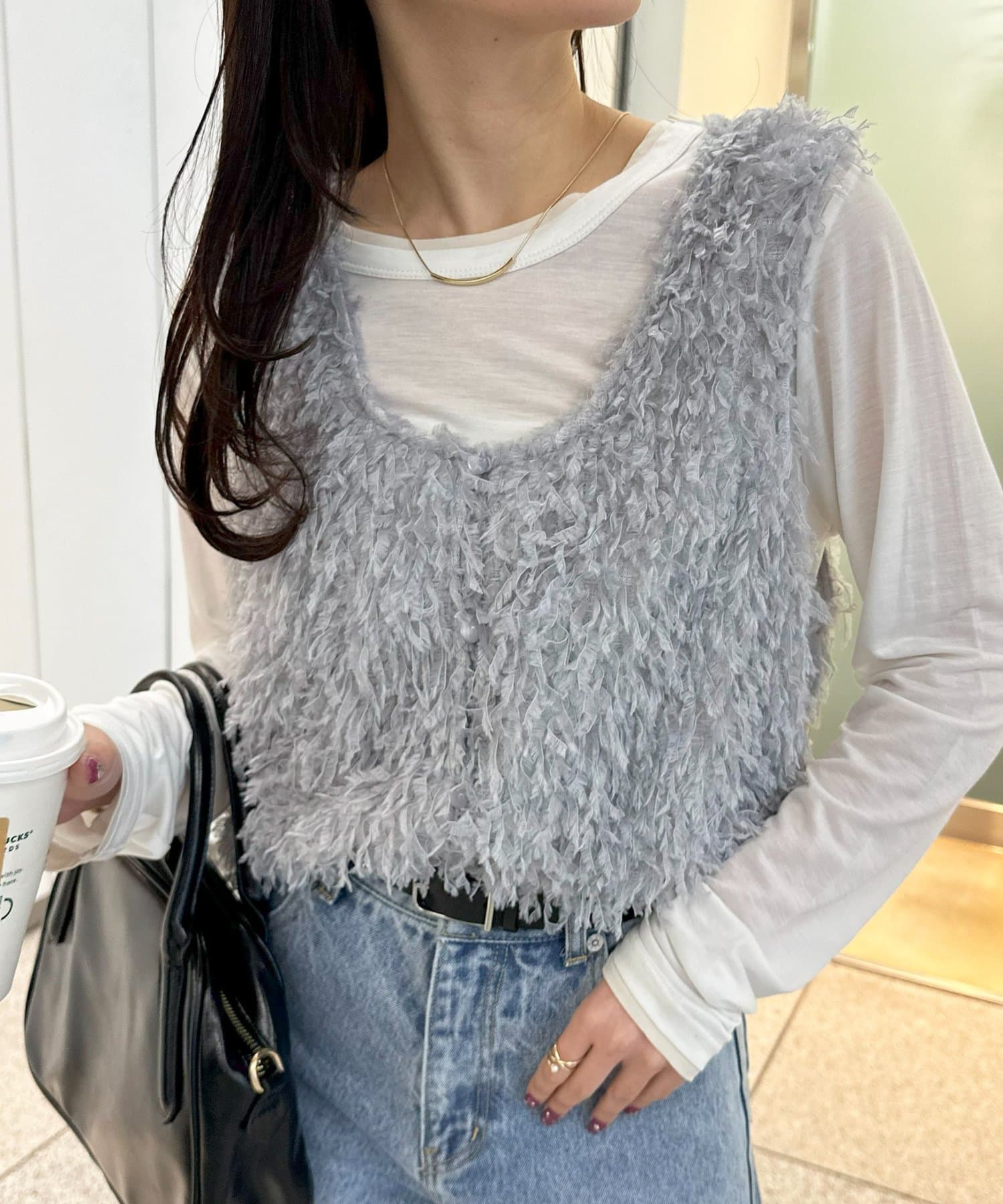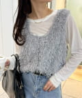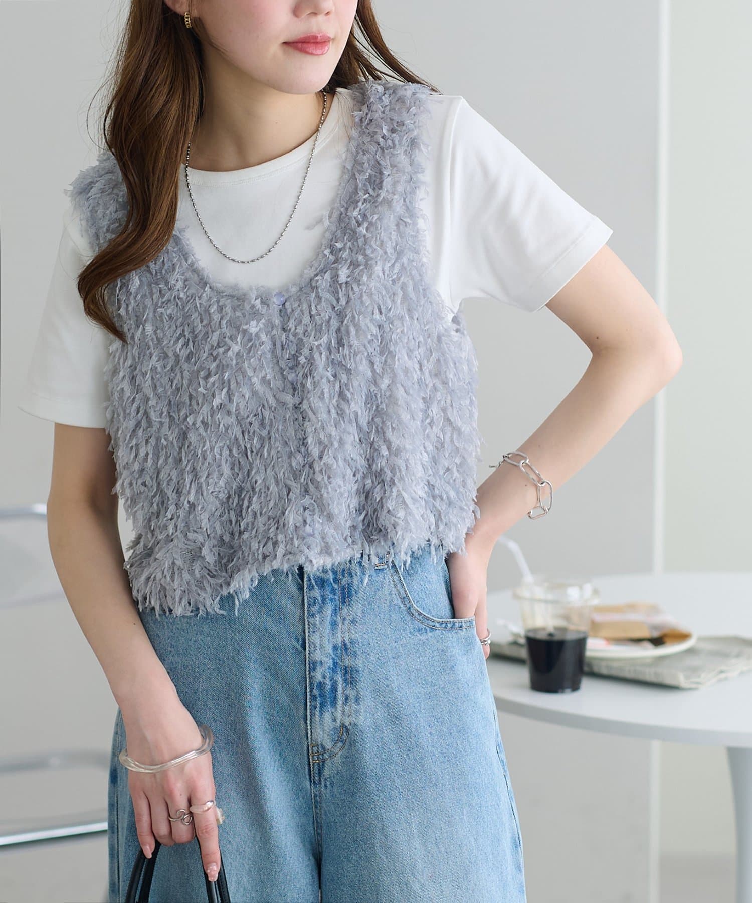 ・華やかで表面感のあるトレンド感の高いフリンジ素材のベスト