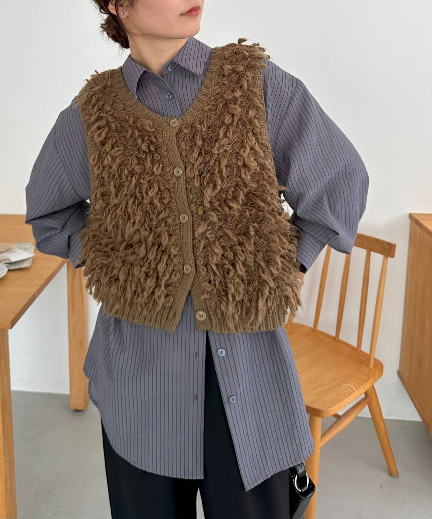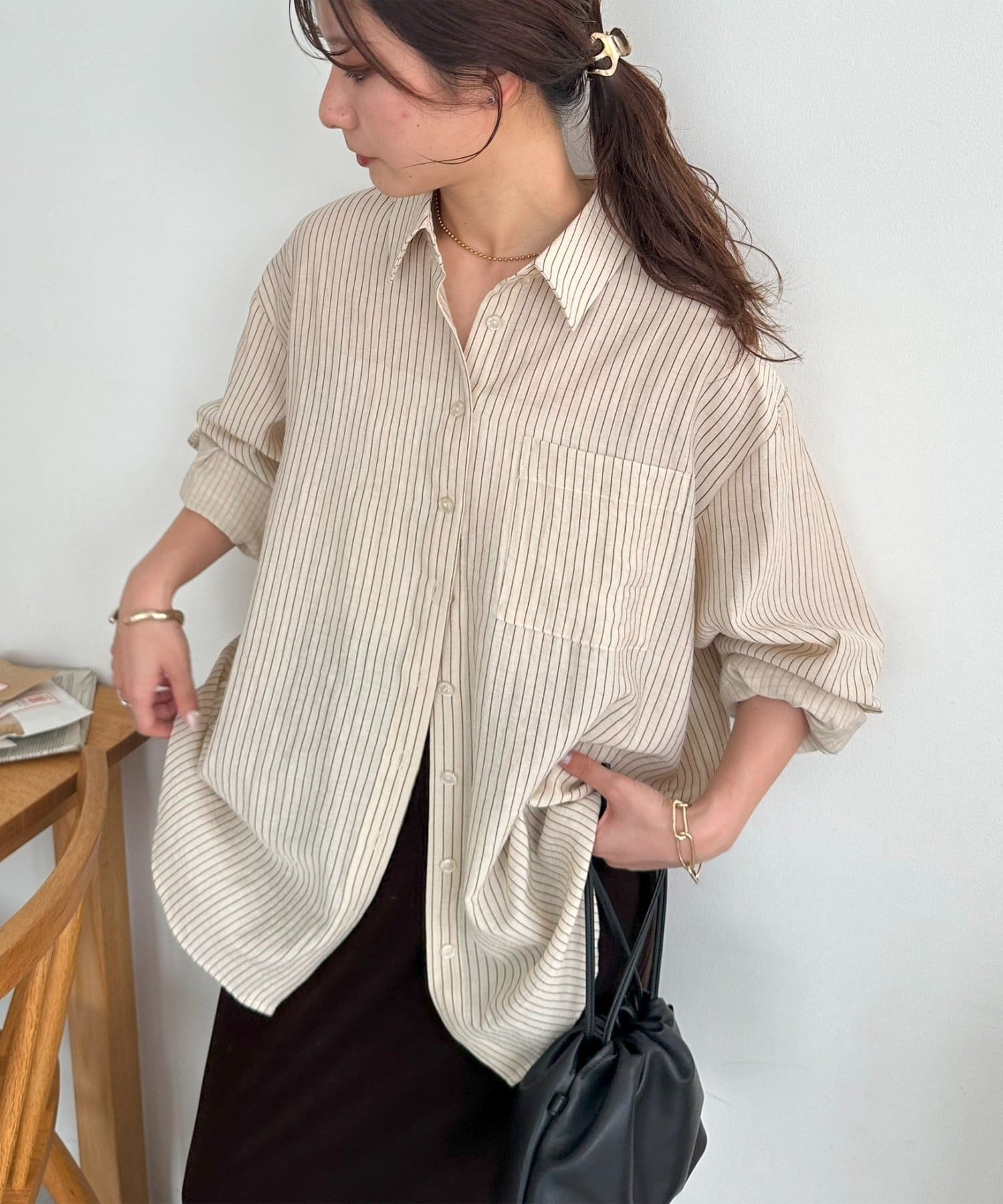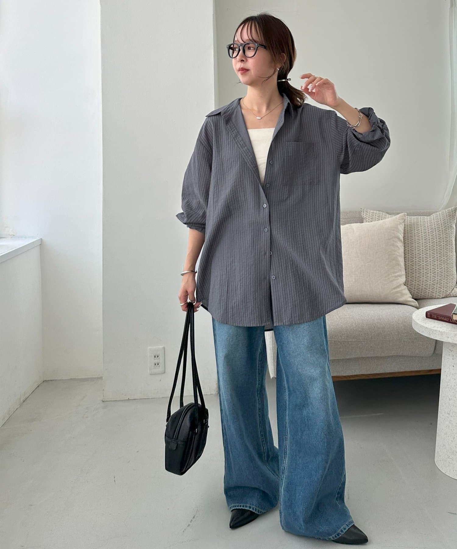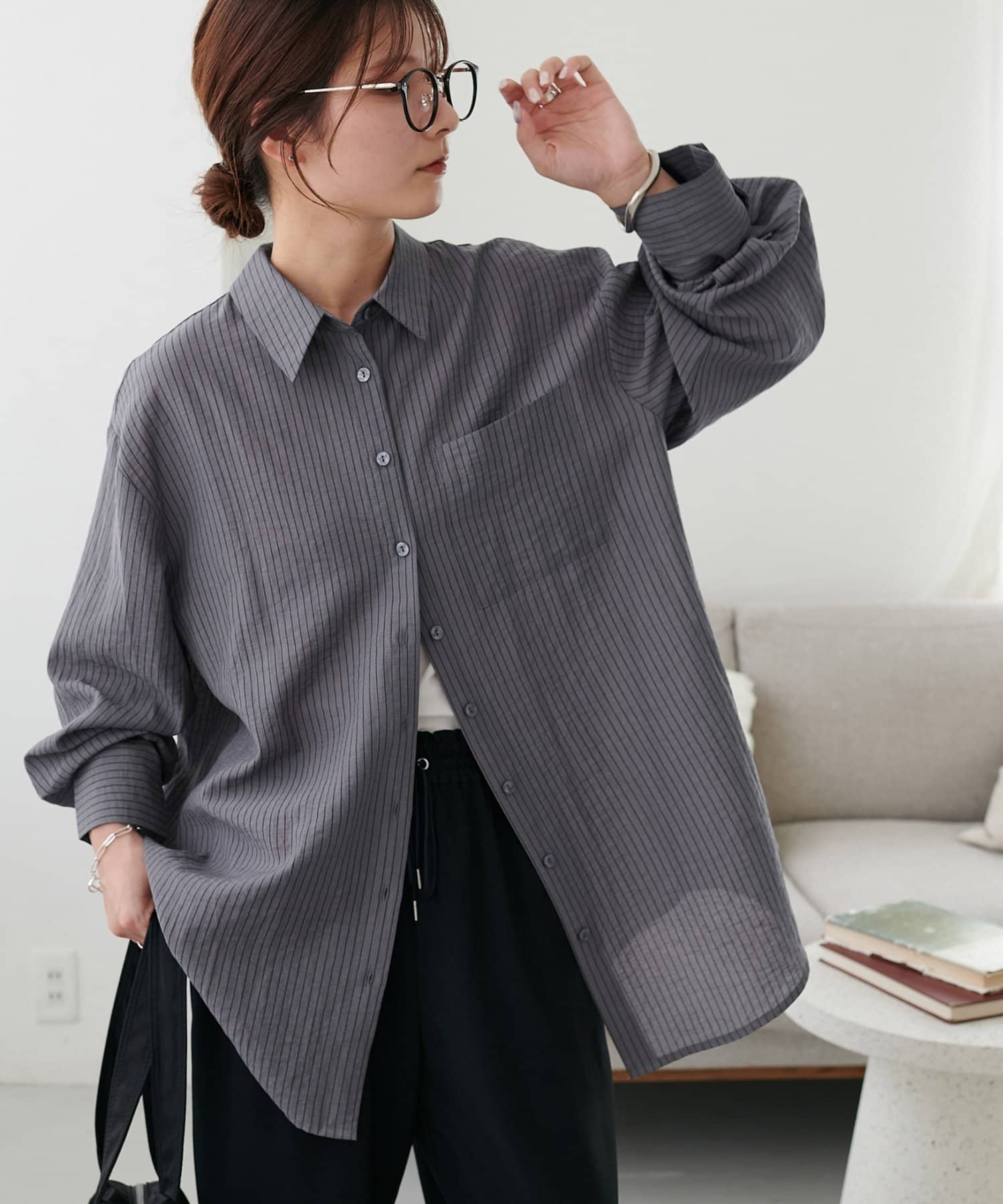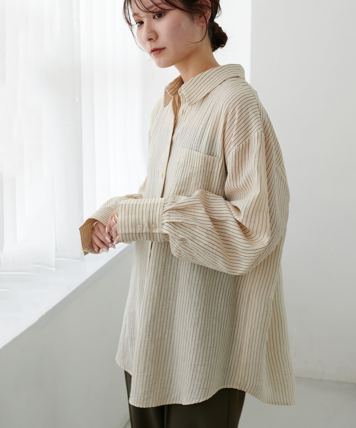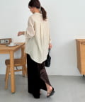 153cmスタッフ:ヒップが隠れる着丈ですが、サイドがラウンドスリットになっていることとシアー感があることで抜け感が自然と出ます!