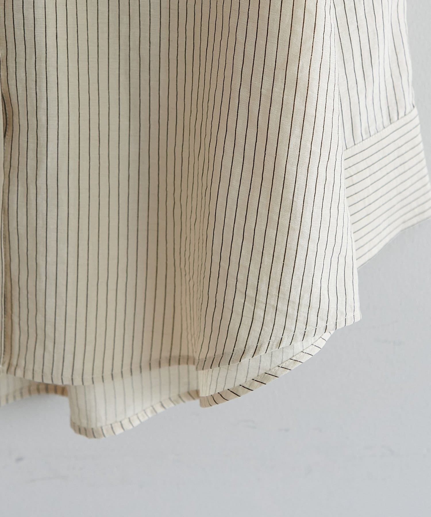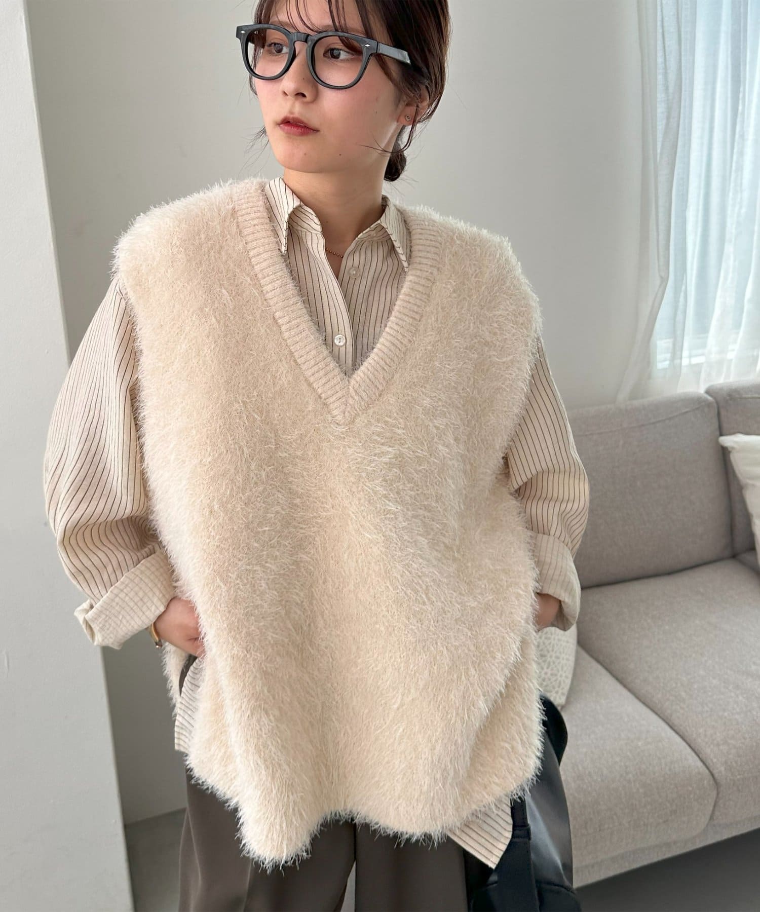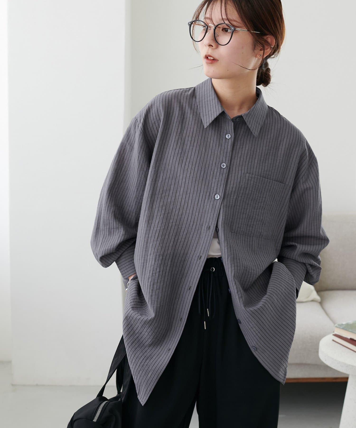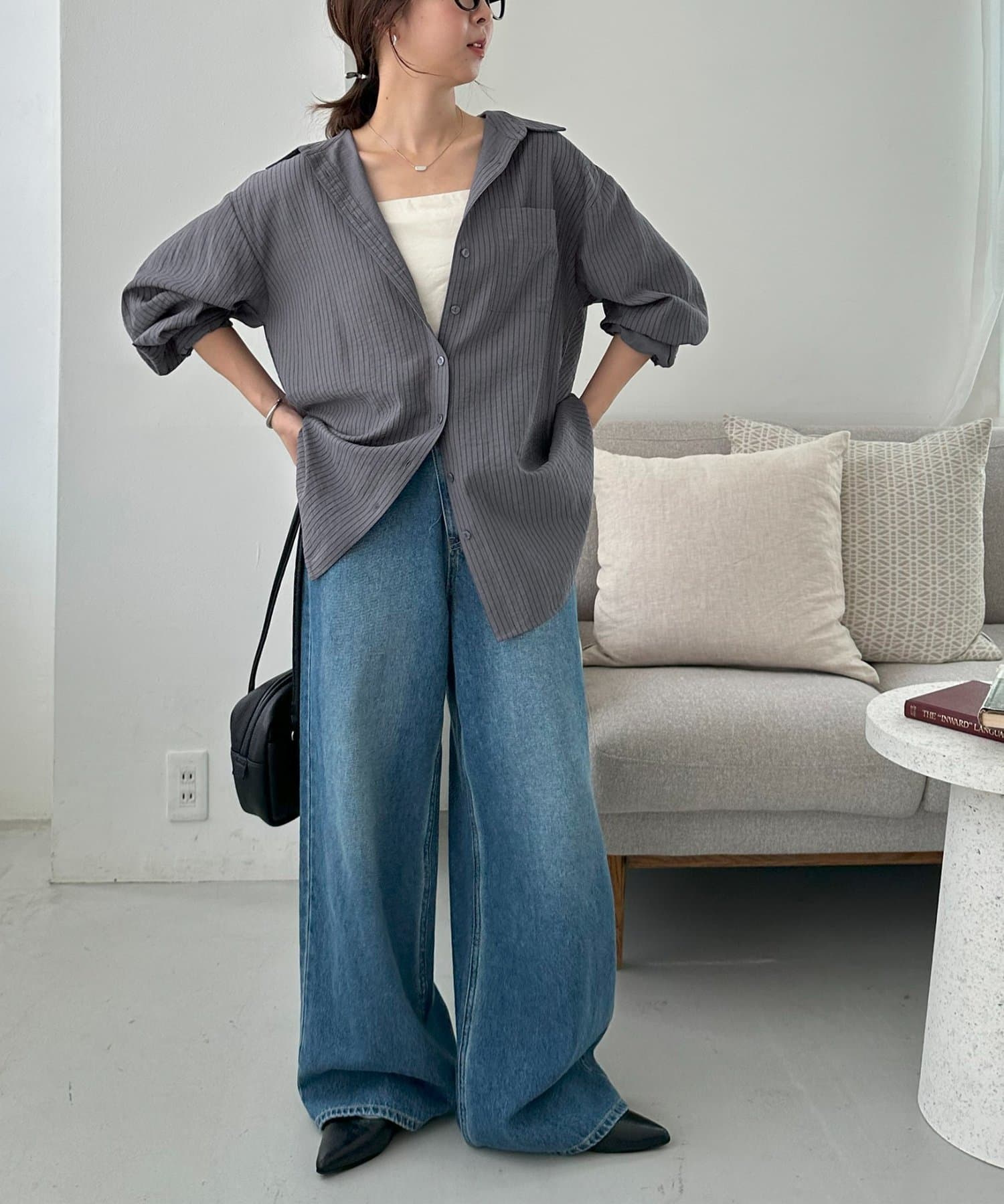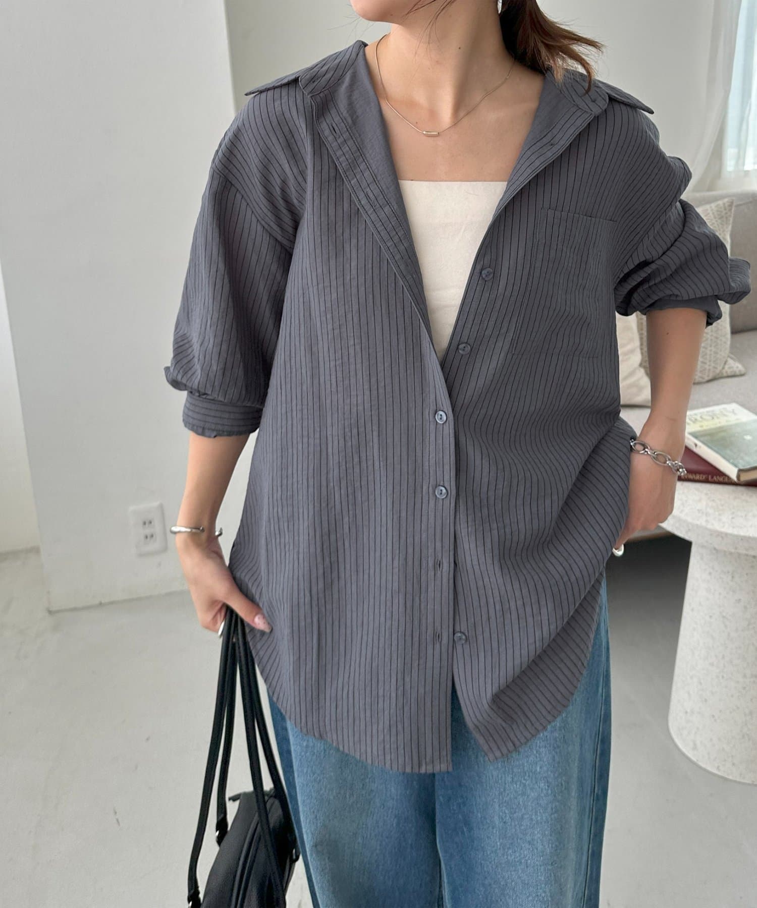 153cmスタッフ:ヒップが隠れる着丈ですが、サイドがラウンドスリットになっていることとシアー感があることで抜け感が自然と出ます!
