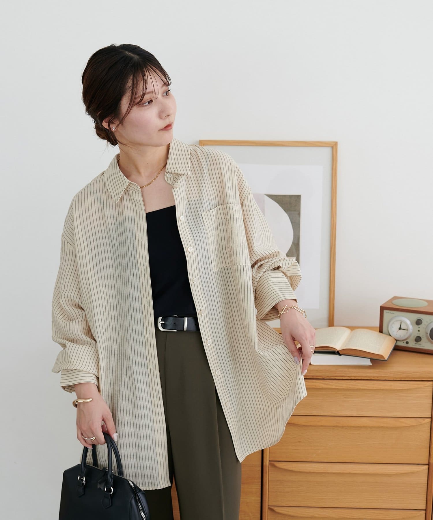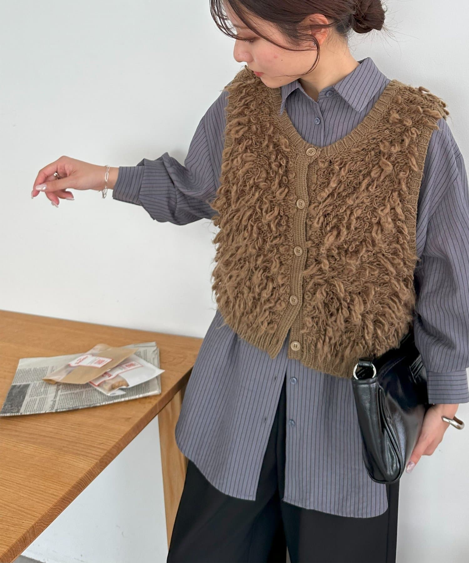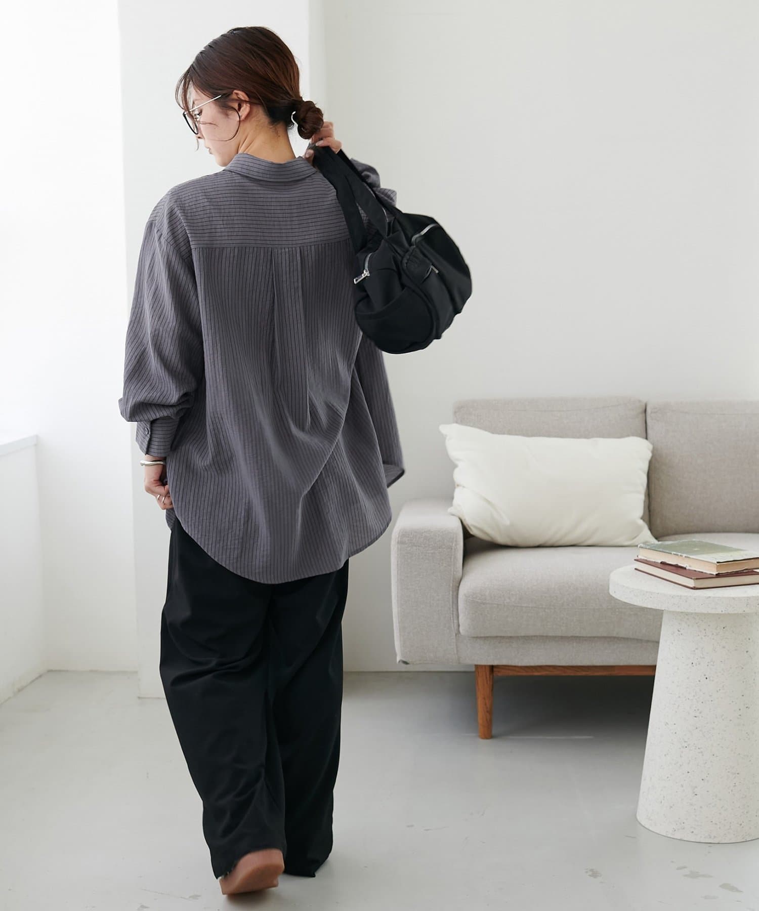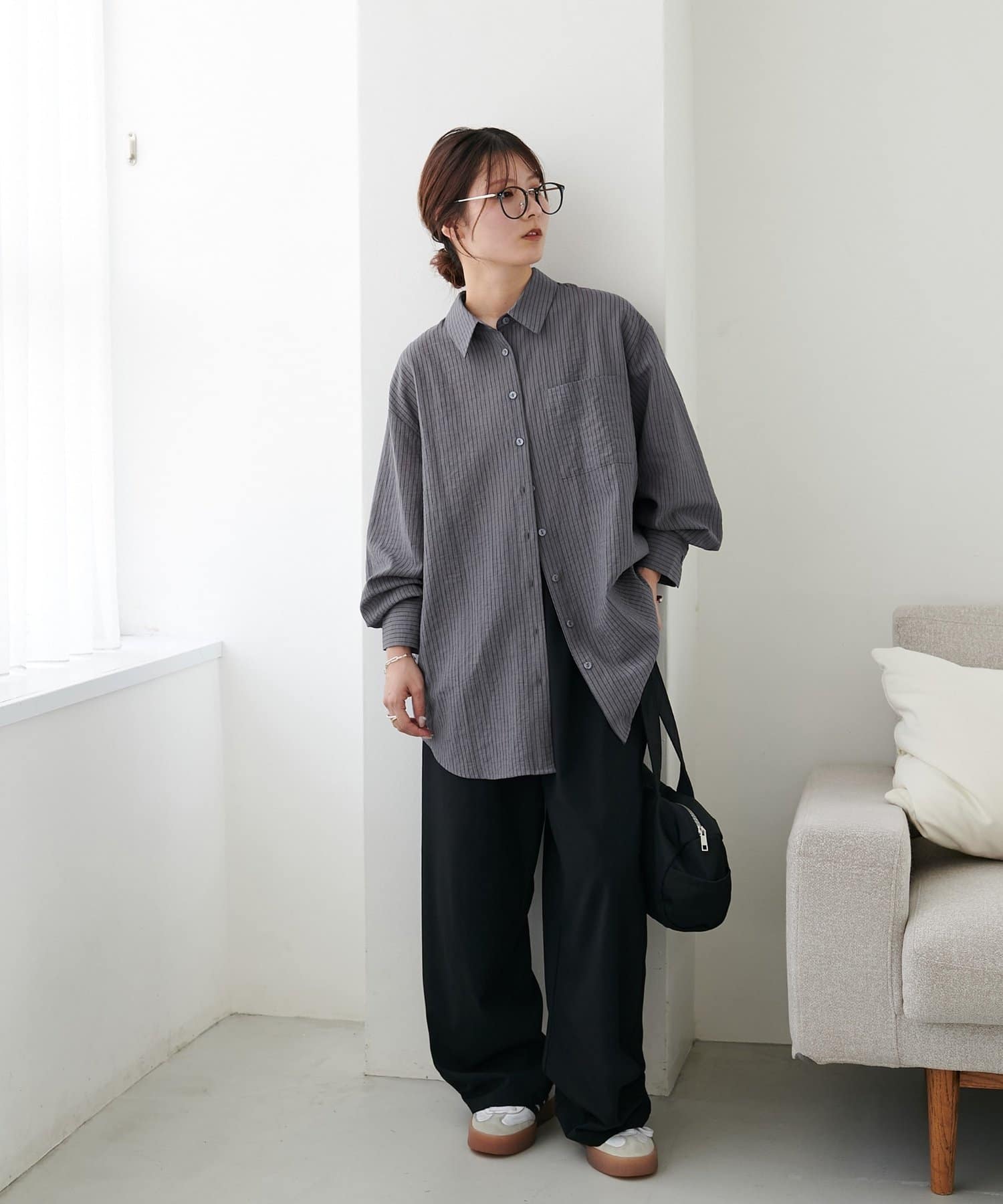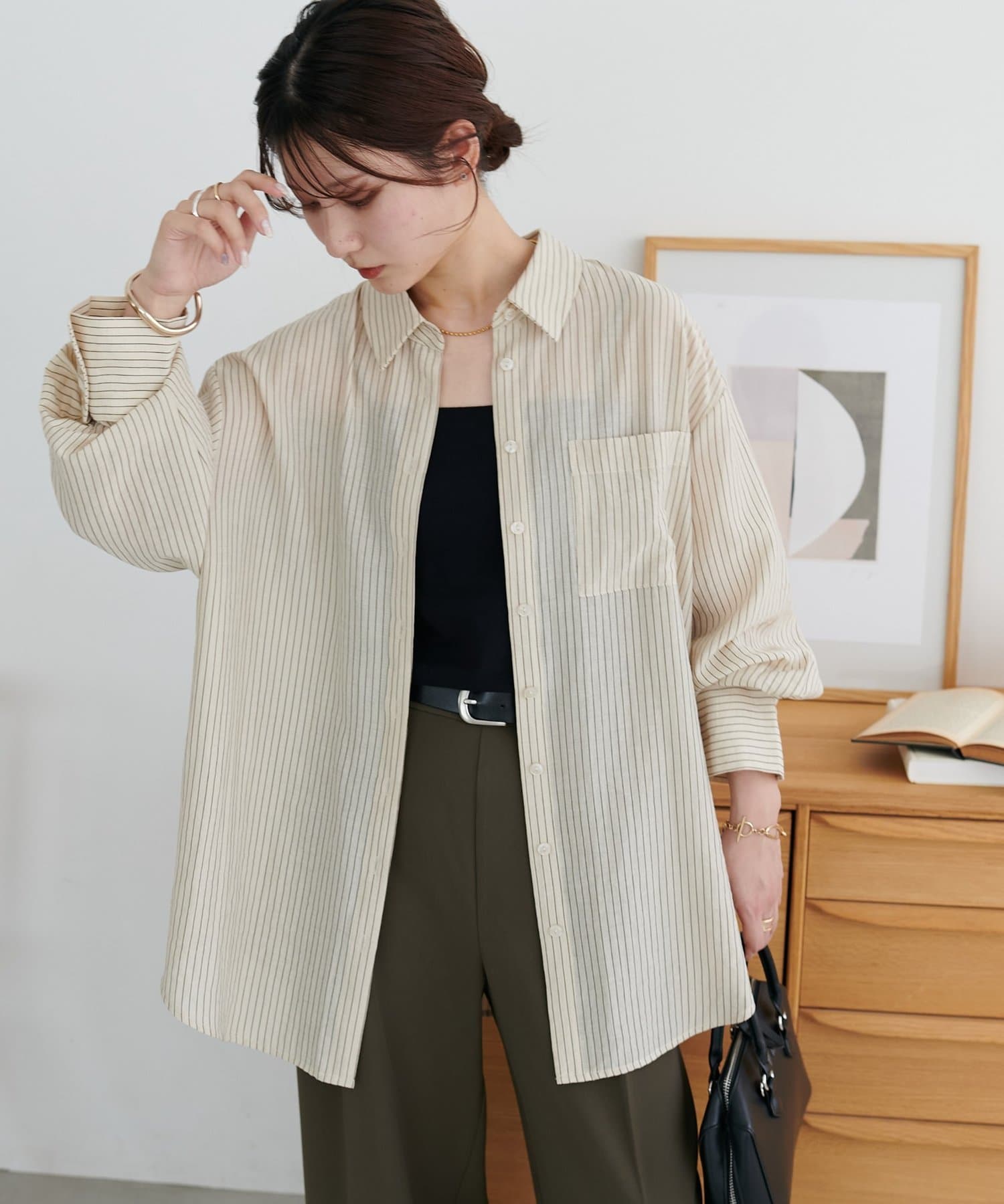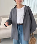 153cmスタッフ:ヒップが隠れる着丈ですが、サイドがラウンドスリットになっていることとシアー感があることで抜け感が自然と出ます!