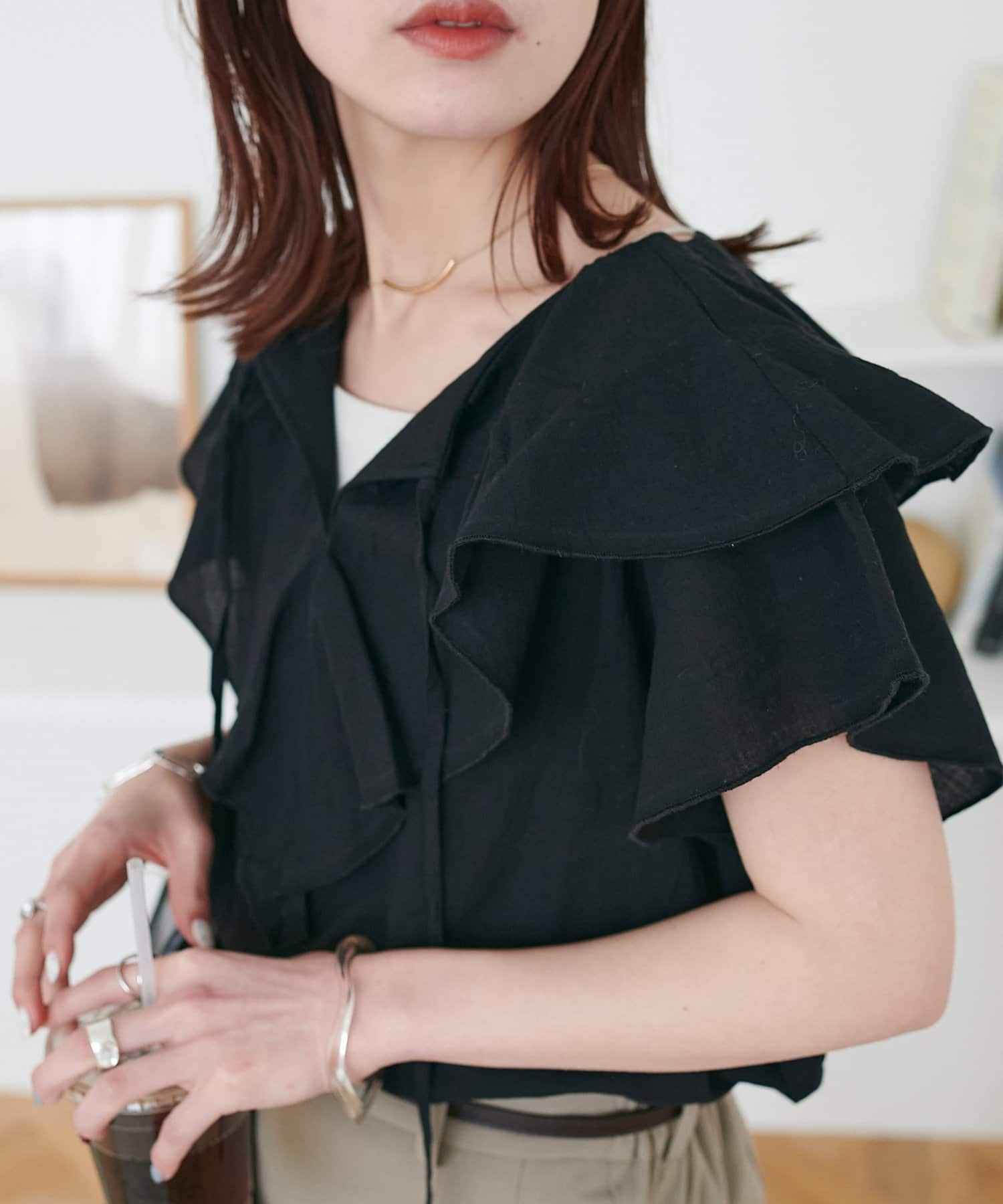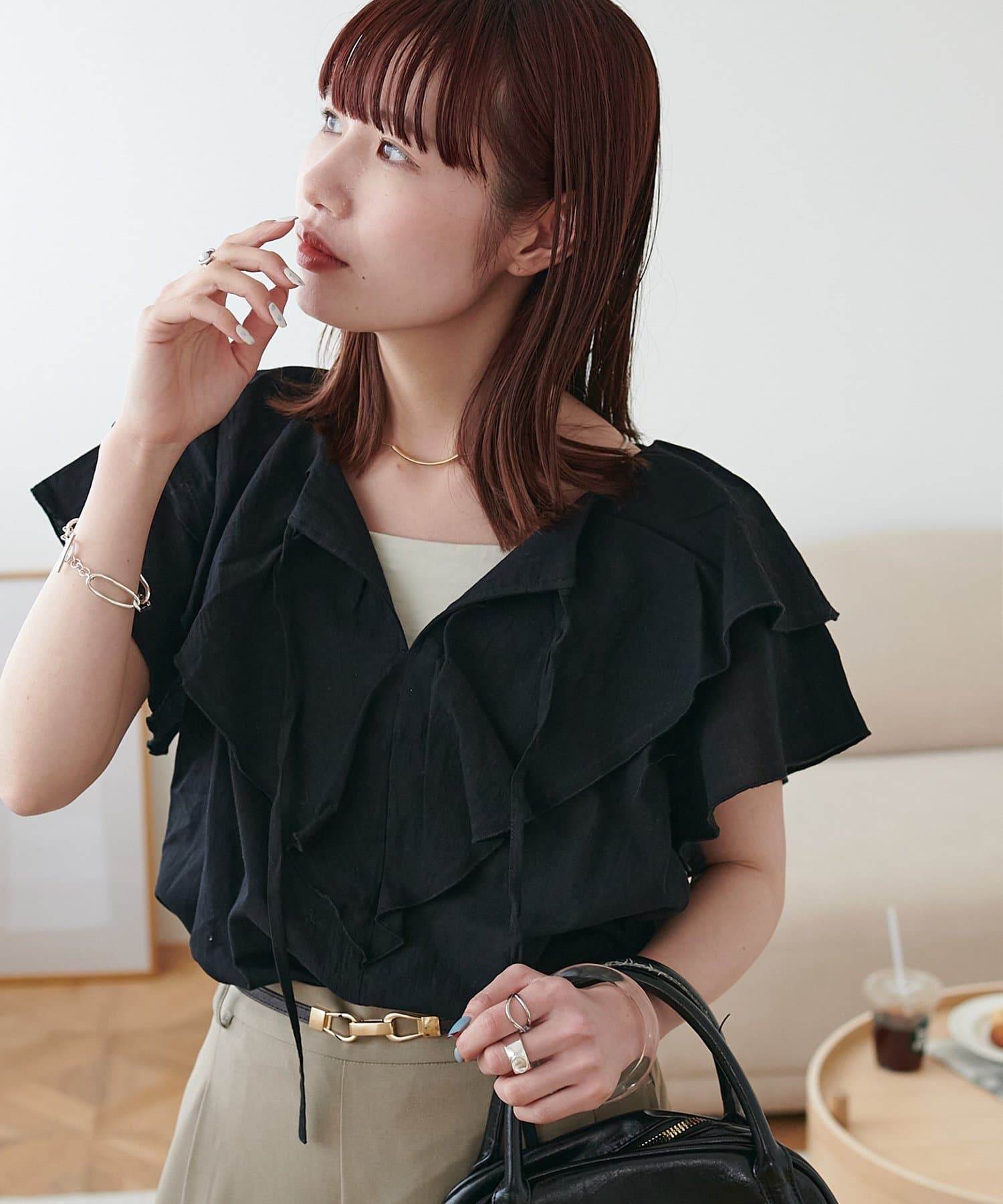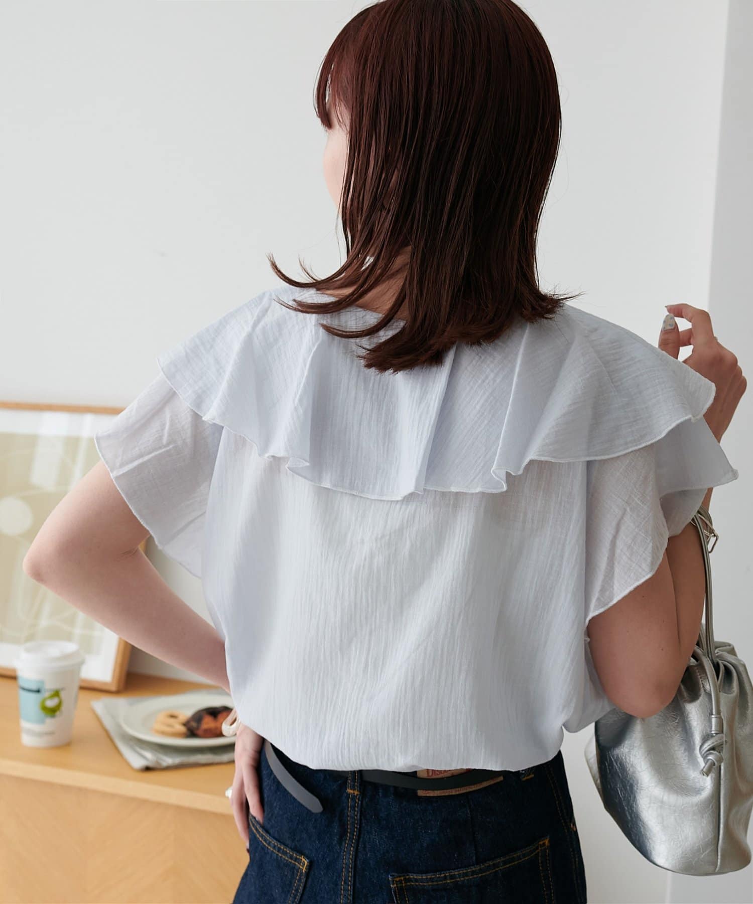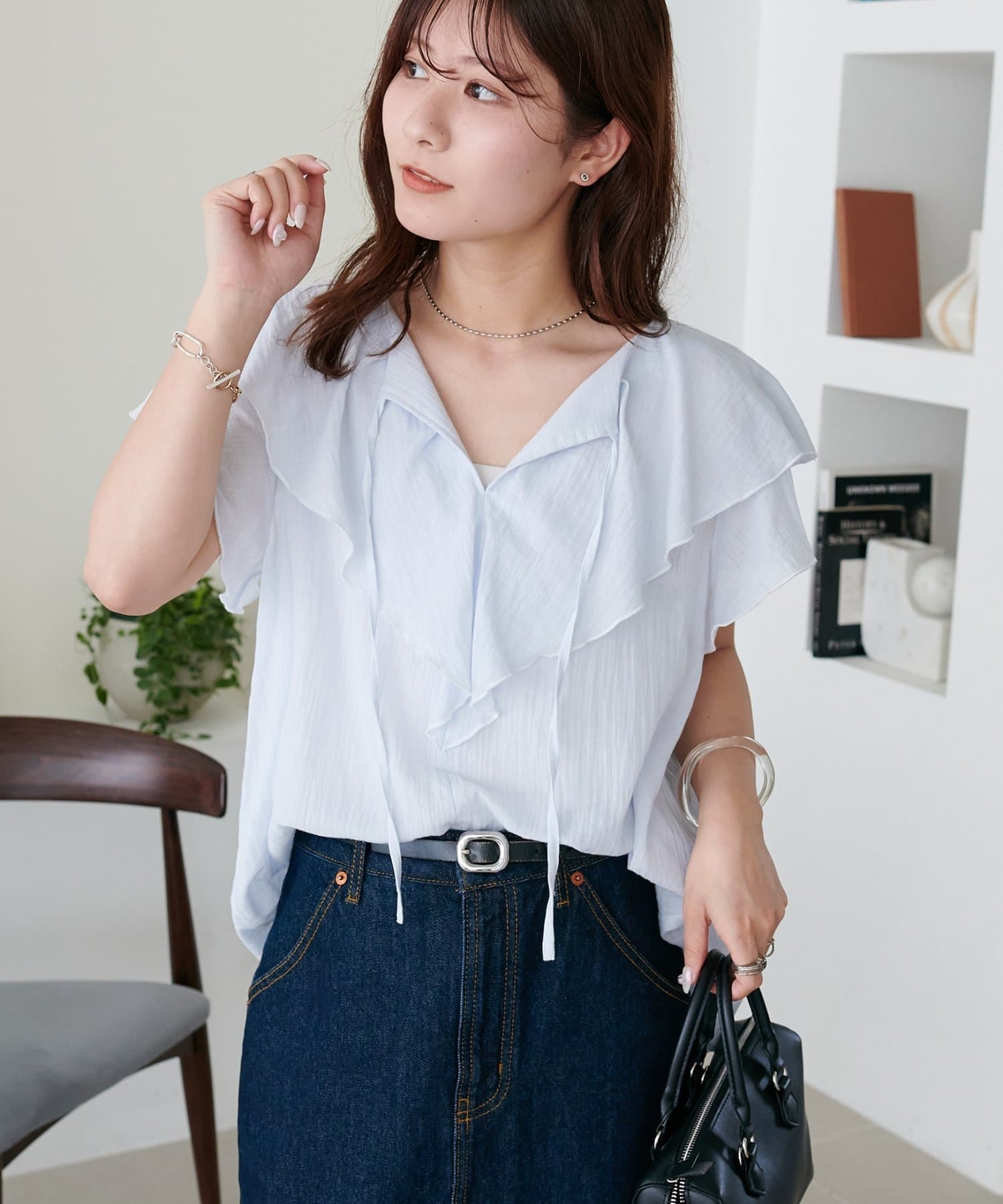 ・パッと目を引く襟フリルのデザインがポイントのブラウス。