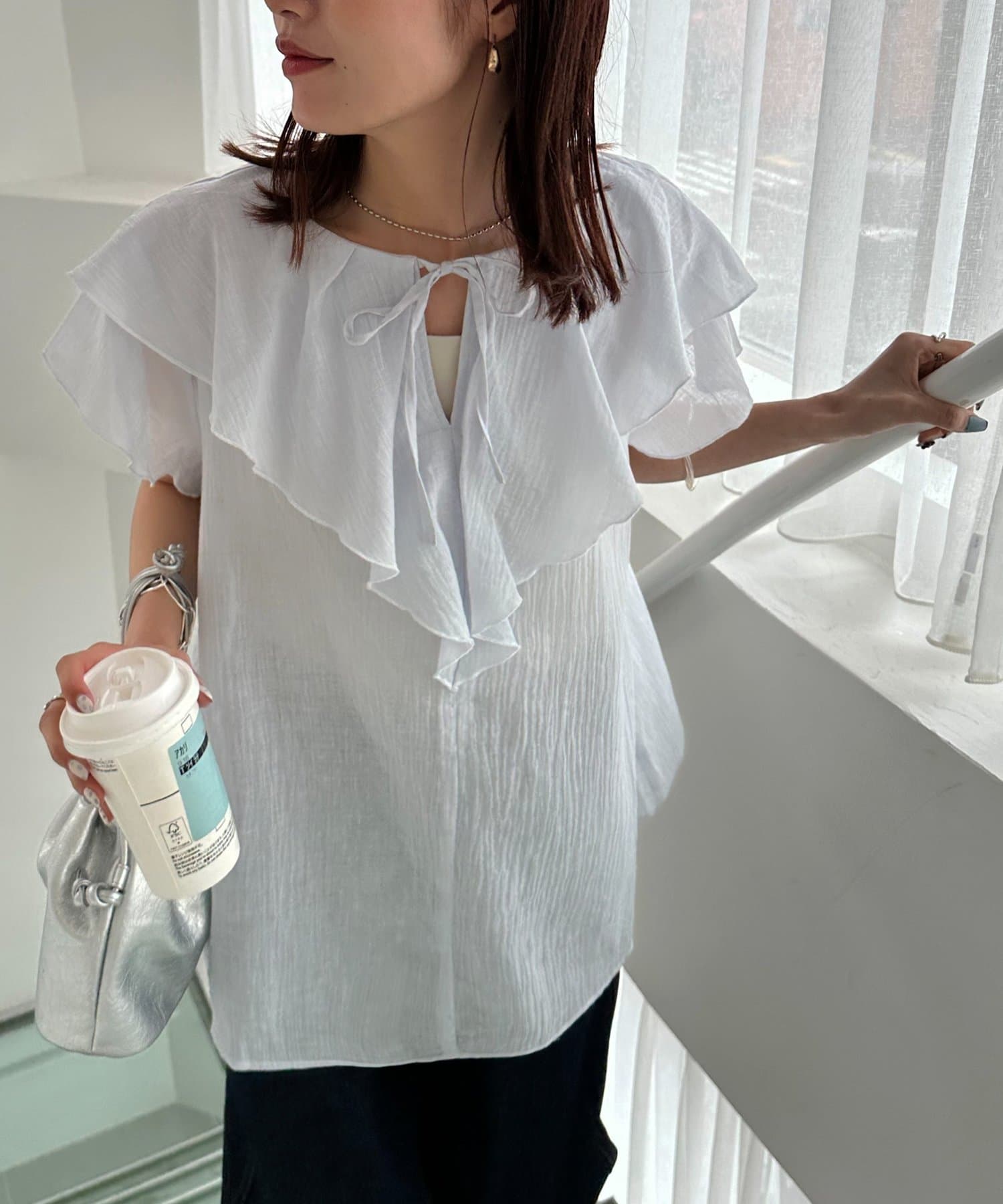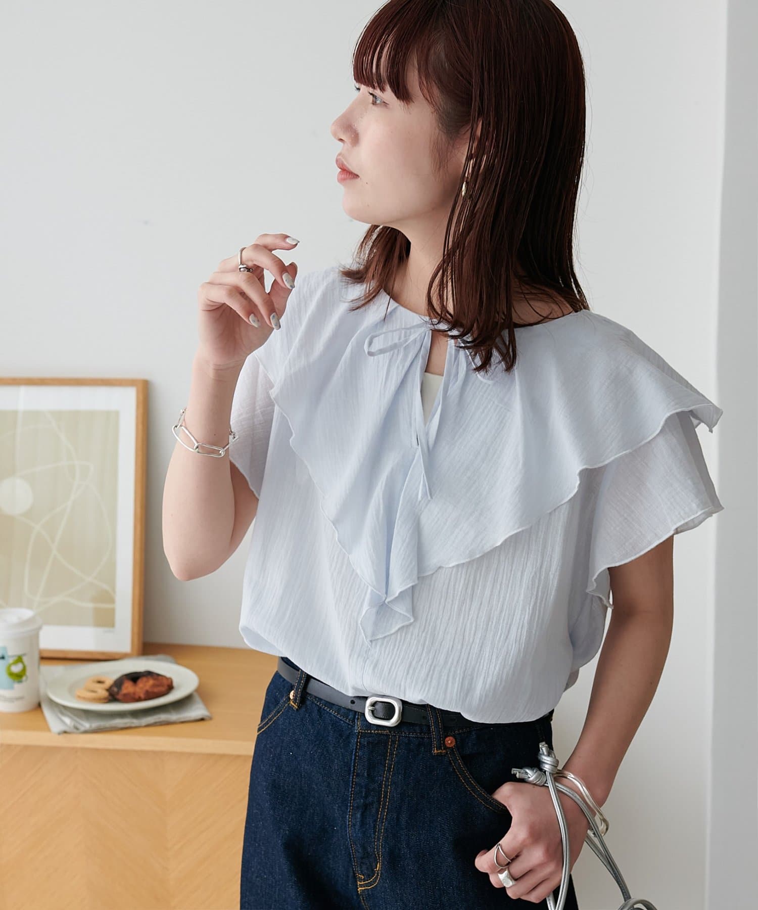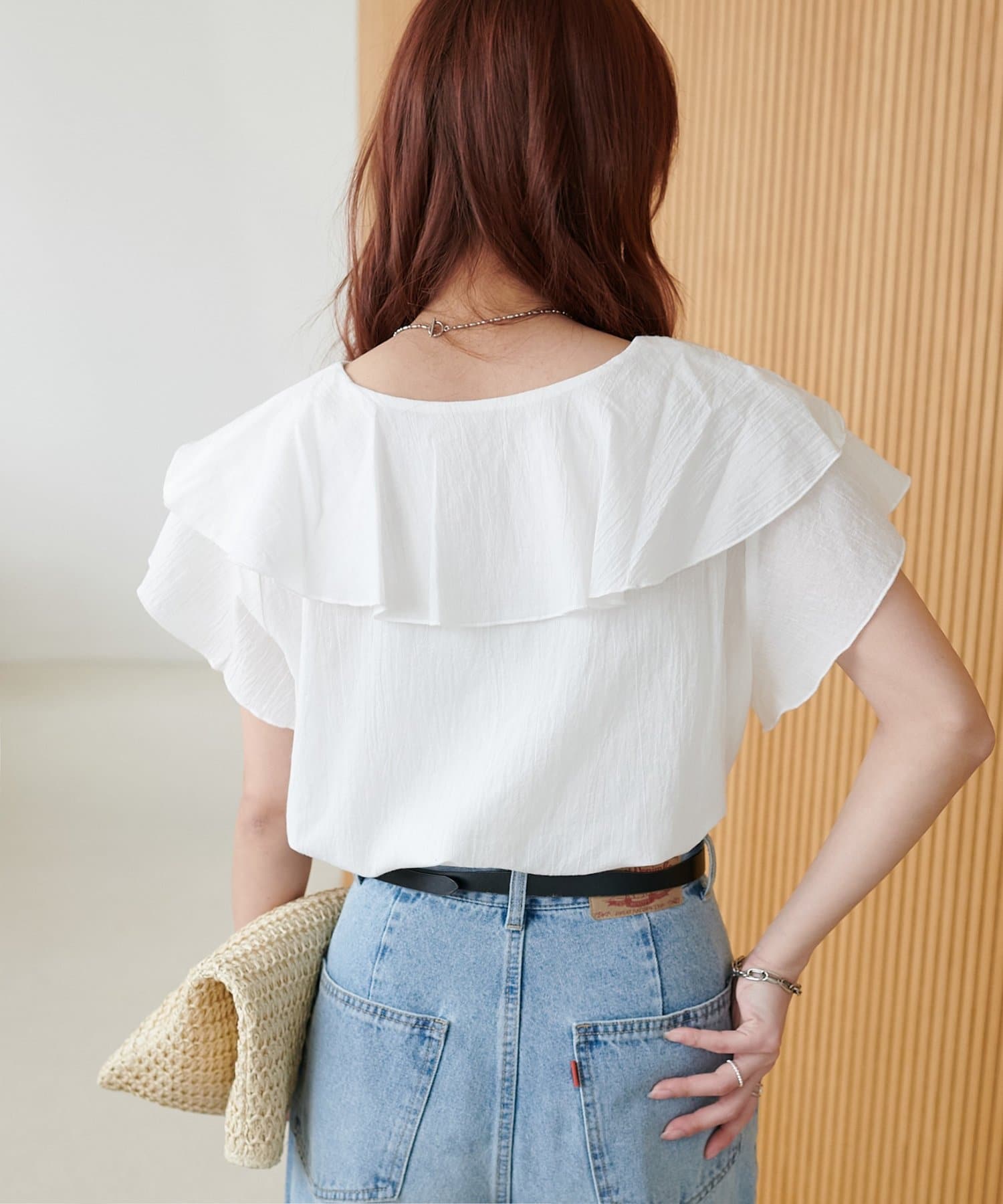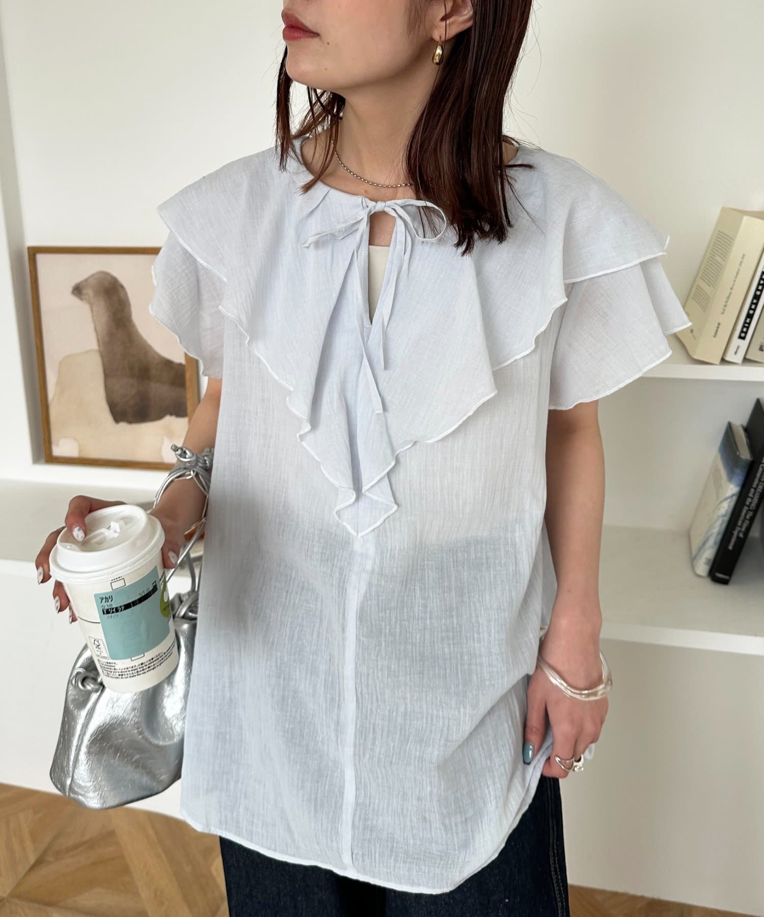 ・パッと目を引く襟フリルのデザインがポイントのブラウス。