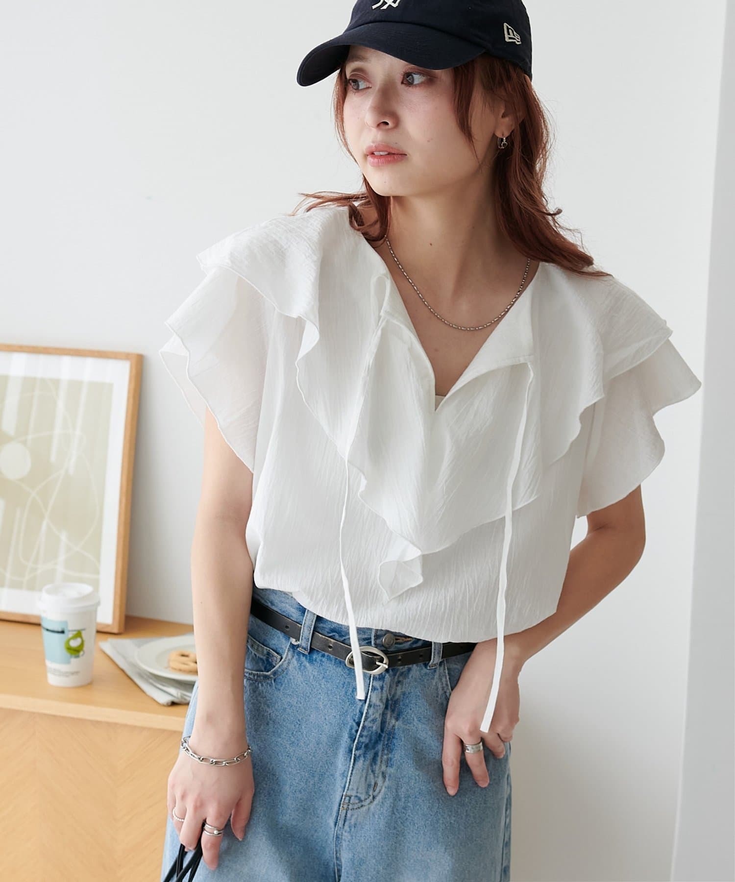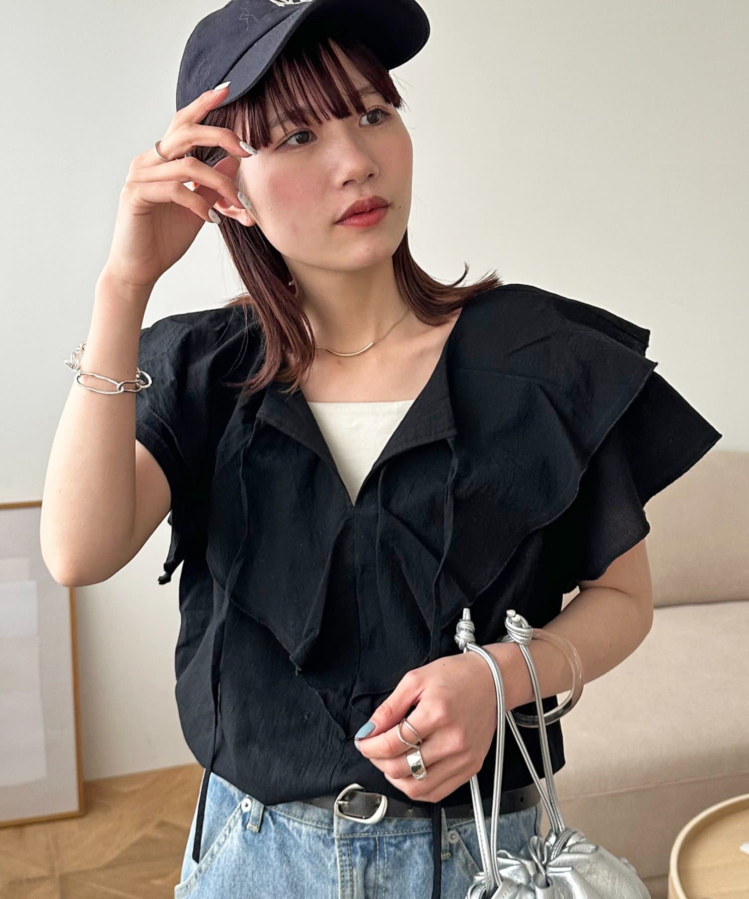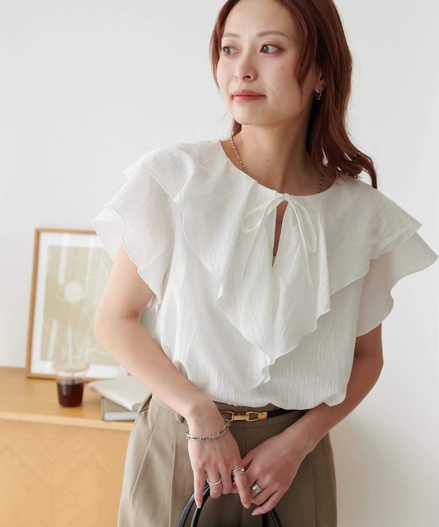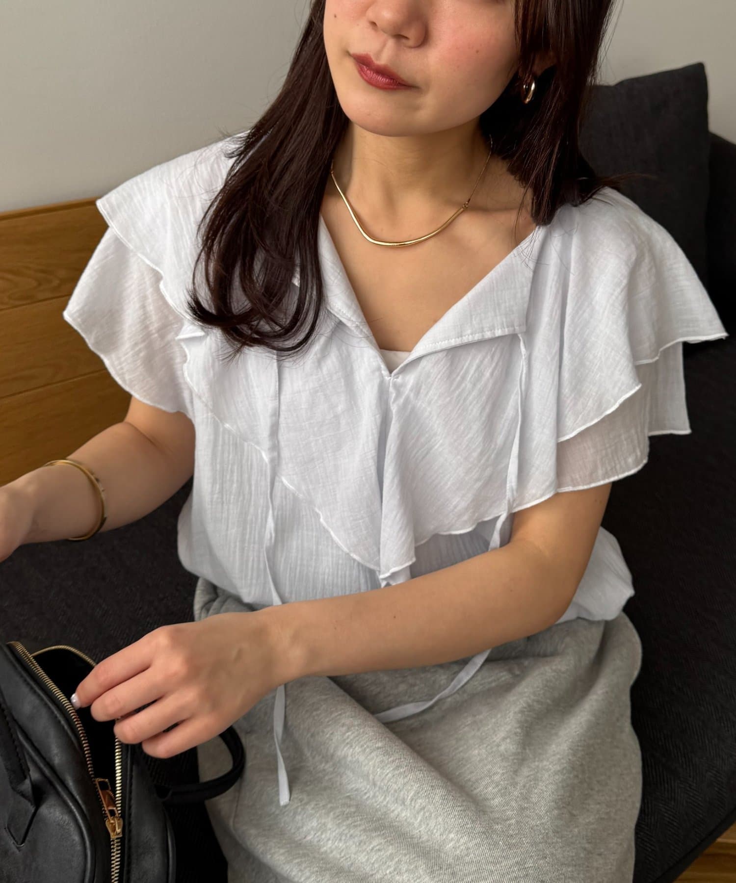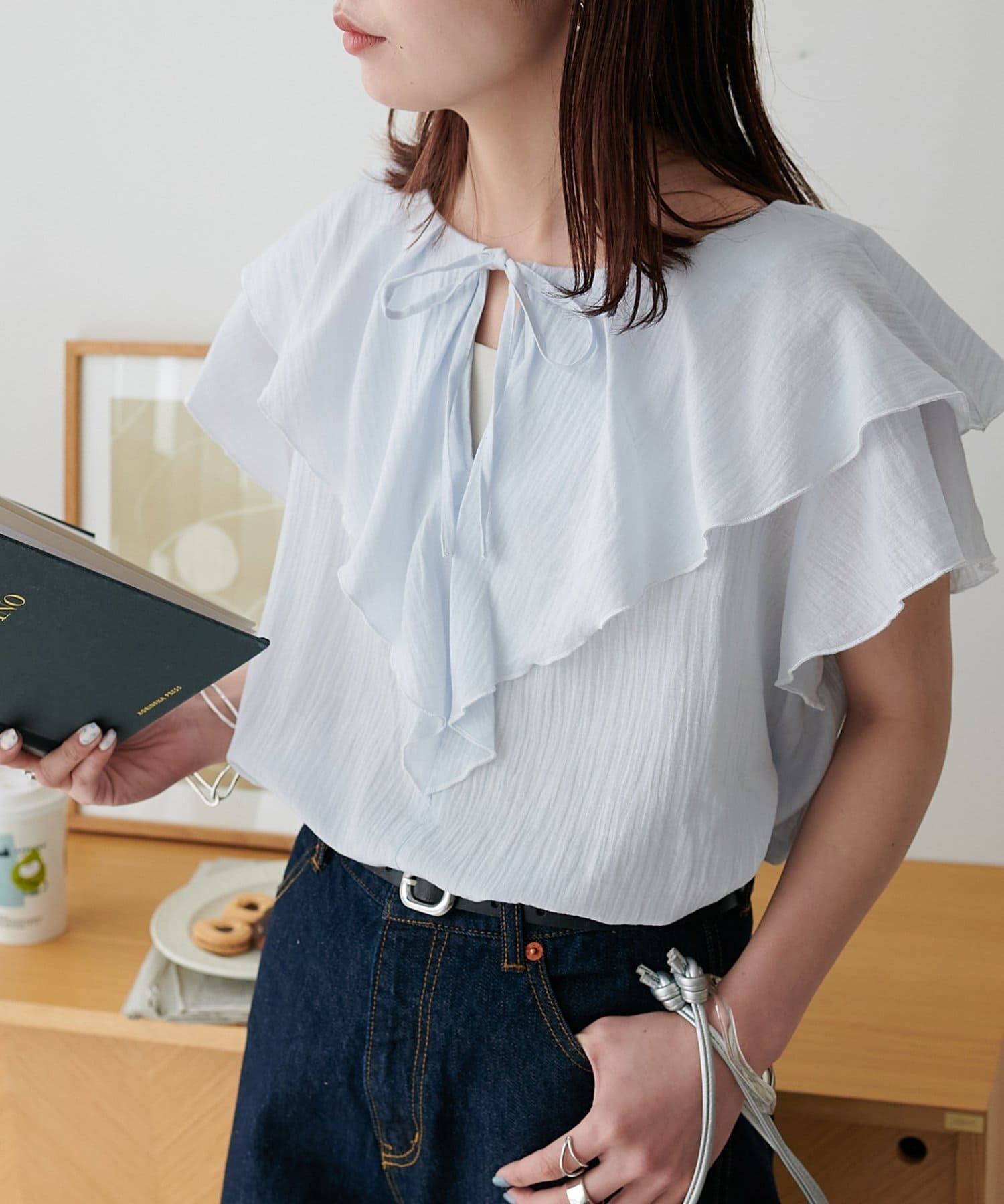 ・パッと目を引く襟フリルのデザインがポイントのブラウス。