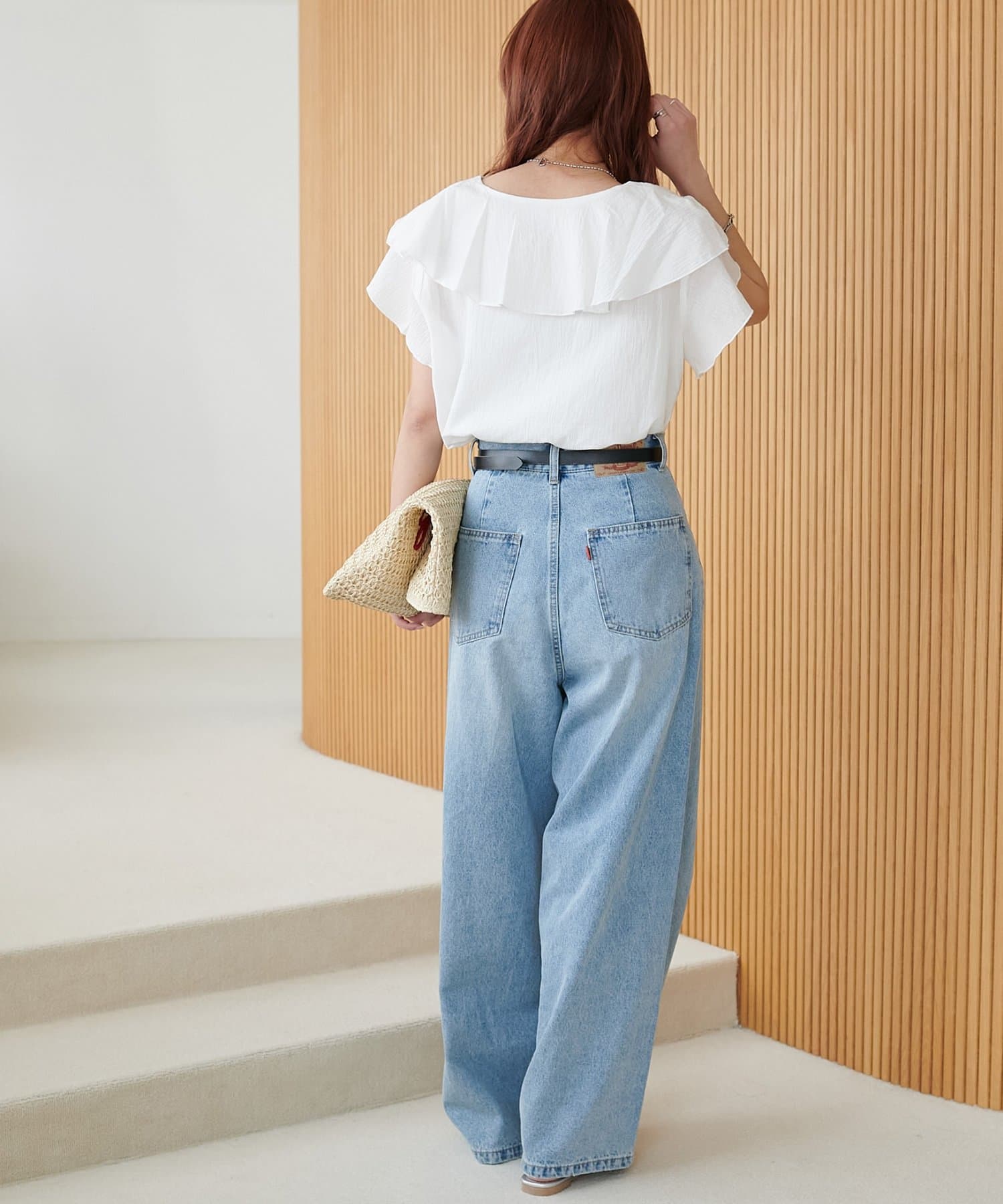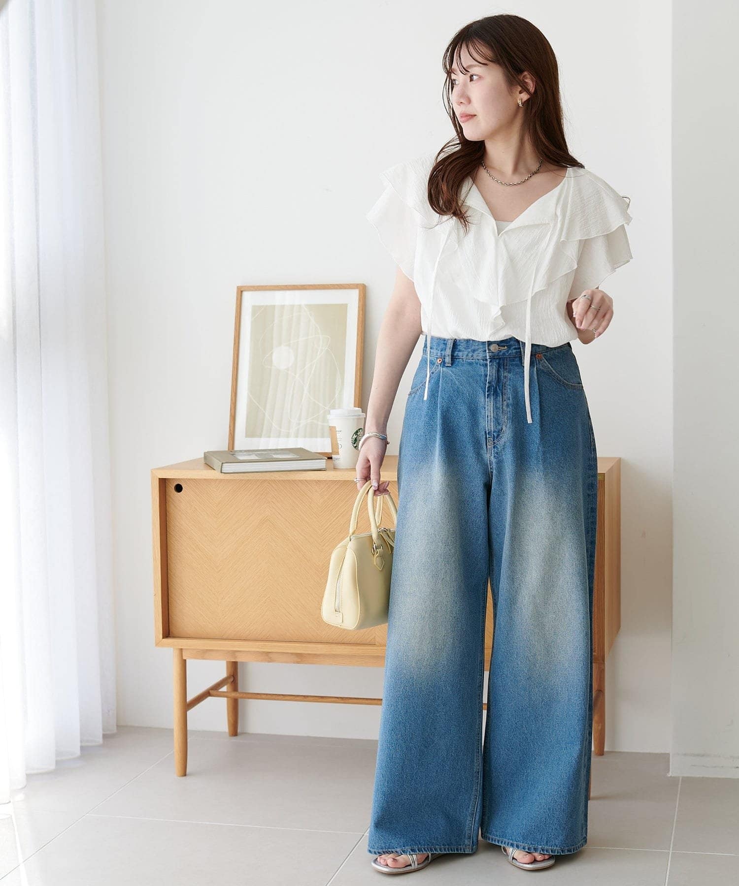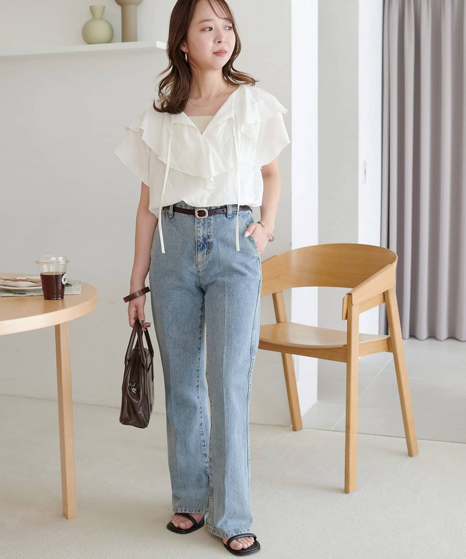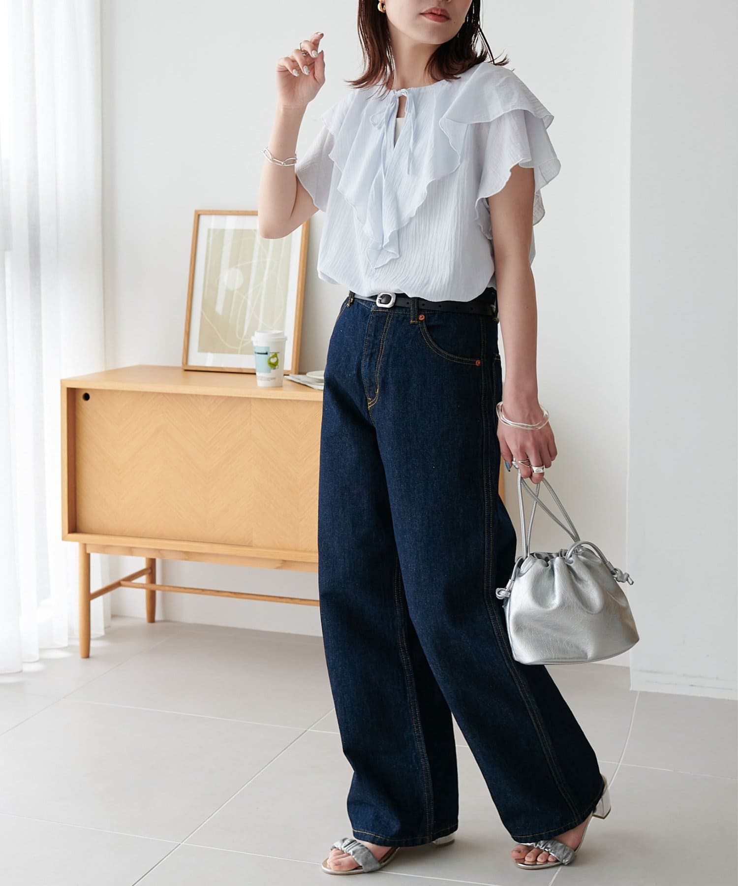 ・パッと目を引く襟フリルのデザインがポイントのブラウス。