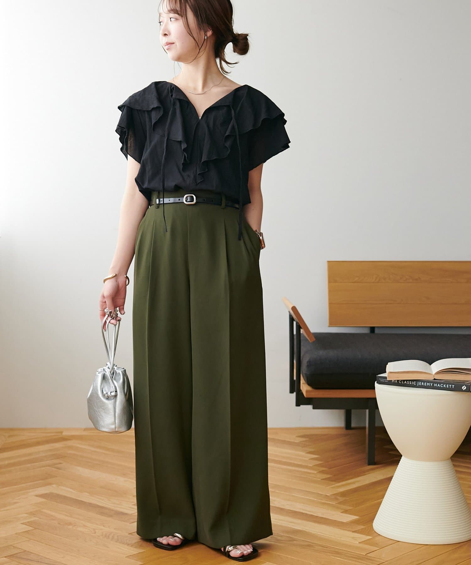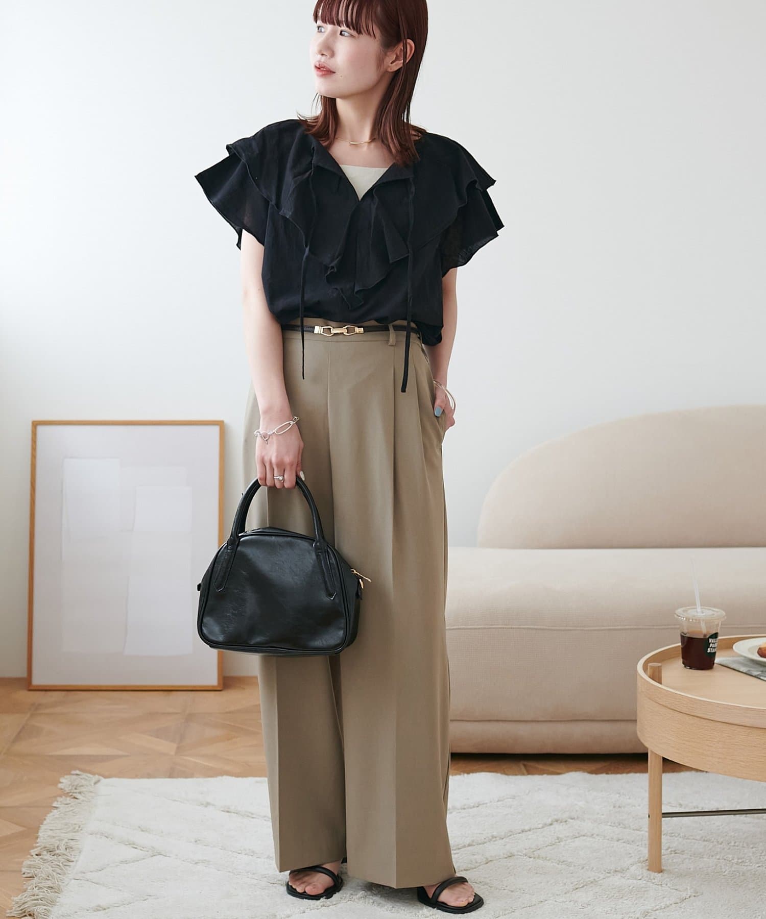 スラックスパンツやテーパードパンツと合わせるとオフィスコーデに。