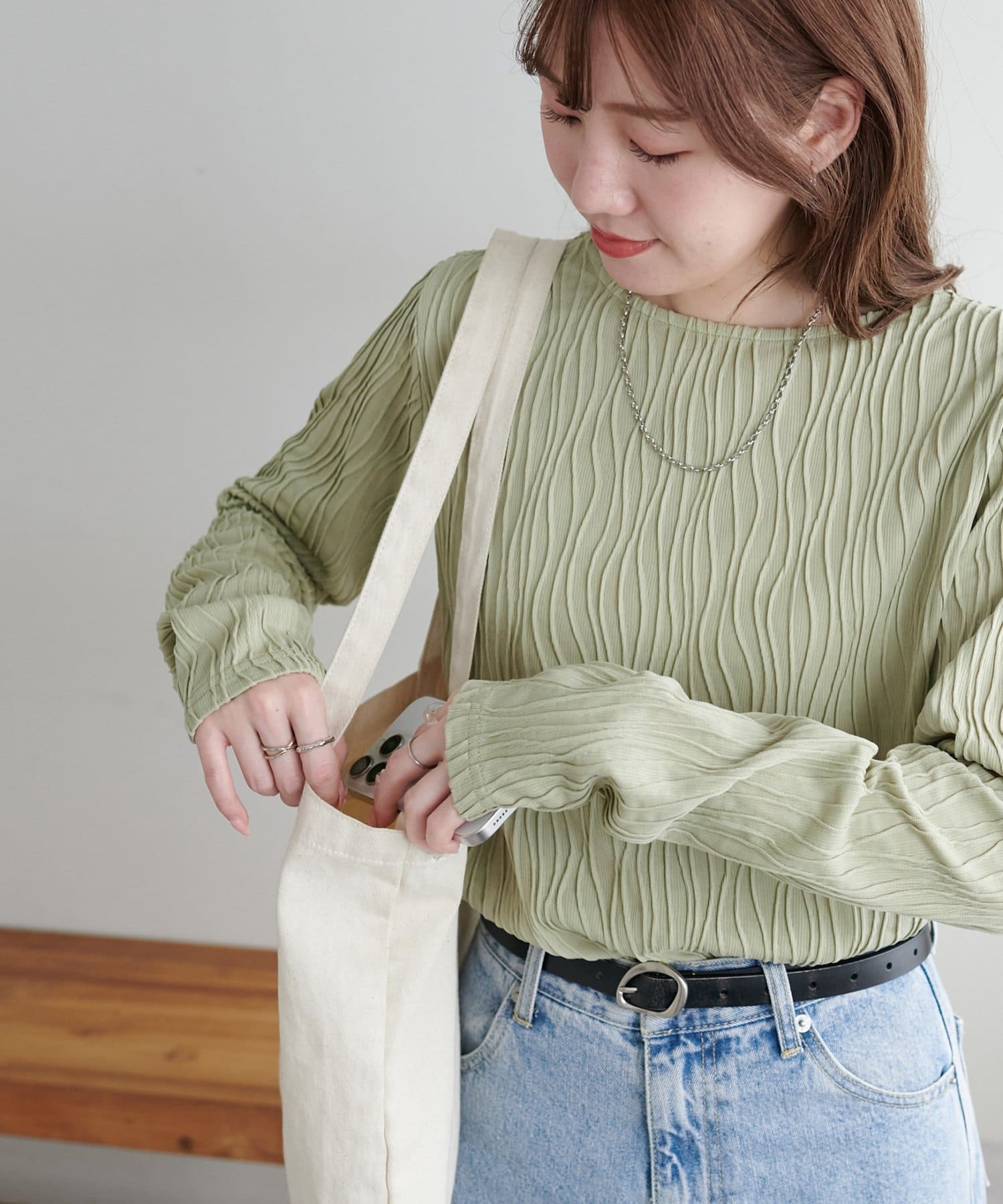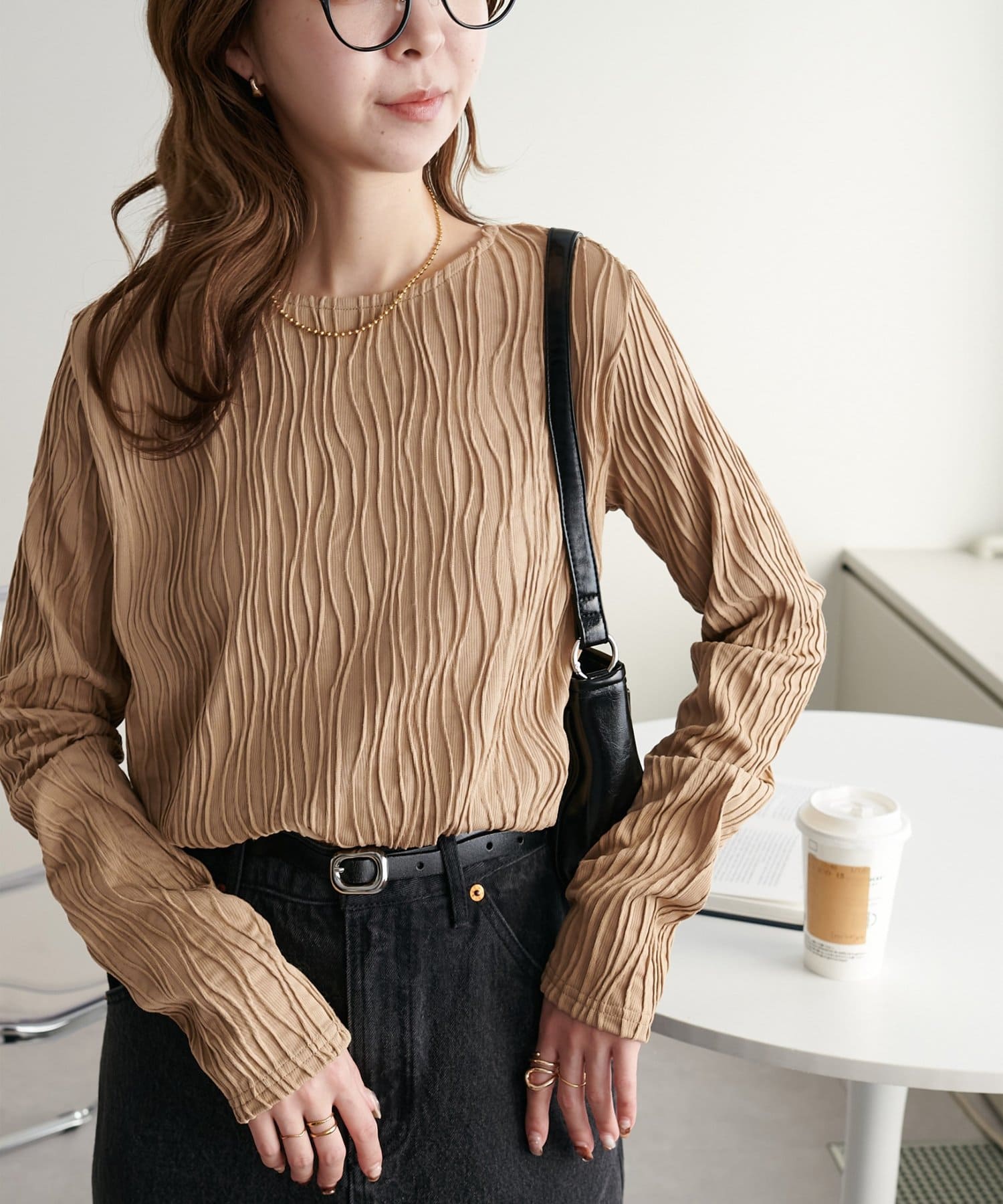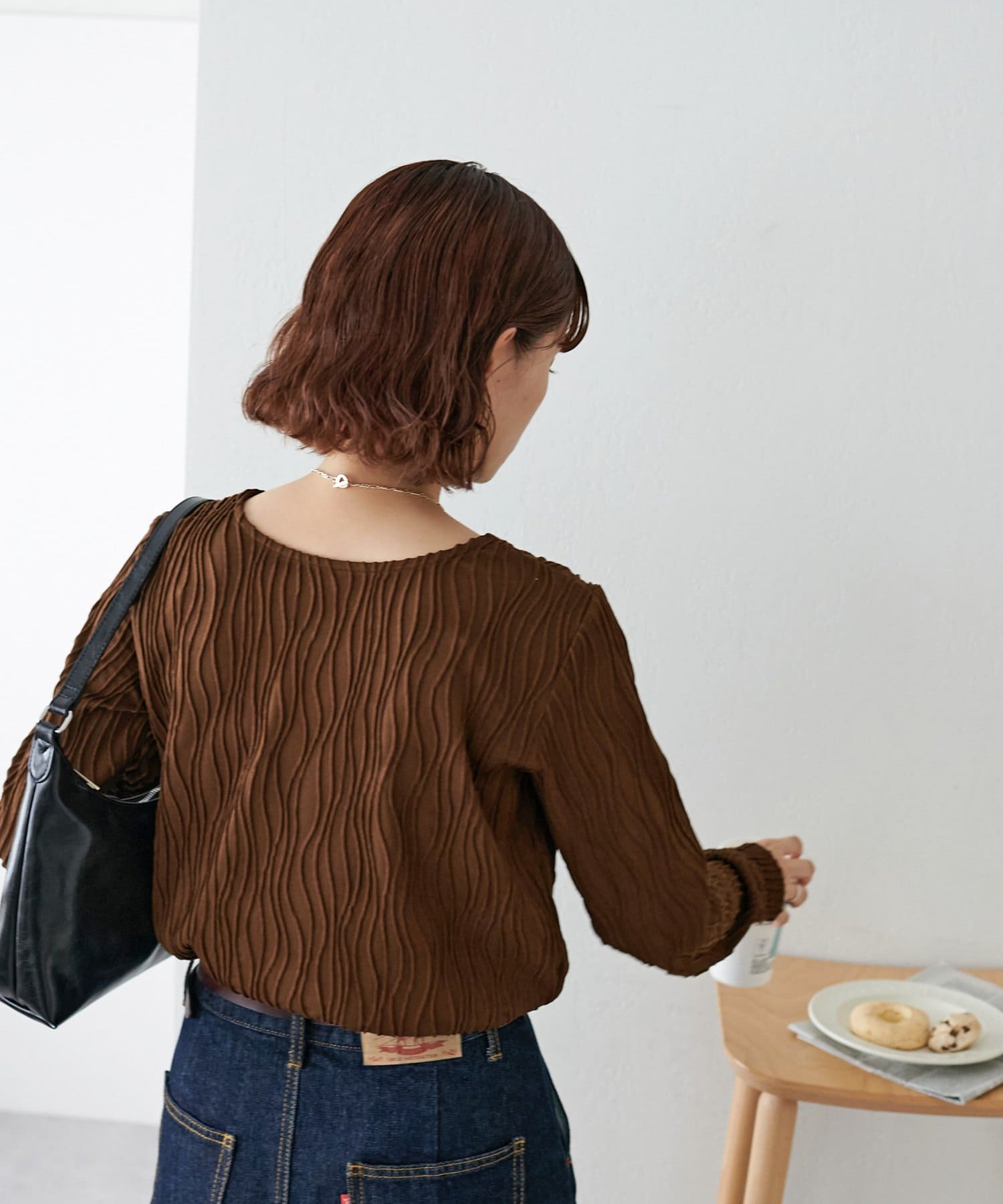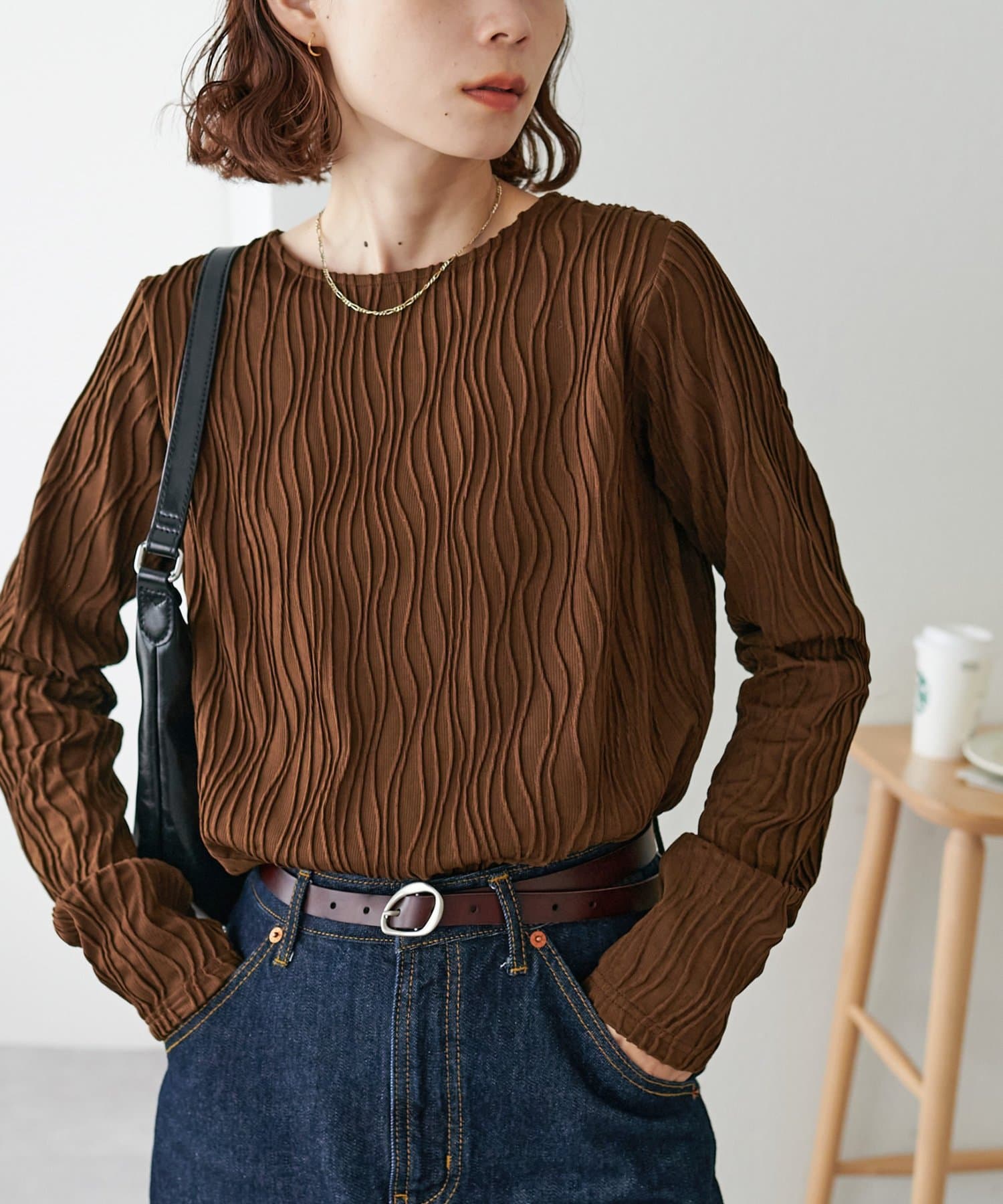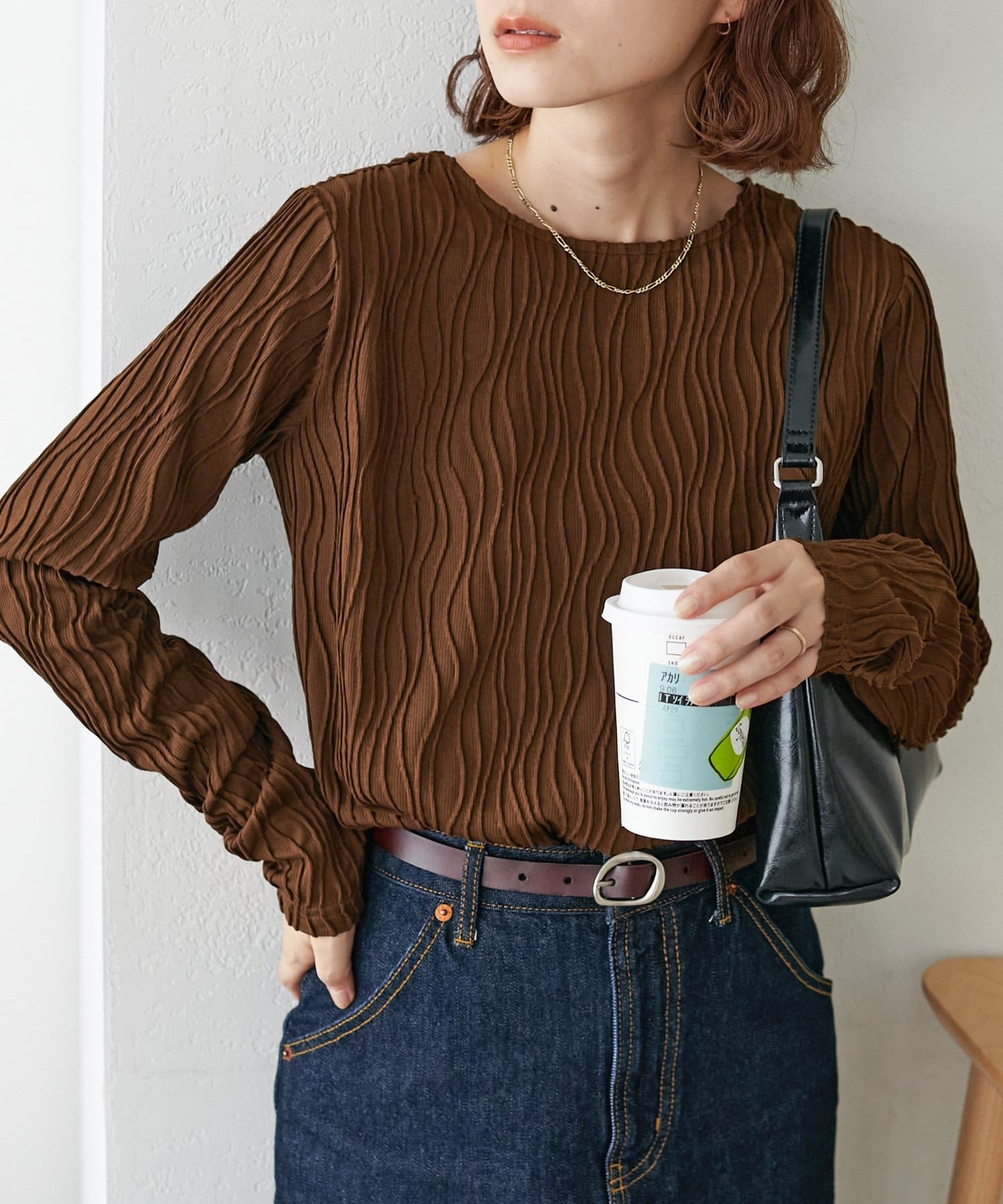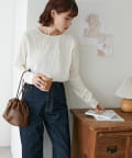 155cmスタッフ:ジャガードのデザインなので、コーデのポイントにおすすめのトップスです!