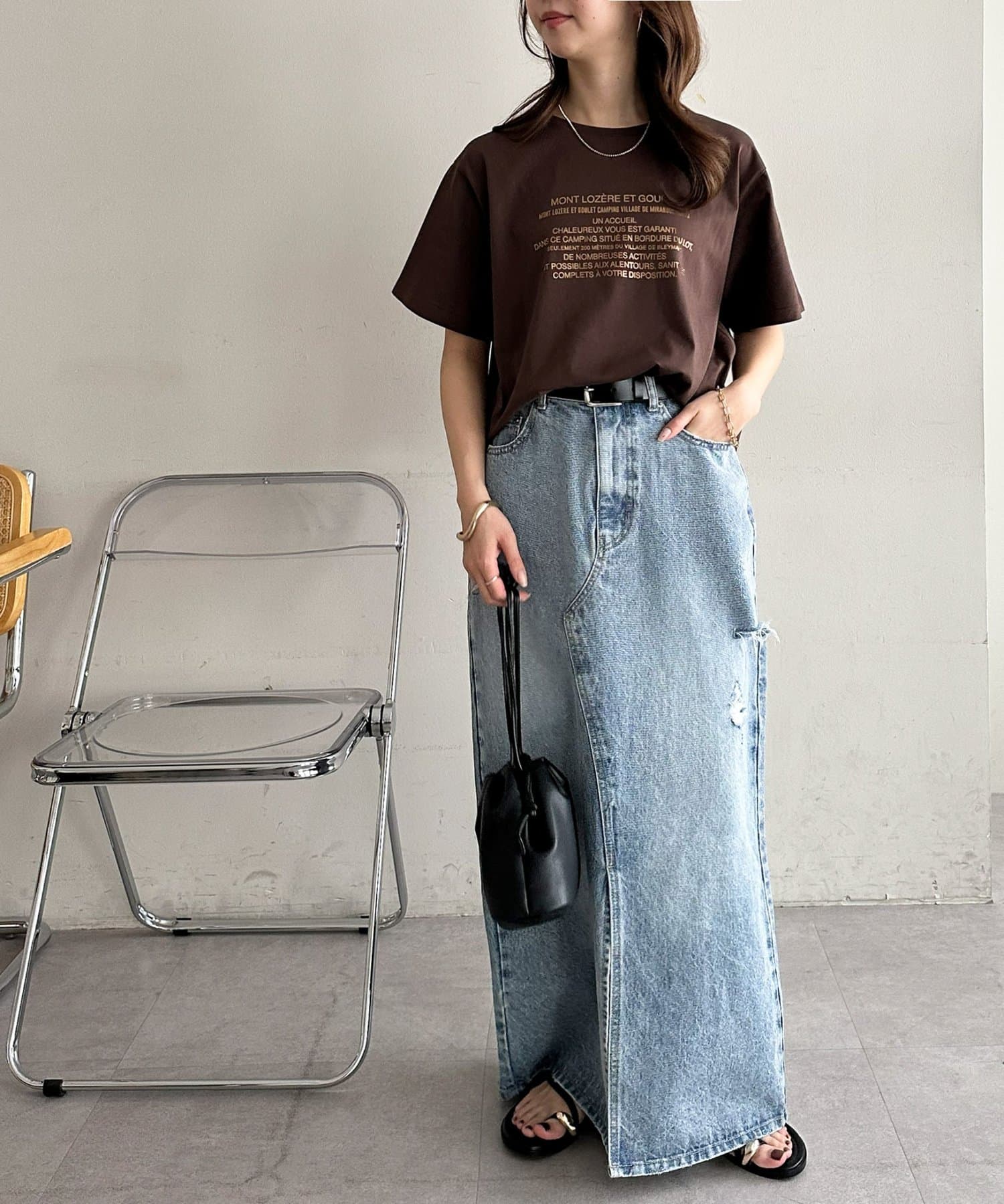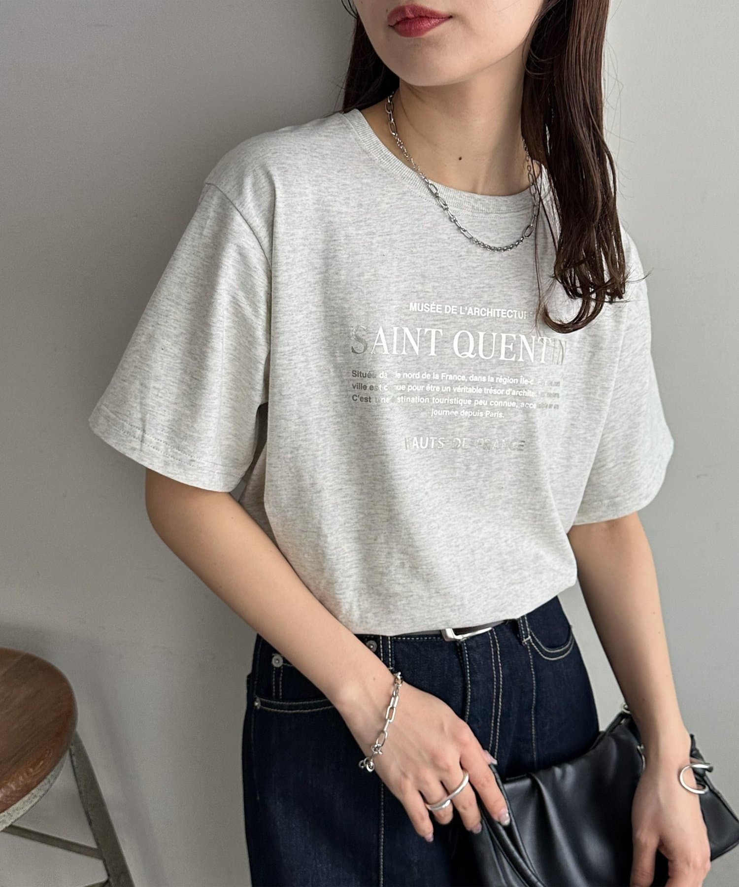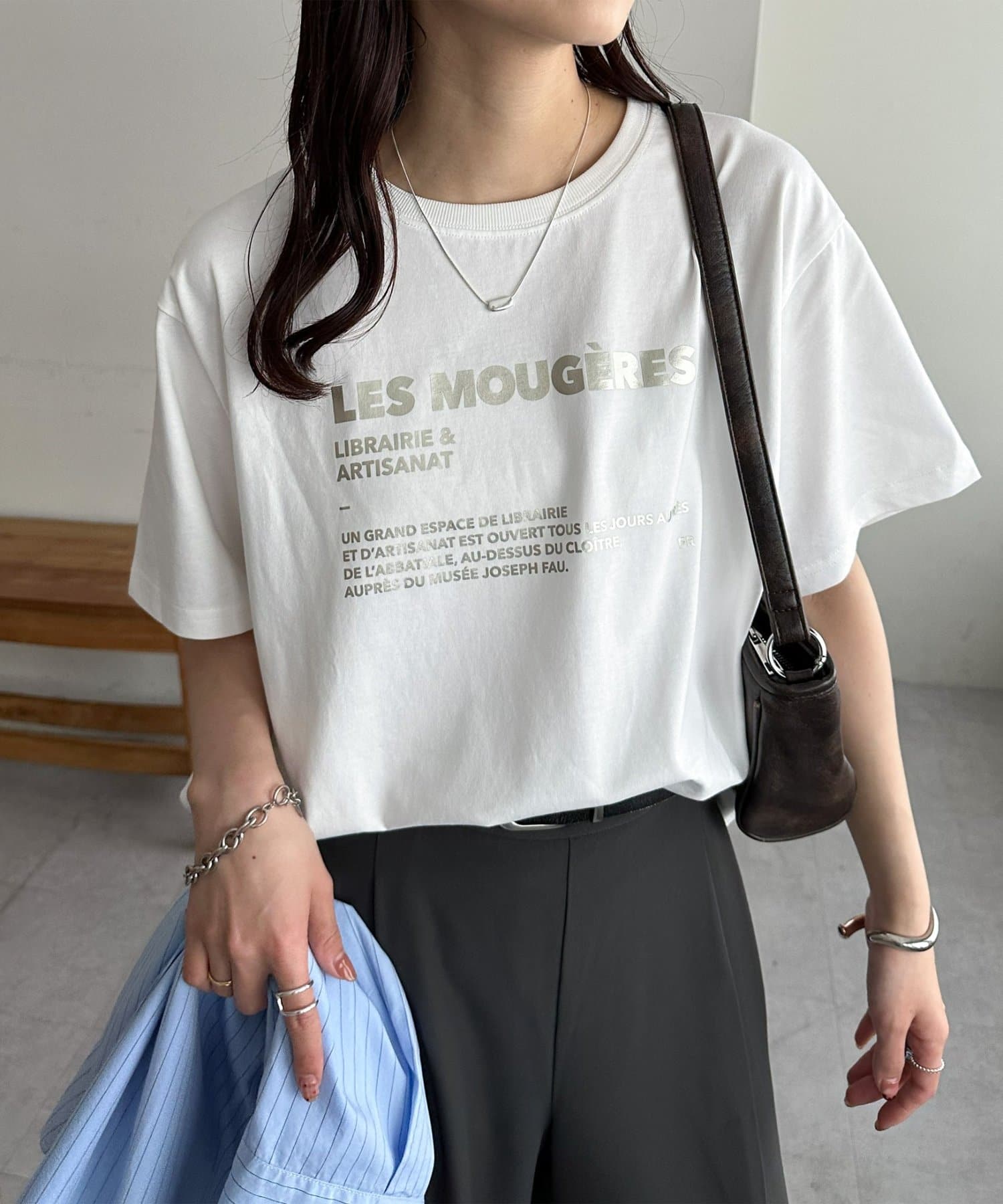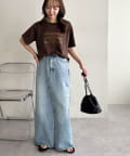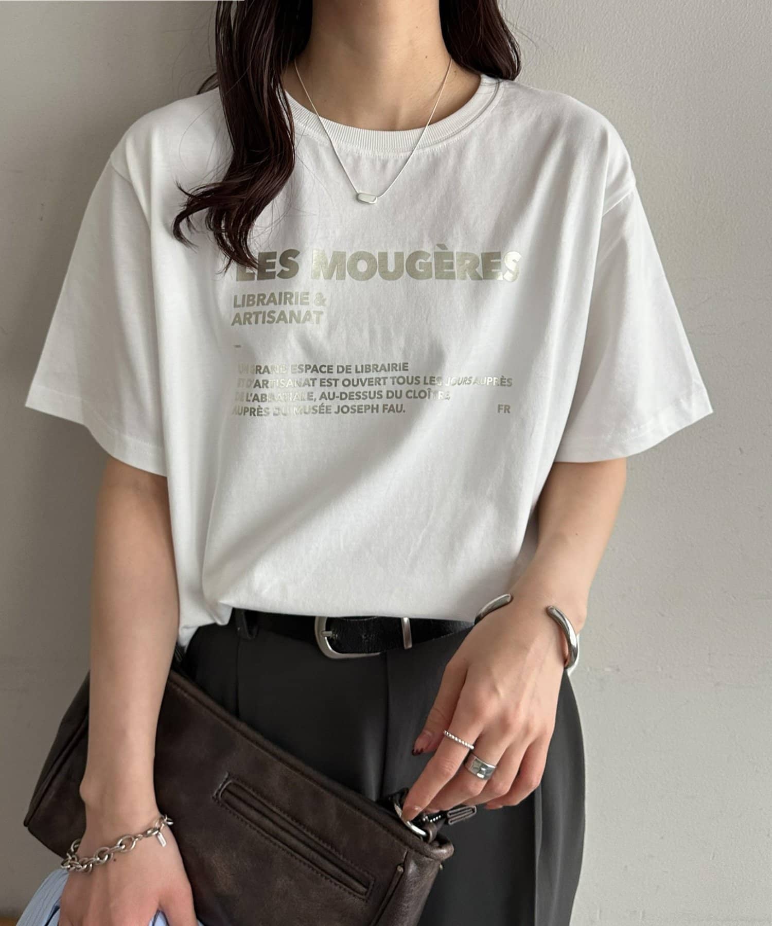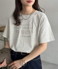 カジュアルな印象のTシャツも箔プリントによって、きれいめな雰囲気にまとまる!私はナロースカート合わせで、大人のリラックススタイルがおすすめです♪