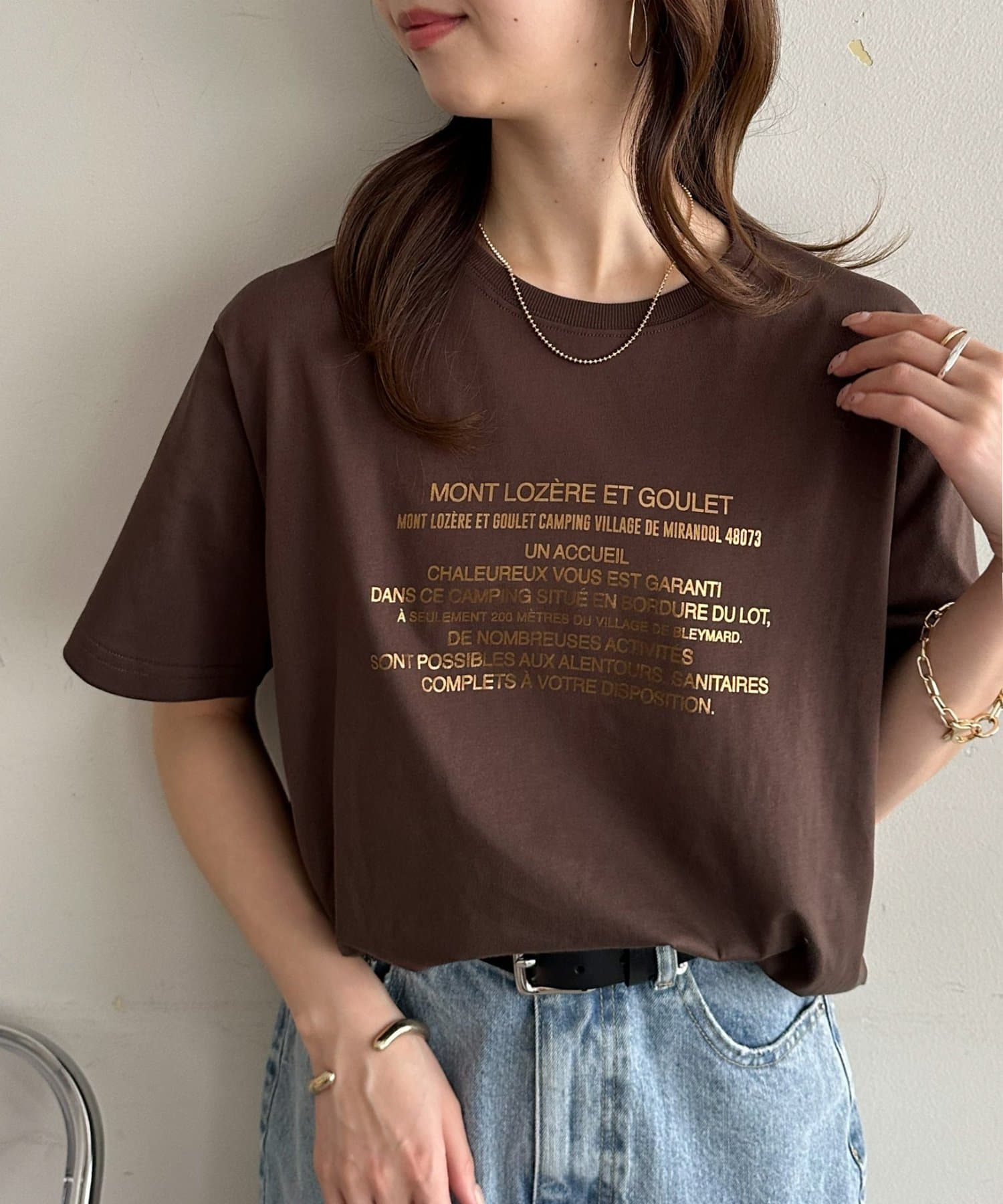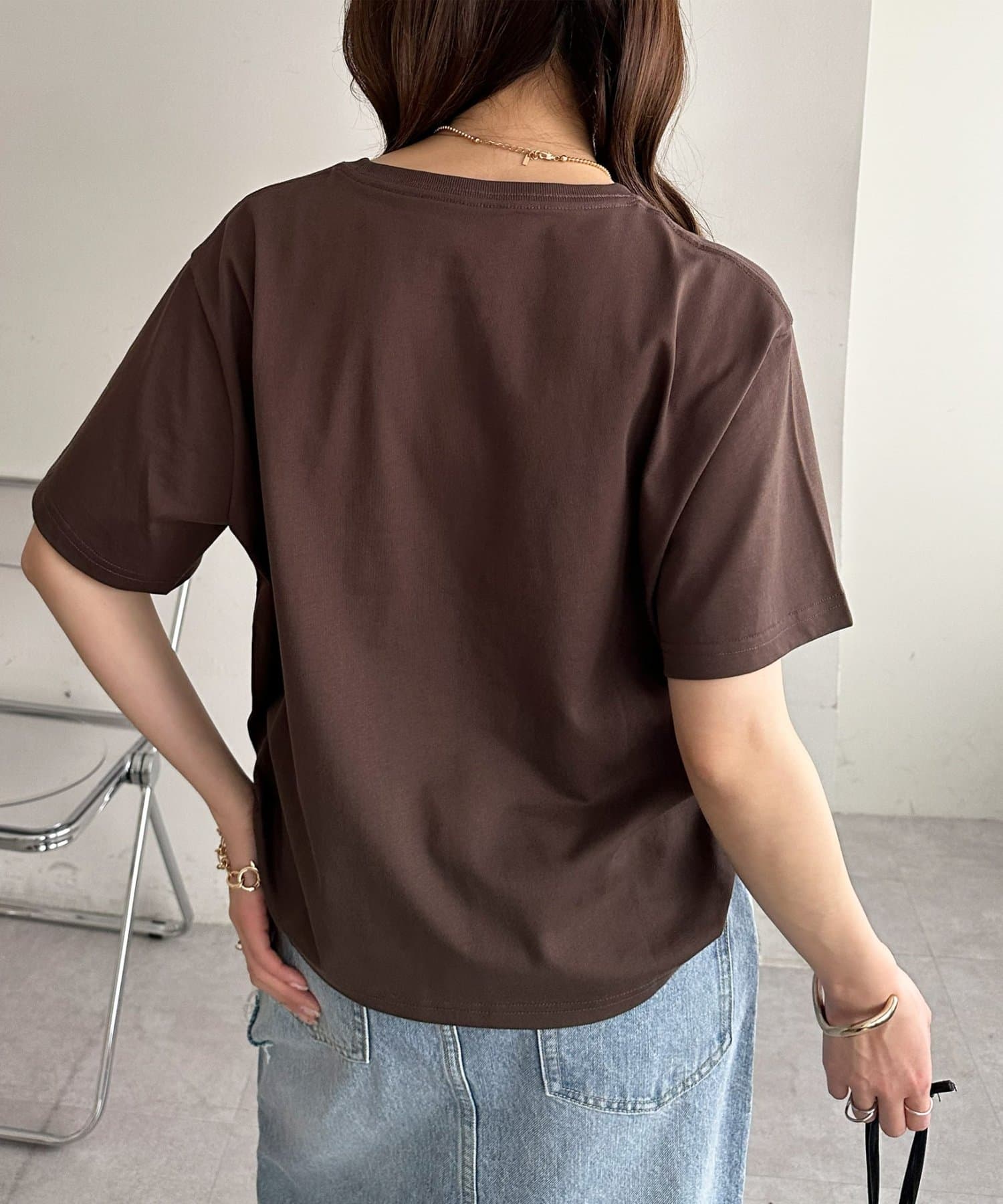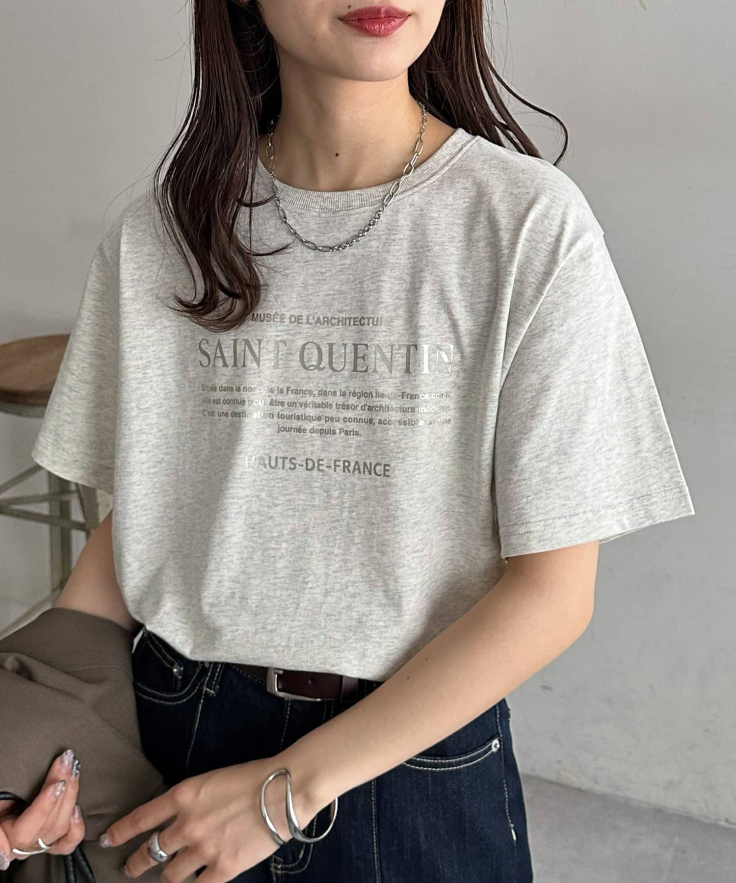 カジュアルな印象のTシャツも箔プリントによって、きれいめな雰囲気にまとまる!私はナロースカート合わせで、大人のリラックススタイルがおすすめです♪