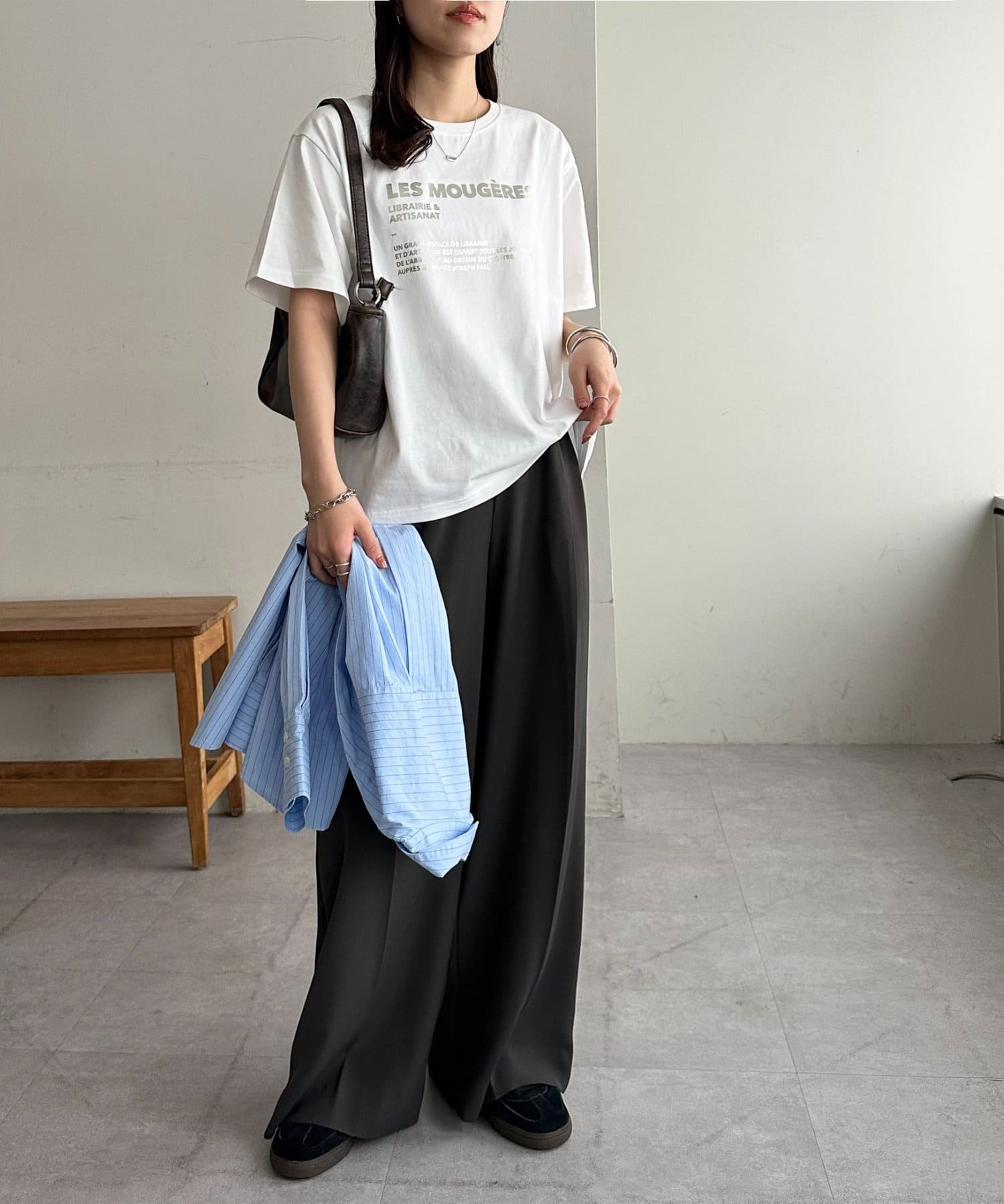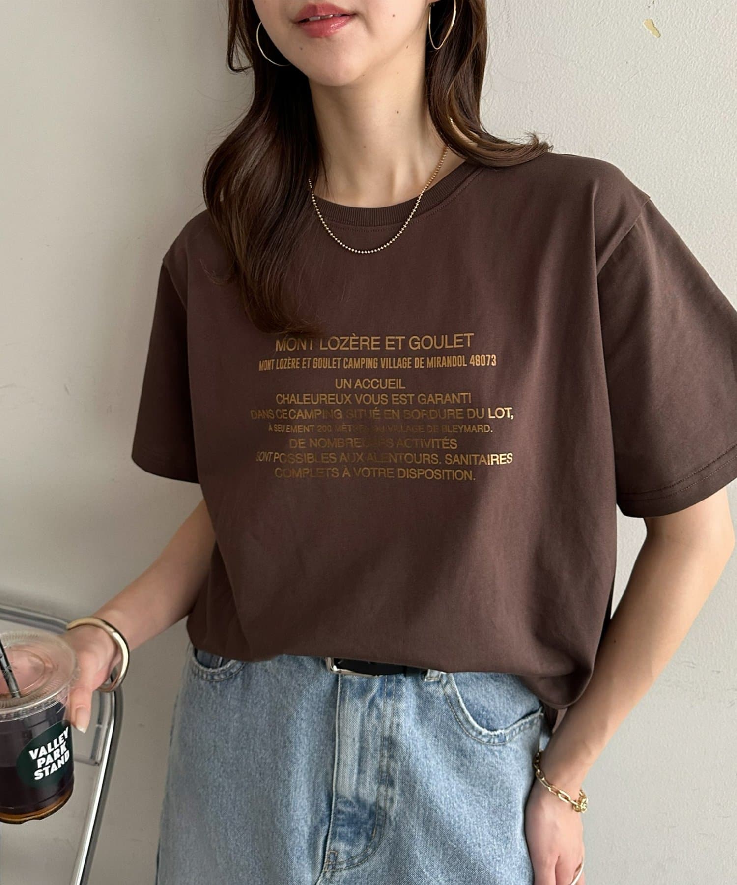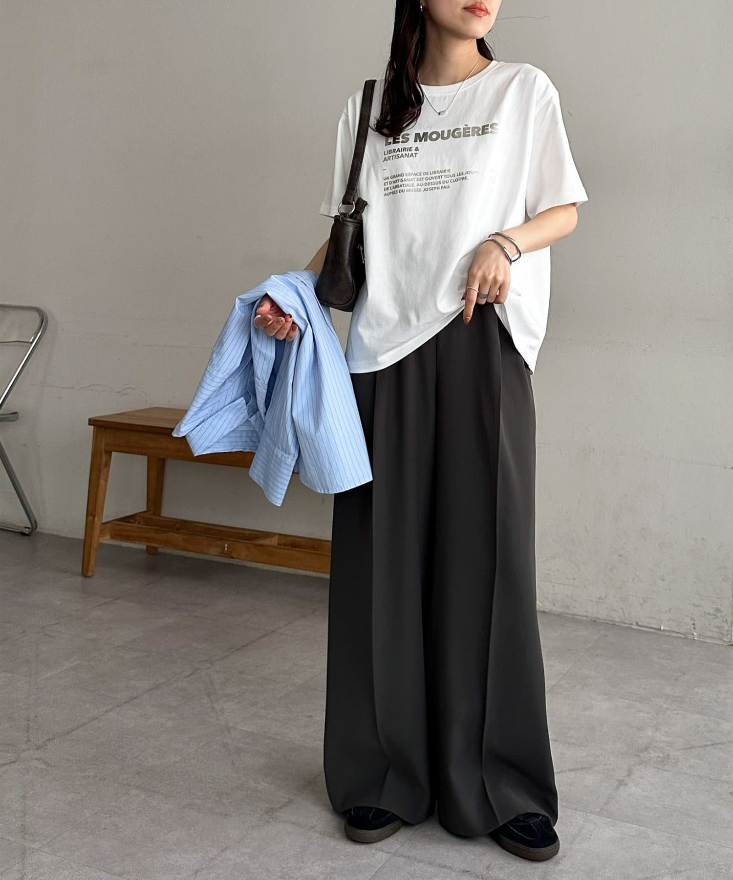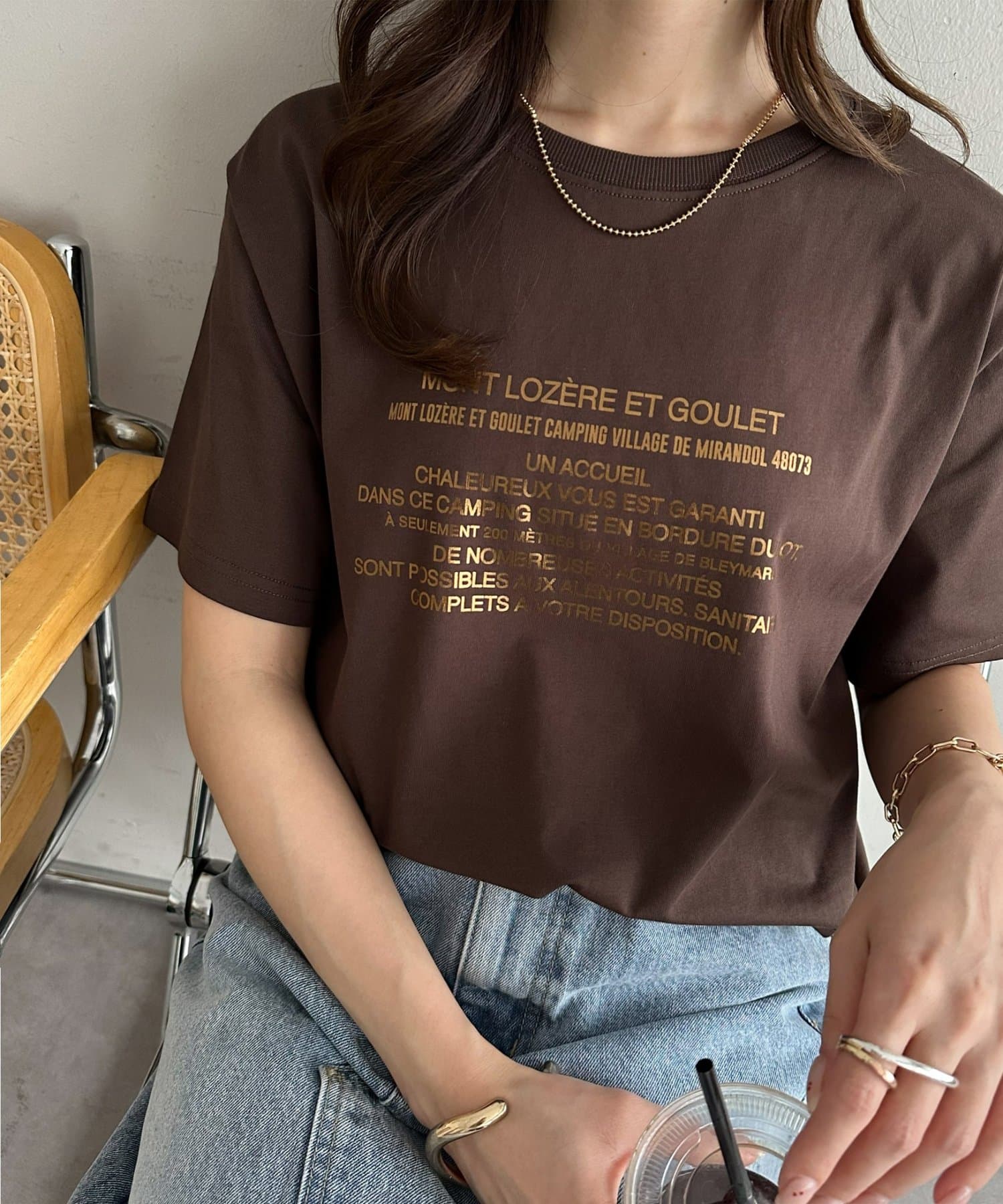 カジュアルな印象のTシャツも箔プリントによって、きれいめな雰囲気にまとまる!私はナロースカート合わせで、大人のリラックススタイルがおすすめです♪