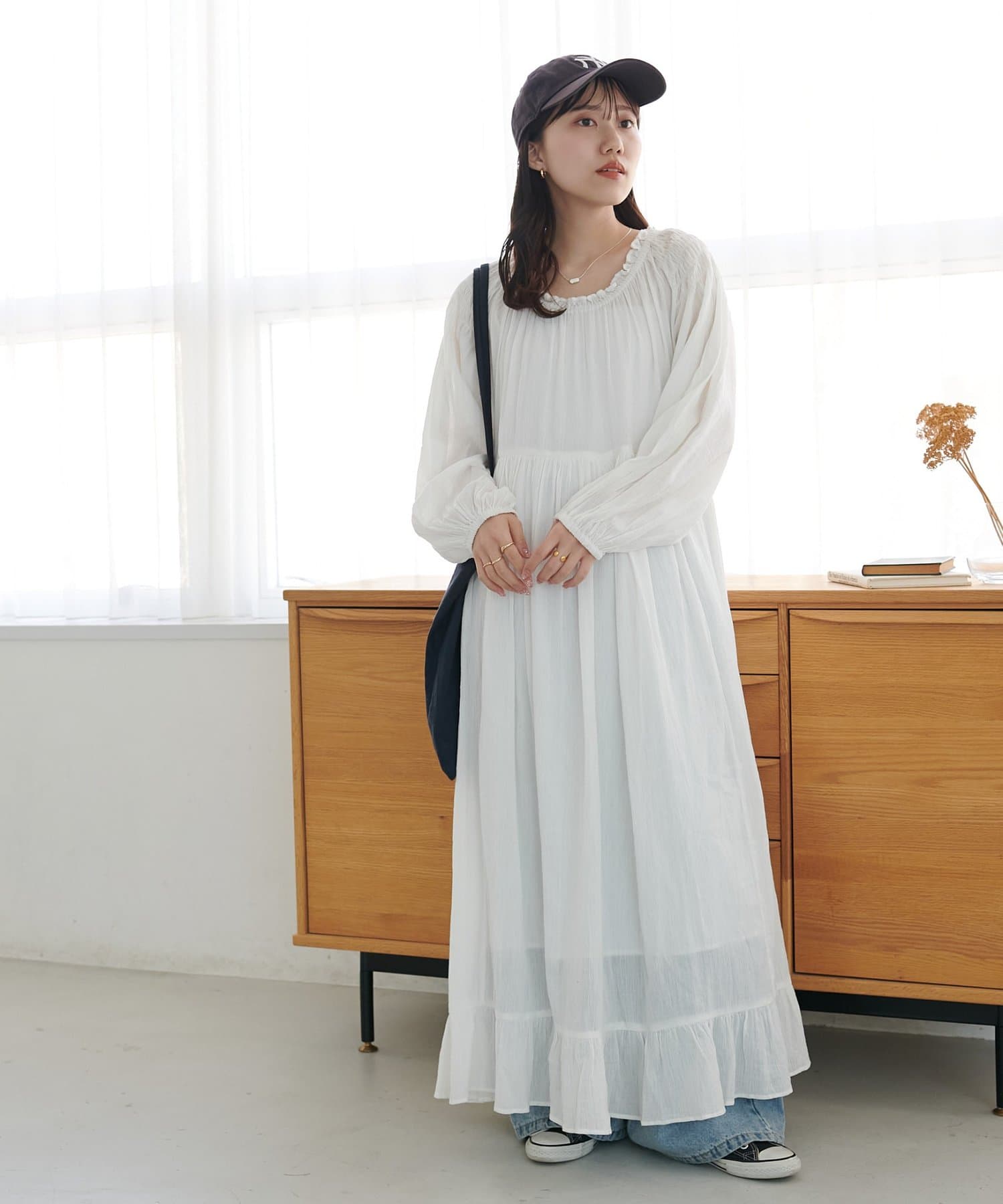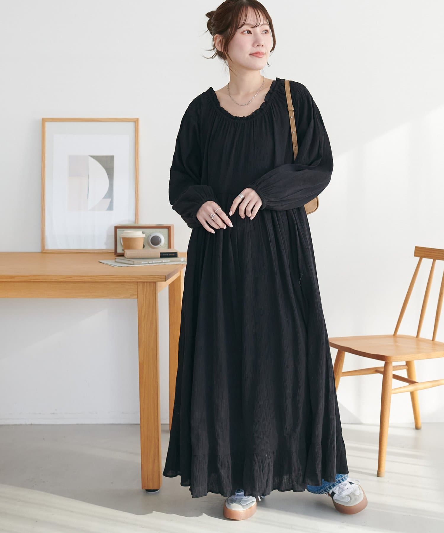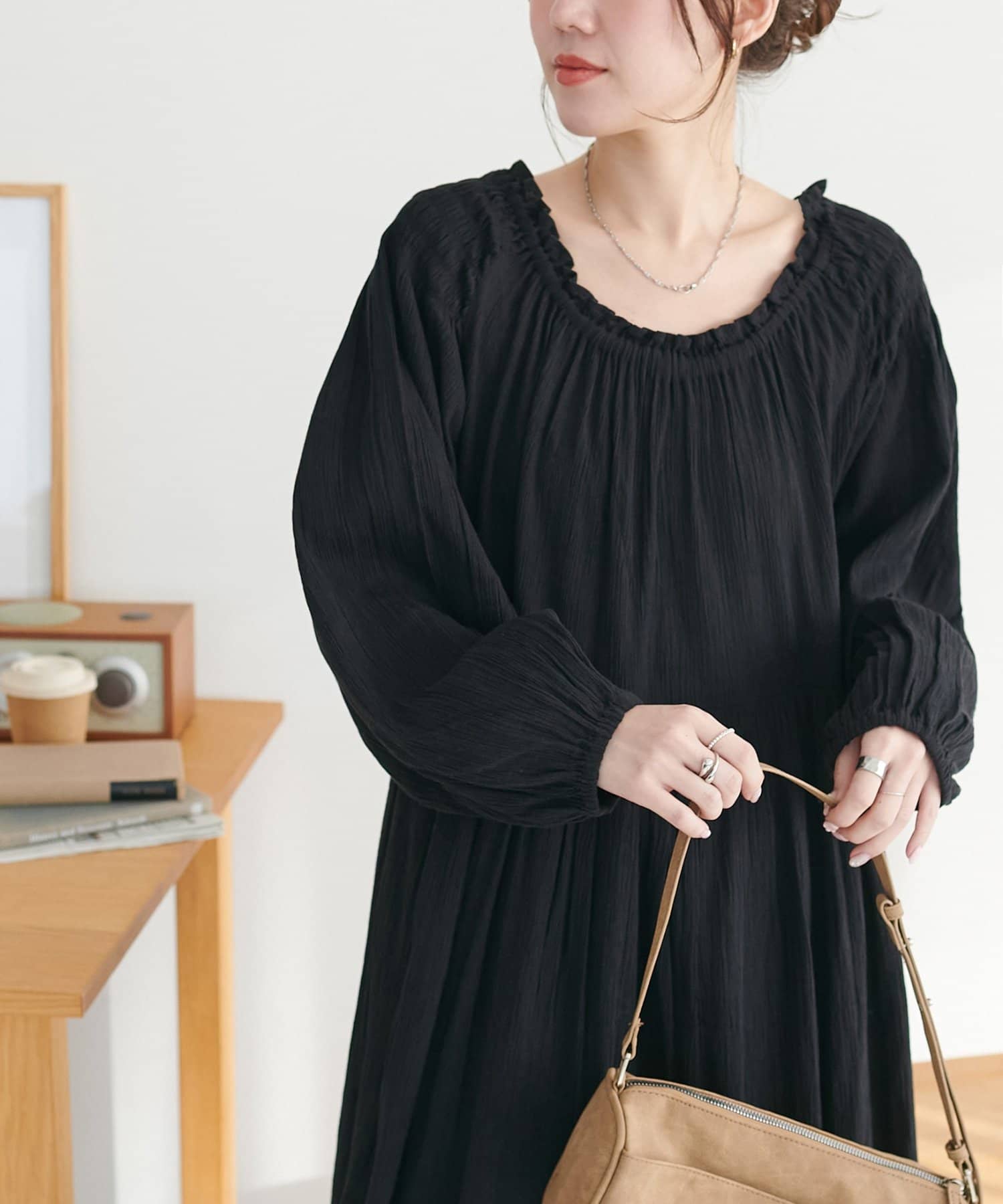 【Discoat】【India】コットンクレープ肩シャーリングワンピース