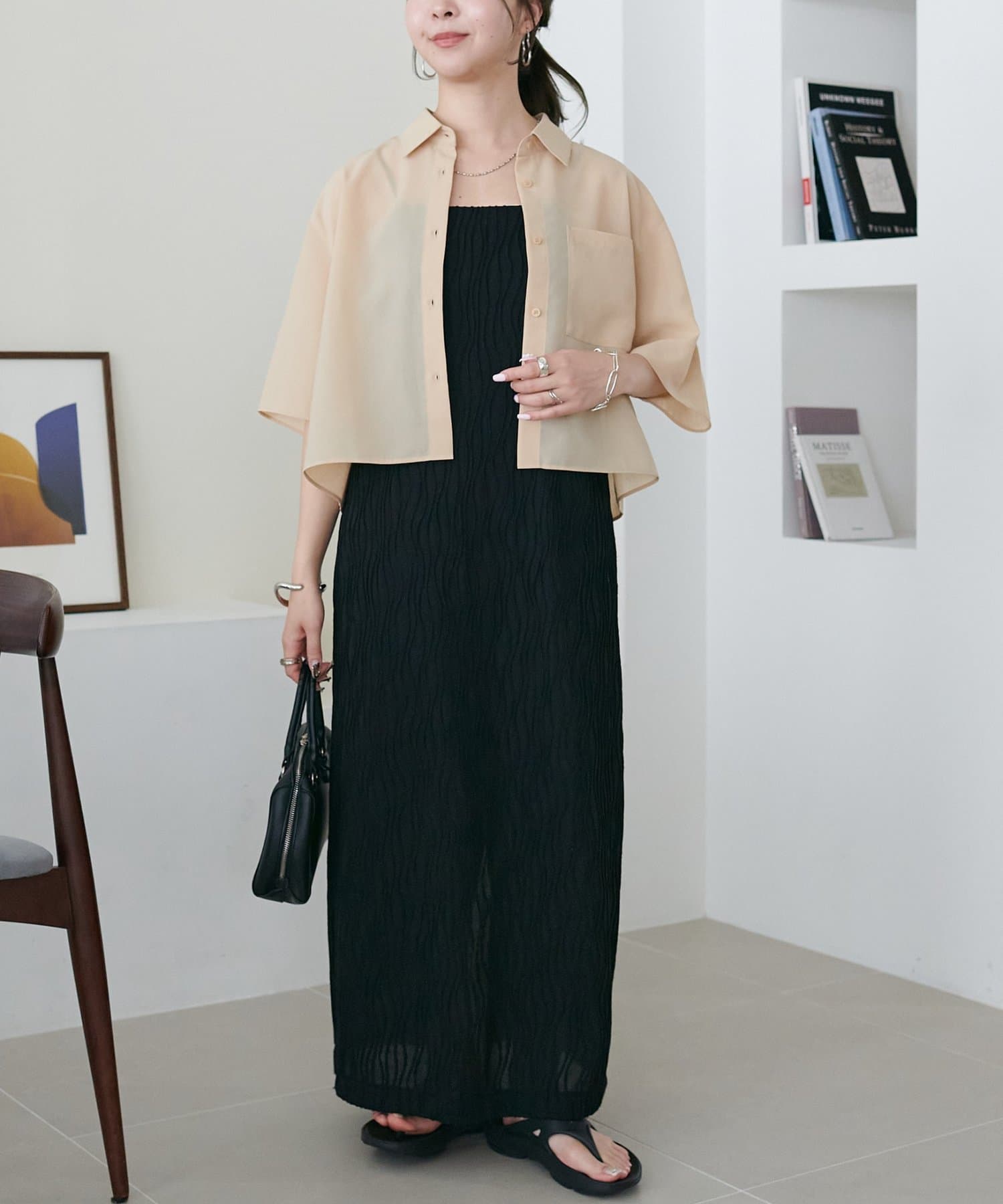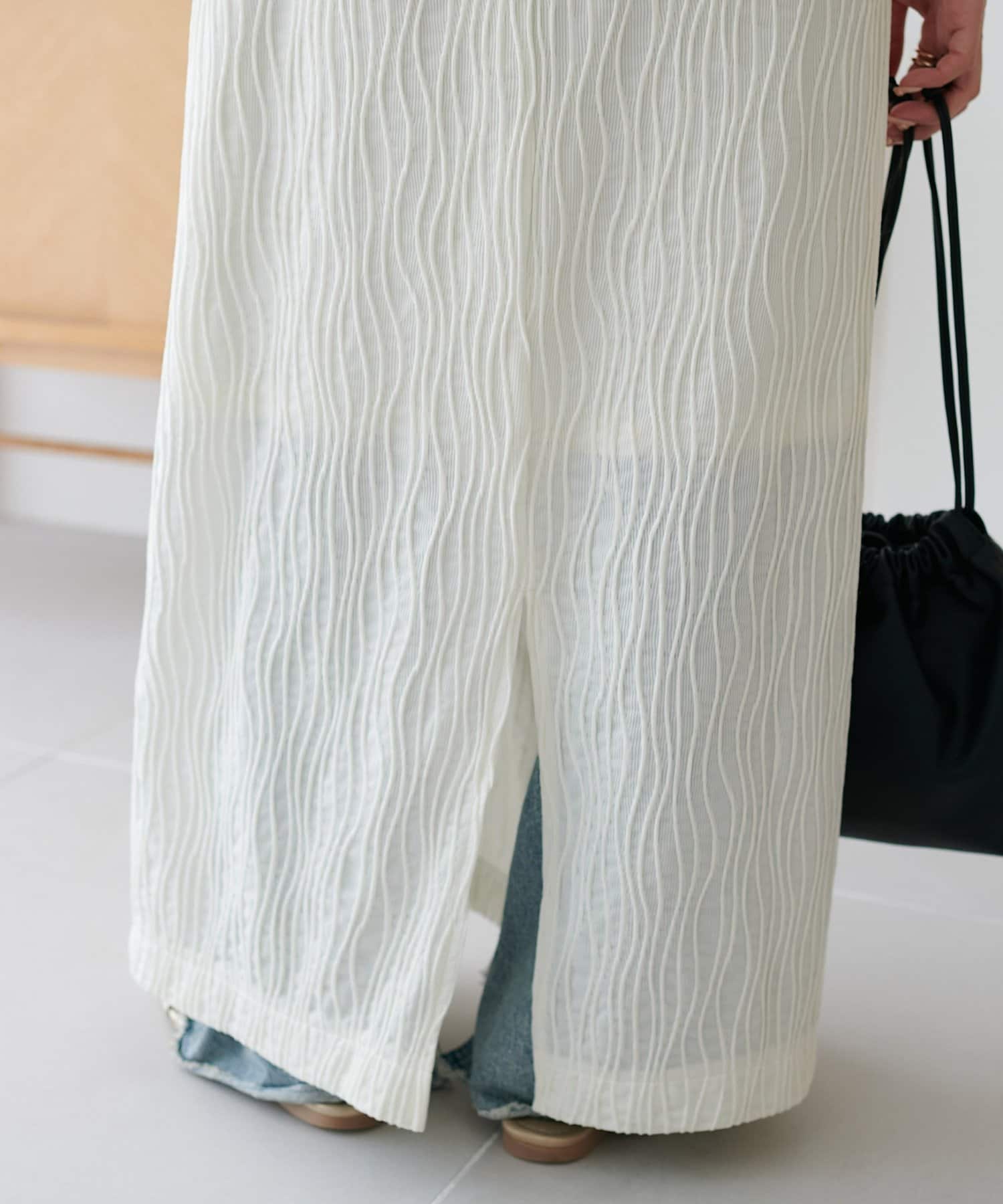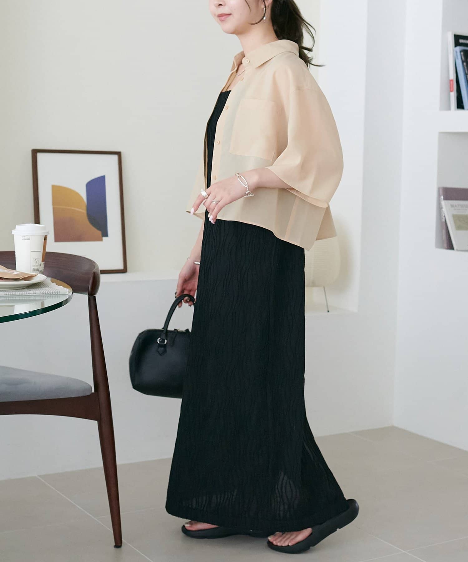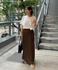 162㎝スタッフ:シンプルに一枚できるのはもちろんですが、丈を少し短くしてパンツを合わせた今年らしいレイヤードスタイルも楽しめます〇