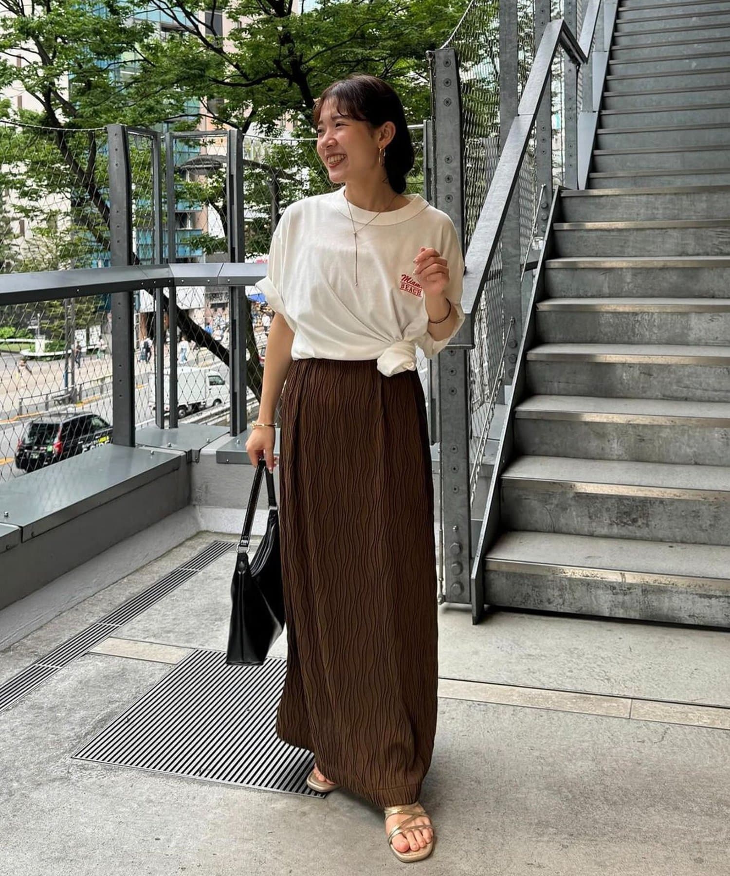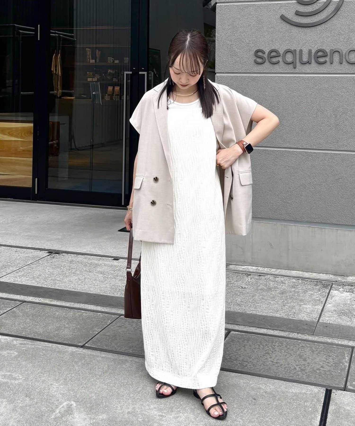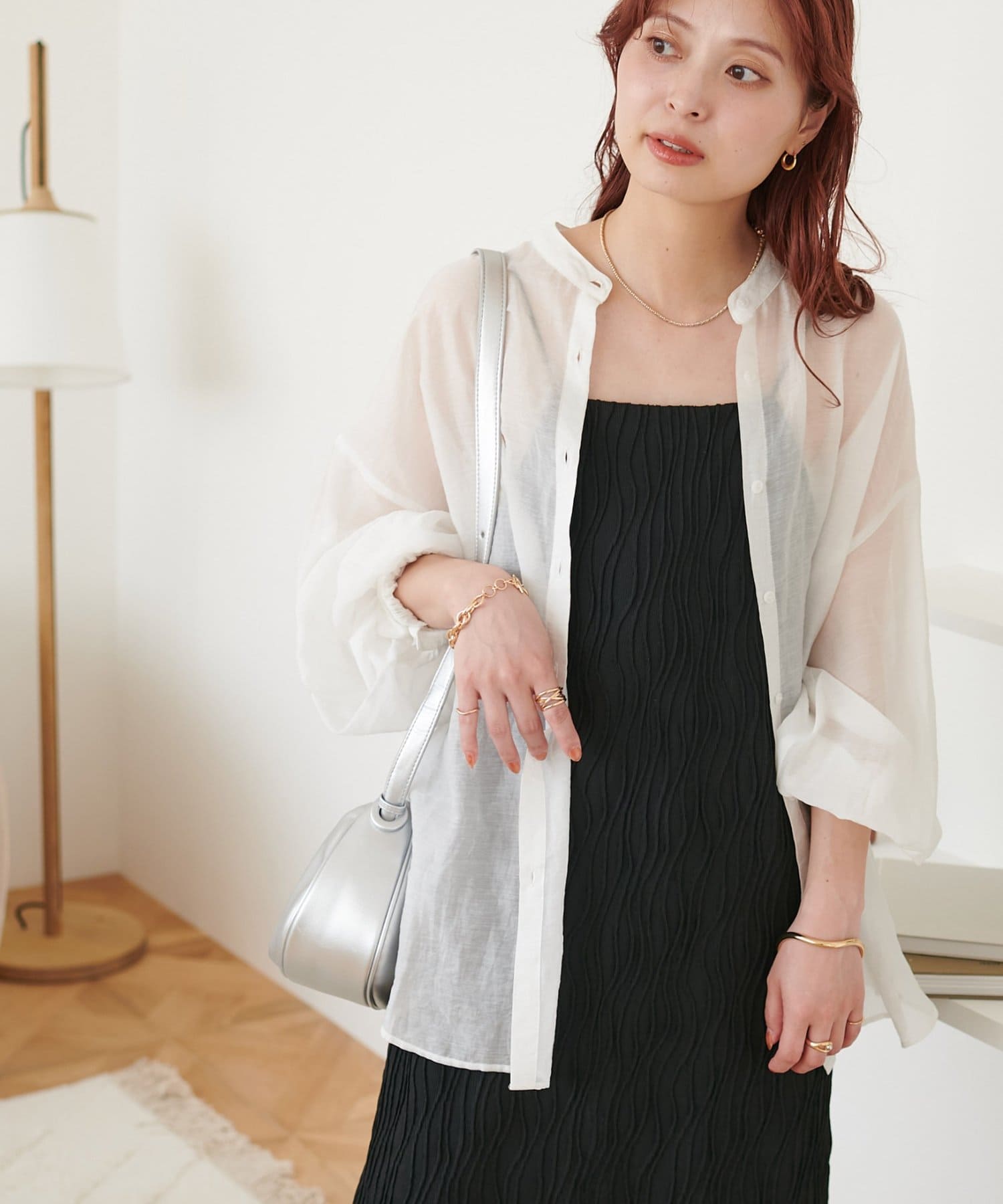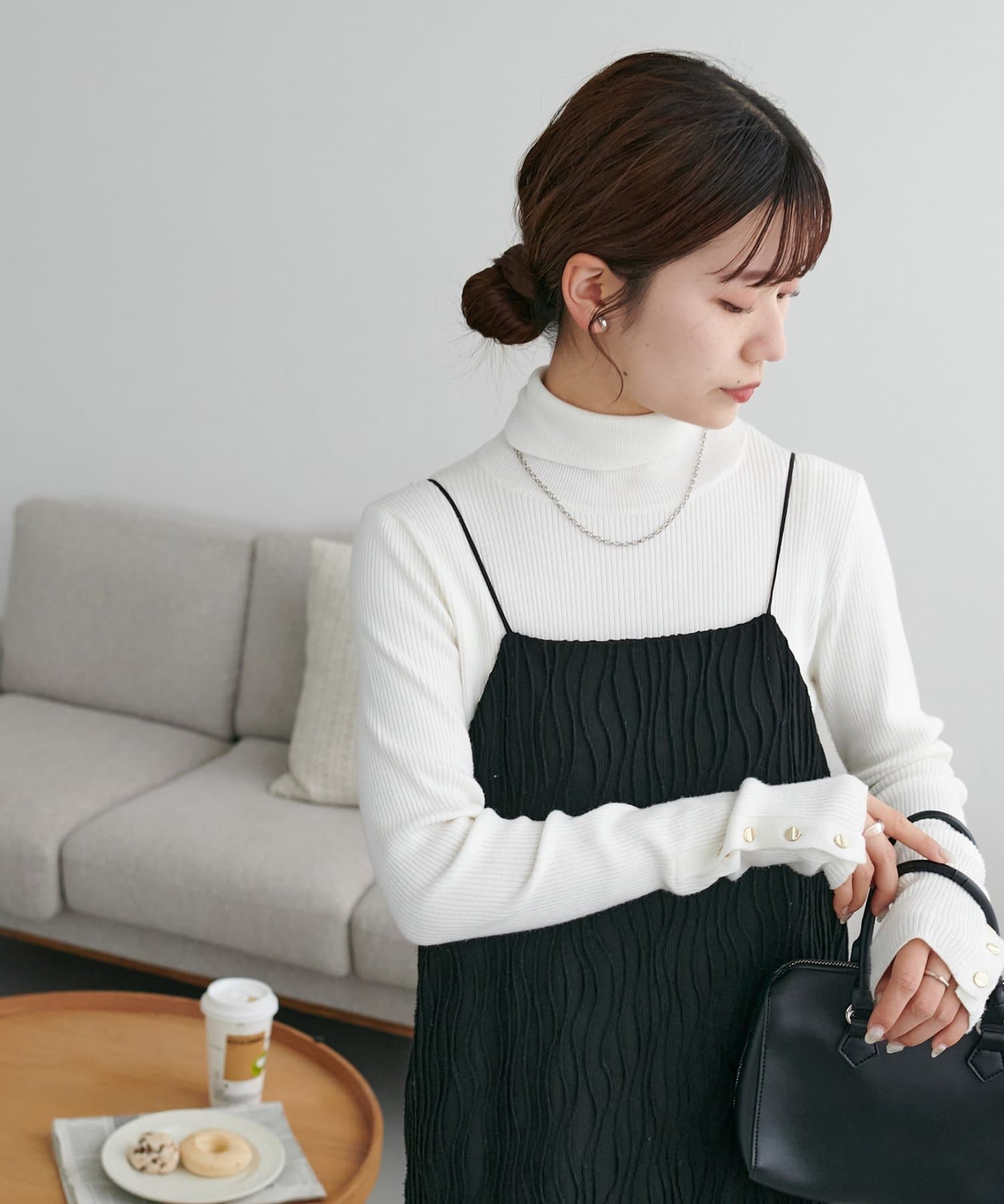 162㎝スタッフ:シンプルに一枚できるのはもちろんですが、丈を少し短くしてパンツを合わせた今年らしいレイヤードスタイルも楽しめます〇