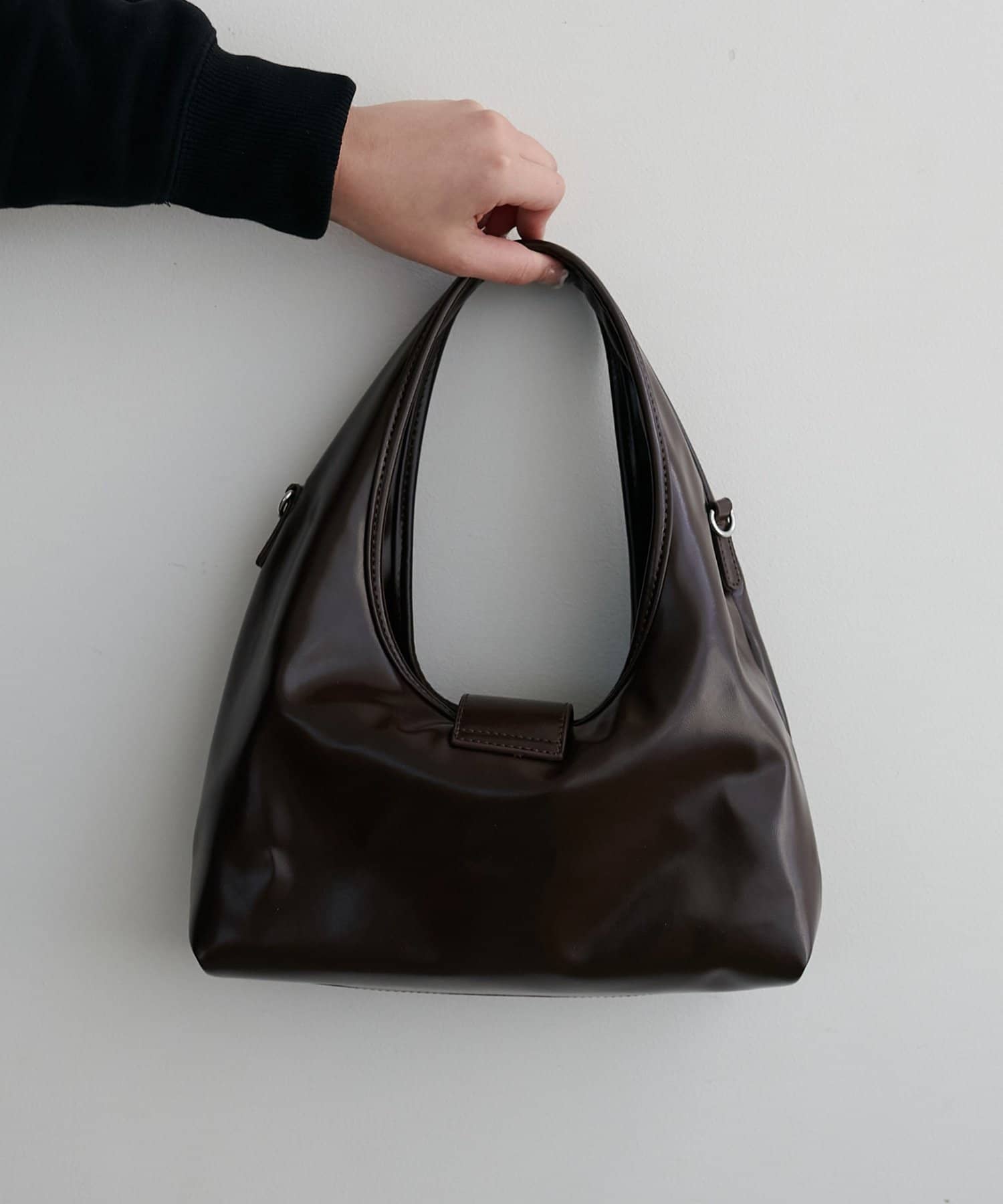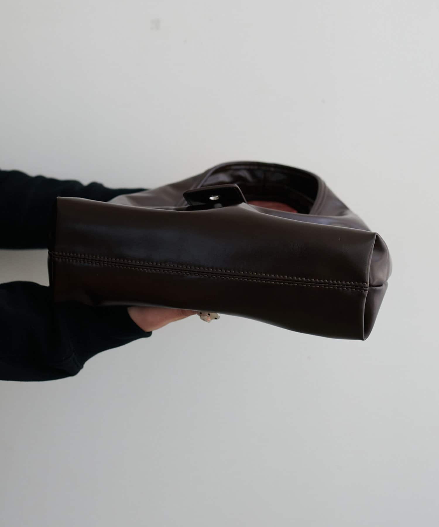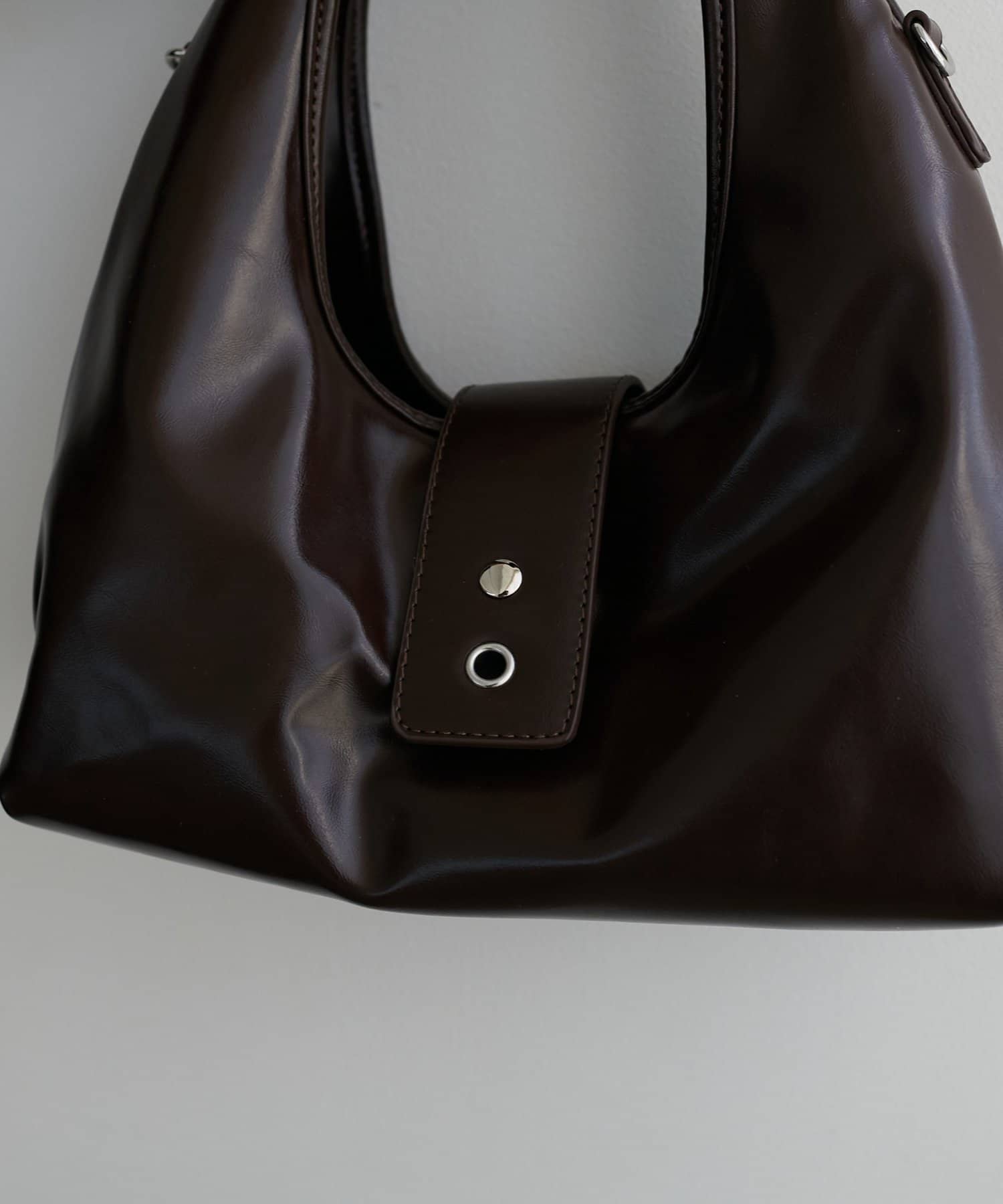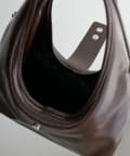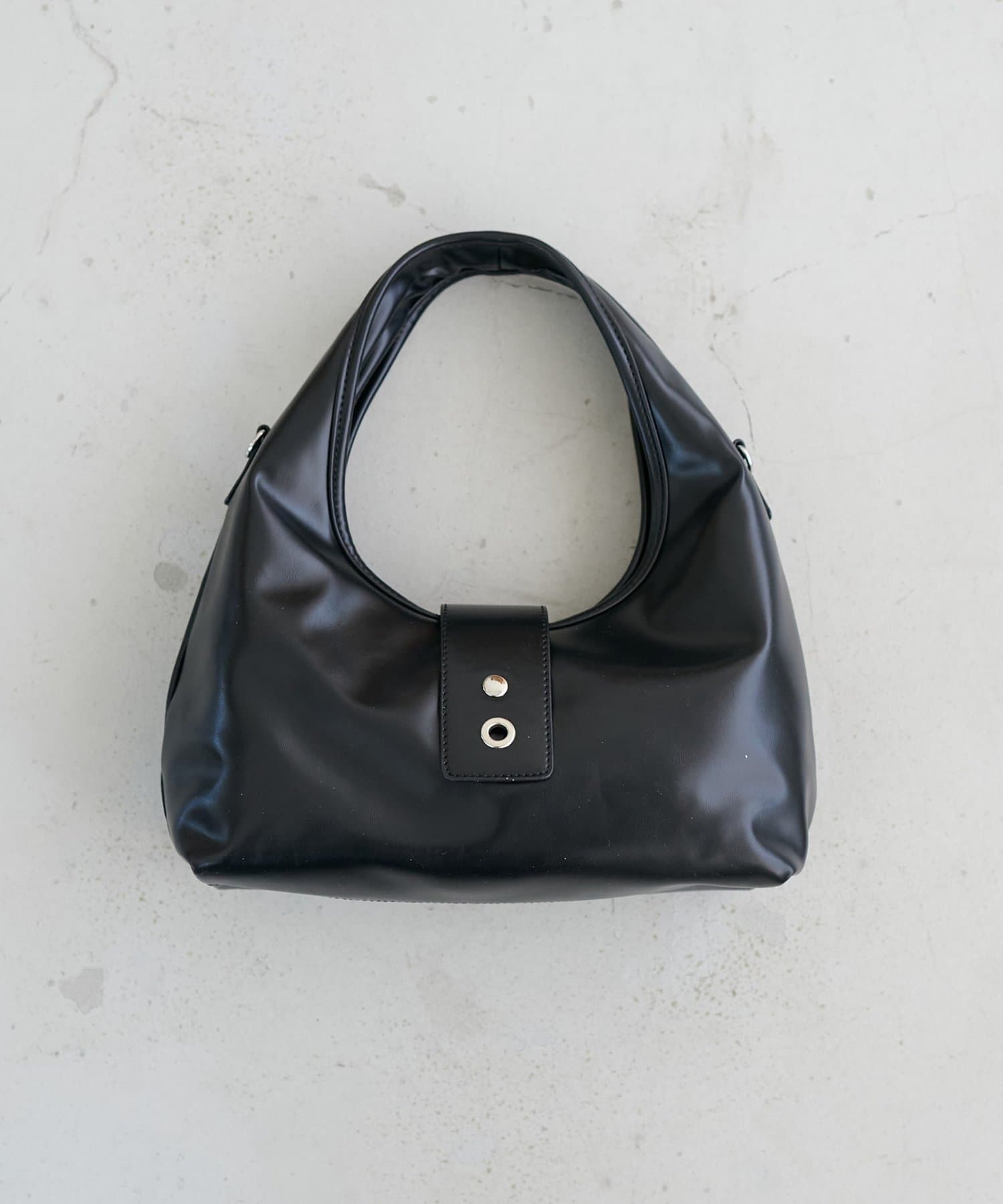 フロントのアイレットベルトがポイントになったバッグ。シンプルながらも存在感があり、持つだけでいつものスタイルをぐっとモダンな印象にアップデートしてくれます。コンパクトな見た目とは裏腹に、10cmのしっかりとしたマチがあるため収納力は抜群。ショルダー紐が付属で付いているので、肩掛けや斜め掛けとしてもお使いいただけます。
