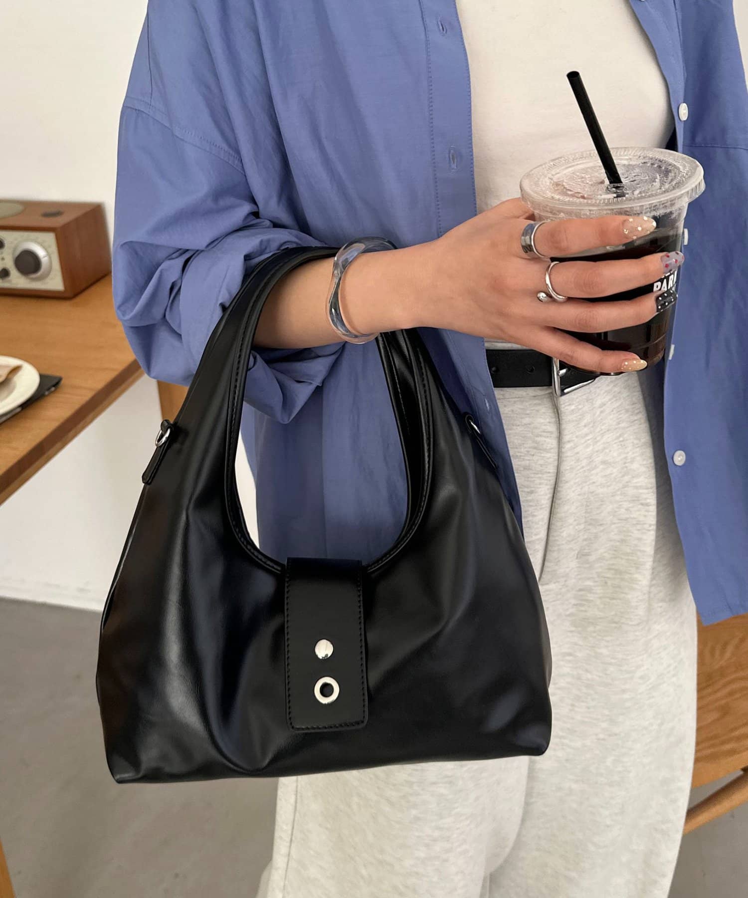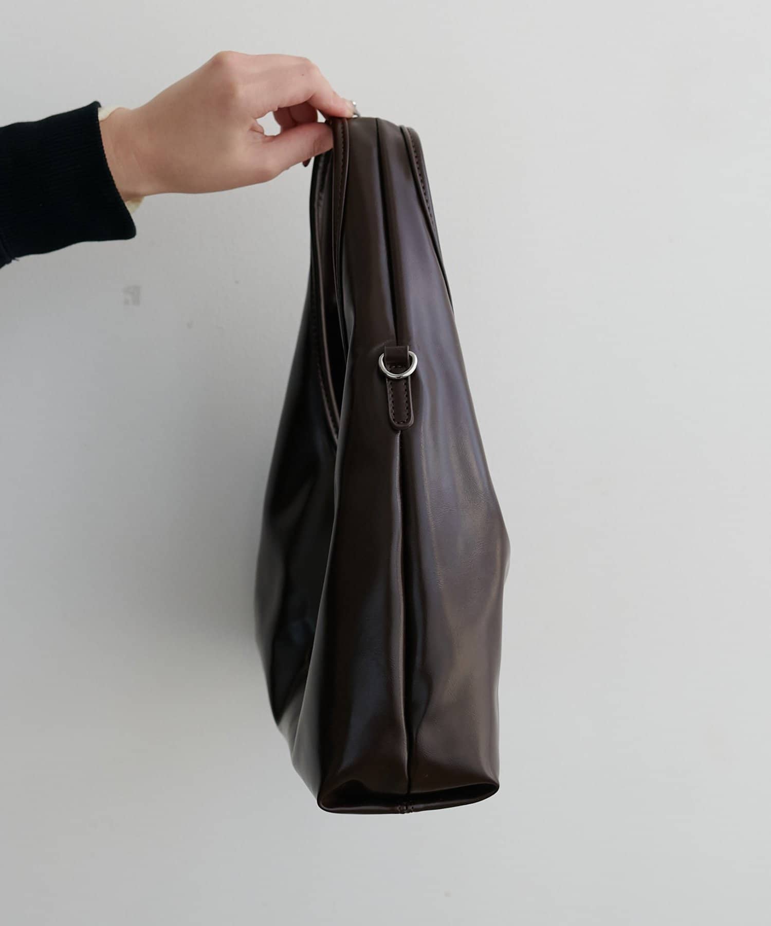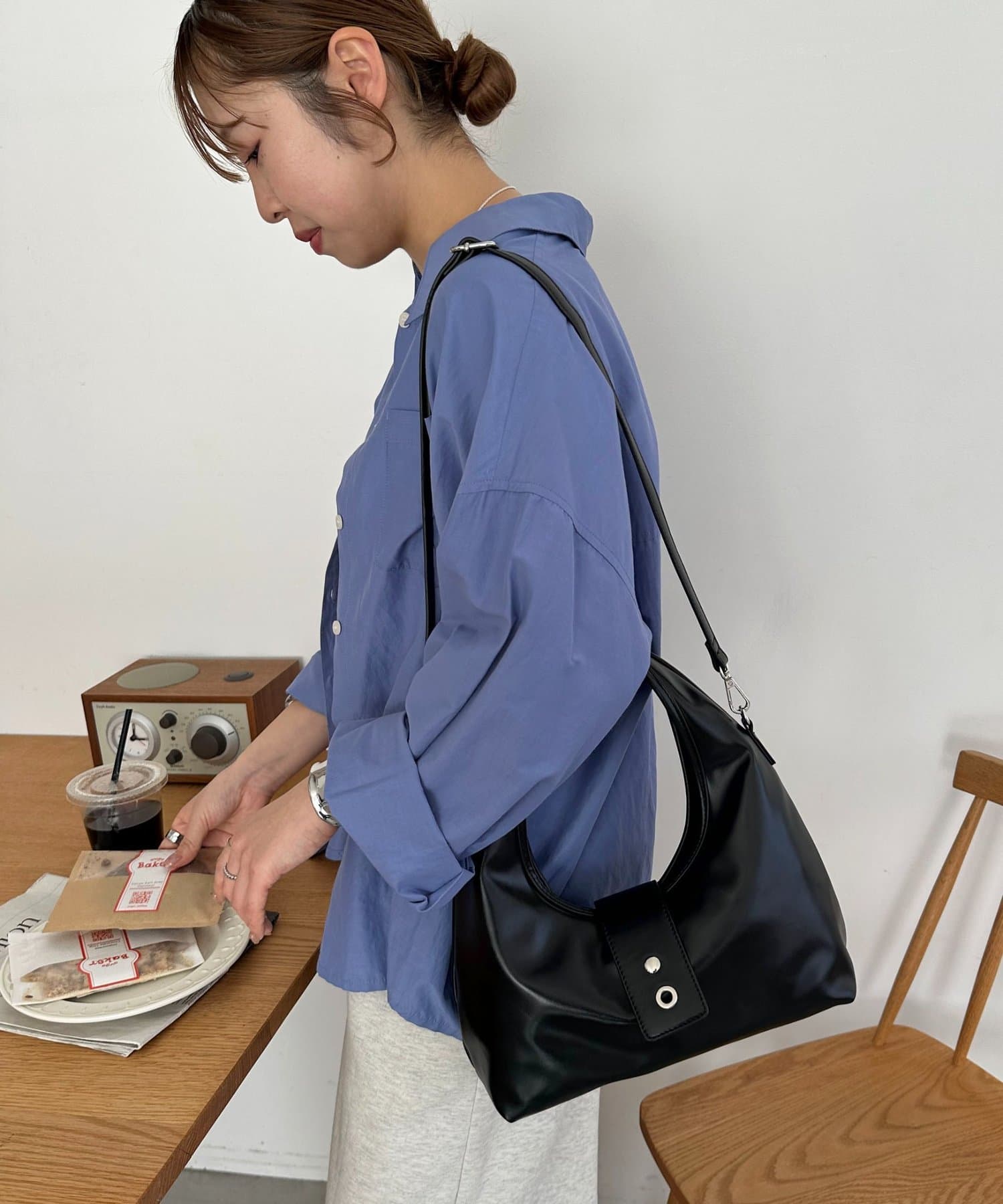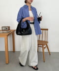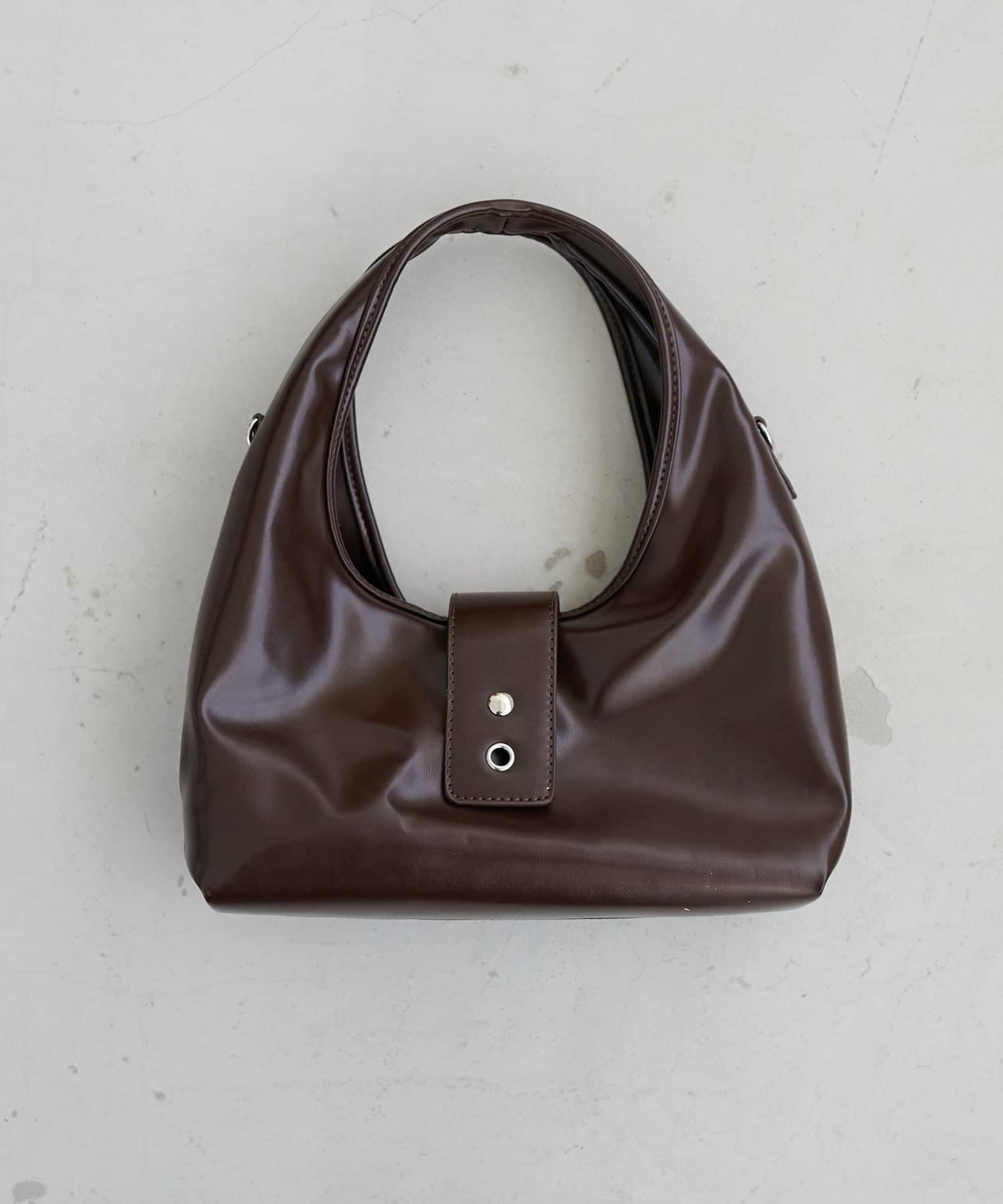 フロントのアイレットベルトがポイントになったバッグ。シンプルながらも存在感があり、持つだけでいつものスタイルをぐっとモダンな印象にアップデートしてくれます。コンパクトな見た目とは裏腹に、10cmのしっかりとしたマチがあるため収納力は抜群。ショルダー紐が付属で付いているので、肩掛けや斜め掛けとしてもお使いいただけます。