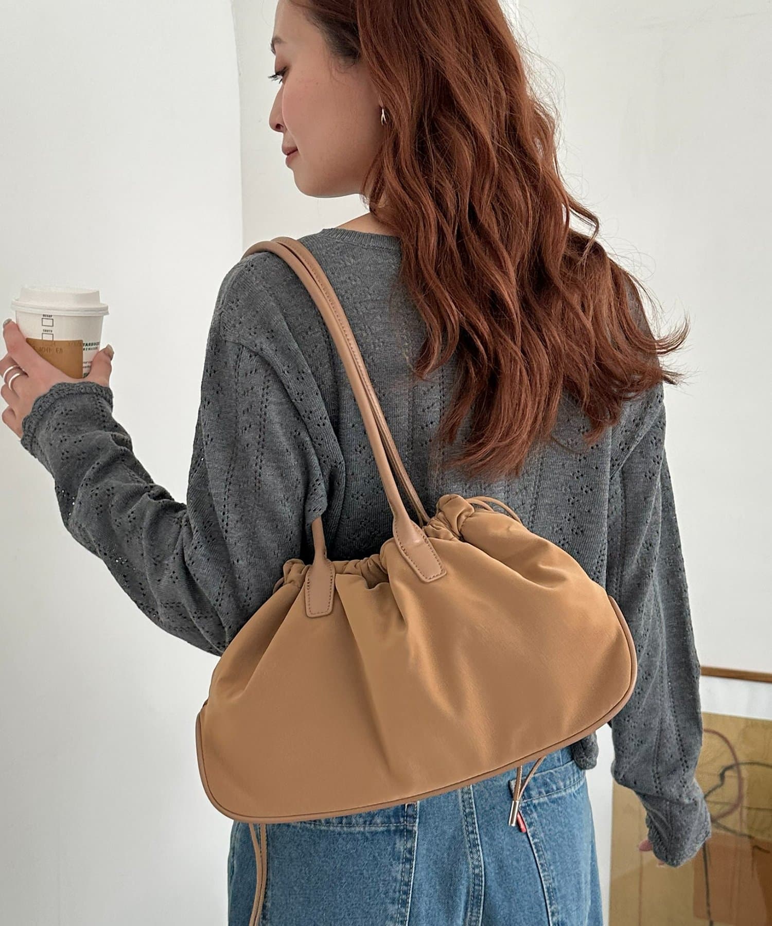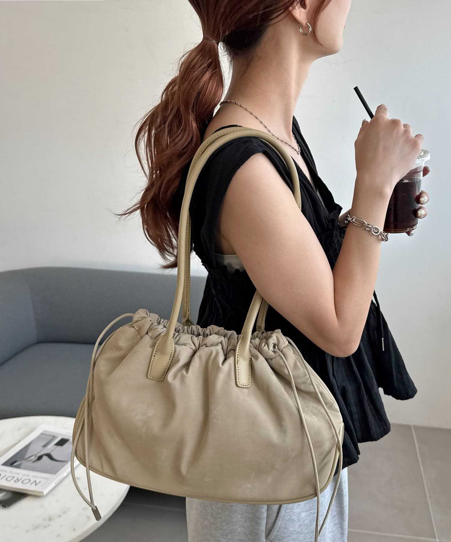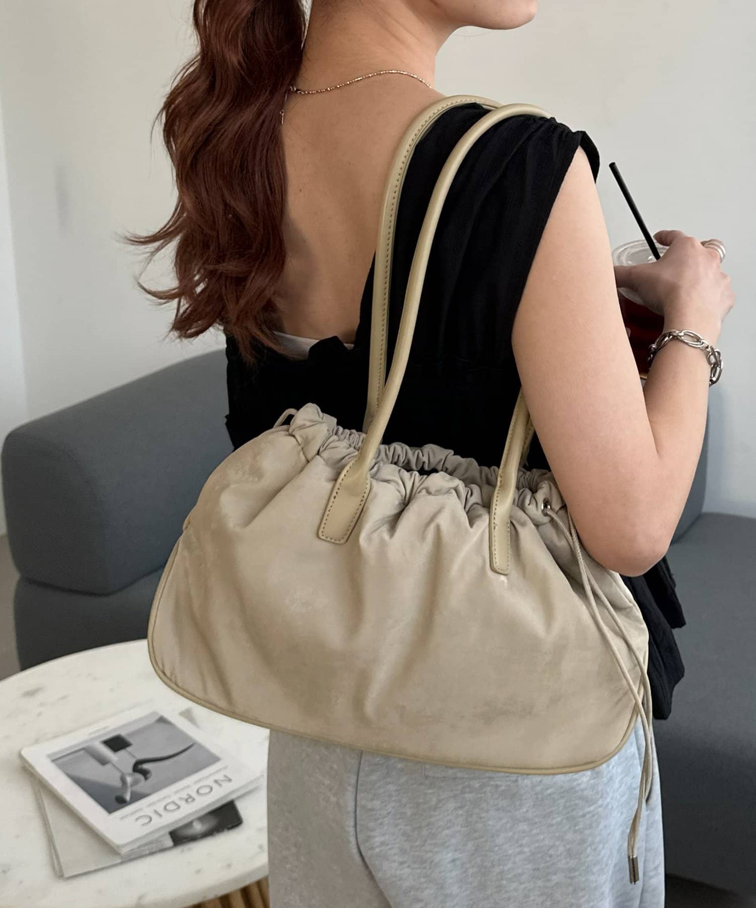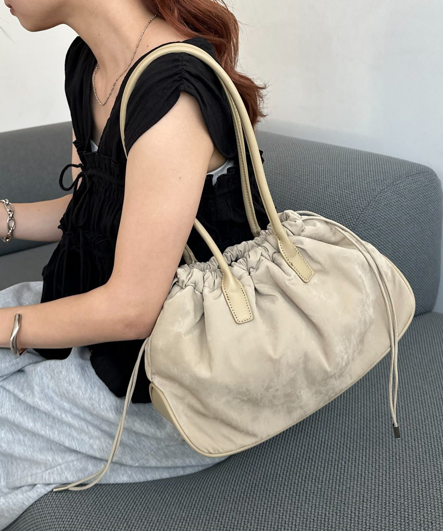 開口部にぐるりと通したドロストを絞ることで、自然に生まれる立体的なフォルムが特徴です。程よくボリュームのあるボストン型ながら、ヌバック調のマットな質感が落ち着いた印象を与え、大人っぽく持てるバランス感に仕上げています。12cmのしっかりとしたマチで長財布や手帳、ペットボトルもすっきり収まり、デイリー使いしやすいバッグです♪