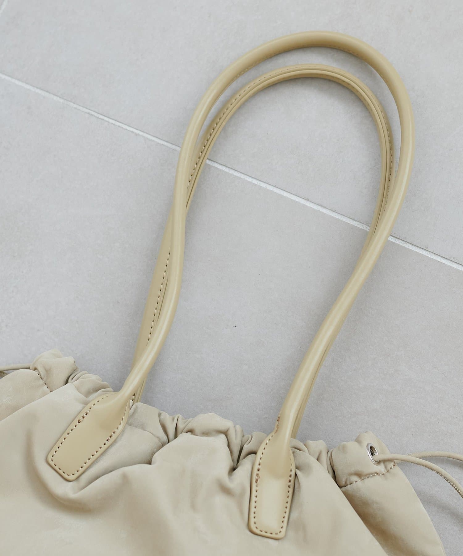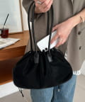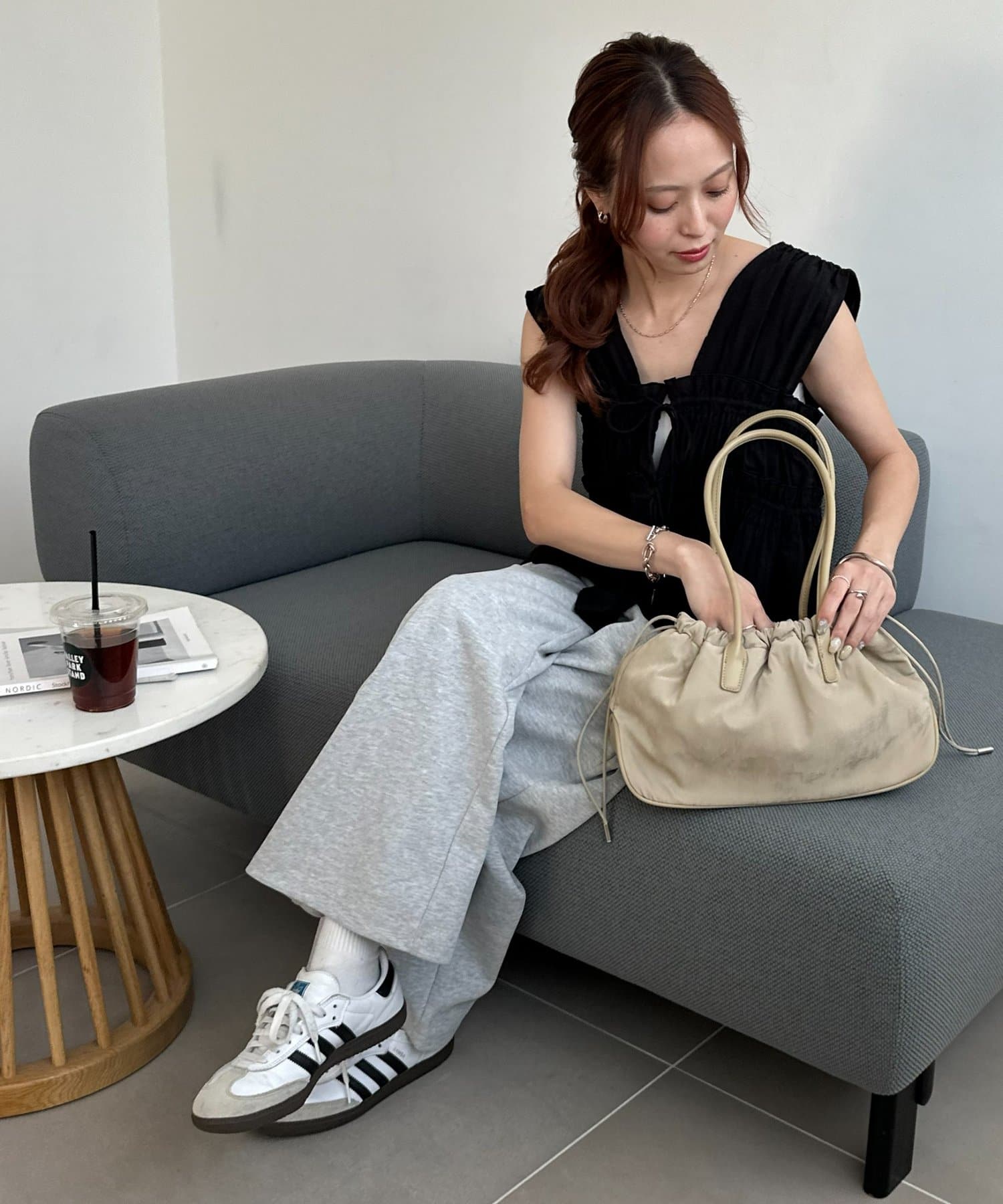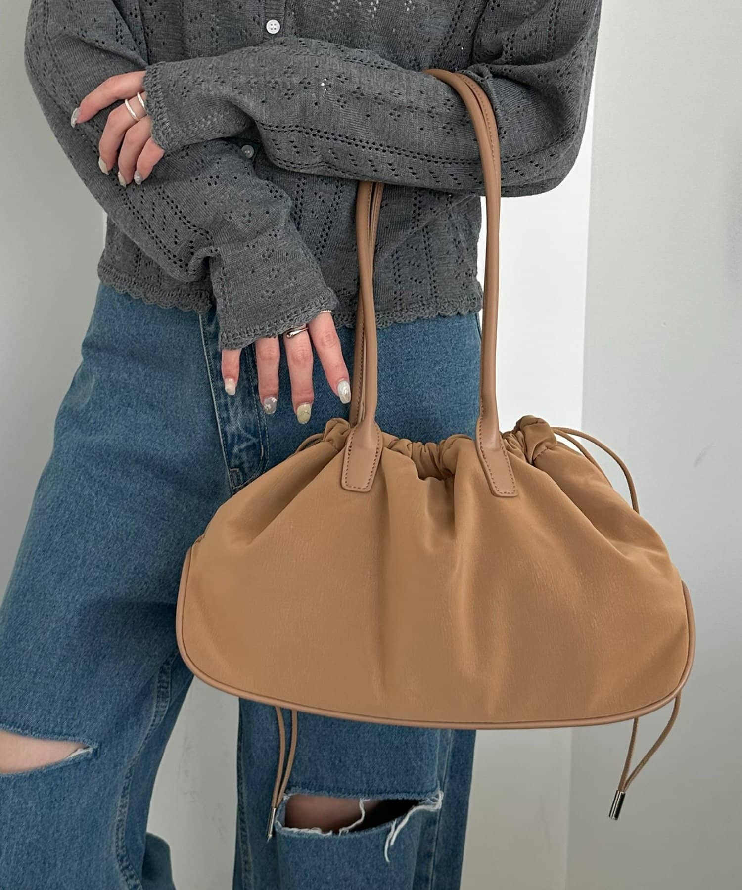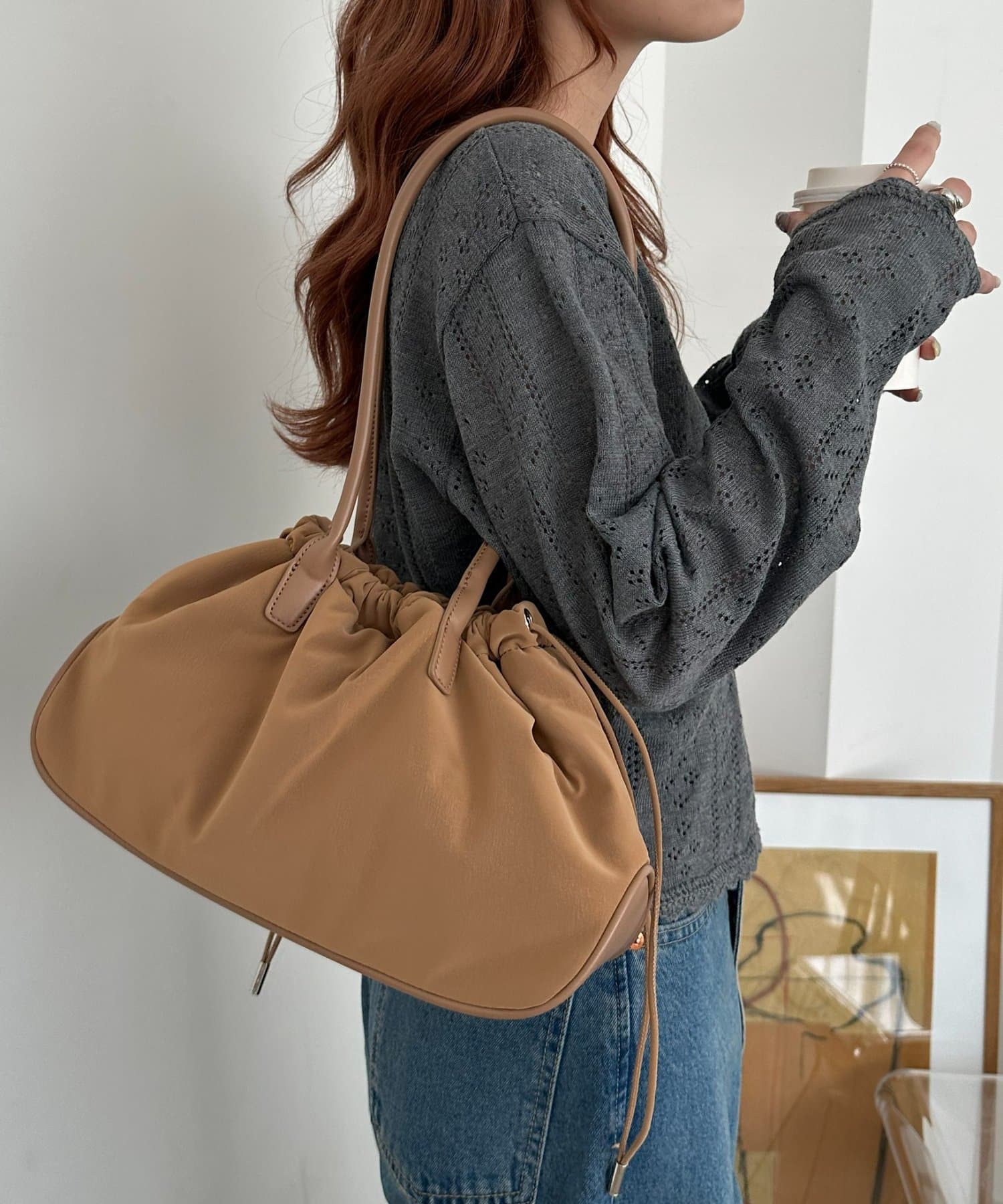 開口部にぐるりと通したドロストを絞ることで、自然に生まれる立体的なフォルムが特徴です。程よくボリュームのあるボストン型ながら、ヌバック調のマットな質感が落ち着いた印象を与え、大人っぽく持てるバランス感に仕上げています。12cmのしっかりとしたマチで長財布や手帳、ペットボトルもすっきり収まり、デイリー使いしやすいバッグです♪