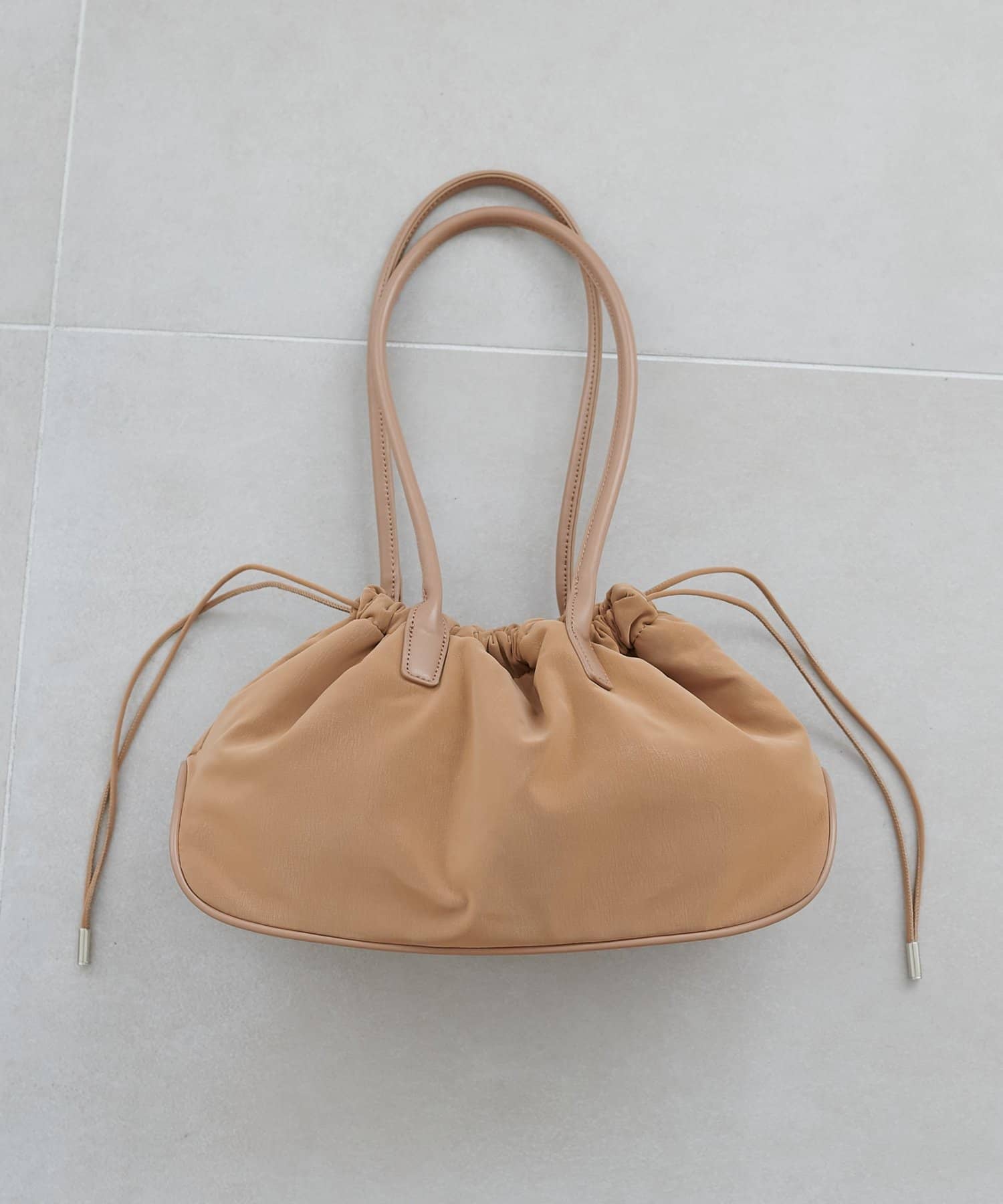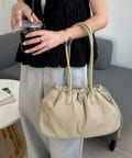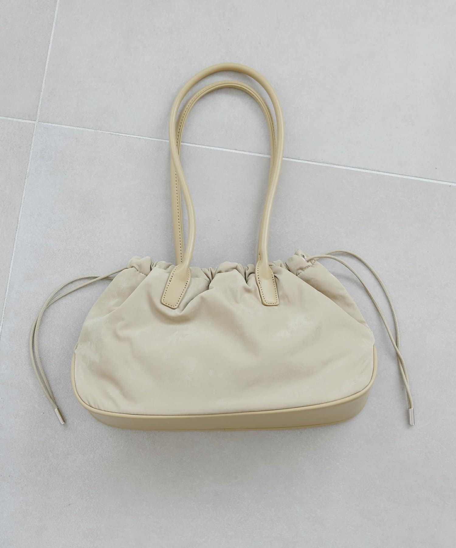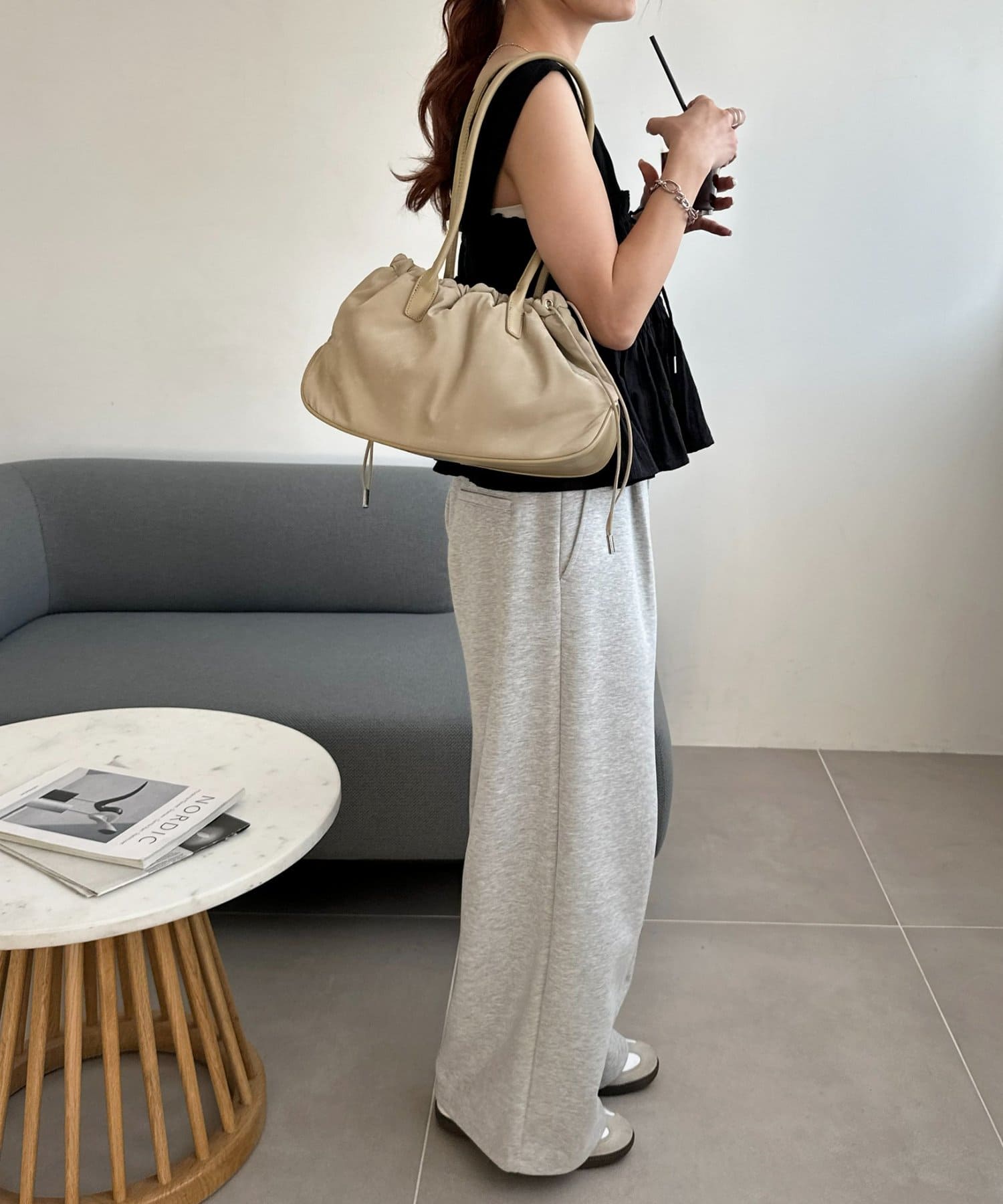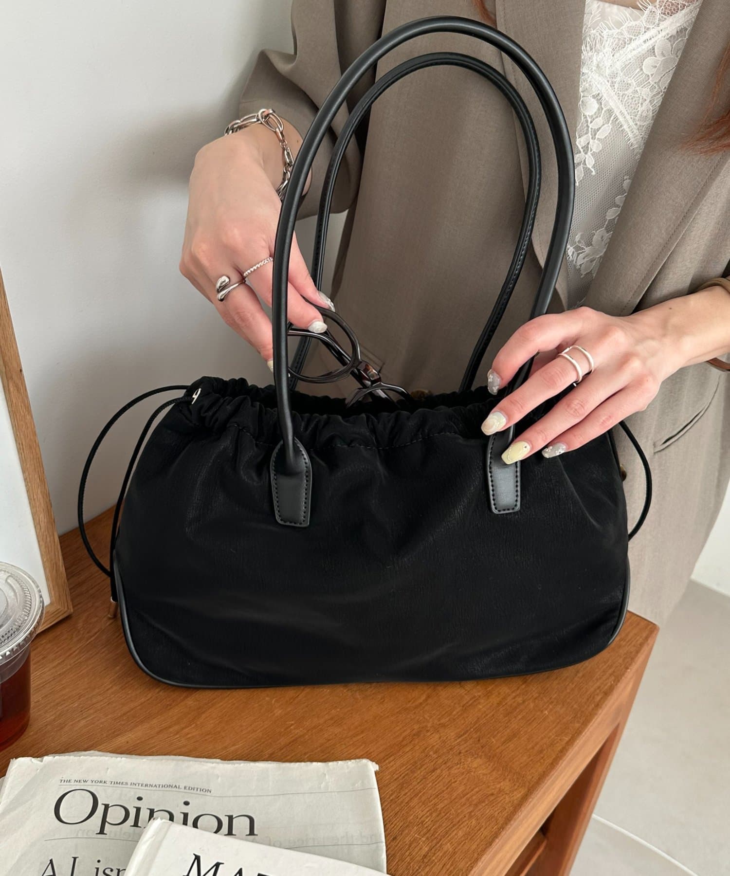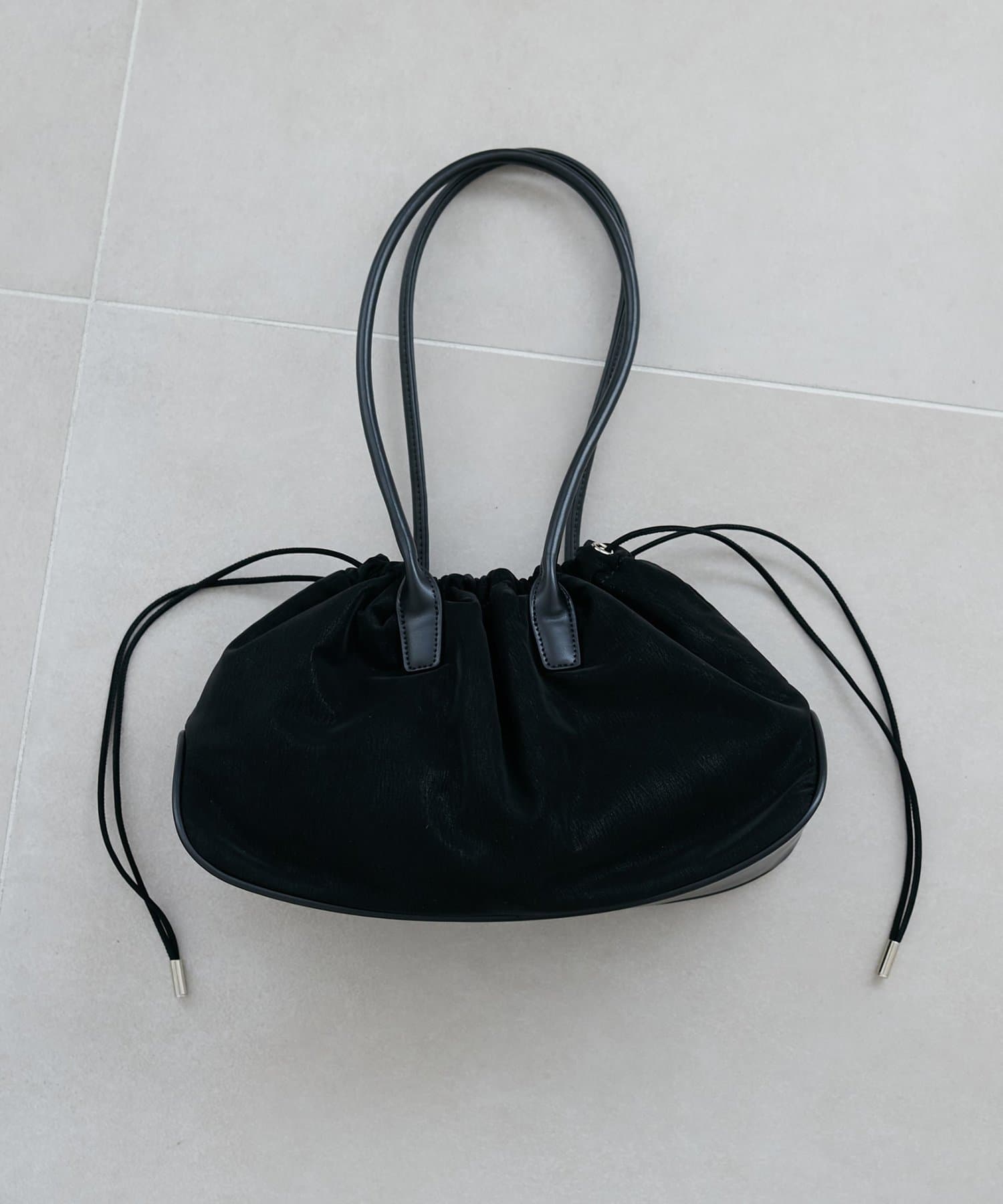 開口部にぐるりと通したドロストを絞ることで、自然に生まれる立体的なフォルムが特徴です。程よくボリュームのあるボストン型ながら、ヌバック調のマットな質感が落ち着いた印象を与え、大人っぽく持てるバランス感に仕上げています。12cmのしっかりとしたマチで長財布や手帳、ペットボトルもすっきり収まり、デイリー使いしやすいバッグです♪