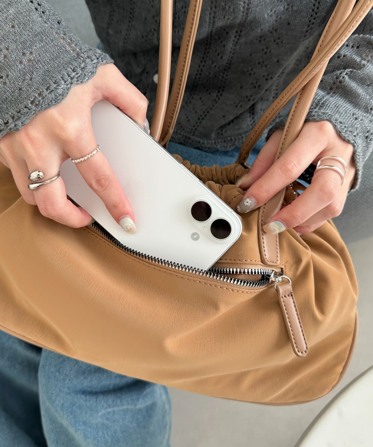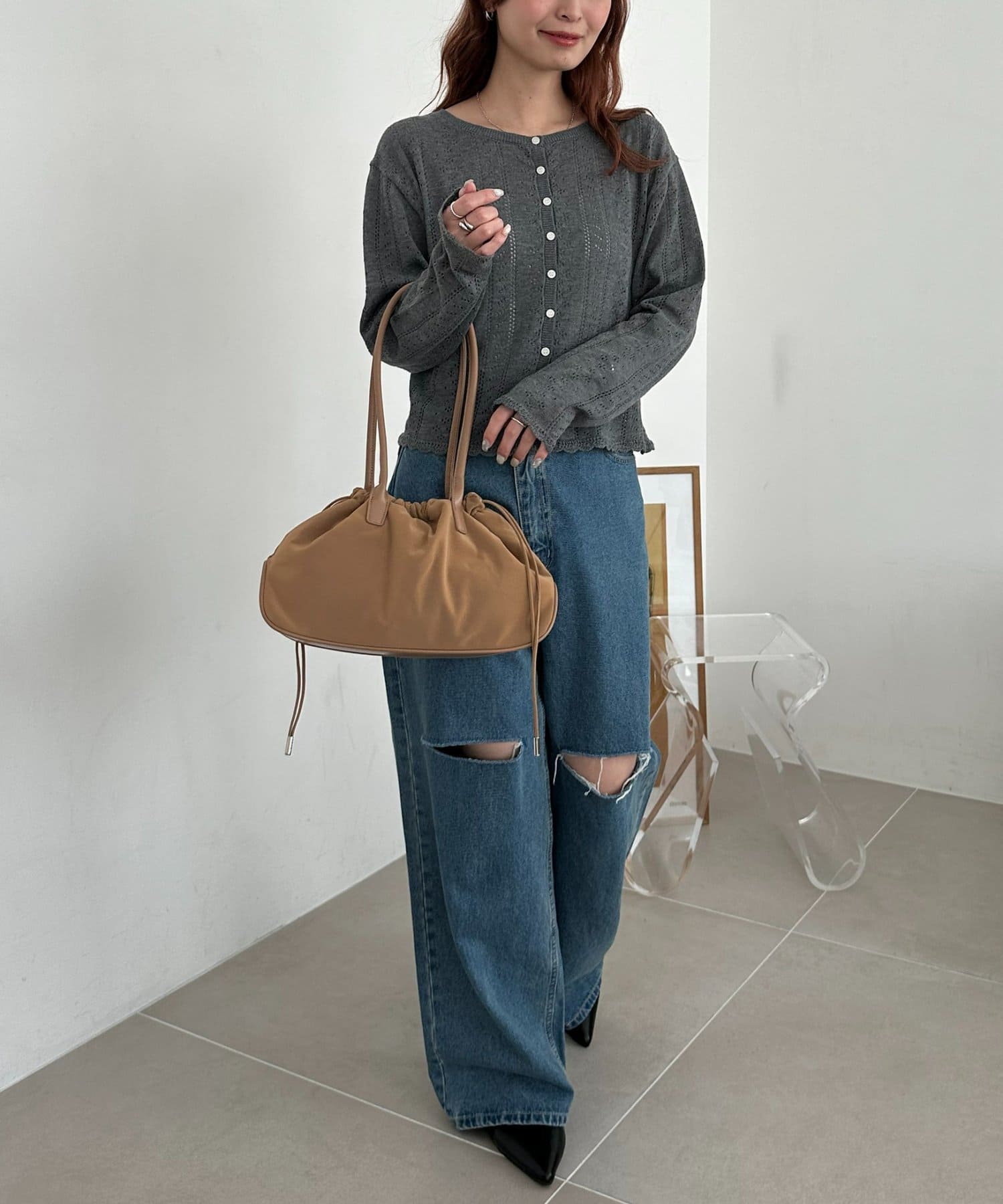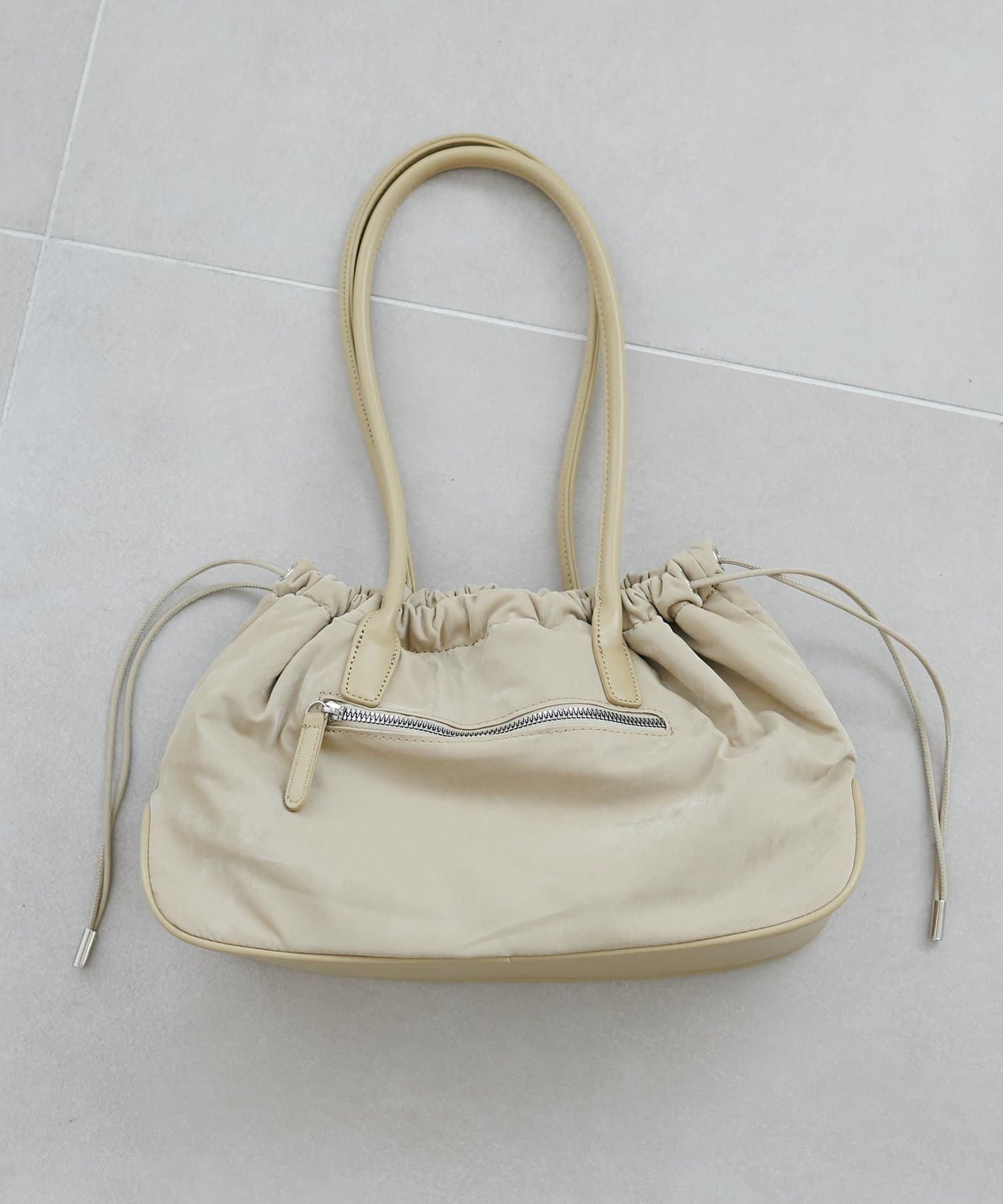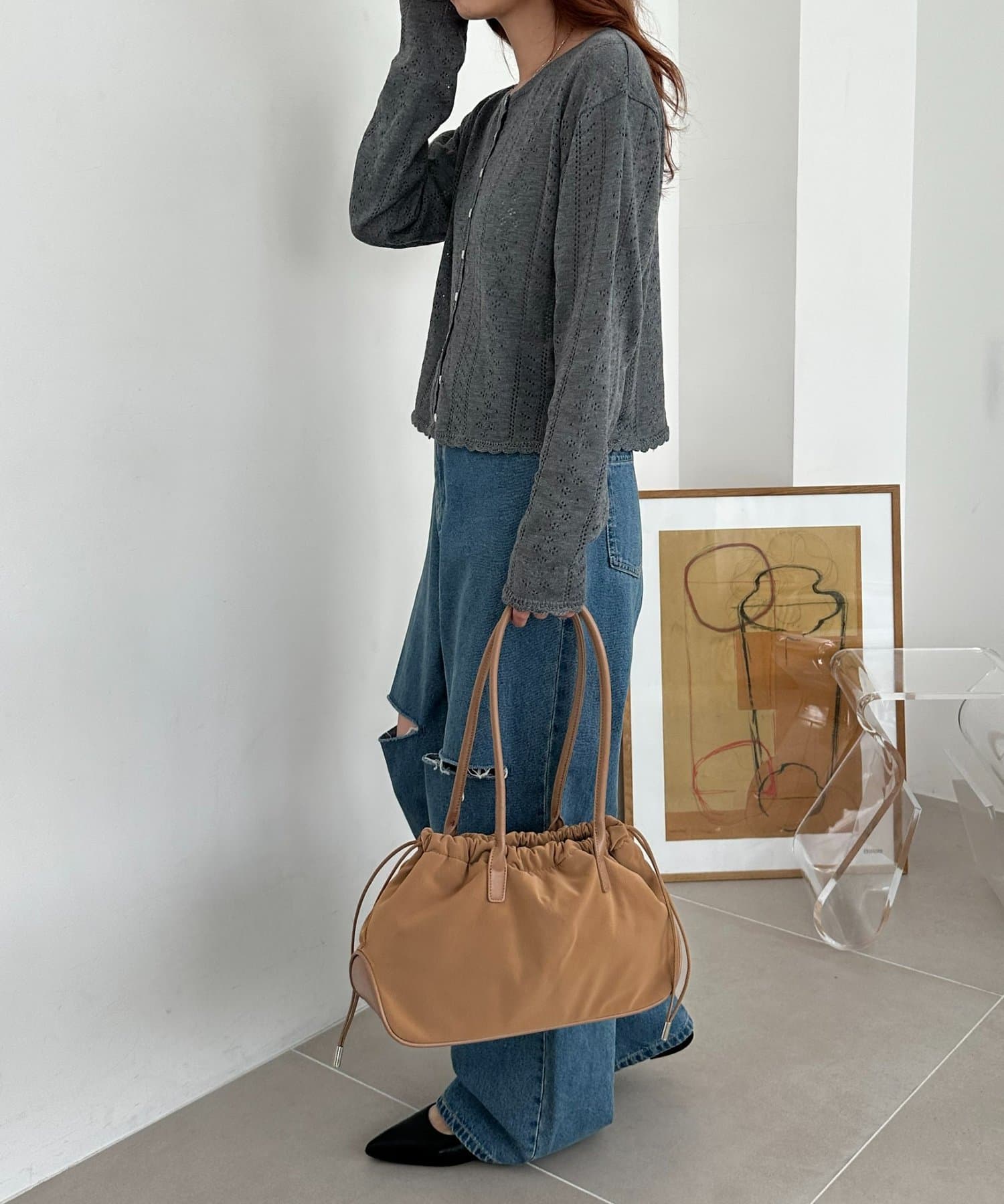 開口部にぐるりと通したドロストを絞ることで、自然に生まれる立体的なフォルムが特徴です。程よくボリュームのあるボストン型ながら、ヌバック調のマットな質感が落ち着いた印象を与え、大人っぽく持てるバランス感に仕上げています。12cmのしっかりとしたマチで長財布や手帳、ペットボトルもすっきり収まり、デイリー使いしやすいバッグです♪