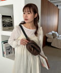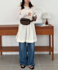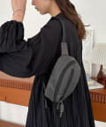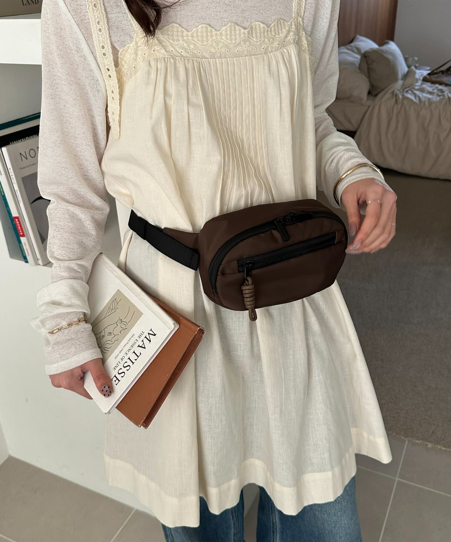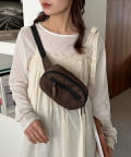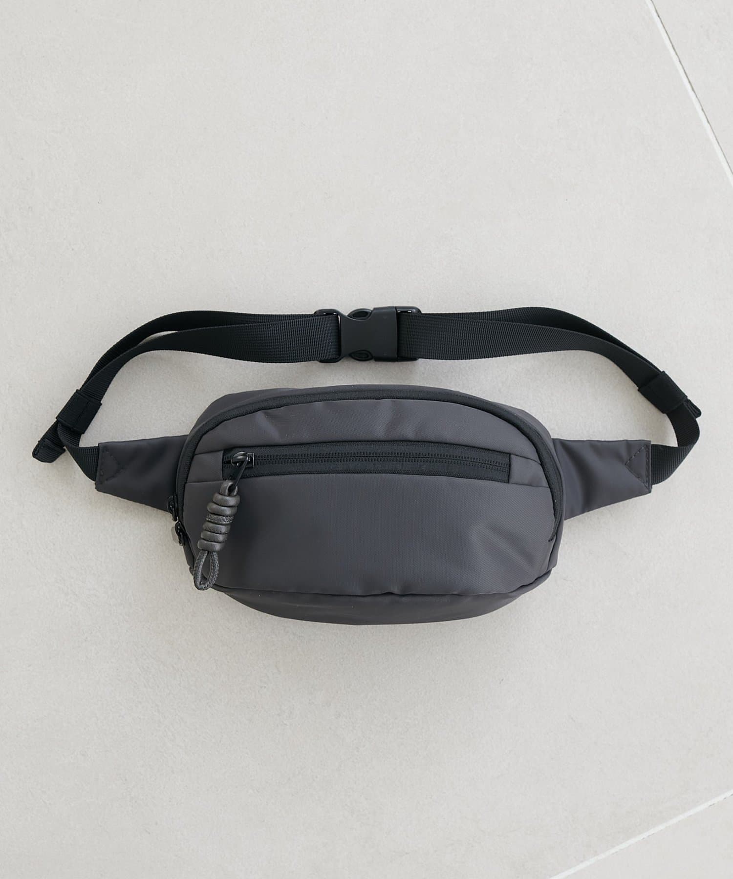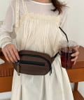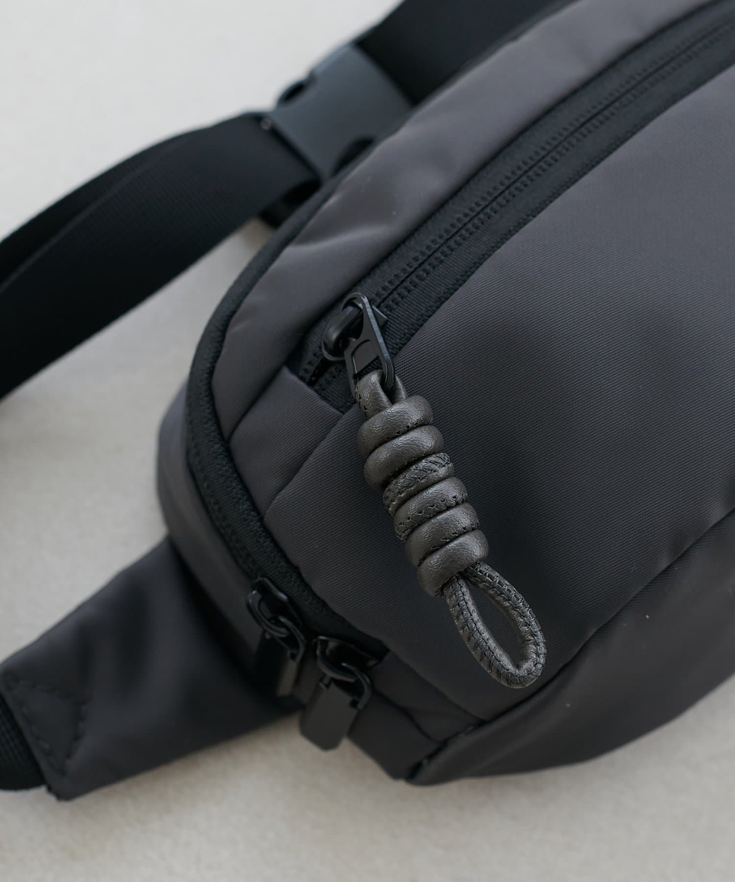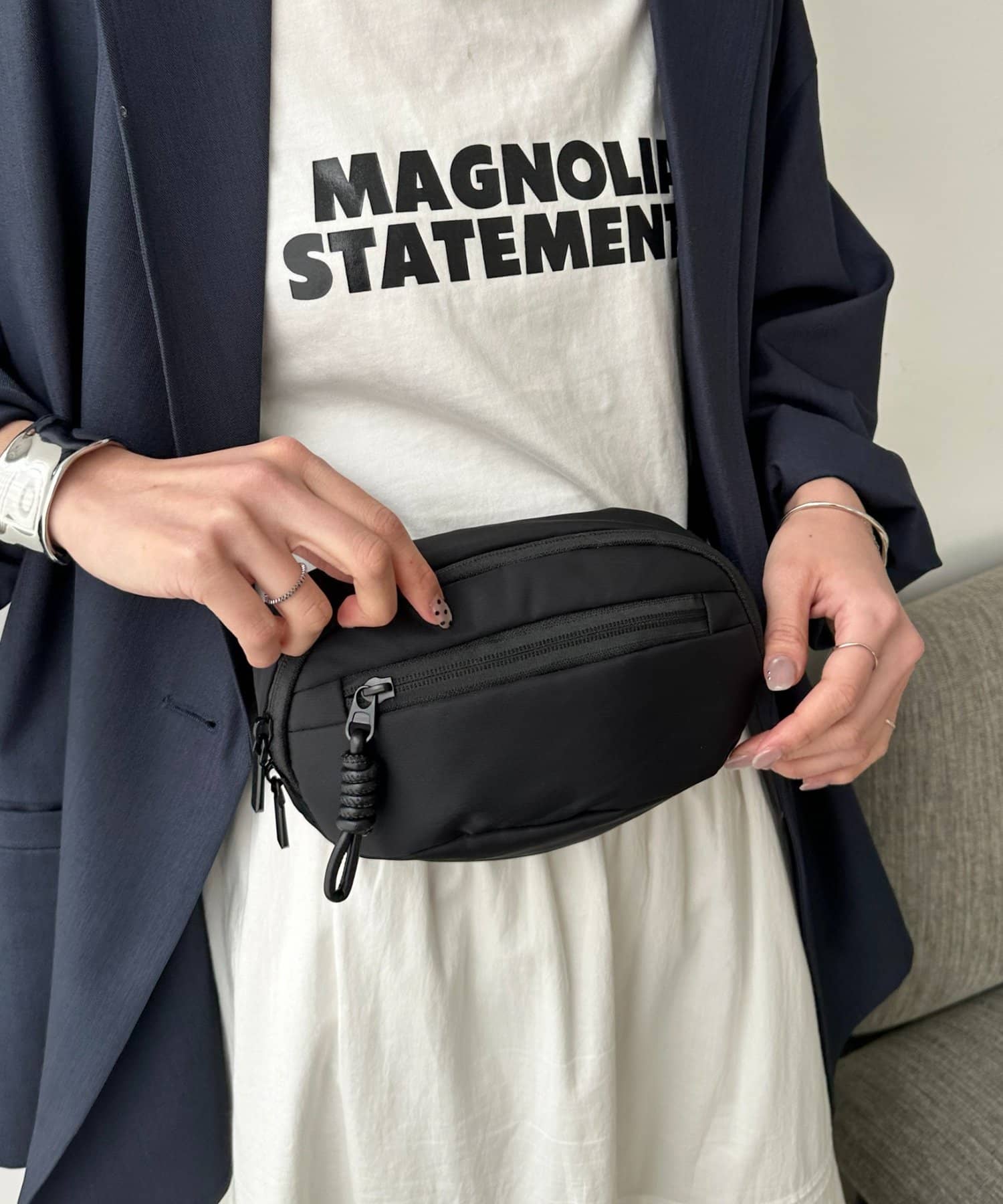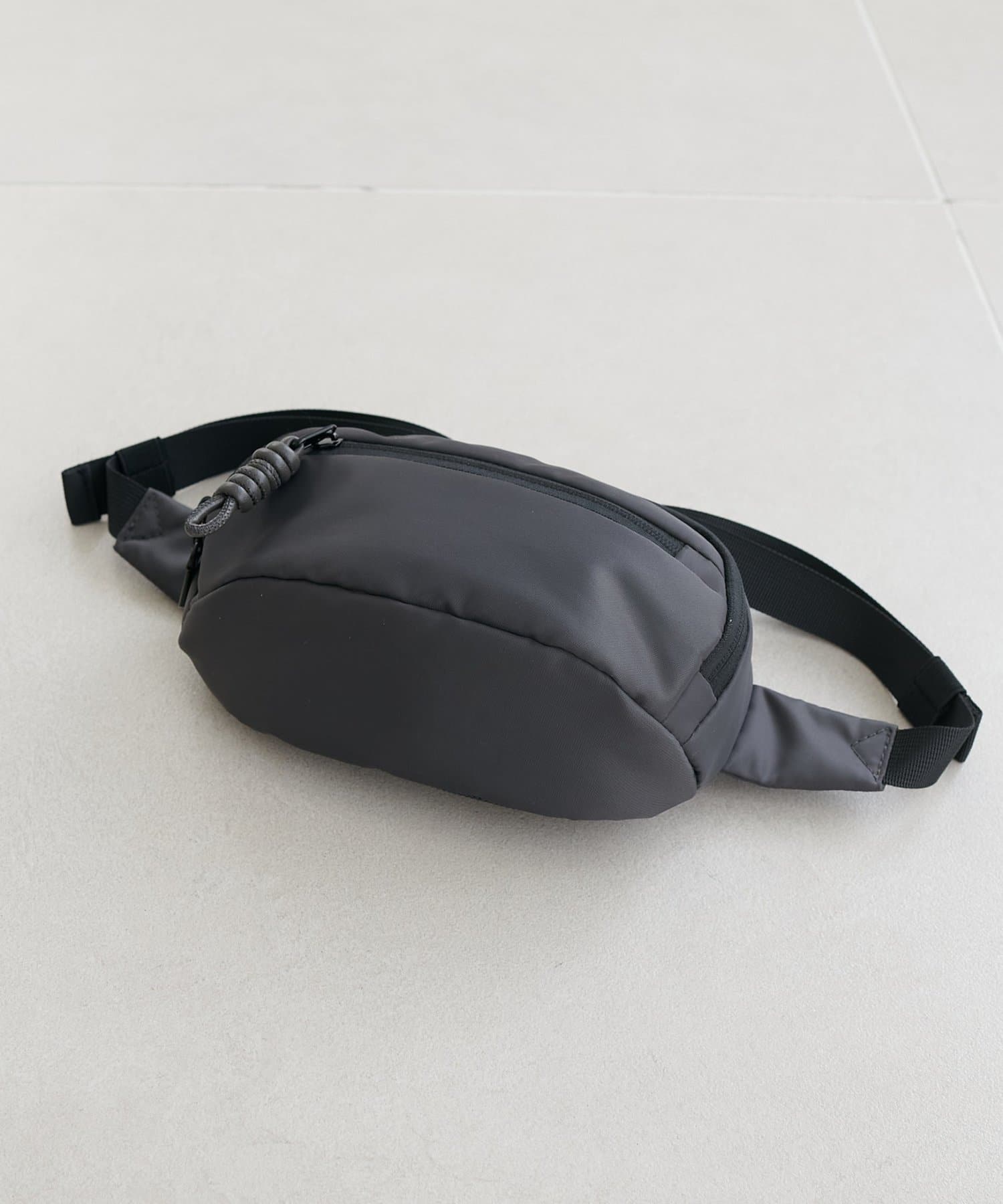 カジュアルな印象のウエストポーチを、大人の女性も日常で使いやすいよう、丸みのあるフォルムで仕上げました。程よい光沢感を持つナイロン素材が、カジュアルな中に上品な雰囲気をプラス。コンパクトな見た目ながら、マチがしっかりと設けられているため収納力は抜群。メイン収納に加え、3つポケットが施され、お出かけの必需品がすっきりと収まります。ジッパー部分には、結び目デザインが特徴的な合成皮革のチャームをあしらいました。腰に巻いてウエストポーチとしても、斜め掛けにしてボディバックとしても活躍します。
